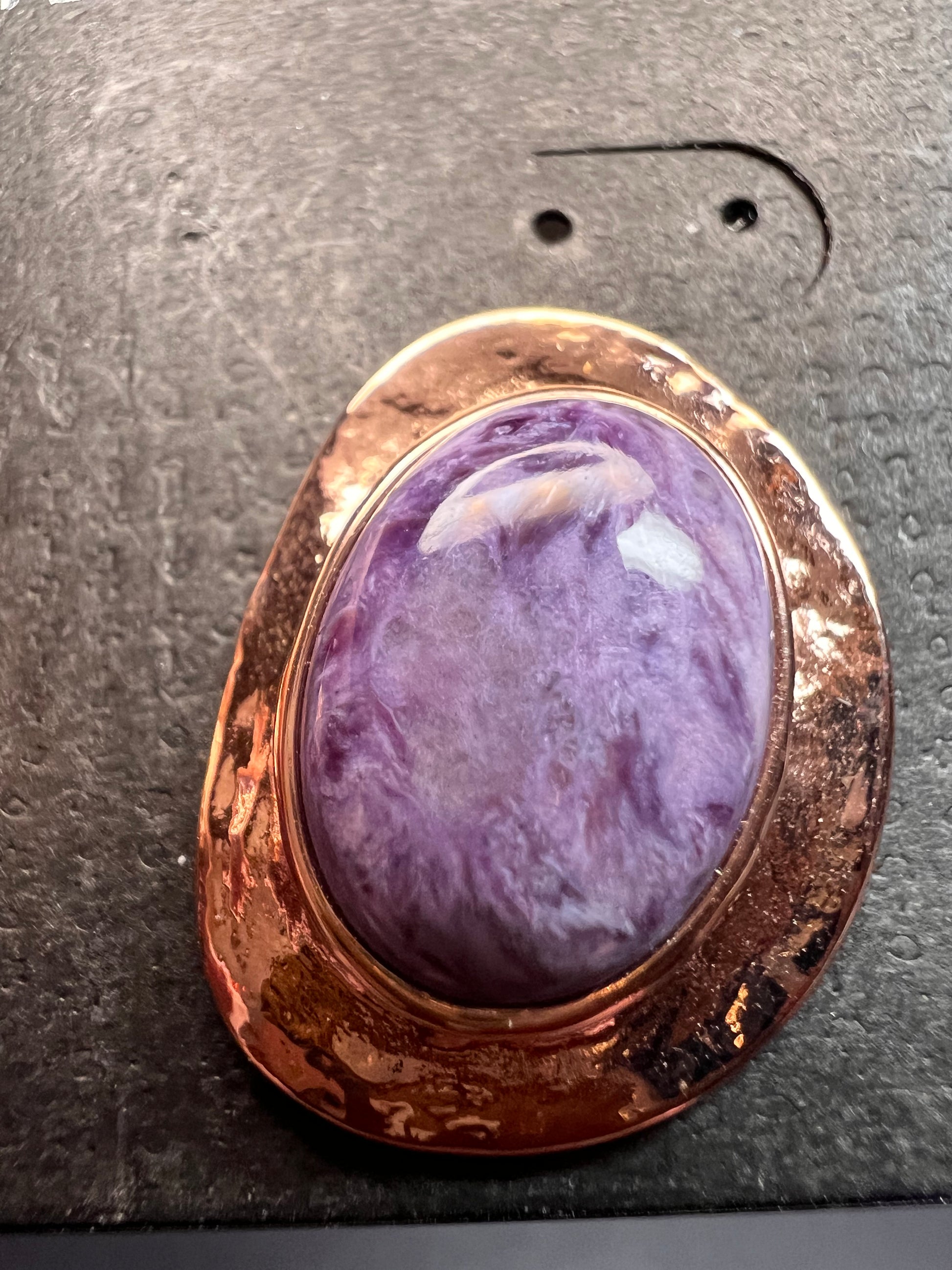 Genuine charoite stones from Siberia , Russia , set in rose gold plated over bronze. Nate & Etan brand , probably sold at Nordstrom. Original retail price is $86.94. Made in China. Charoite is a rare expensive stone only mined by hand in the Siberia region of Russia.