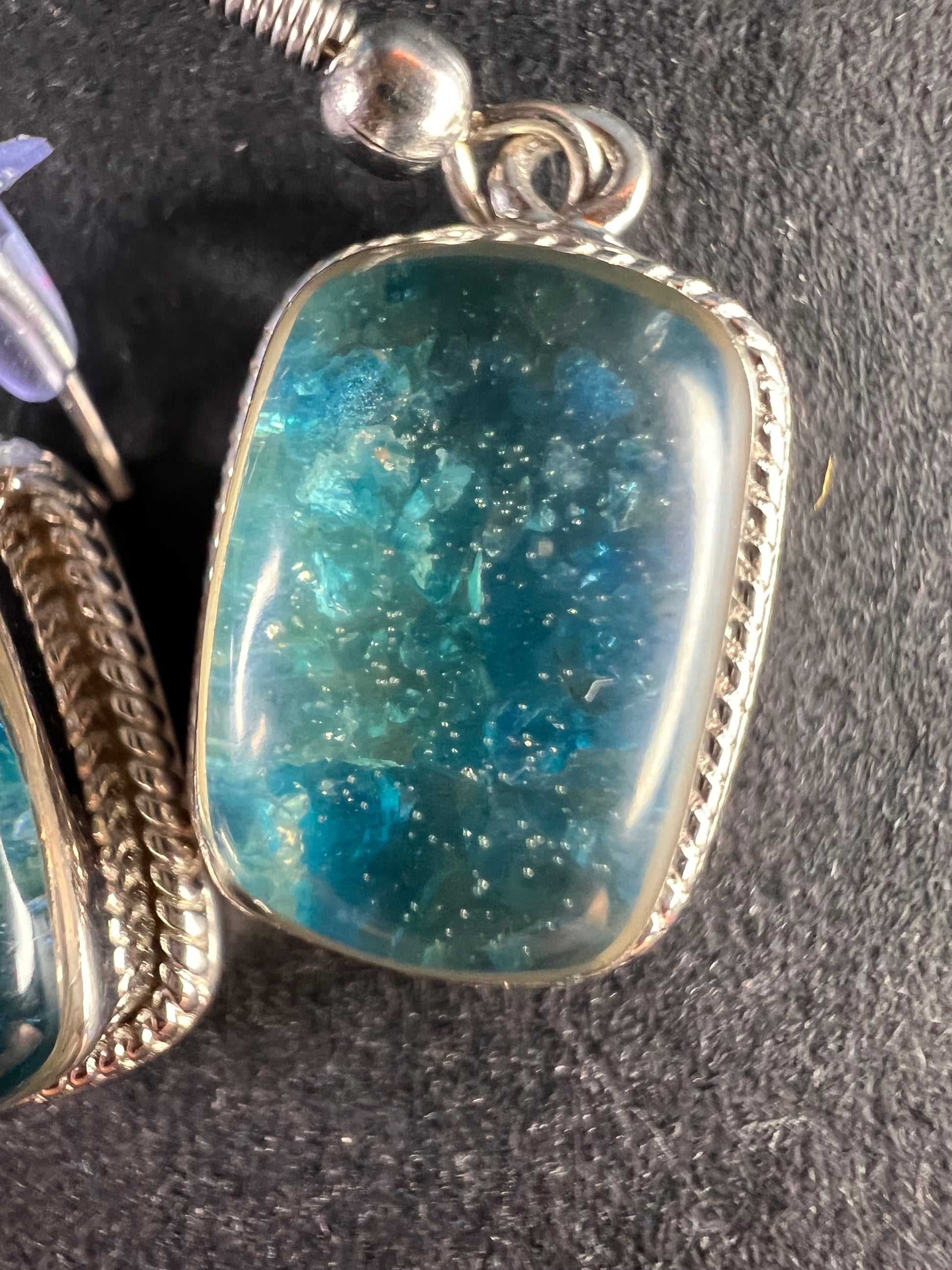 Genuine neon blue apatite inside a matrix which I believe is resin. It looks like apatite chips underneath a resin to me. Set in platinum plated over copper with magnets on the back. I believe the ear wires are made of stainless steel. Made in India.