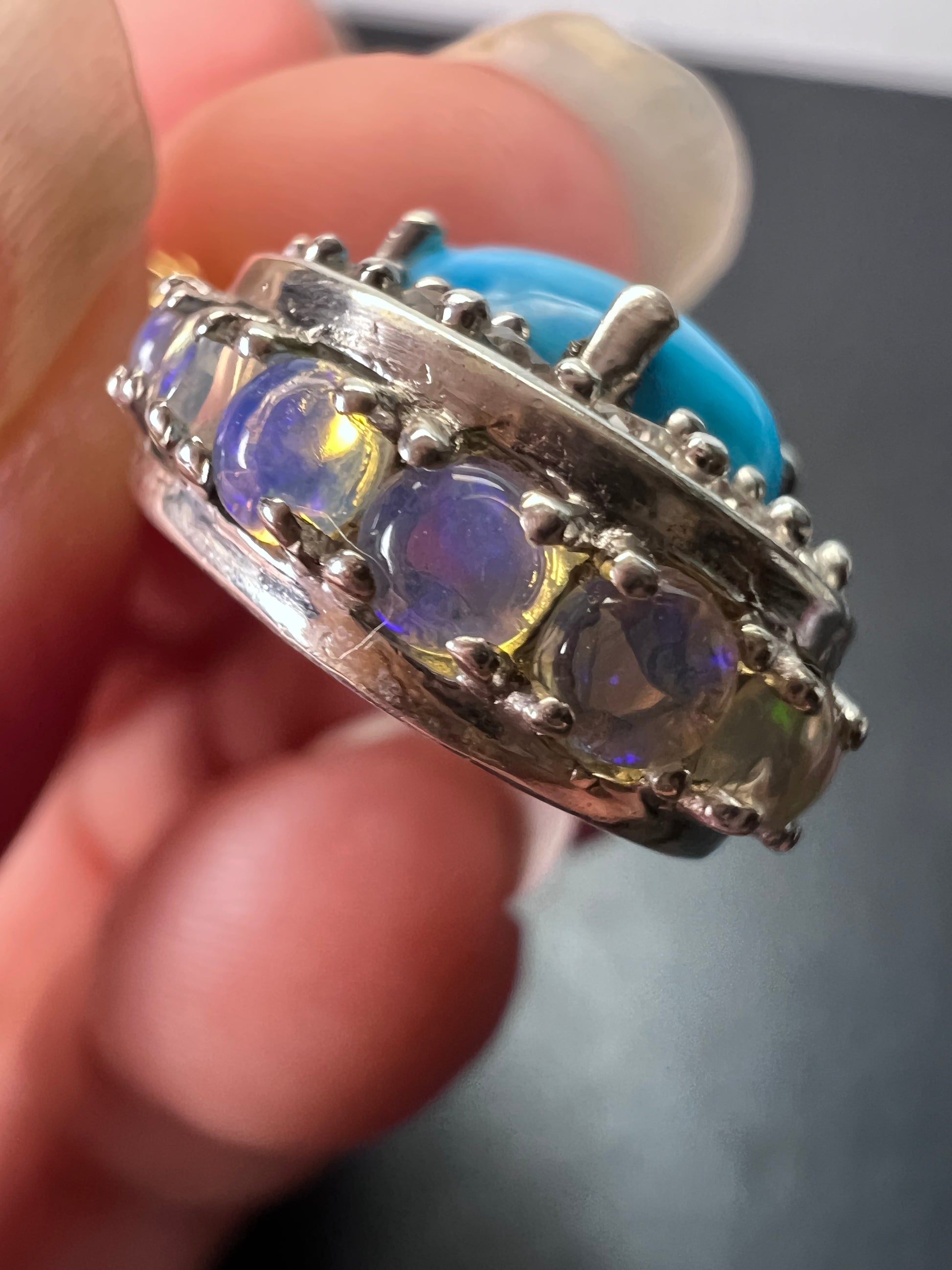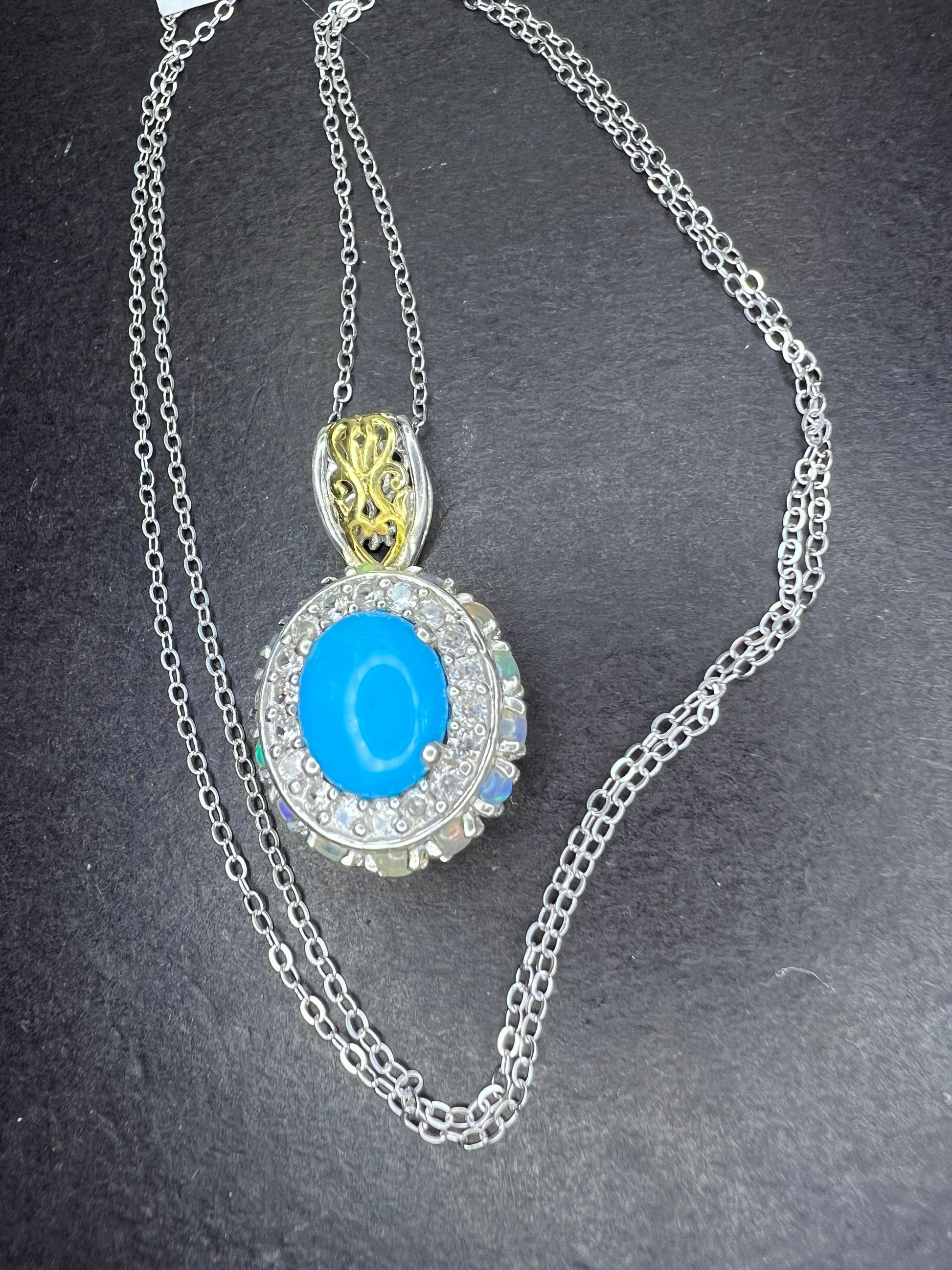 Sleeping Beauty turquoise surrounded by genuine Ethiopian opals and tiny white zircon accent stones. White accent halo stones. This is a two toned rhodium and gold plated over sterling silver pendant with a 20inch sterling silver chain. Turquoise has been stabilized and undergone the Zachery treatment. 925 STS.