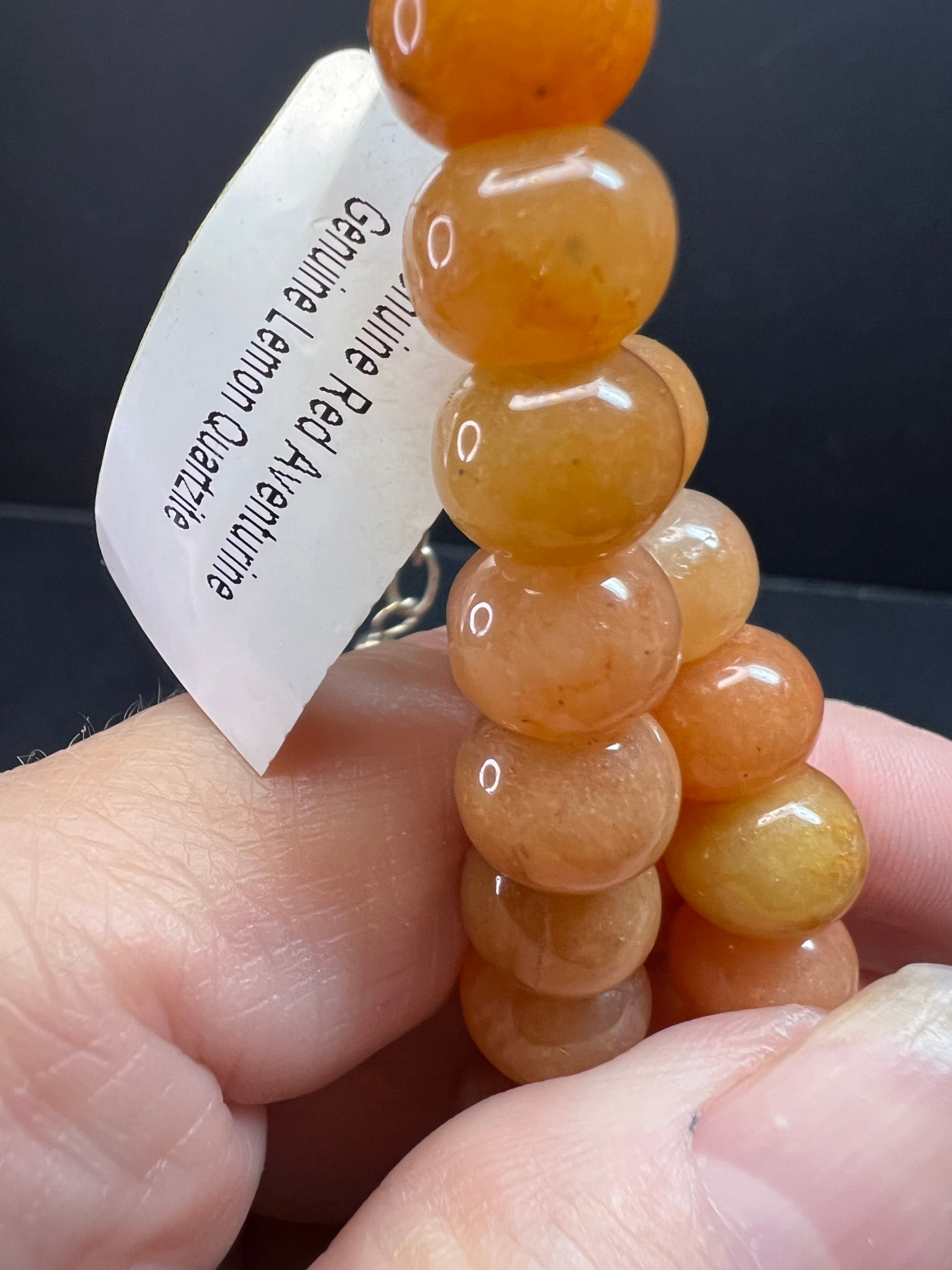 Genuine orange/ peach/ red aventurine rondelle beads stationed with lemon yellow serpentine beads. Finished with 925 sterling silver lobster clasp and 2 inch extension chain. Strung on wire measuring 18-20 inches in length. Tag says yellow beads are quartzite but they are definitely not. I believe they’re actually lemon serpentine.