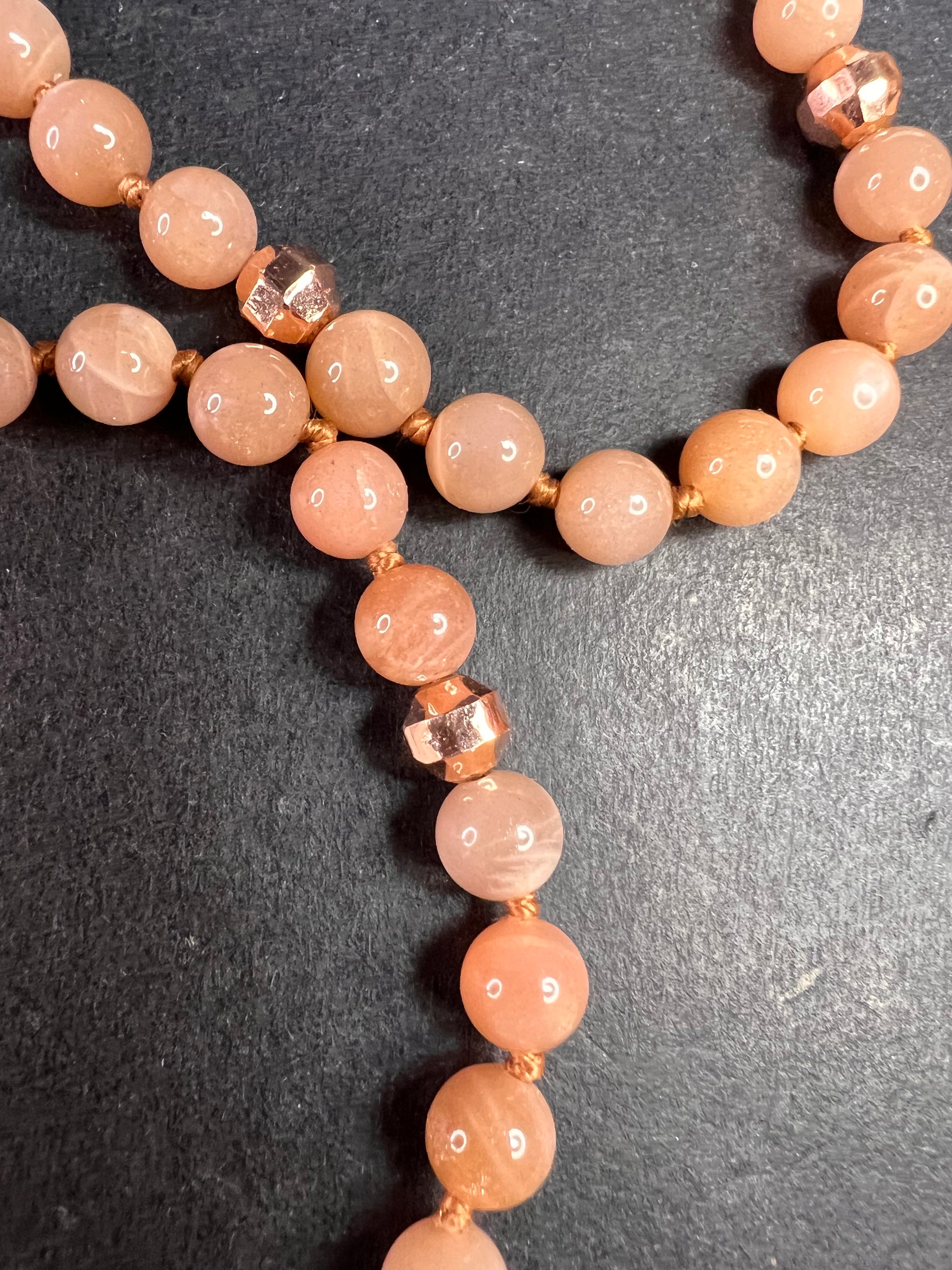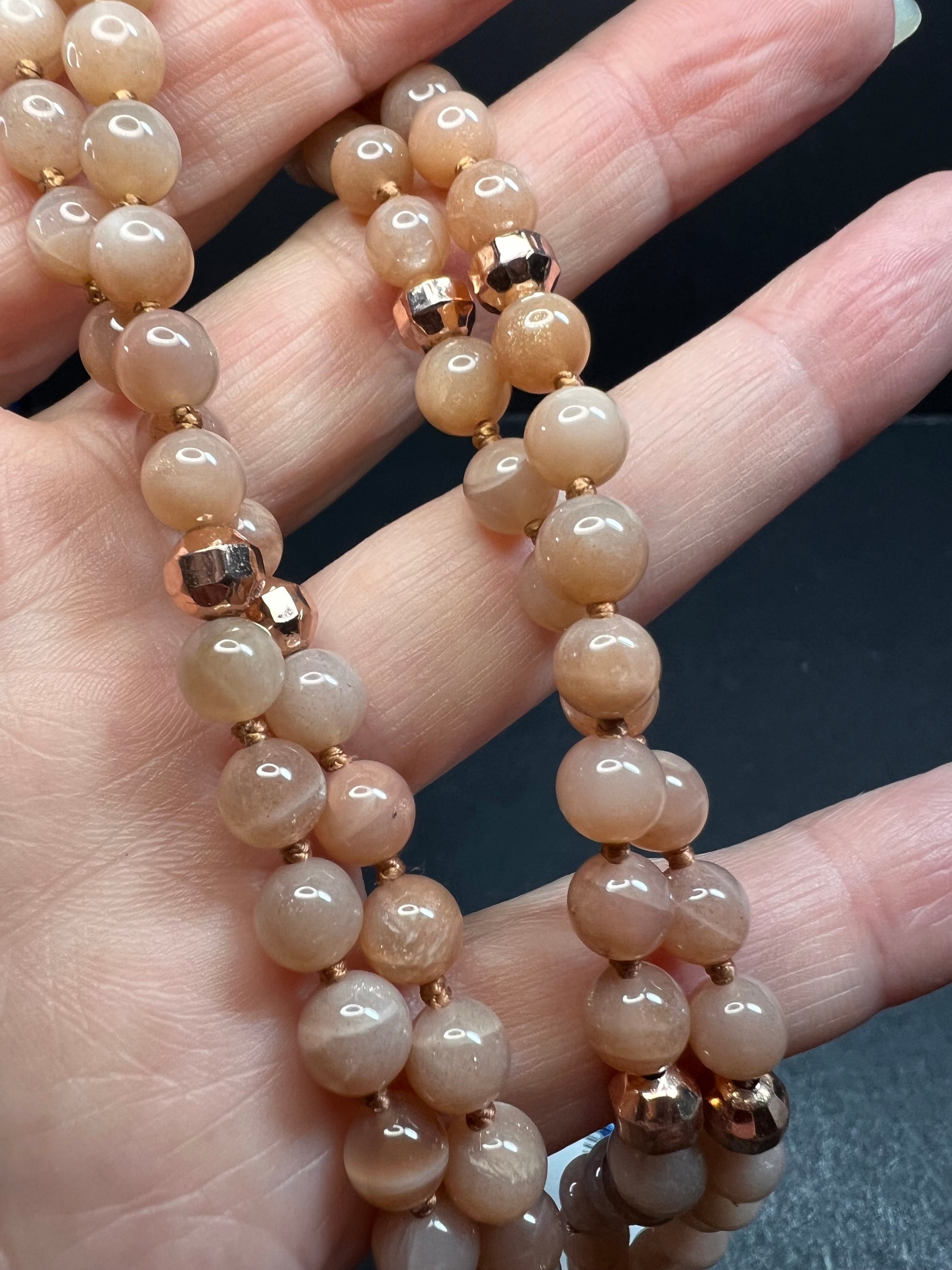 NEW Peach moonstone 30 inch knotted necklace with rose gold over bronze