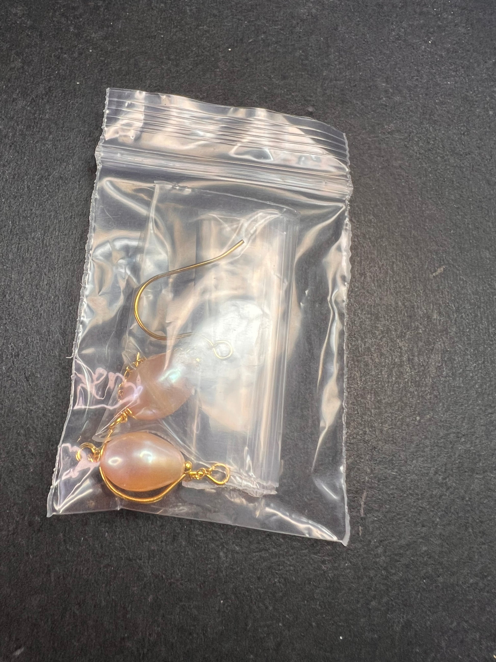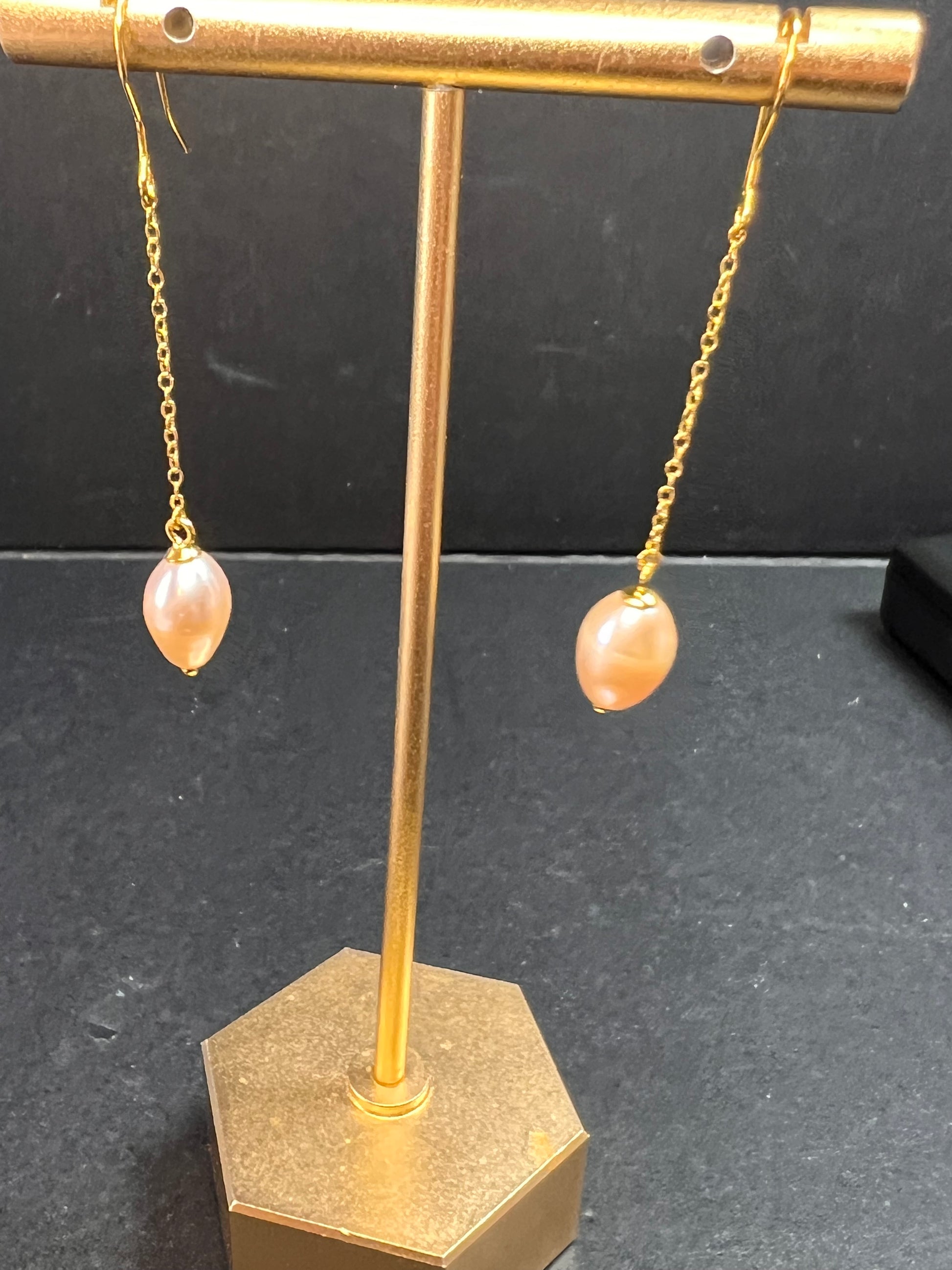 Genuine peachy pink freshwater pearls dangling from a 14k yellow gold over sterling silver chain setting with fish hooks. 925 Djoy. Made in China.