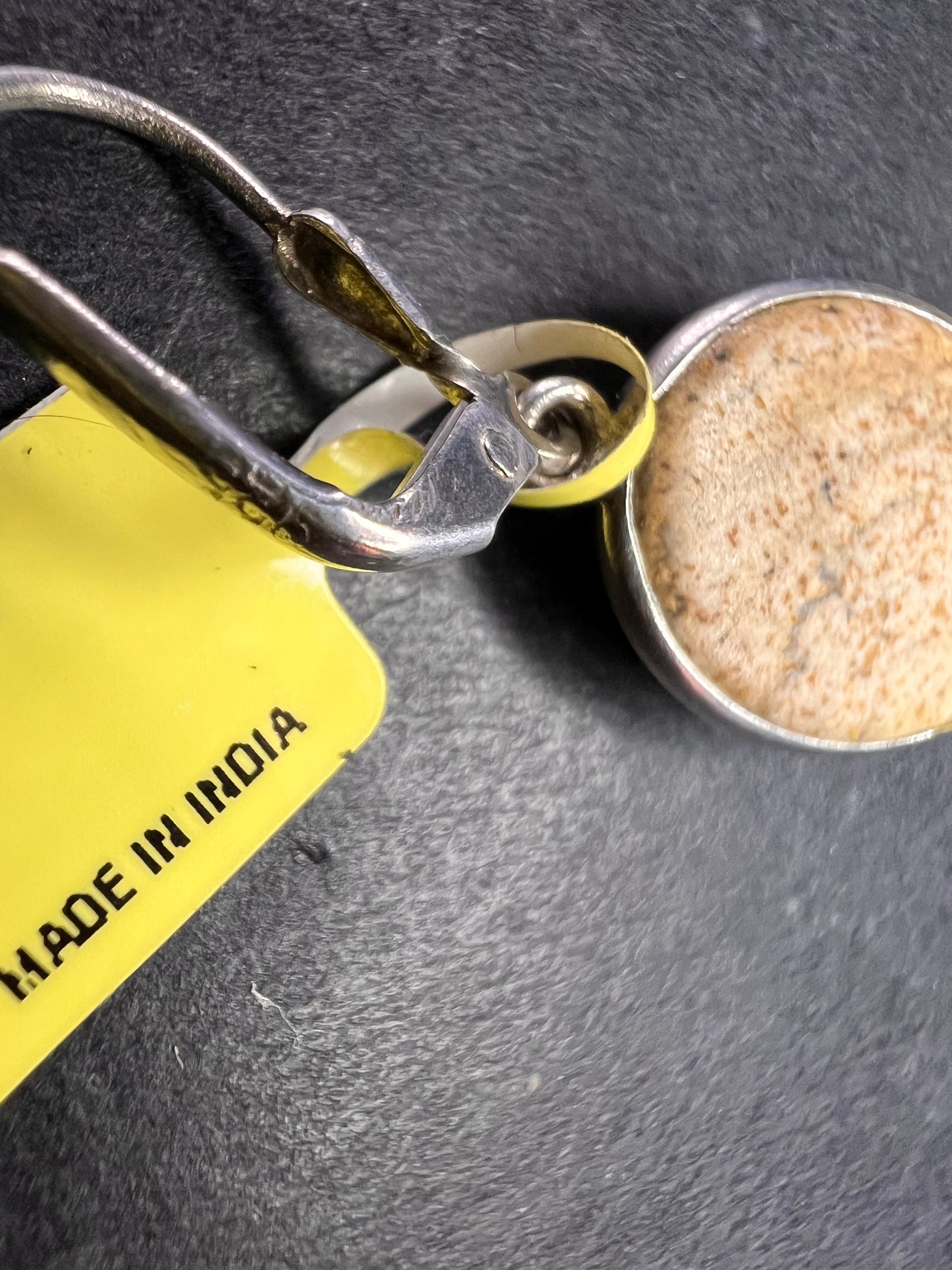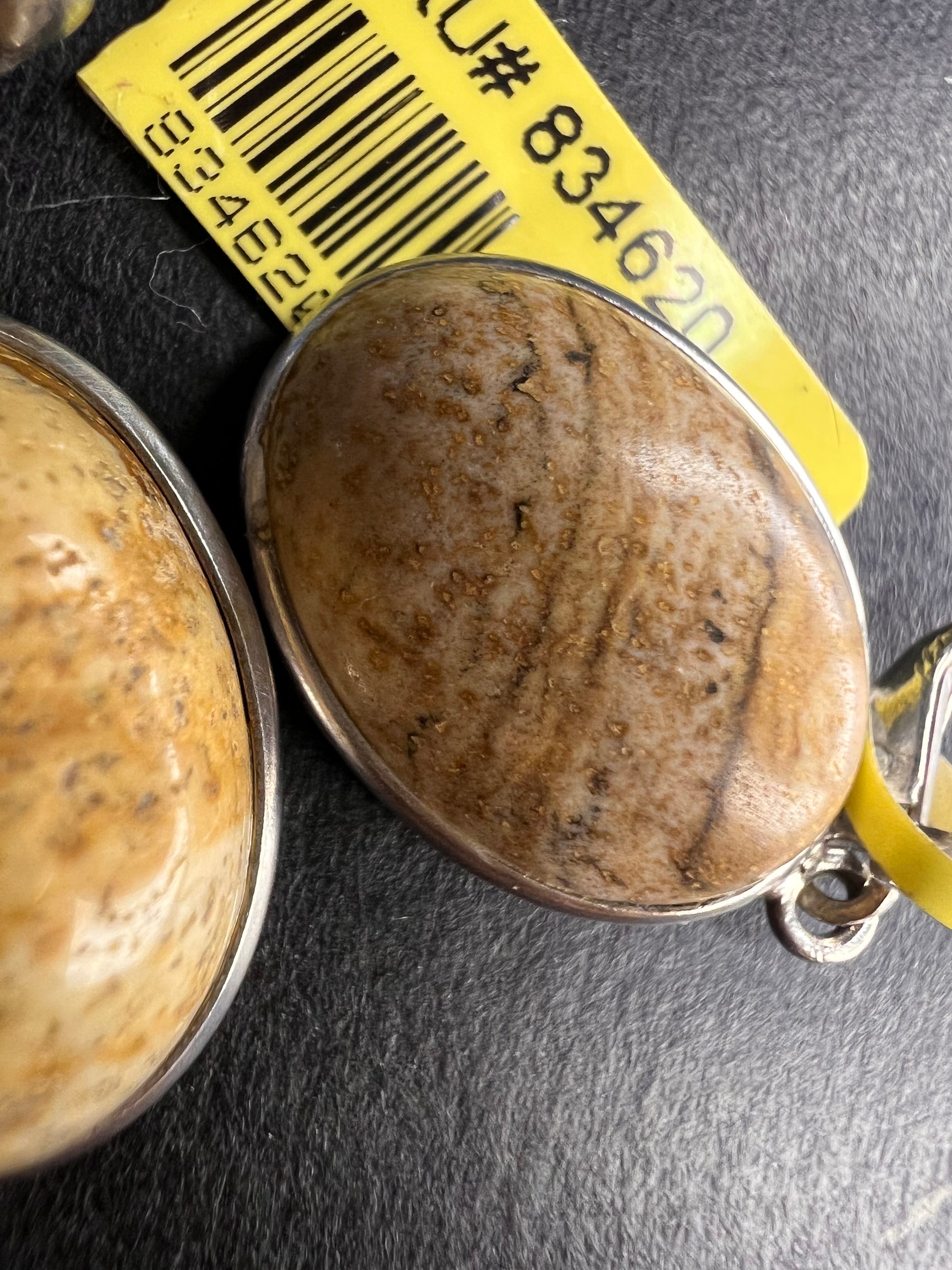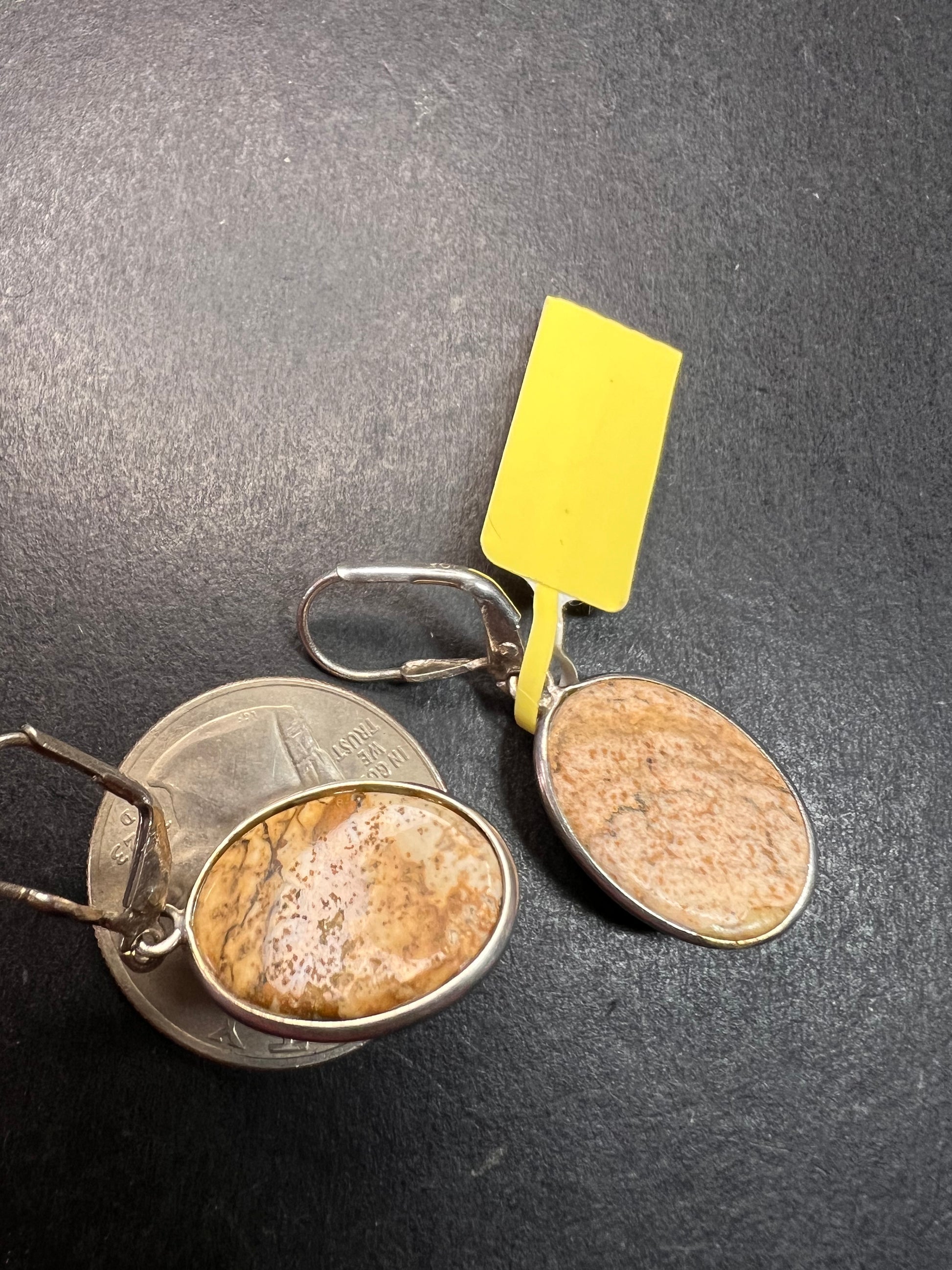 Genuine oval cut picture jasper cabochons set in authentic 925 sterling silver on lever backs. Unknown maker. Made in India.