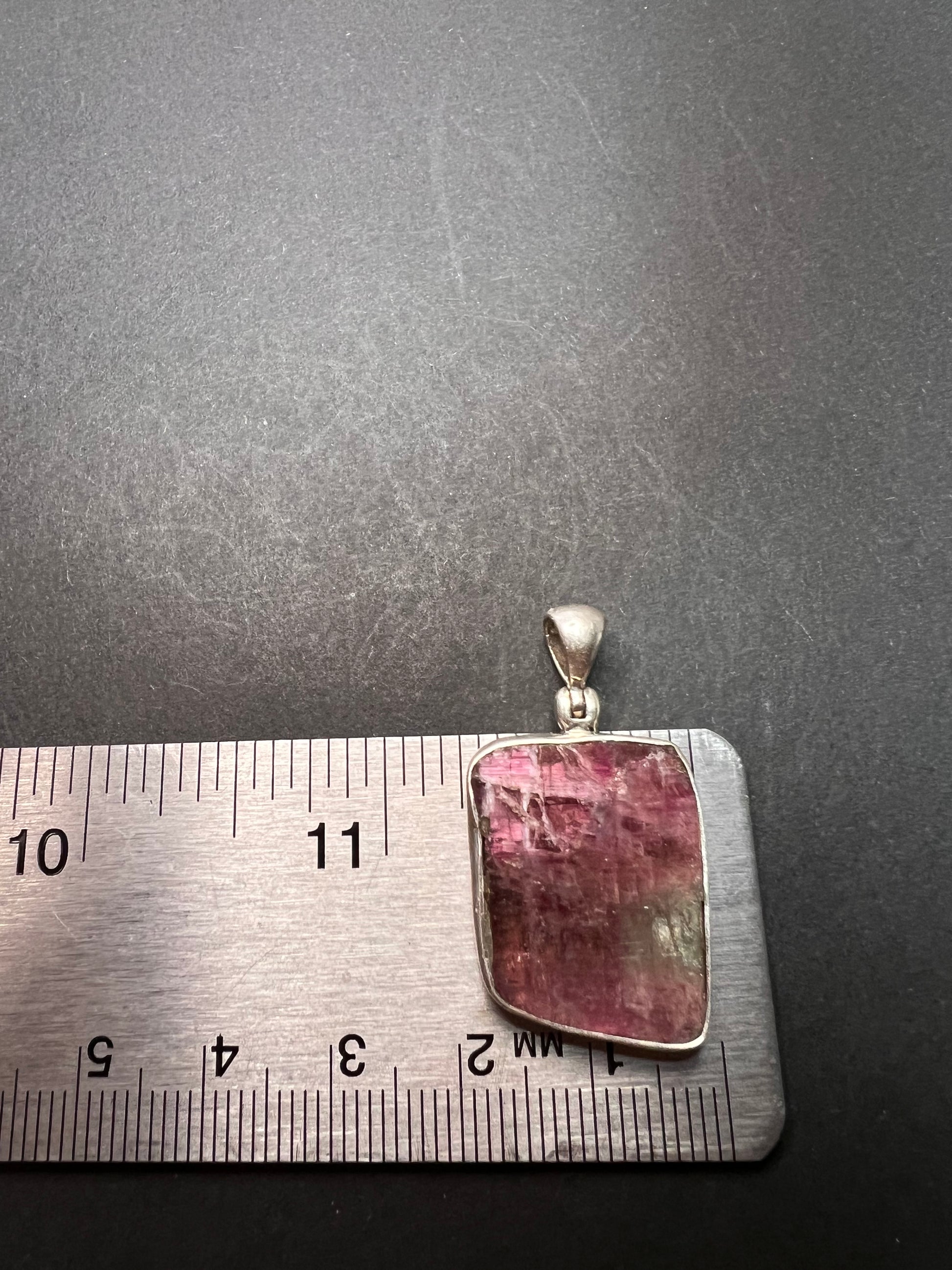 Genuine pink/ bi colored watermelon tourmaline with a splash of blue green. Polished on froomy , rough on the back in a free form shape encased in genuine 925 sterling silver. Total weight is 3.95 grams. Measurements in photos. This is for the pendant only. Chain not included.