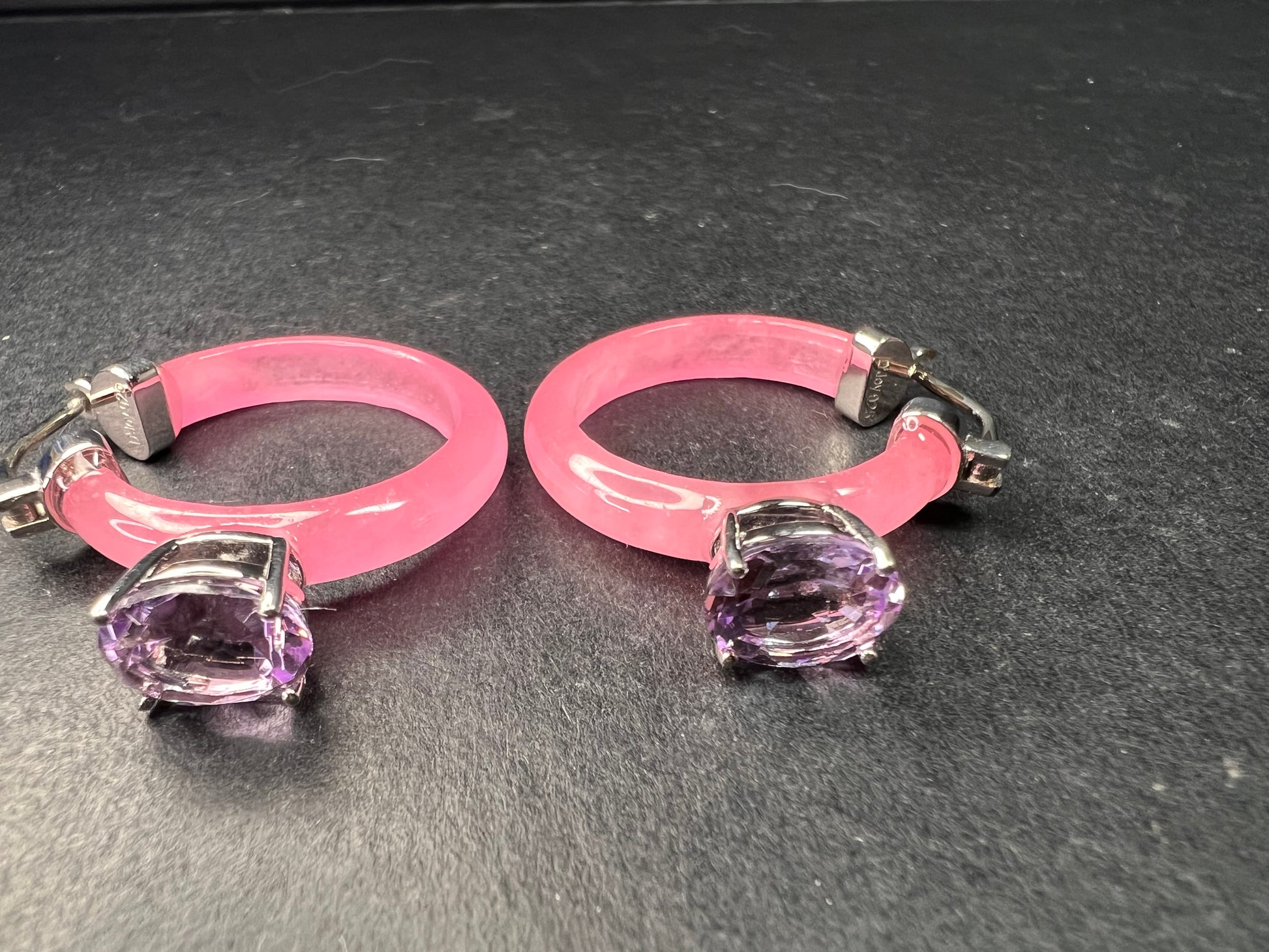 NEW Pink Jade and rose de France amethyst hoop earrings in rhodium over sterling silver