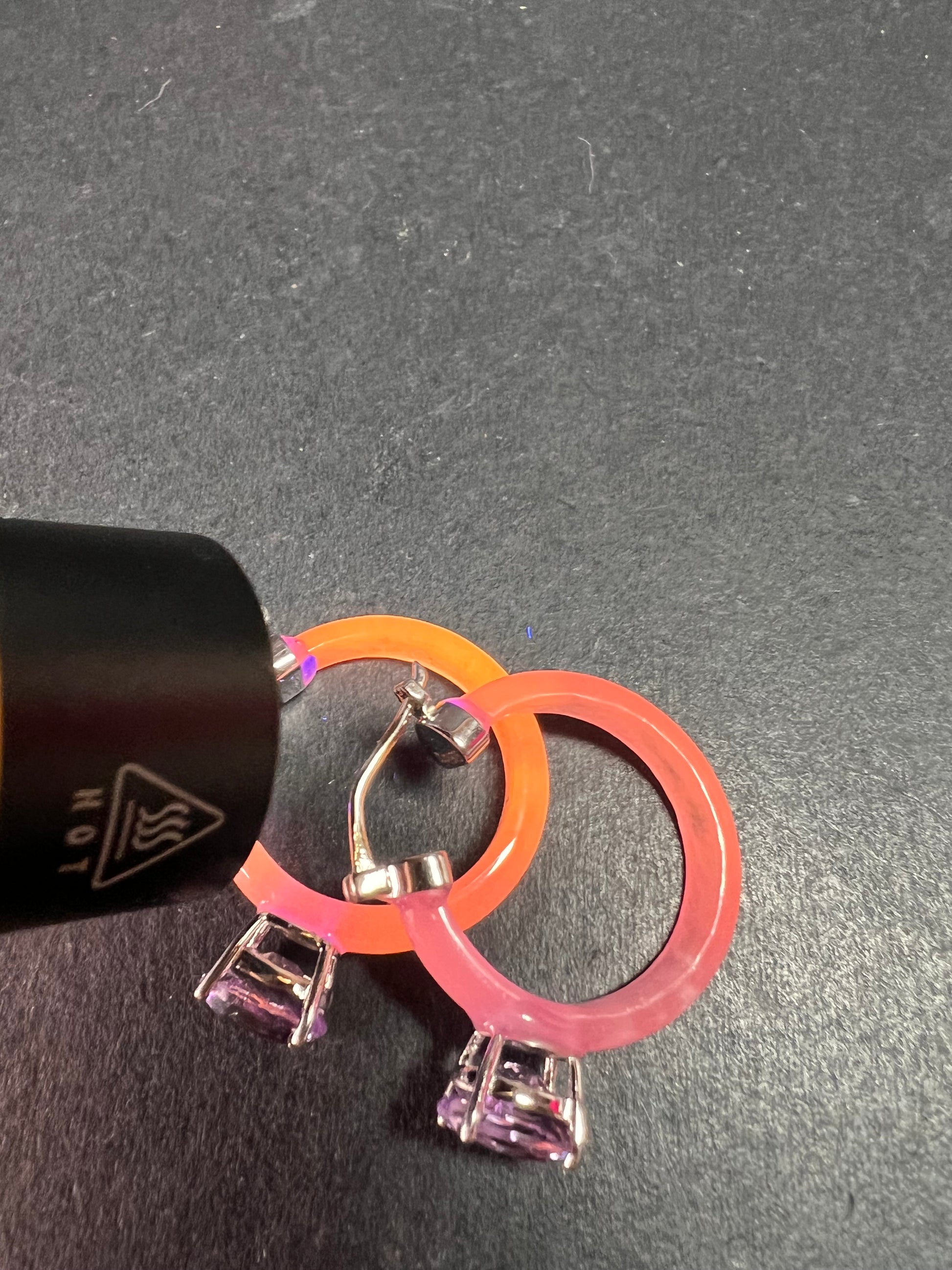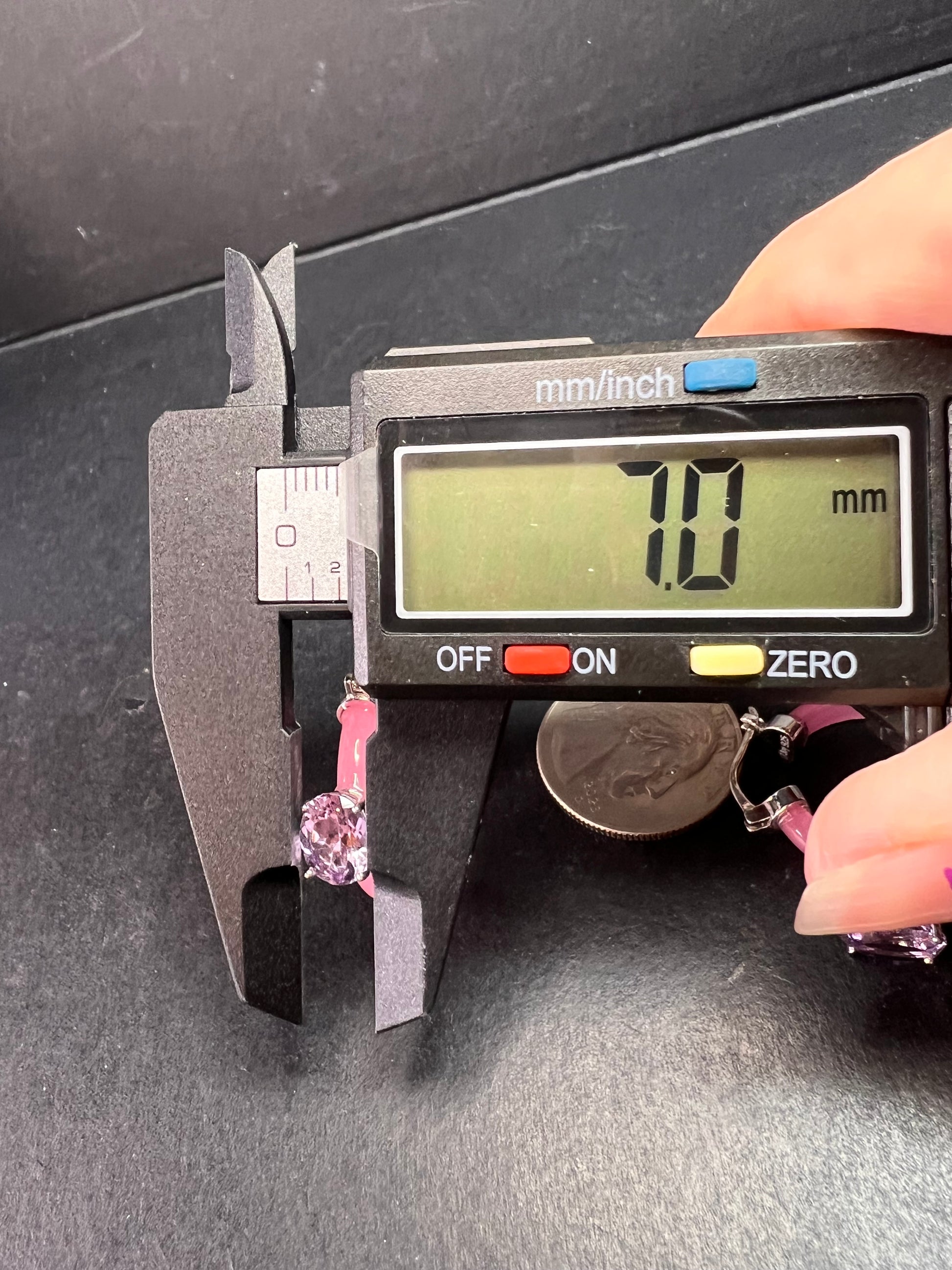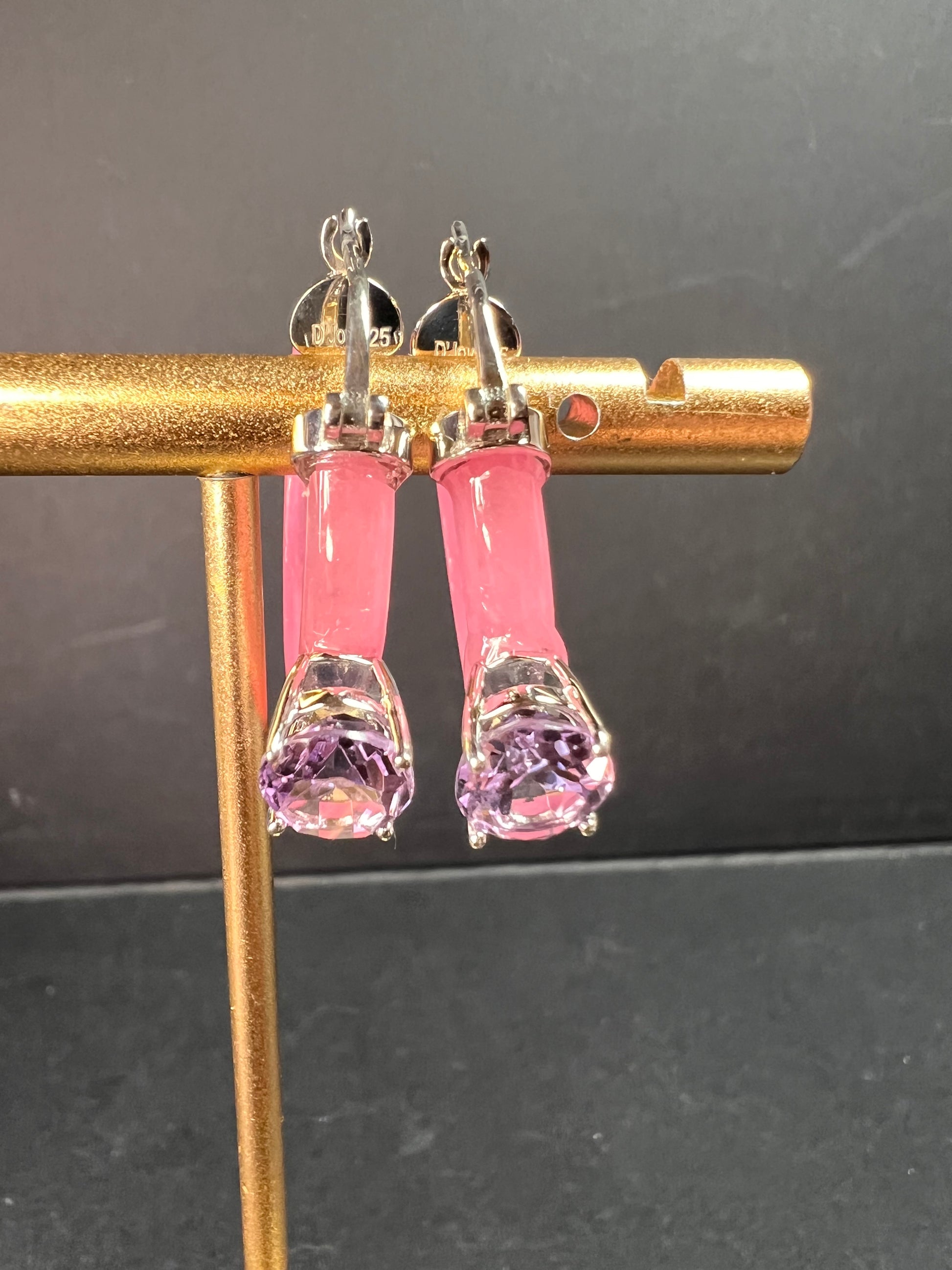 Genuine rose de France pink amethyst oval cut gemstones prong set in an authentic 925 sterling silver setting plated with rhodium. Pink jade hoops are genuine jade but dyed pink for color enhancement. 925 Djoy. Made in China.