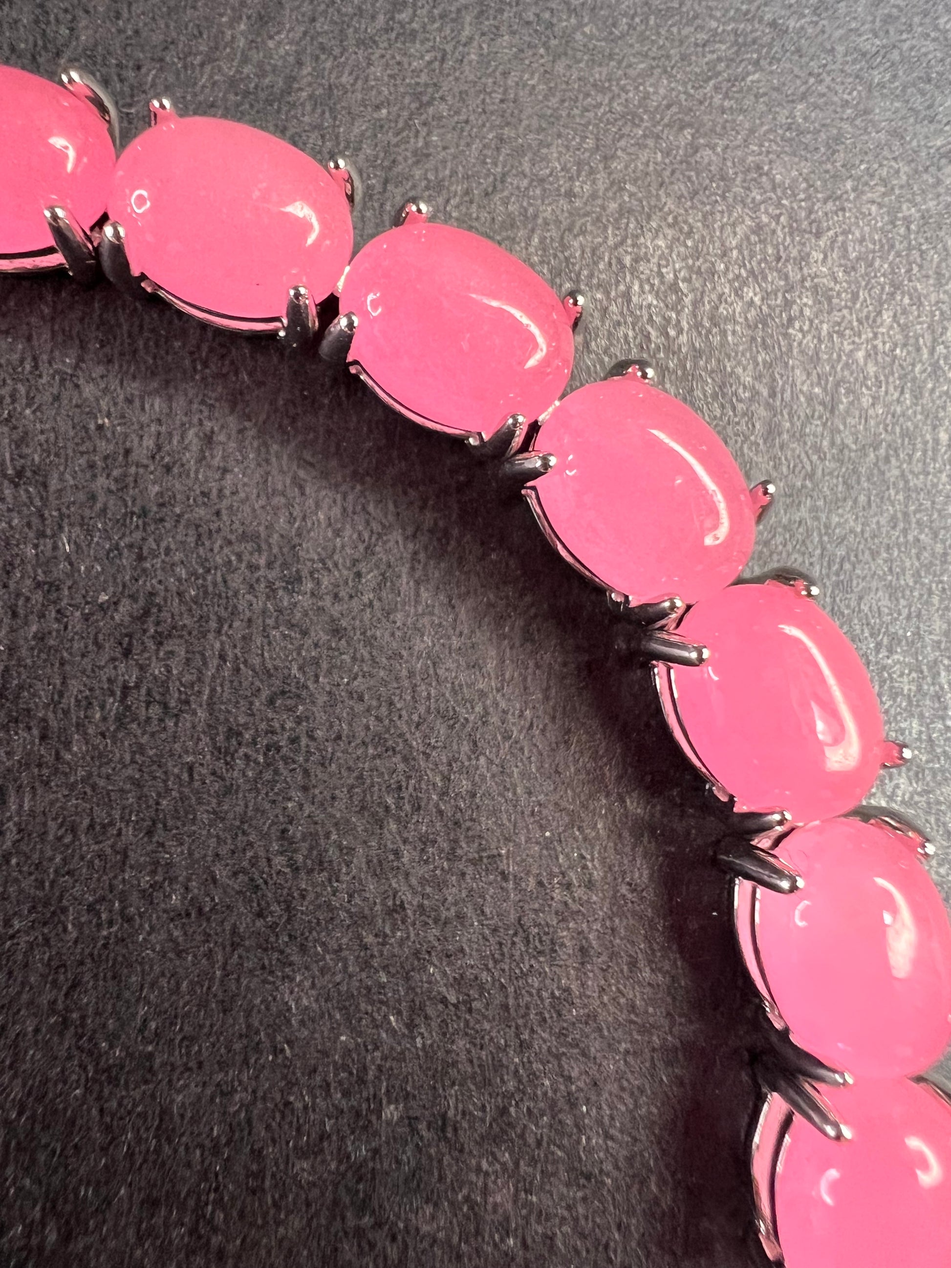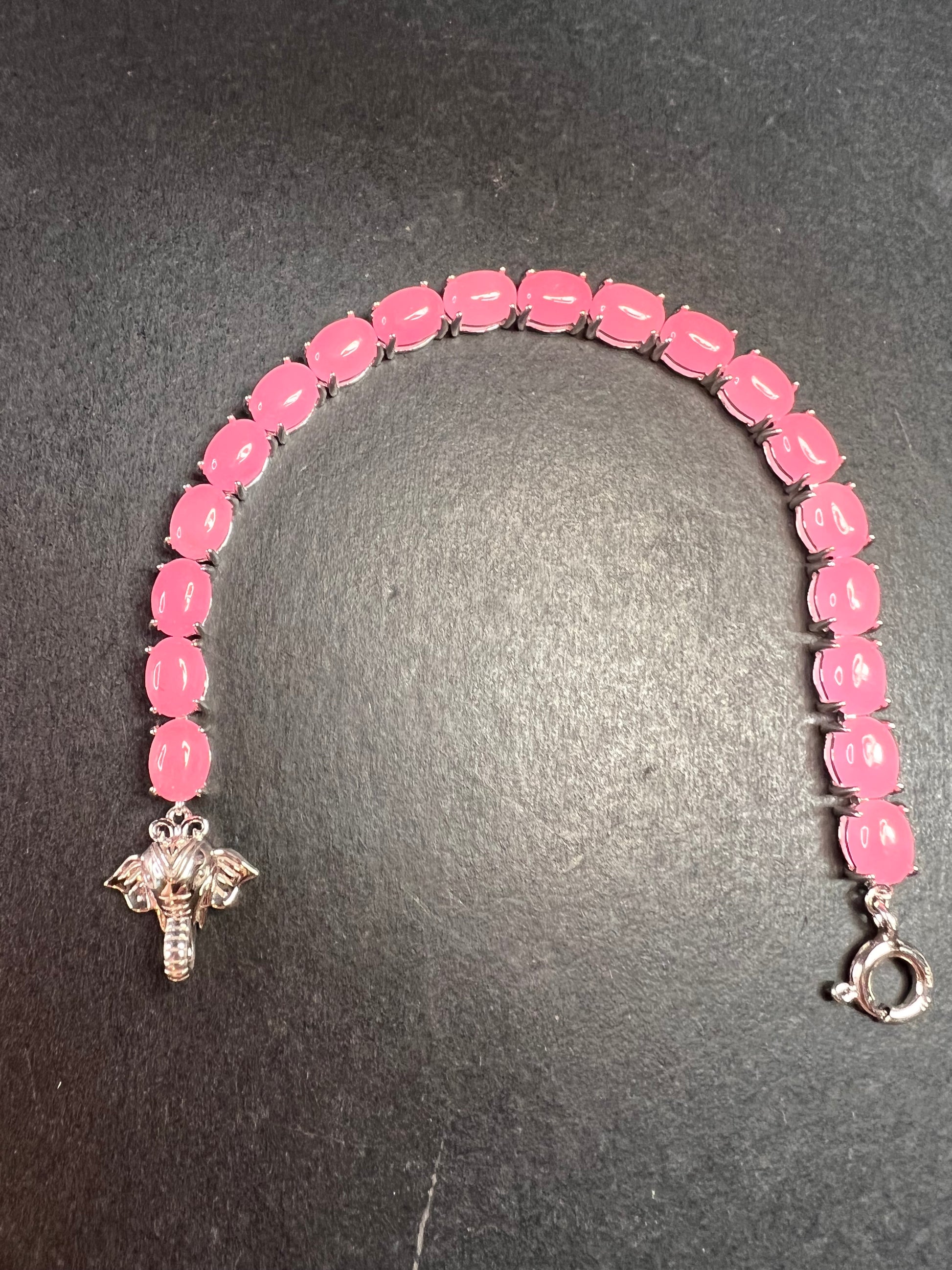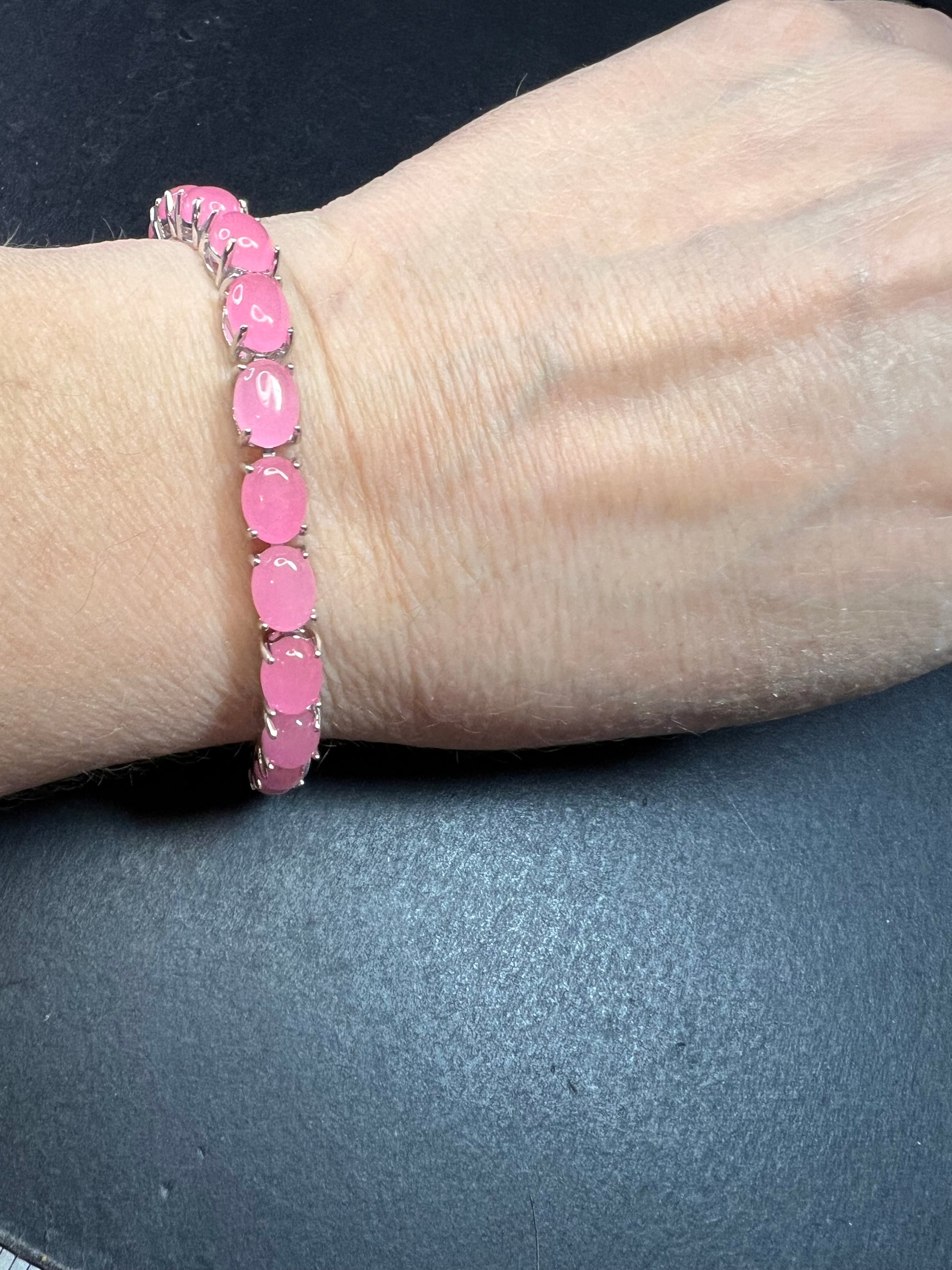 Genuine jade oval cut cabochon stones dyed pink. Prong set in an authentic 925 sterling silver tennis bracelet setting plated with rhodium. Measures about 7.25 inches in length and has a total weight of 16.00 grams. 925 sterling silver spring ring clasp that hooks into a sterling silver elephant trunk. Due to the pink dye in the jade, these stones will fluoresce bright orange yellow under UV light. Djoy. Made in China.