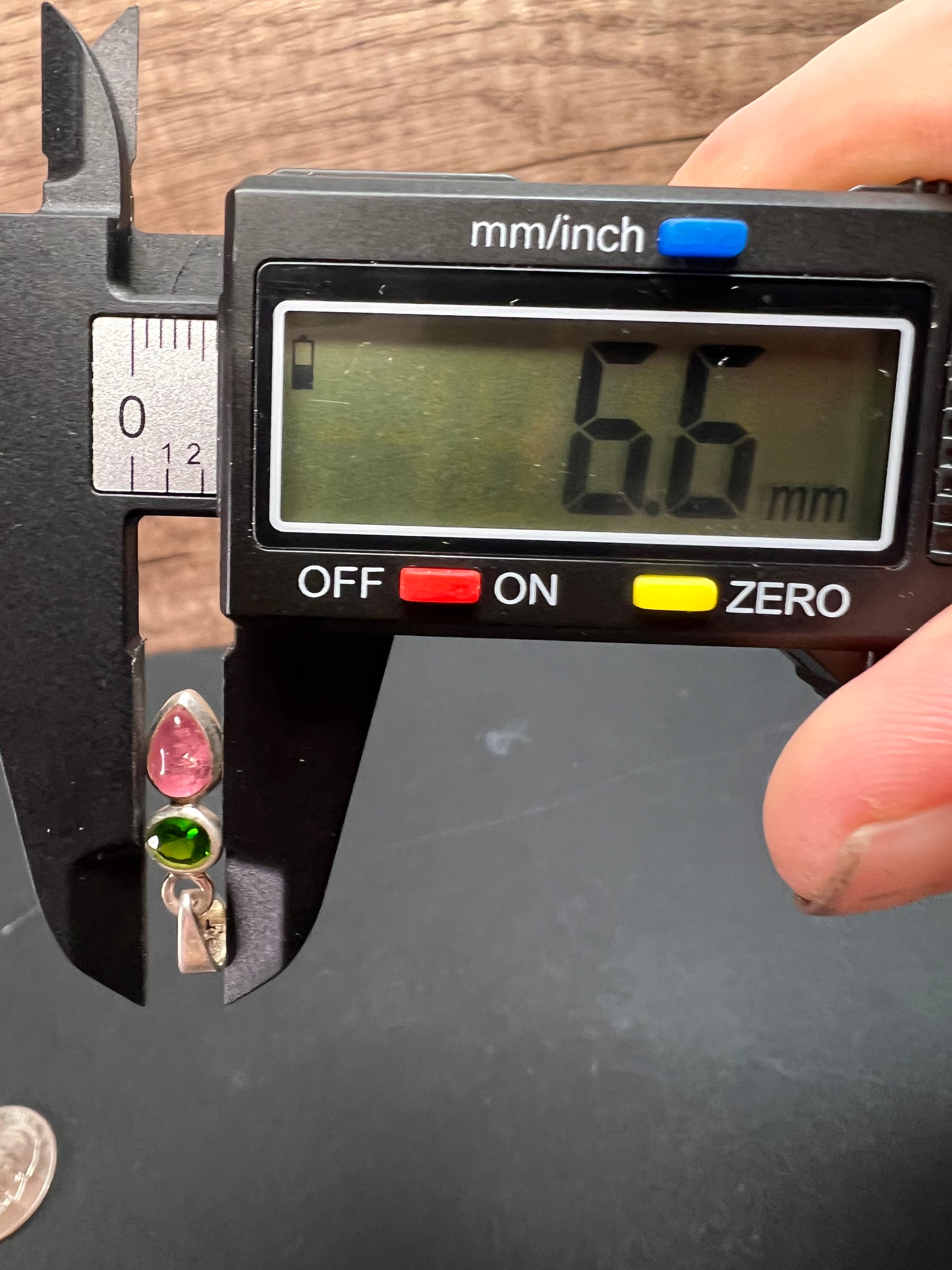 Genuine pink gemmy tourmaline and green chrome diopside gemstone set in authentic 925 sterling silver. Total weight is 1.47 grams. Measurements in photos. This is for the pendant only. Chain not included.