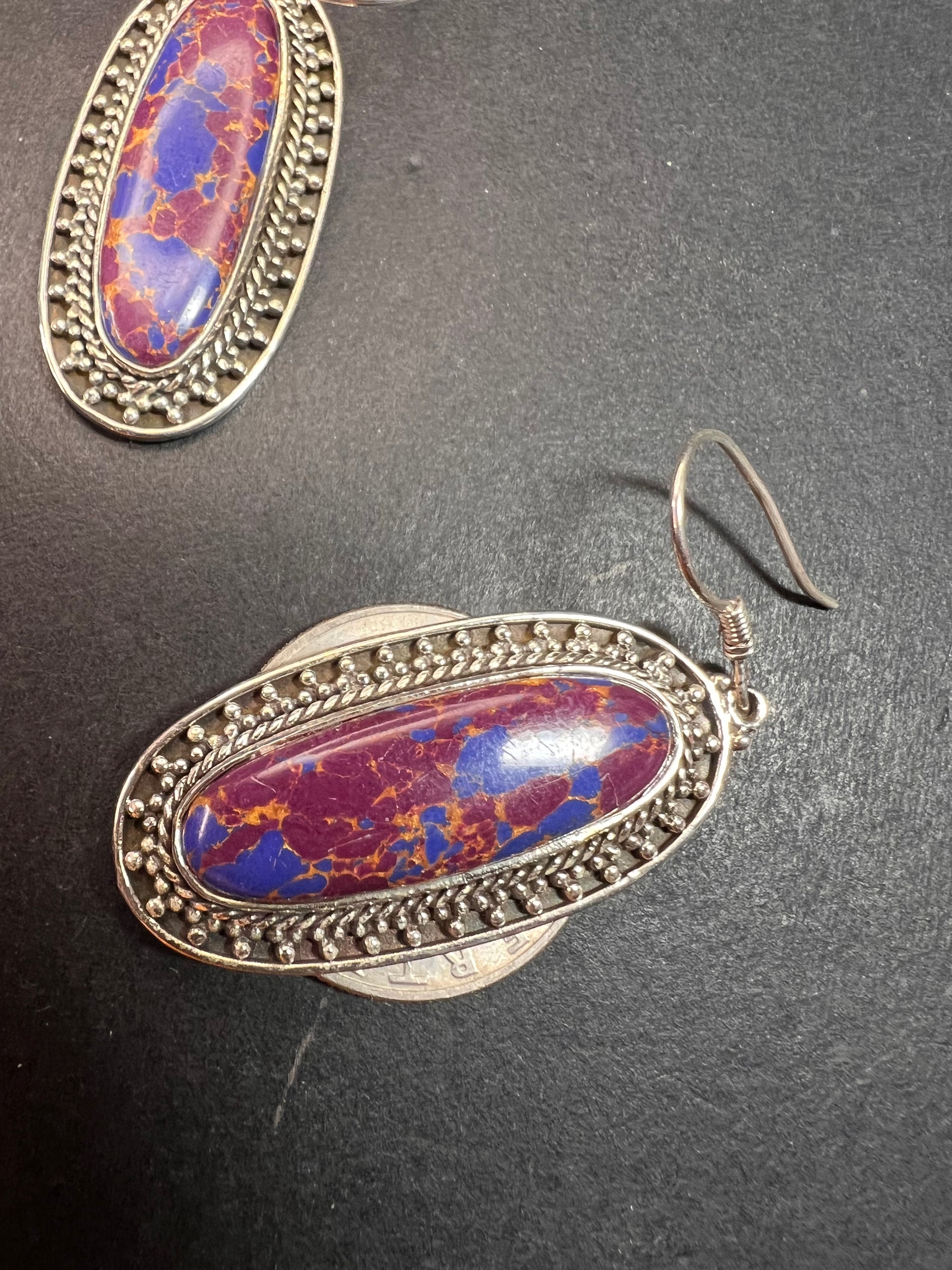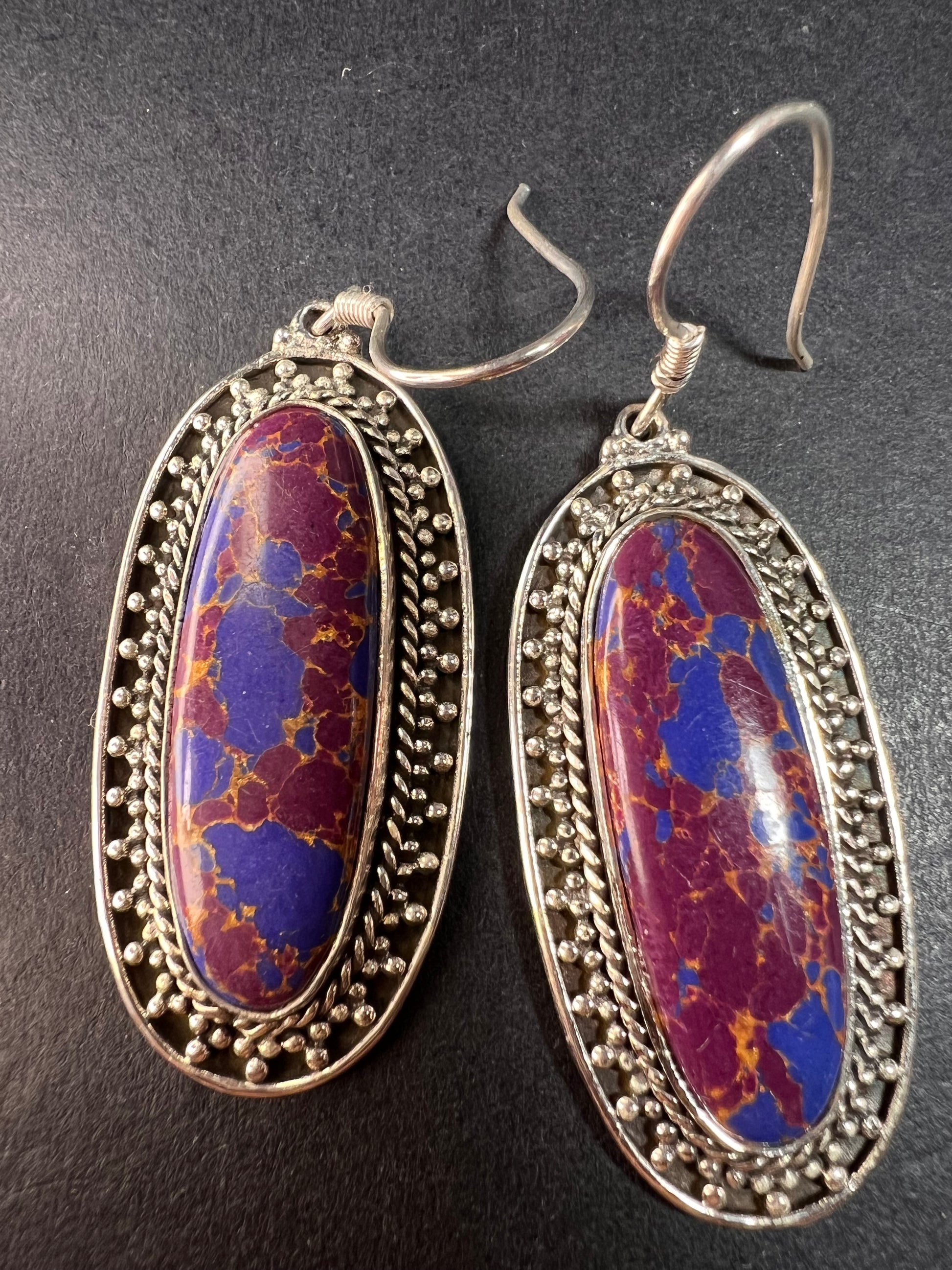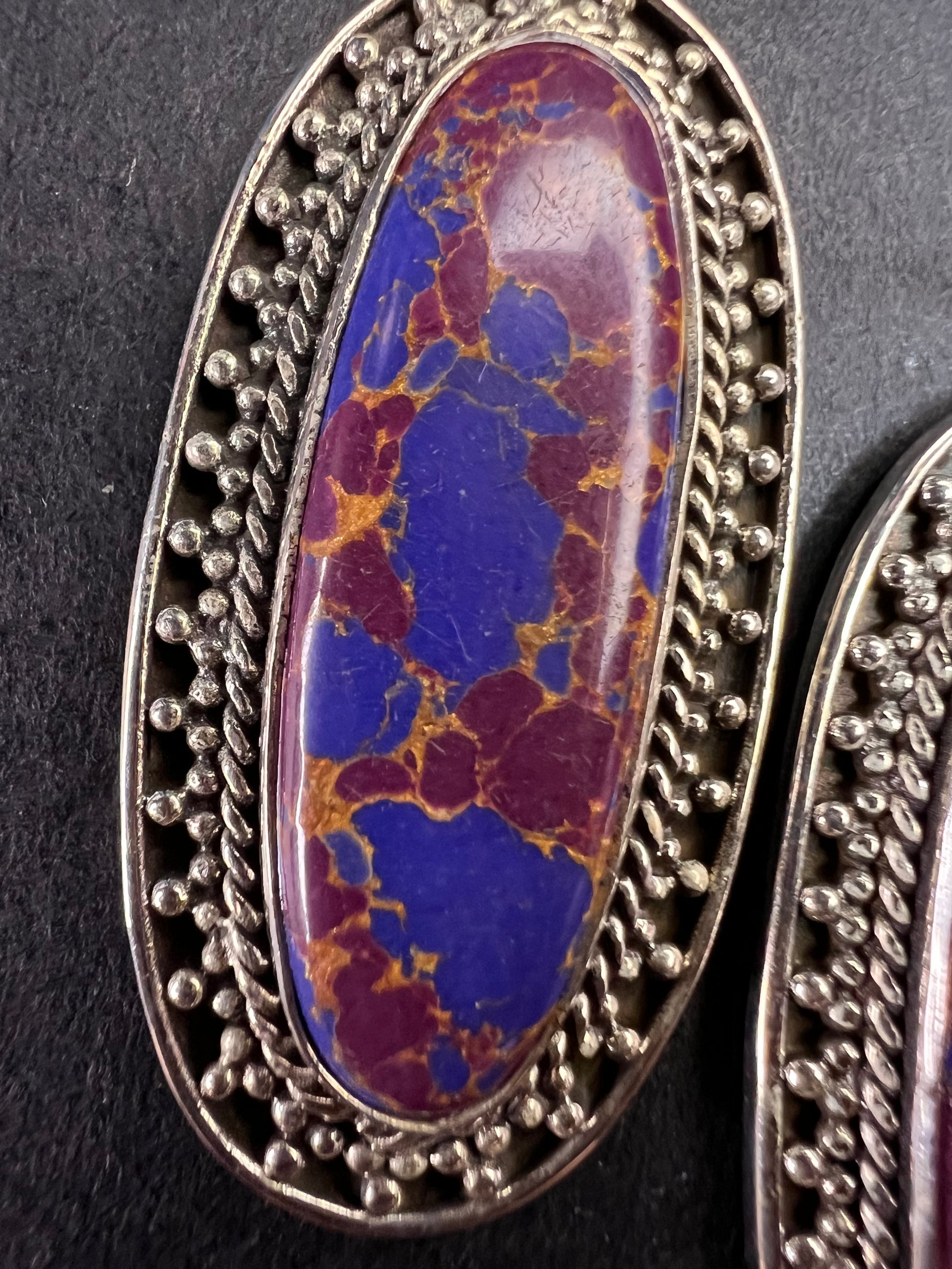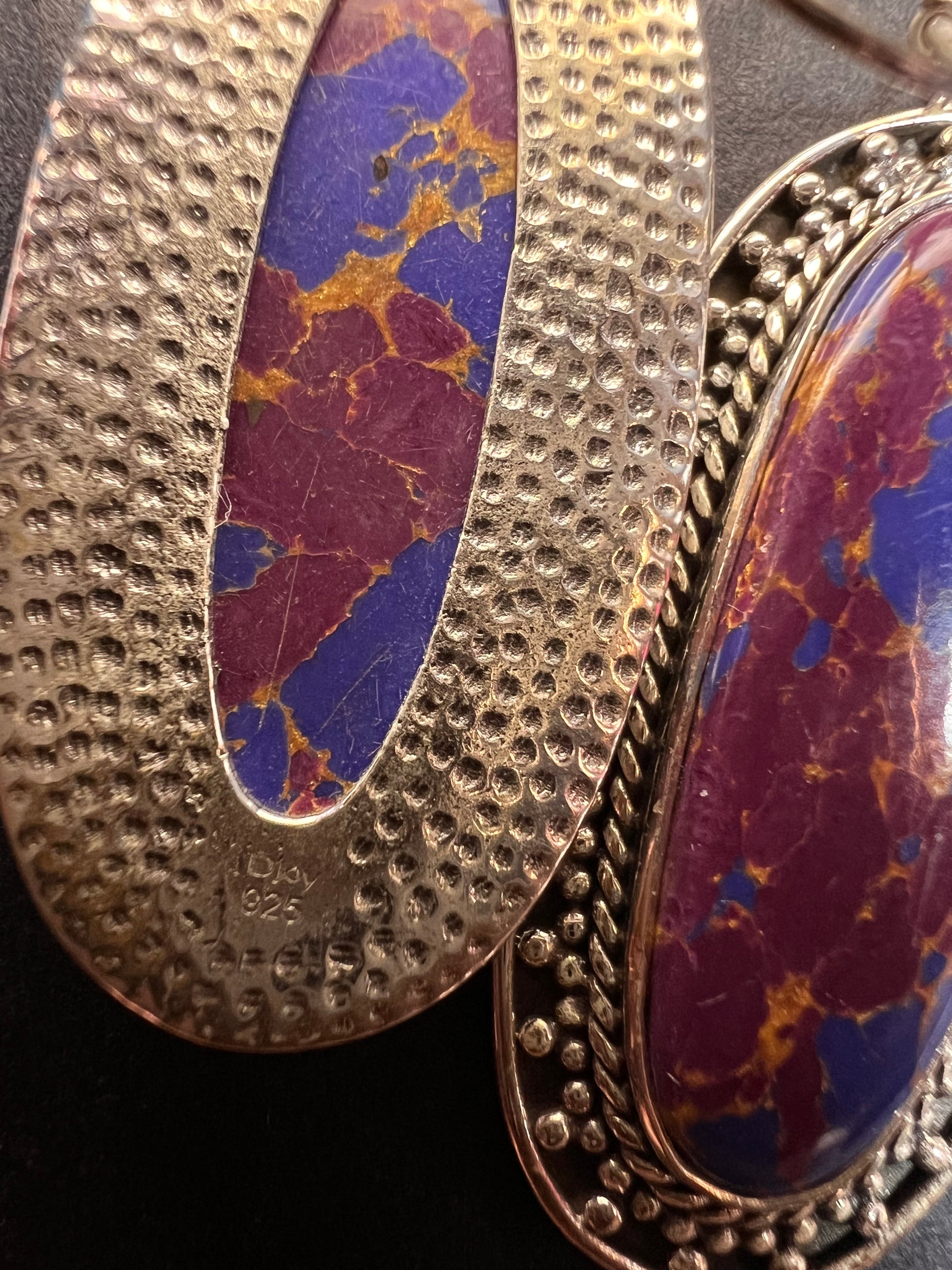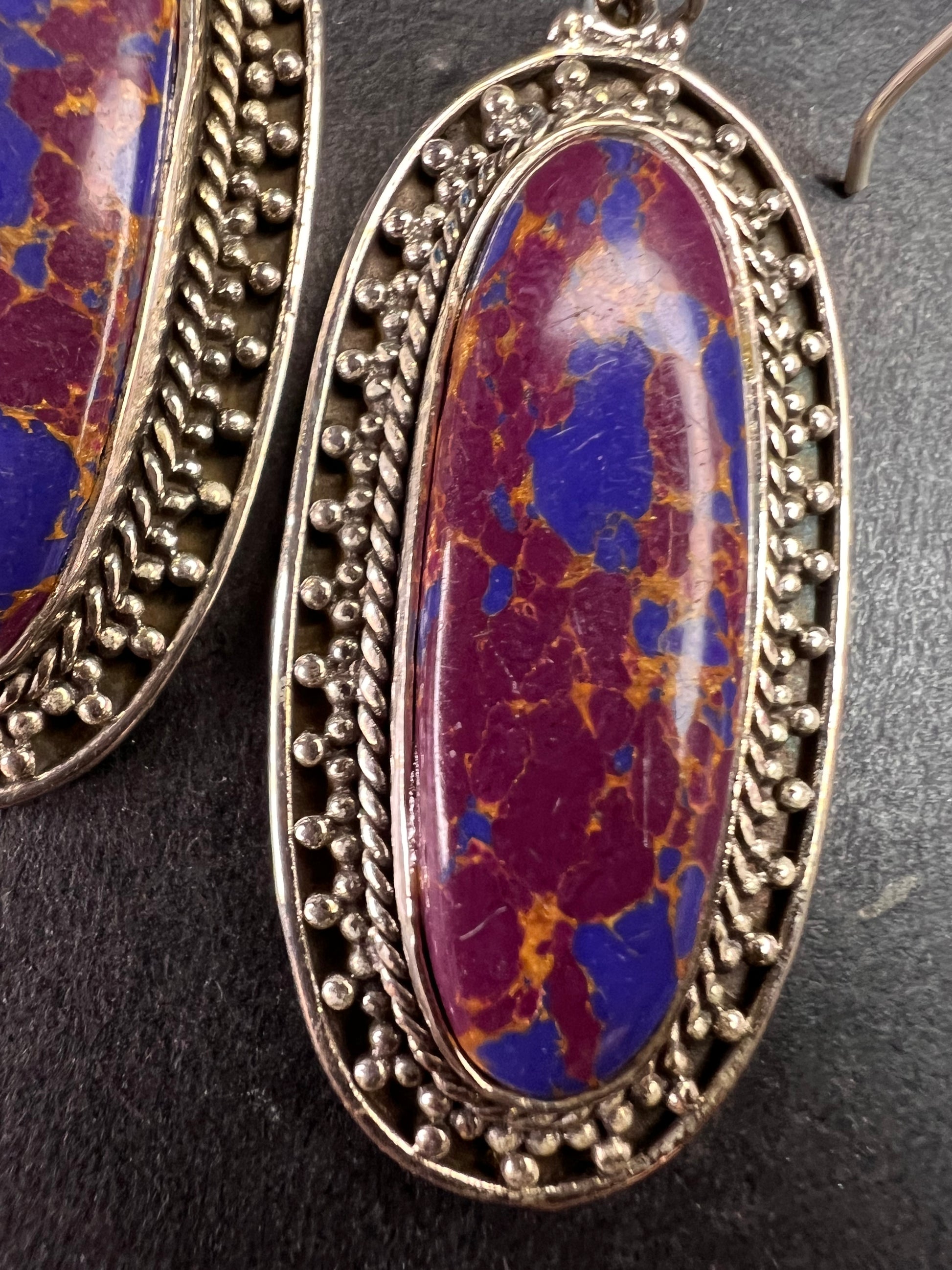 Genuine purple Mojave turquoise set in authentic 925 sterling silver that’s been black oxidized in between the detailing. Mojave turquoise is an assembled type of turquoise. Earrings measure about 10x30mm and have a total weight of 17.44 grams. French wires. Djoy 925. Made in India. Please note the weight of these earrings. They’re a little on the heavier side. Estimated retail value is $250.