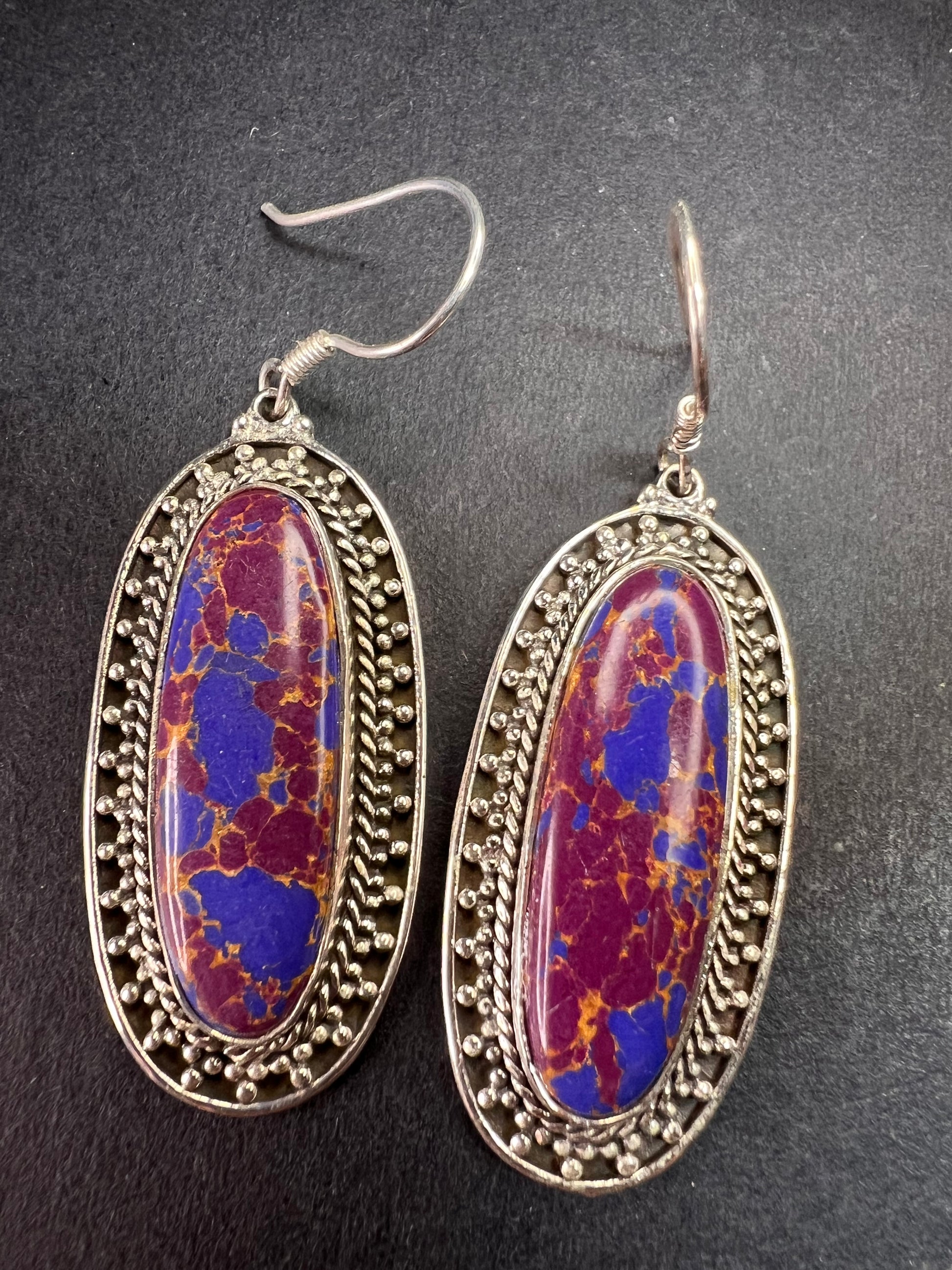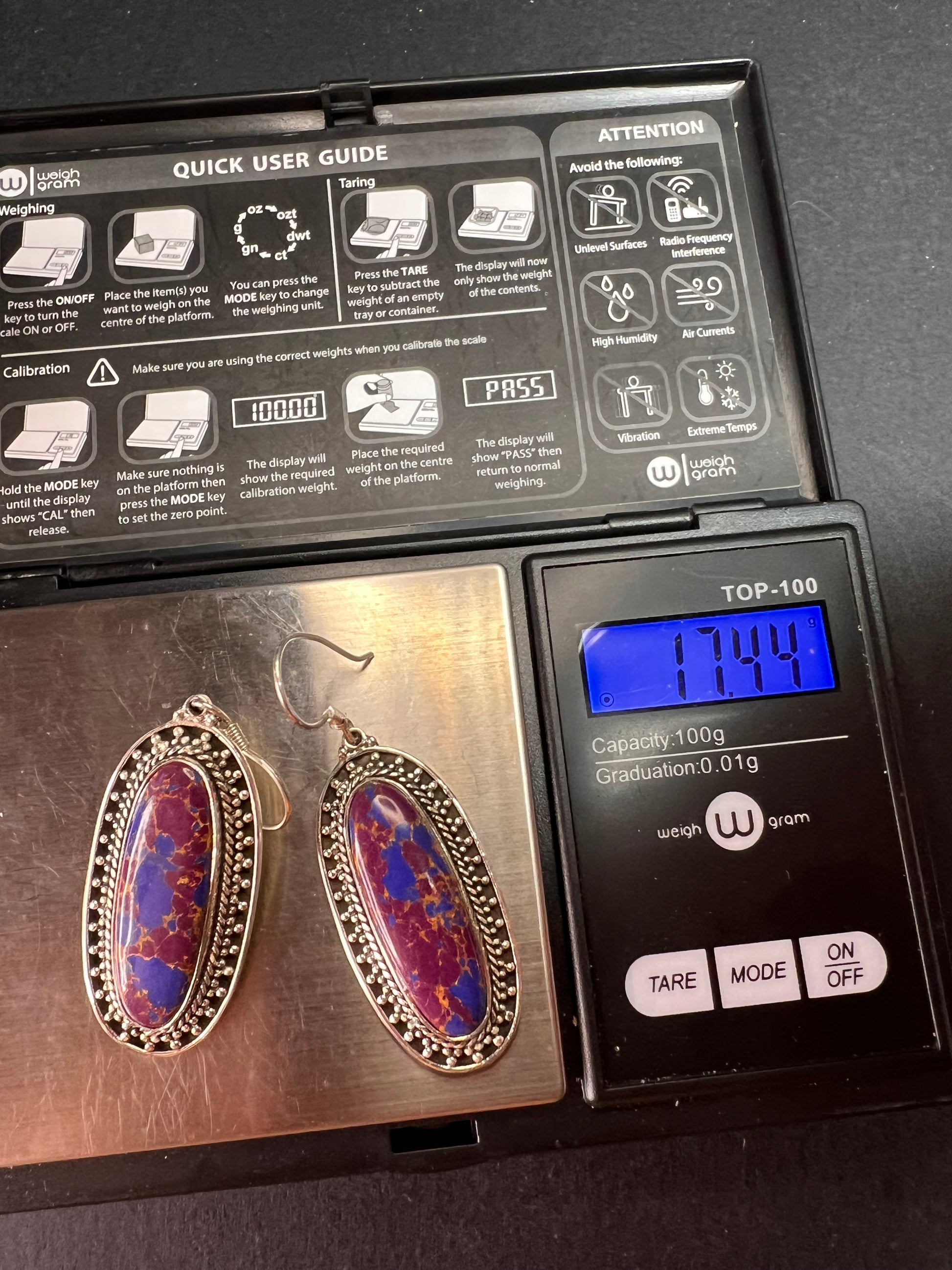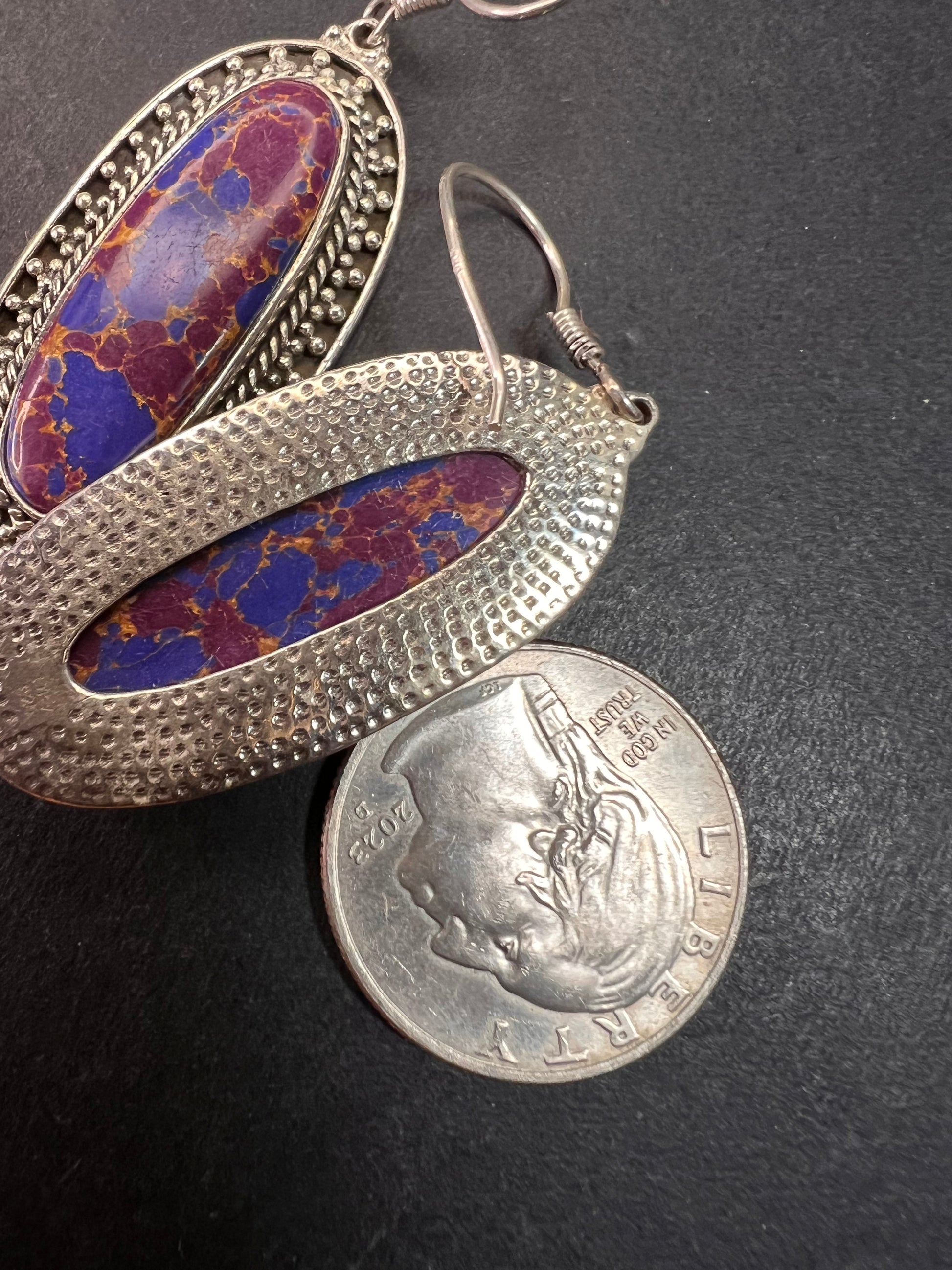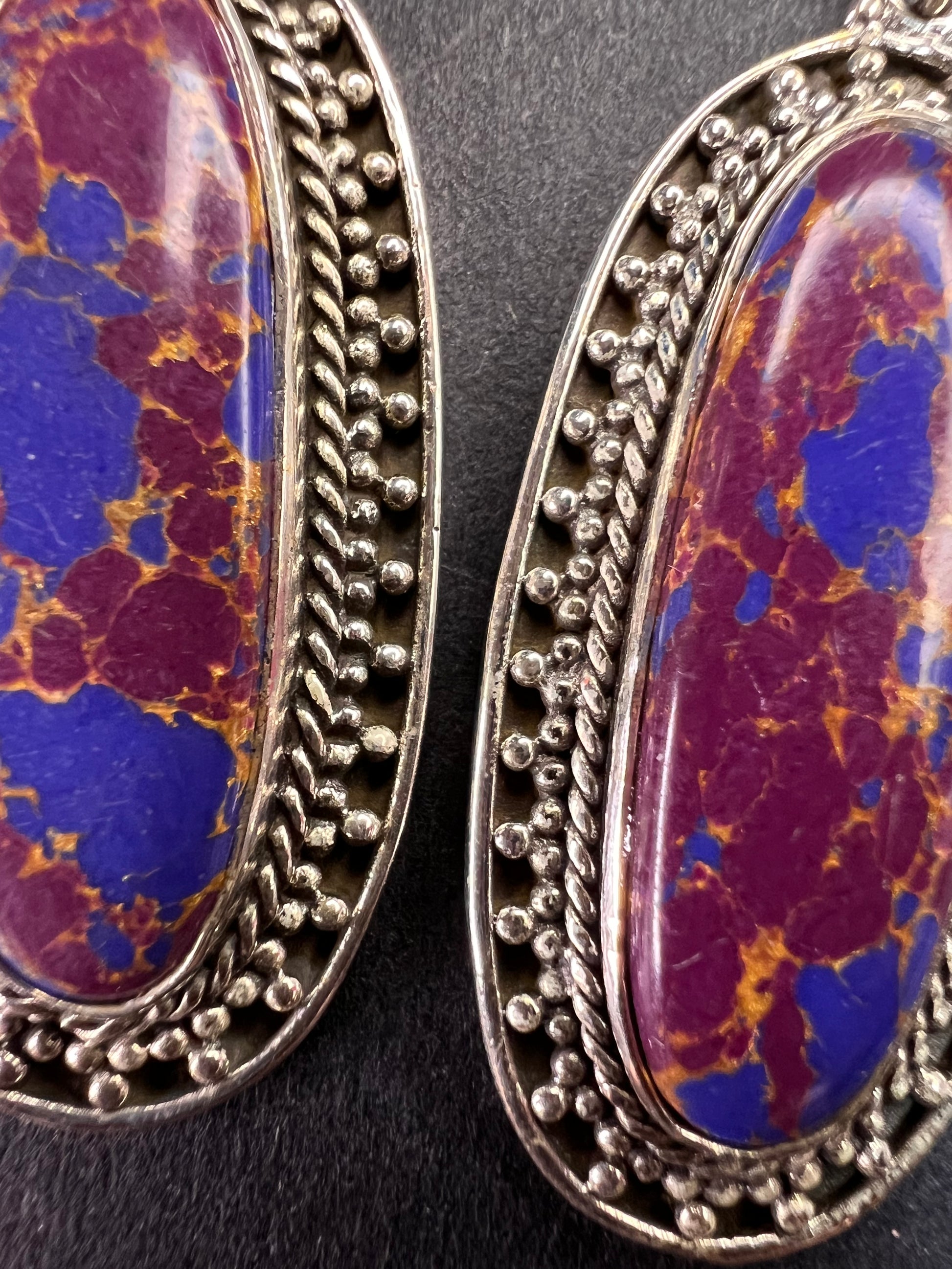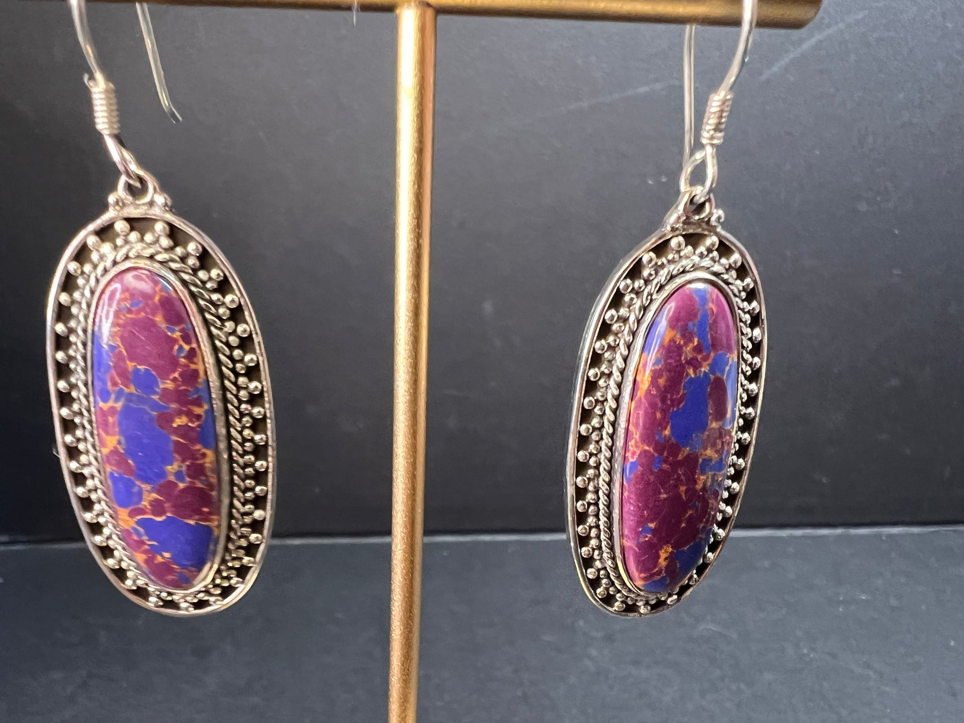 Genuine purple Mojave turquoise set in authentic 925 sterling silver that’s been black oxidized in between the detailing. Mojave turquoise is an assembled type of turquoise. Earrings measure about 10x30mm and have a total weight of 17.44 grams. French wires. Djoy 925. Made in India. Please note the weight of these earrings. They’re a little on the heavier side. Estimated retail value is $250.