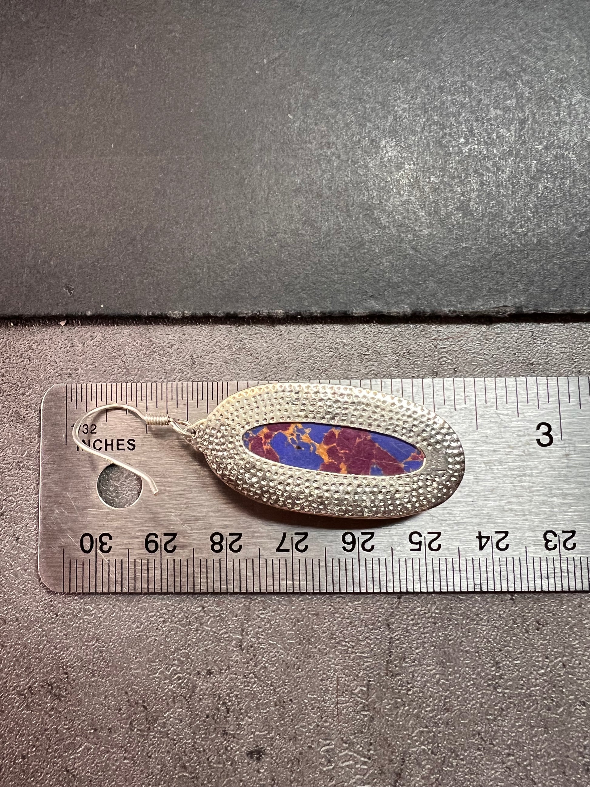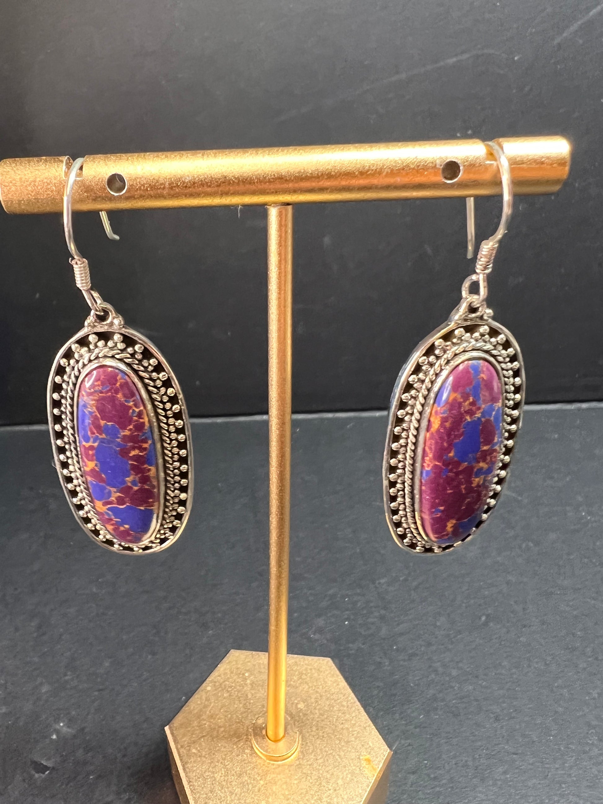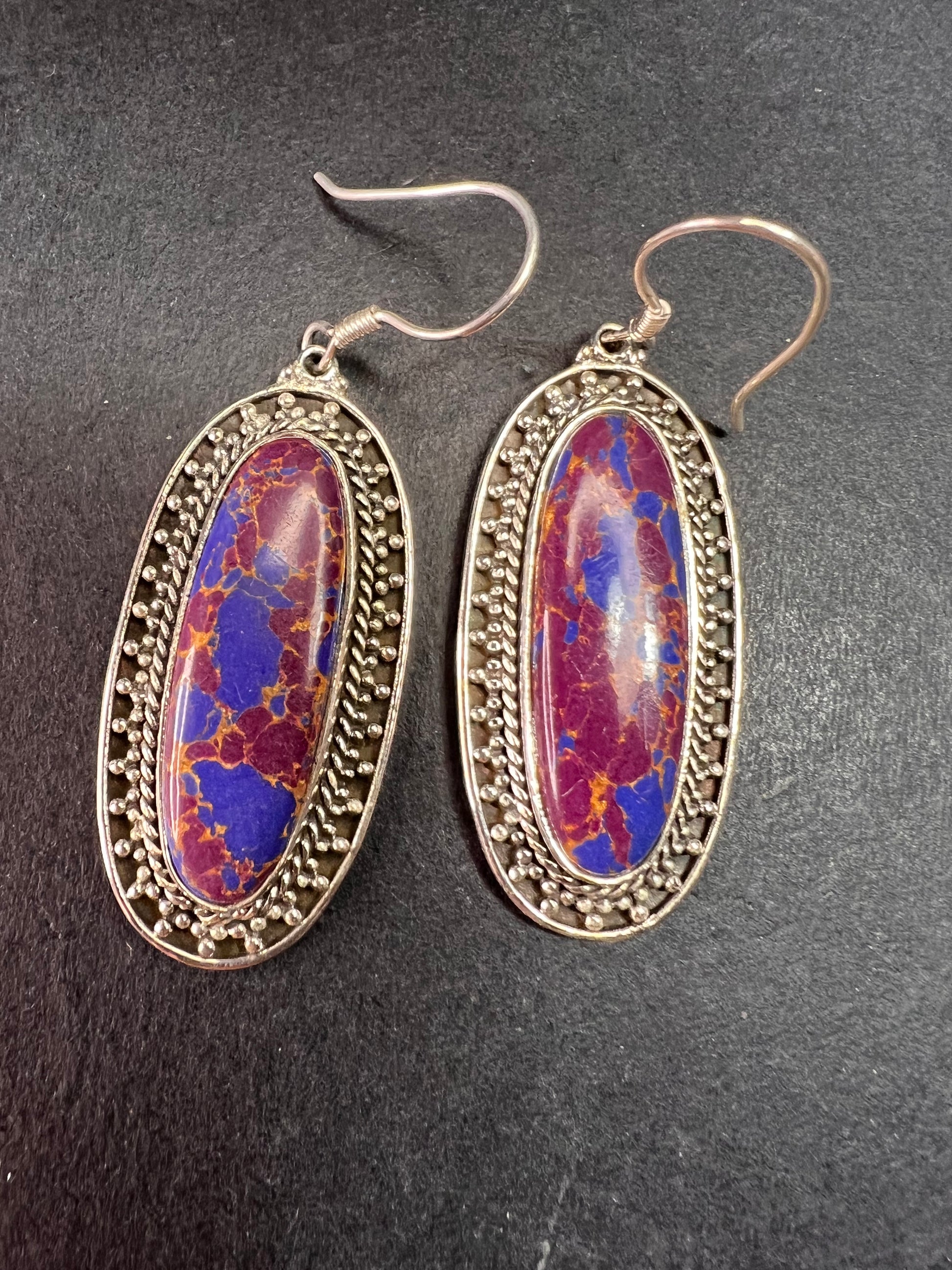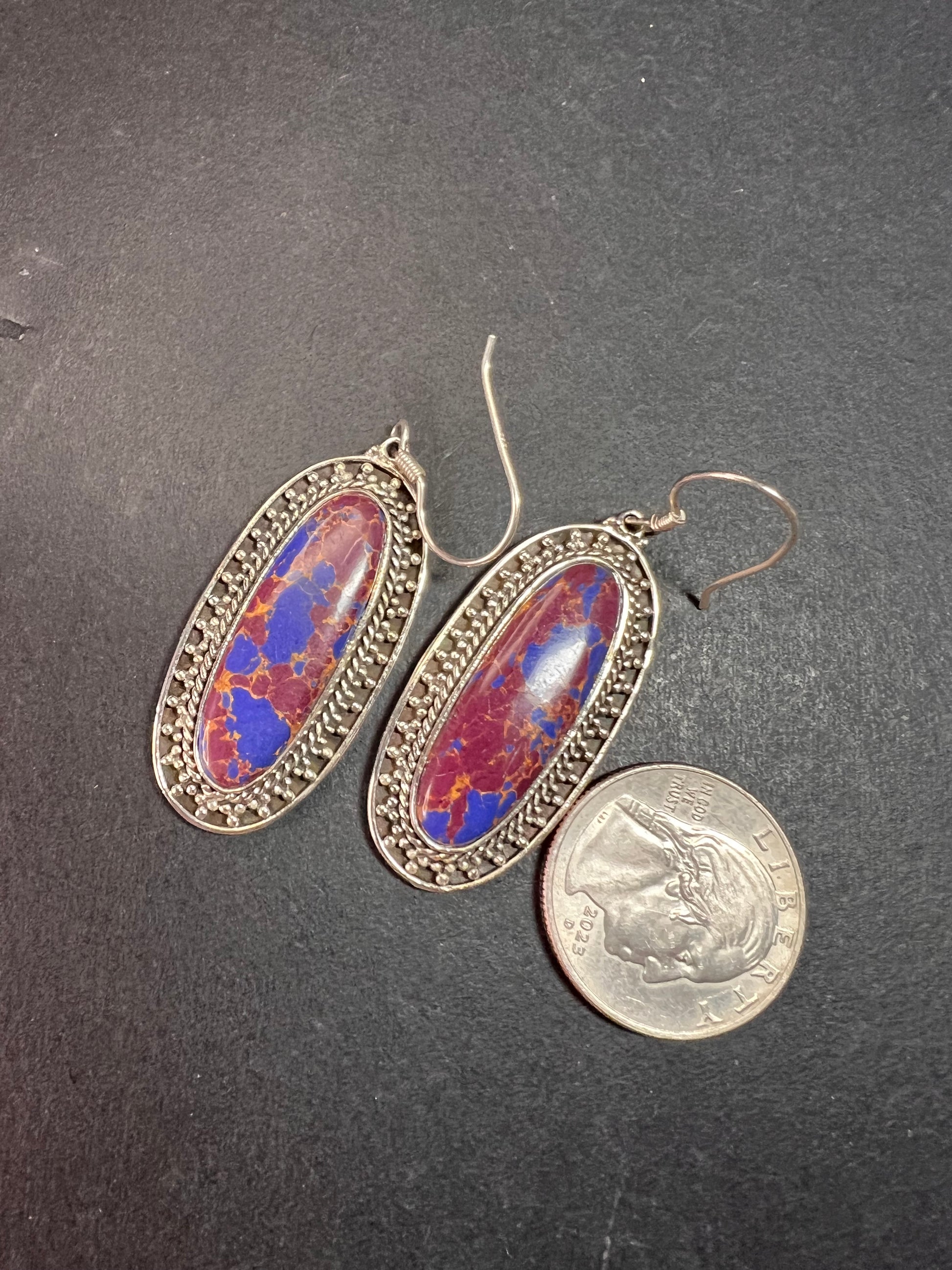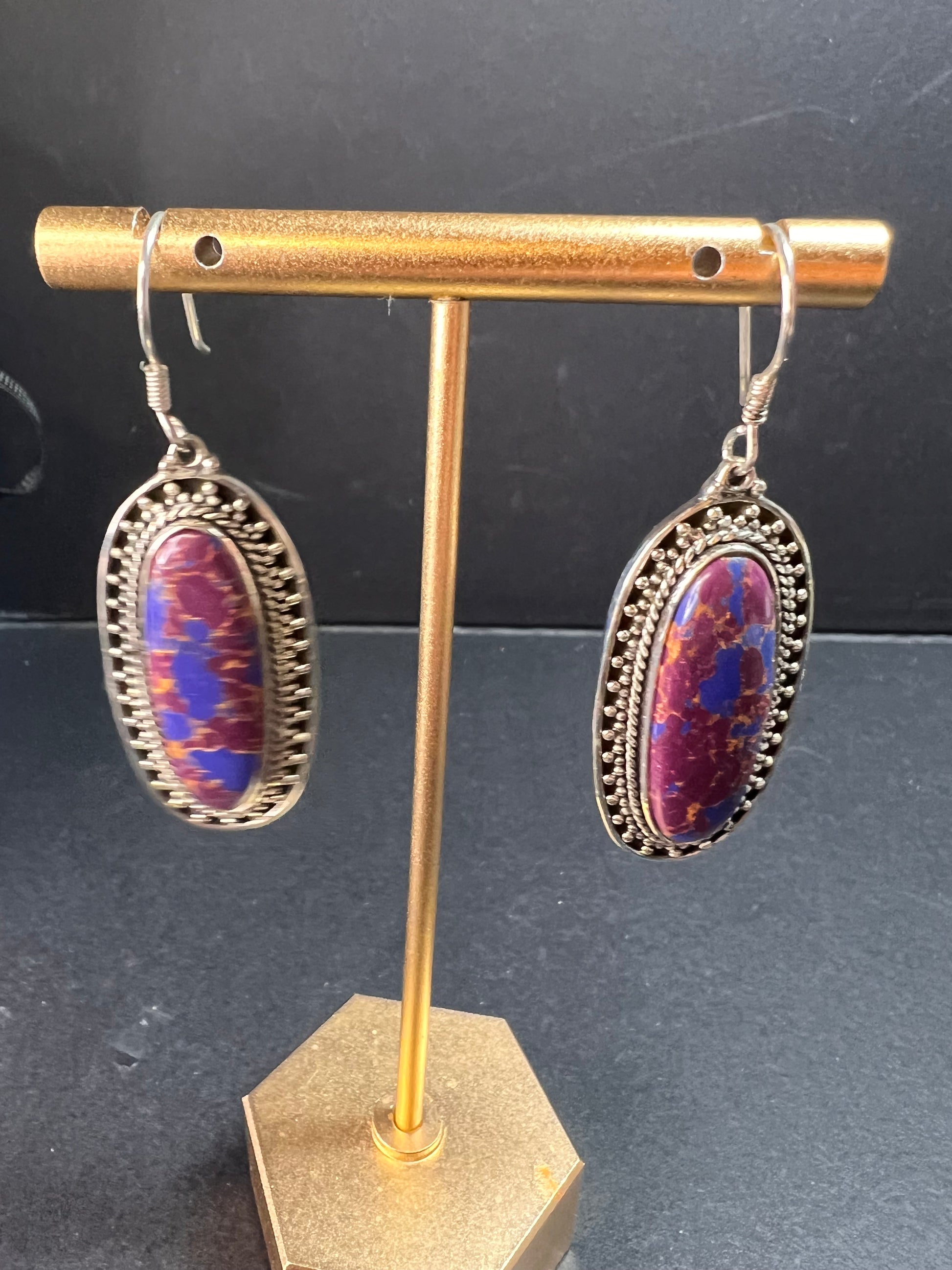 Genuine purple Mojave turquoise set in authentic 925 sterling silver that’s been black oxidized in between the detailing. Mojave turquoise is an assembled type of turquoise. Earrings measure about 10x30mm and have a total weight of 17.44 grams. French wires. Djoy 925. Made in India. Please note the weight of these earrings. They’re a little on the heavier side. Estimated retail value is $250.