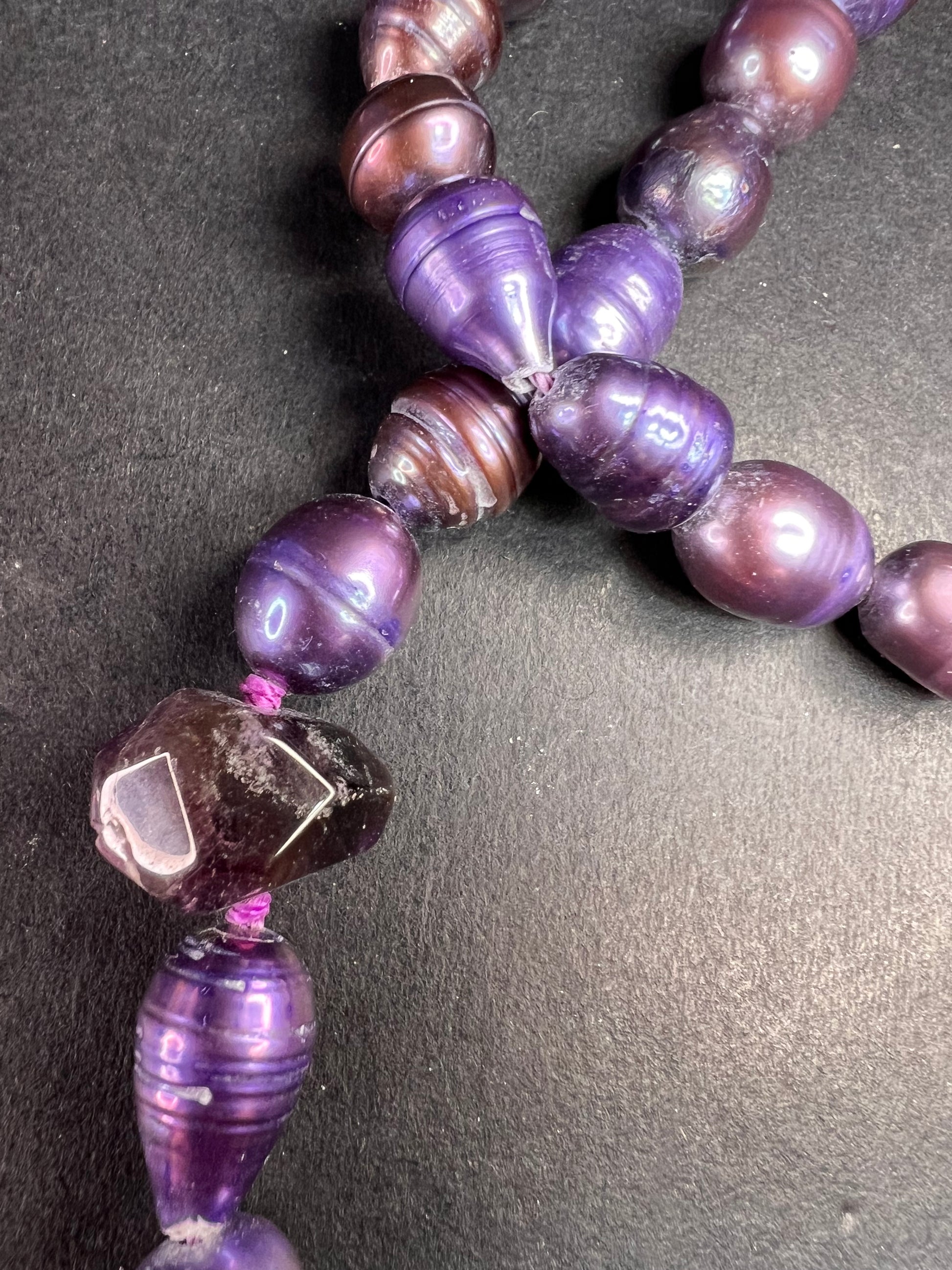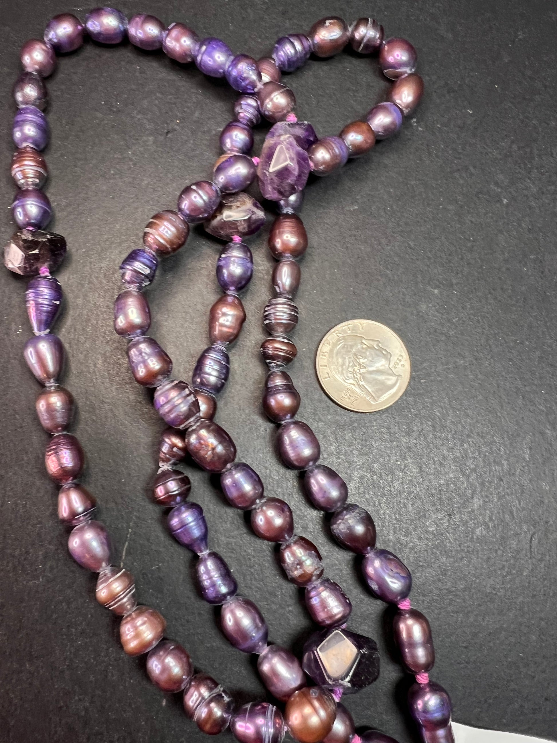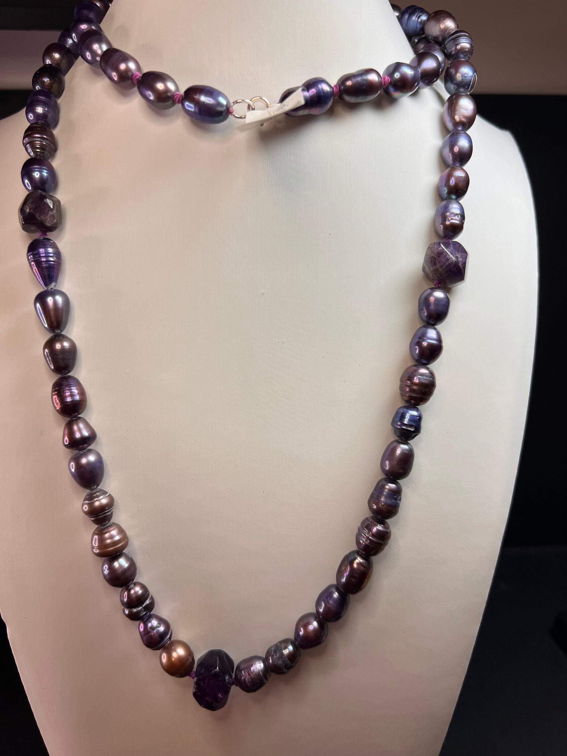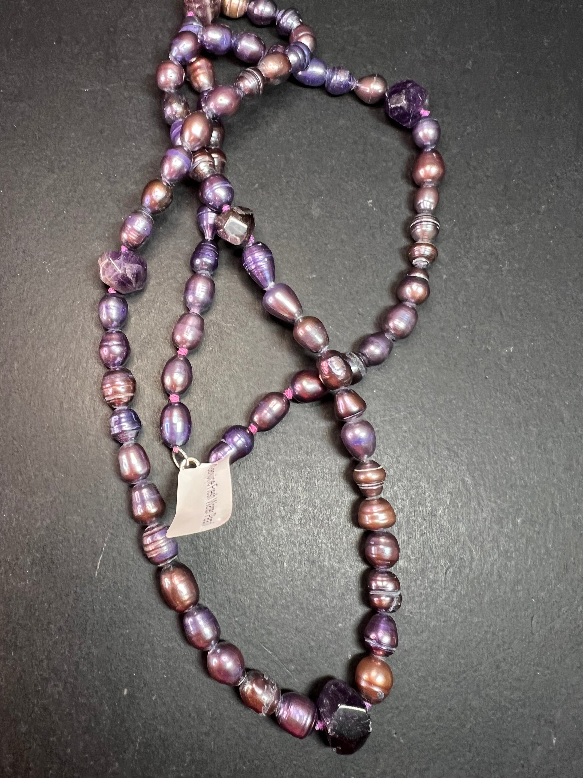 Genuine freshwater pearls that have been dyed shades of purple , stationed 5 chunky amethyst stone beads hand knotted on both sides and strung on purple cord. 925 sterling silver spring ring clasp. Measures about 36 inches in length.