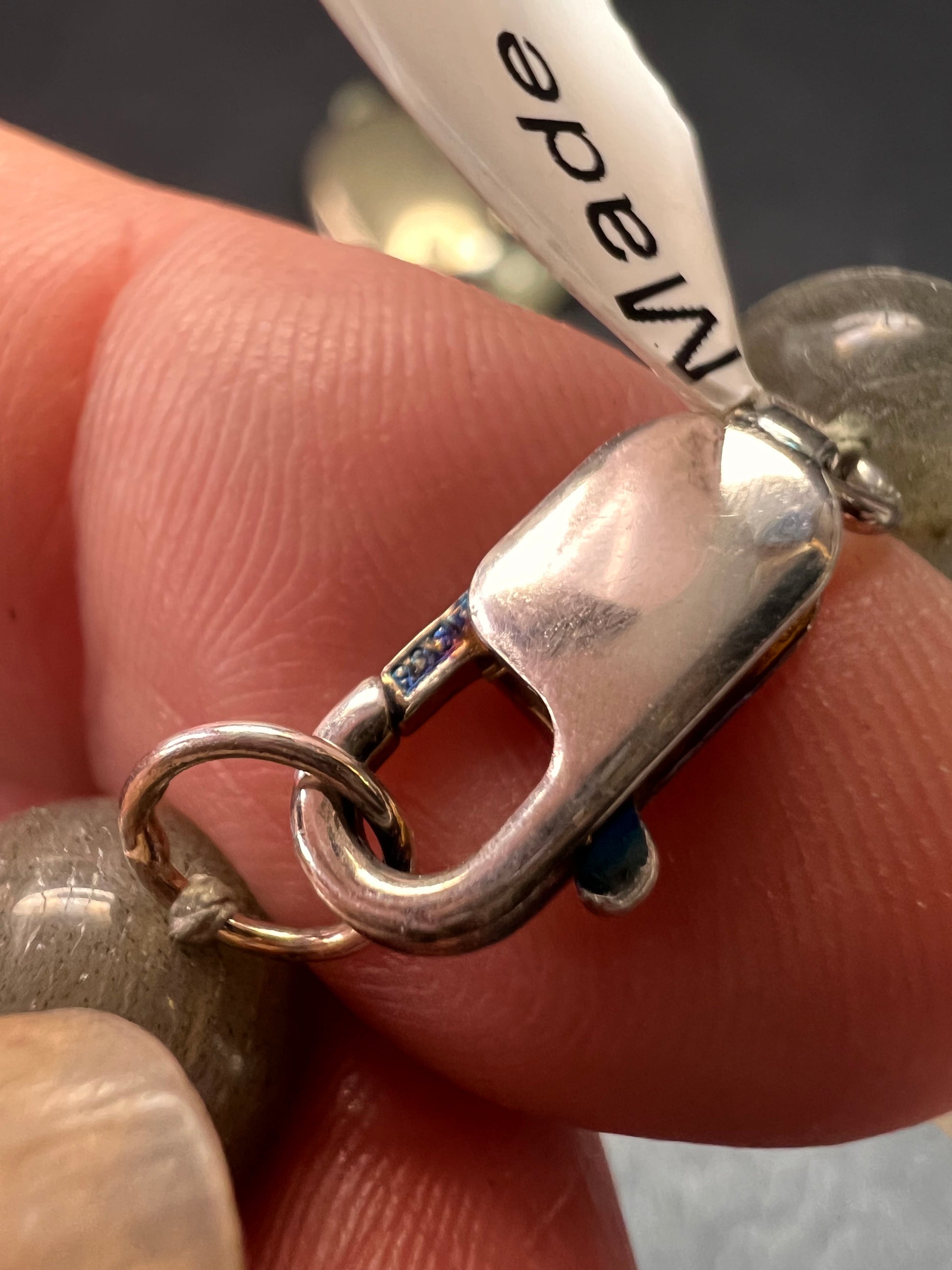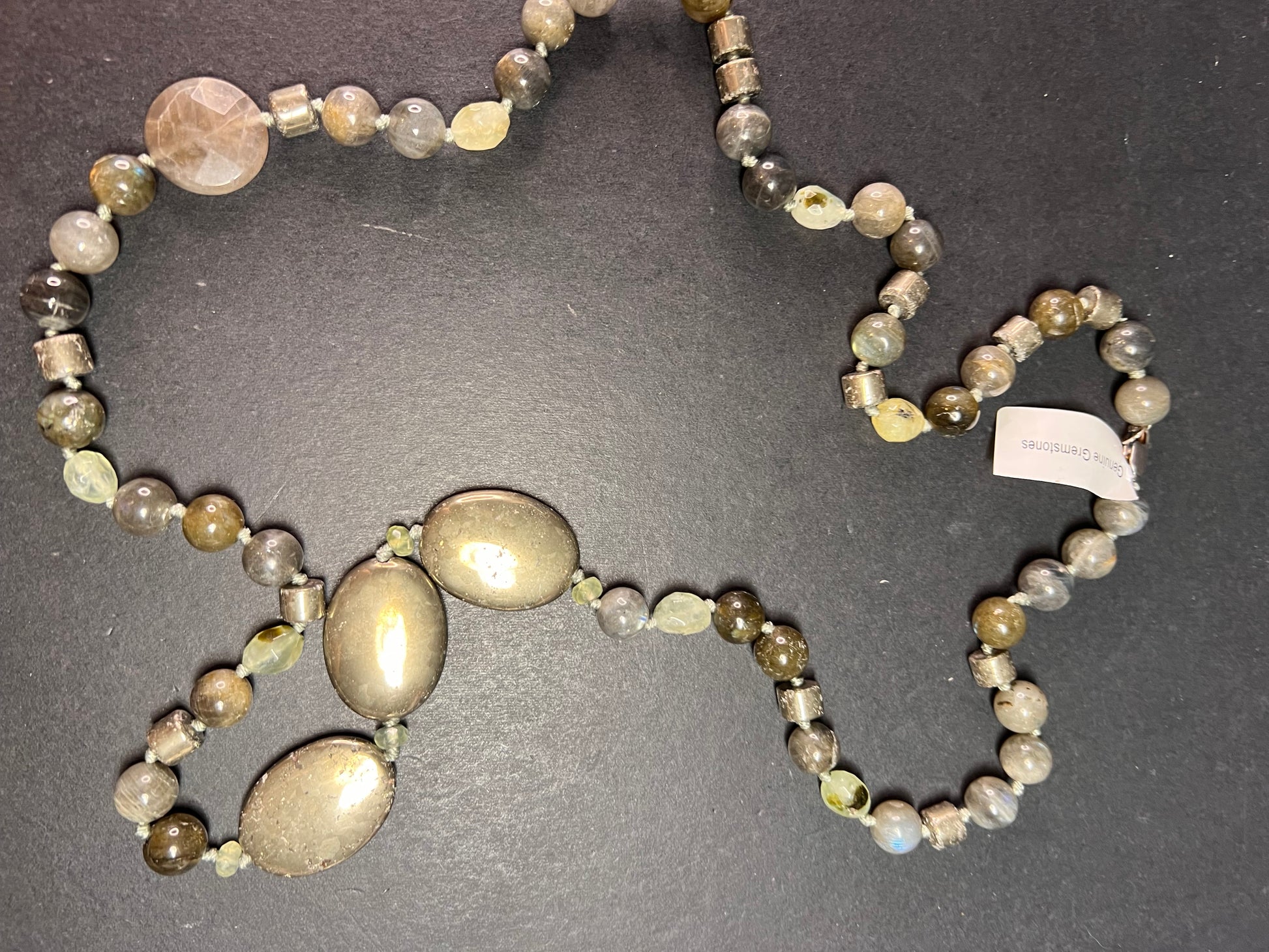 Genuine labradorite, prehnite, and pyrite stone beads on a 32 inch strand knitted in between in abstract patterns on grey cord. Clasp is a 925 sterling silver lobster clasp. Made in China.