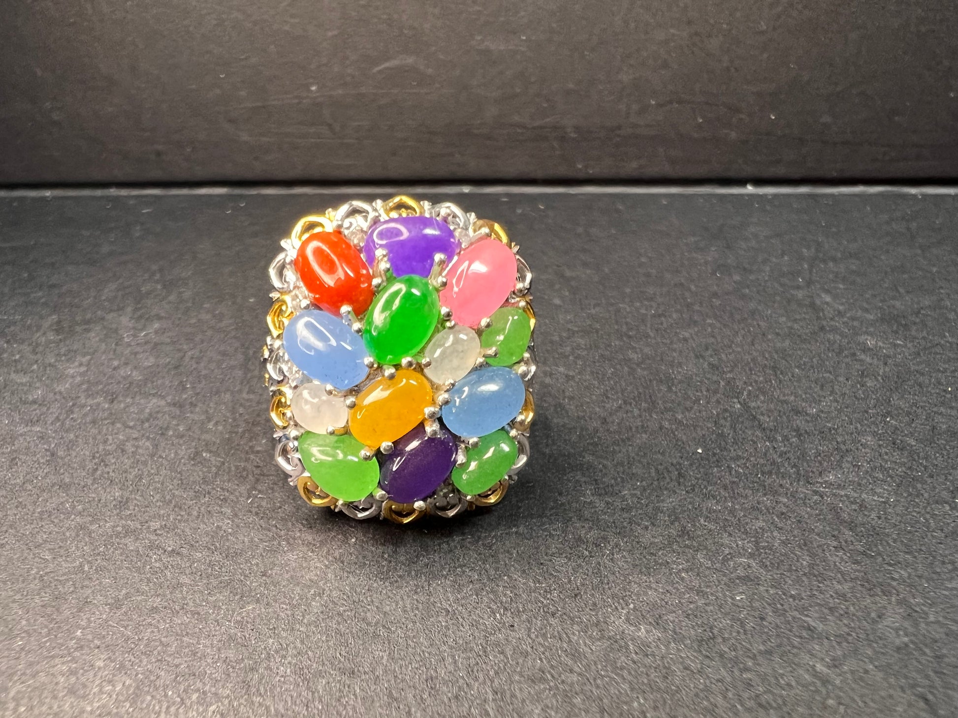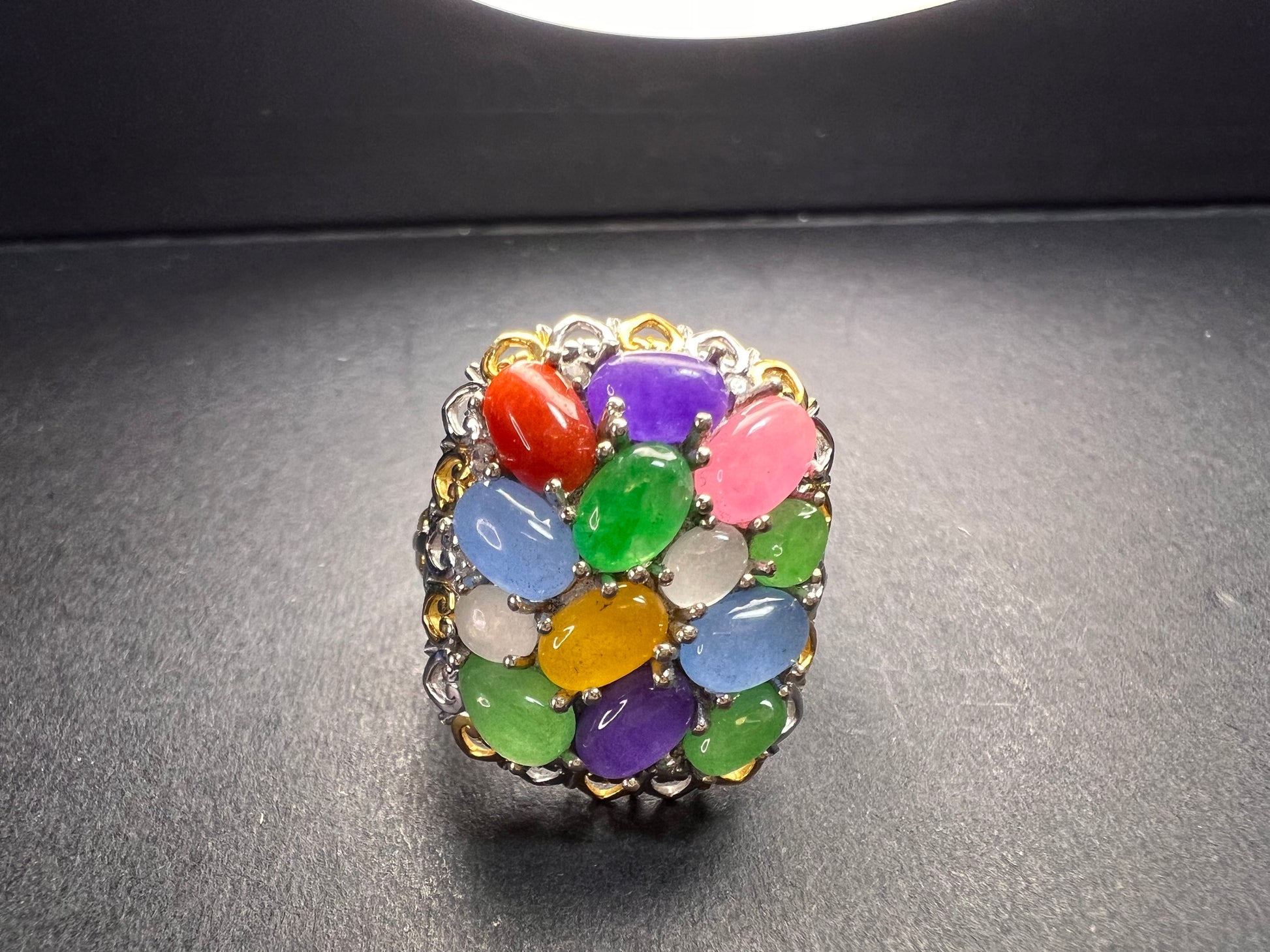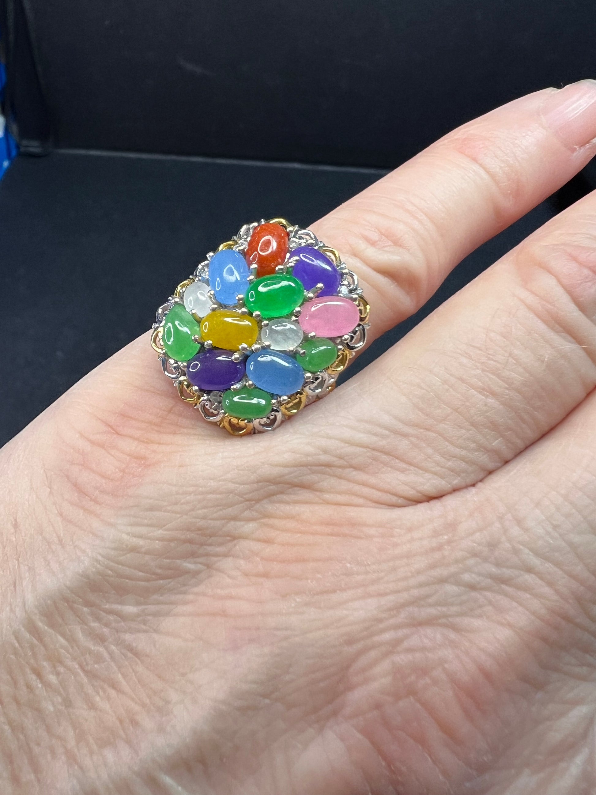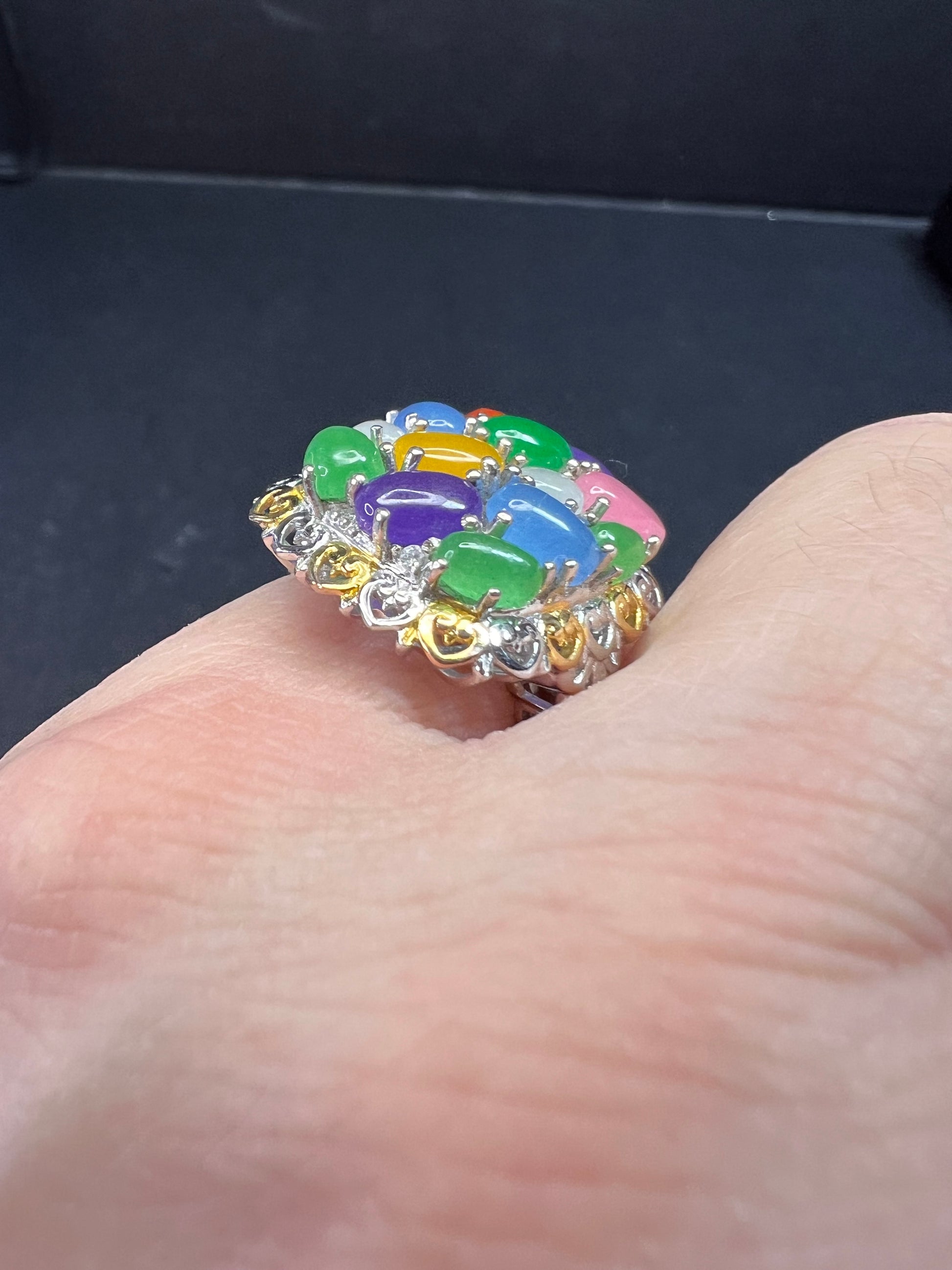 Genuine multi colored jade cluster stones prong set in an authentic 925 sterling silver cluster setting plated with rhodium and vermeil yellow gold for a two toned finish. Most of the jade stones have been dyed for color enhancement. Measures a size 5. There are 6 tiny white accent zircon gemstones that are hard to spot in between some of the jade stones. 6.60 total ctw. Djoy. Made in India. Estimated retail value is $430.