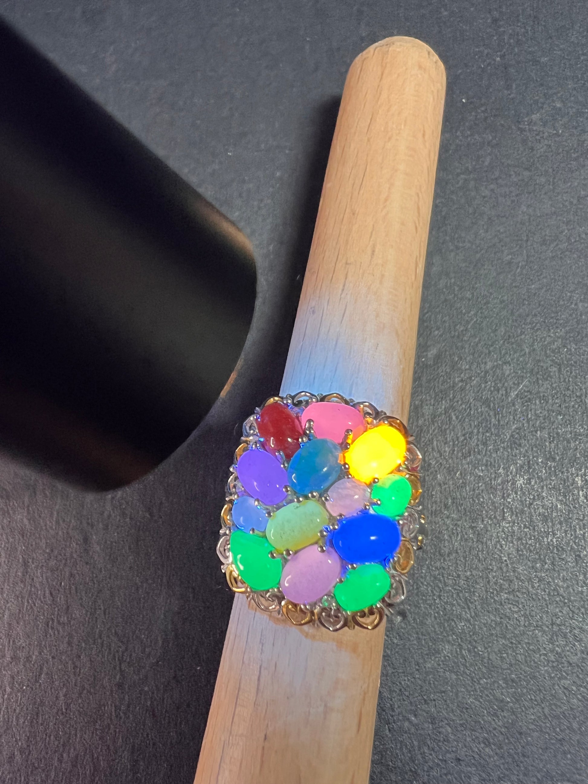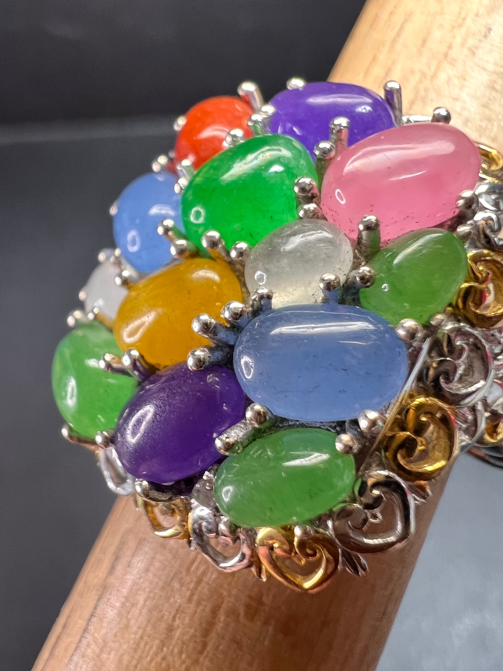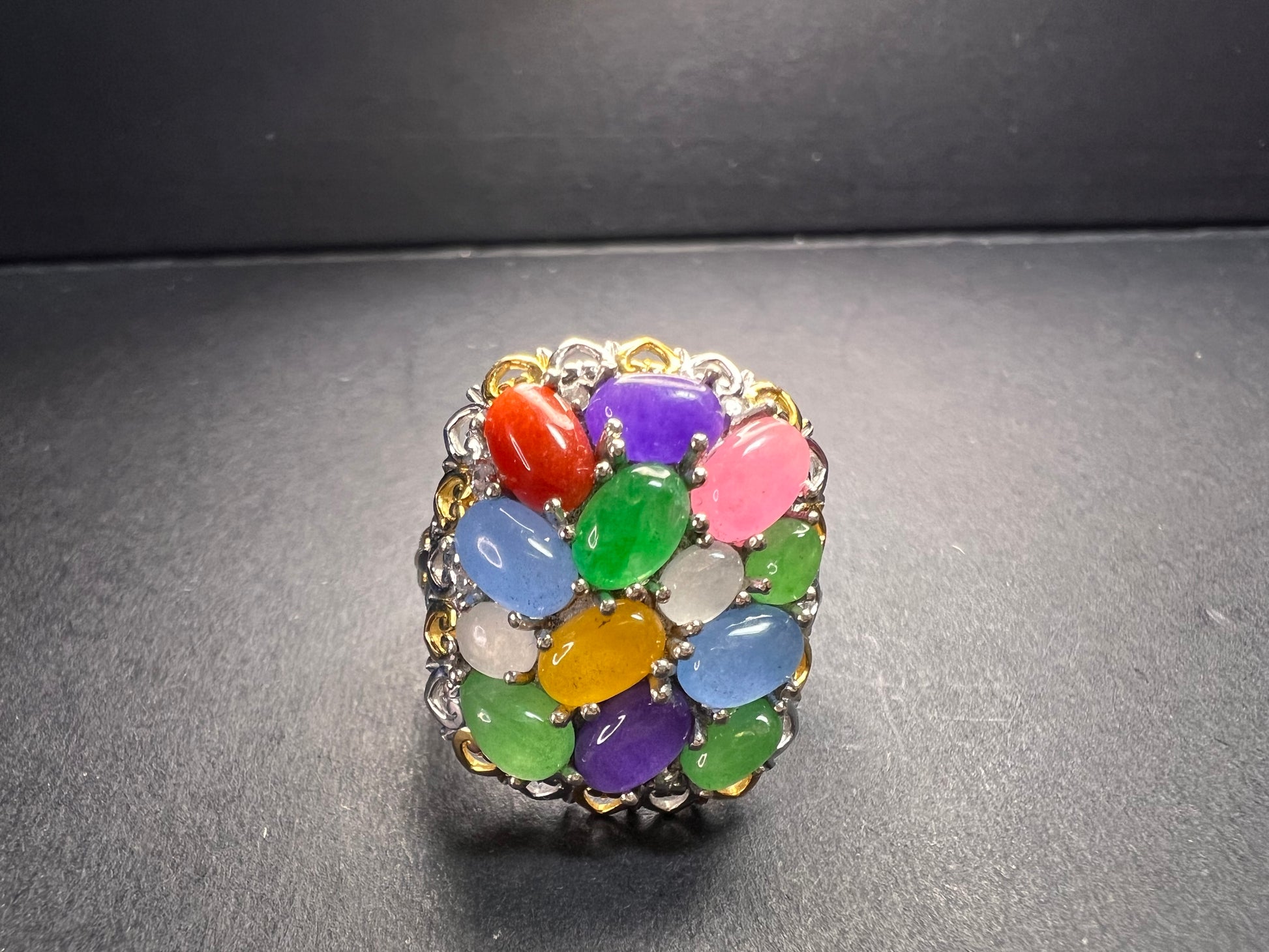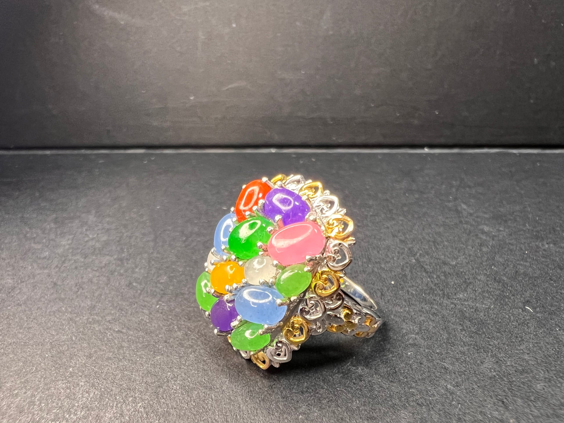 Genuine multi colored jade cluster stones prong set in an authentic 925 sterling silver cluster setting plated with rhodium and vermeil yellow gold for a two toned finish. Most of the jade stones have been dyed for color enhancement. Measures a size 5. There are 6 tiny white accent zircon gemstones that are hard to spot in between some of the jade stones. 6.60 total ctw. Djoy. Made in India. Estimated retail value is $430.