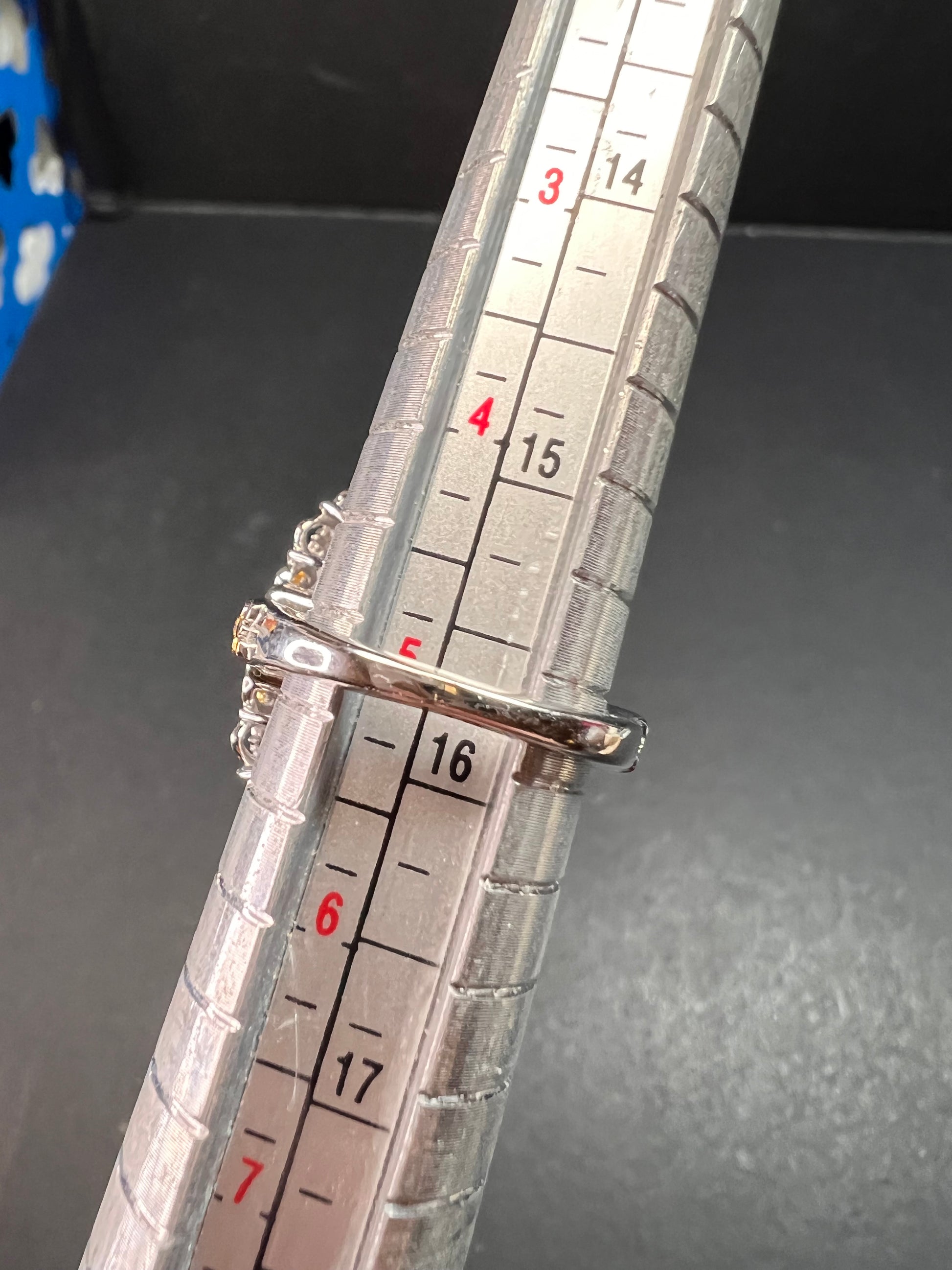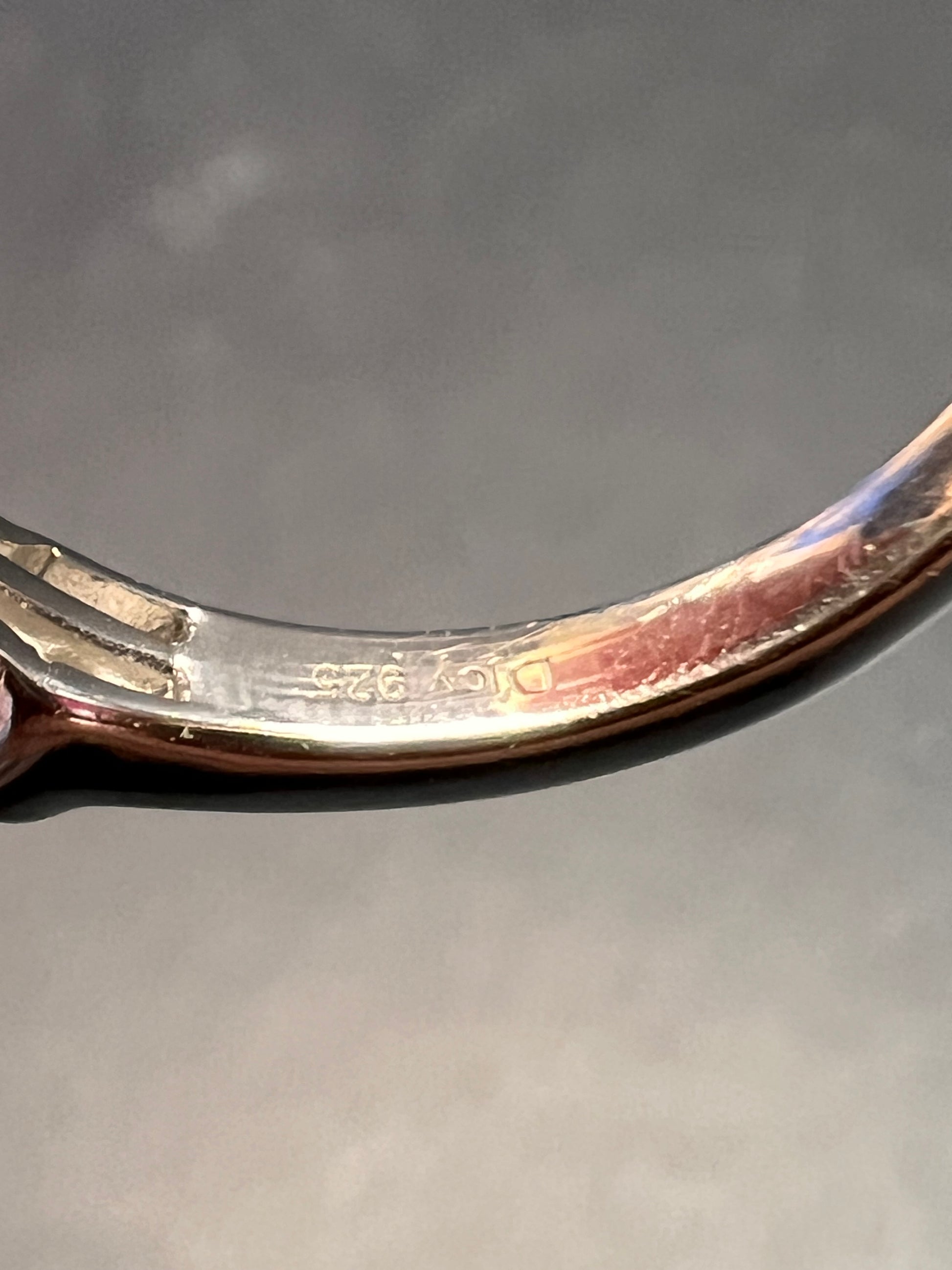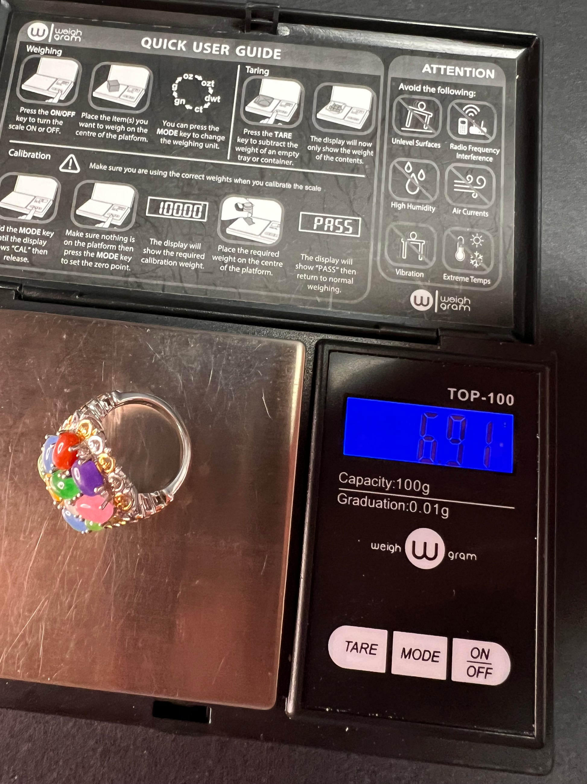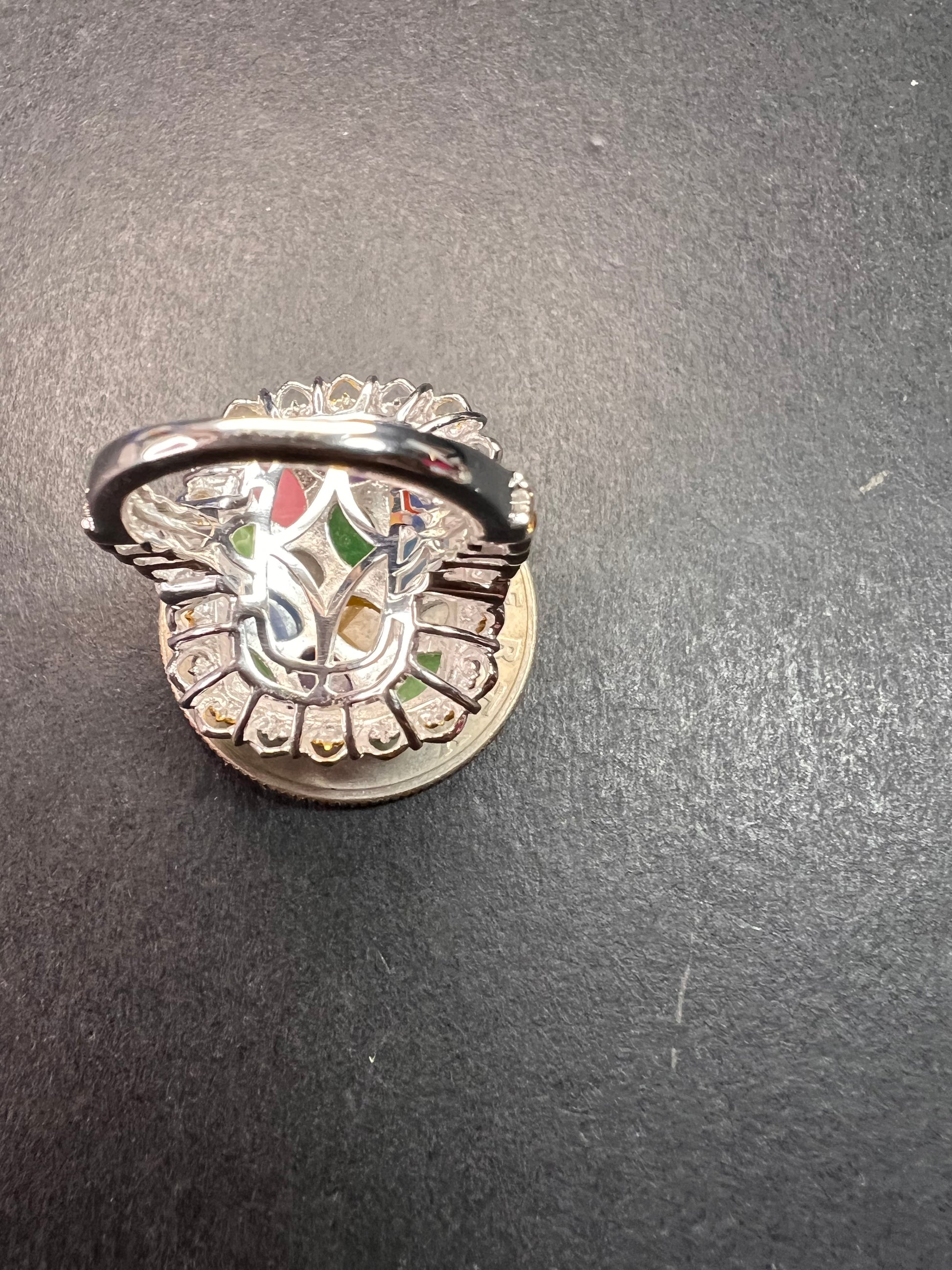 Genuine multi colored jade cluster stones prong set in an authentic 925 sterling silver cluster setting plated with rhodium and vermeil yellow gold for a two toned finish. Most of the jade stones have been dyed for color enhancement. Measures a size 5. There are 6 tiny white accent zircon gemstones that are hard to spot in between some of the jade stones. 6.60 total ctw. Djoy. Made in India. Estimated retail value is $430.