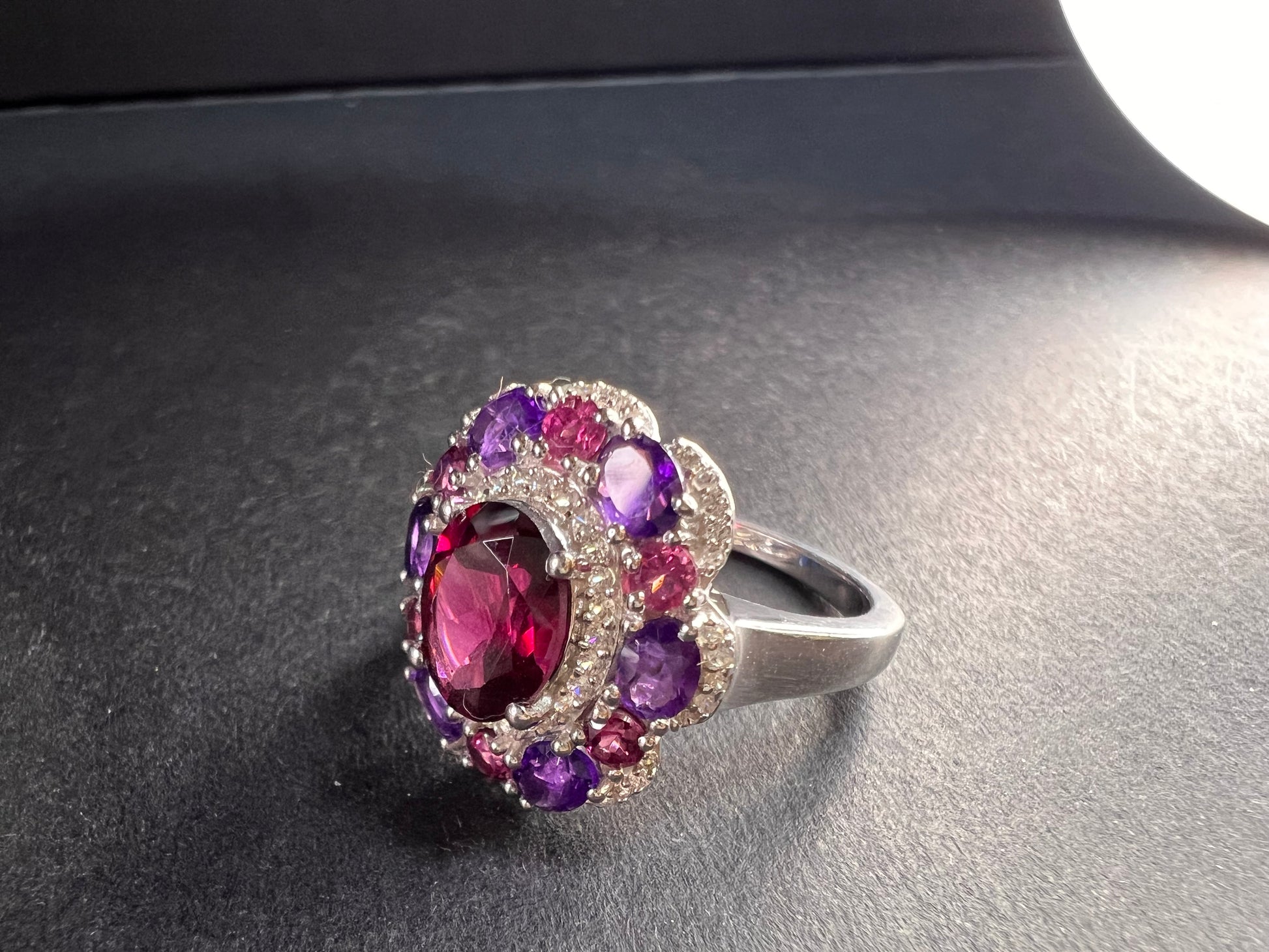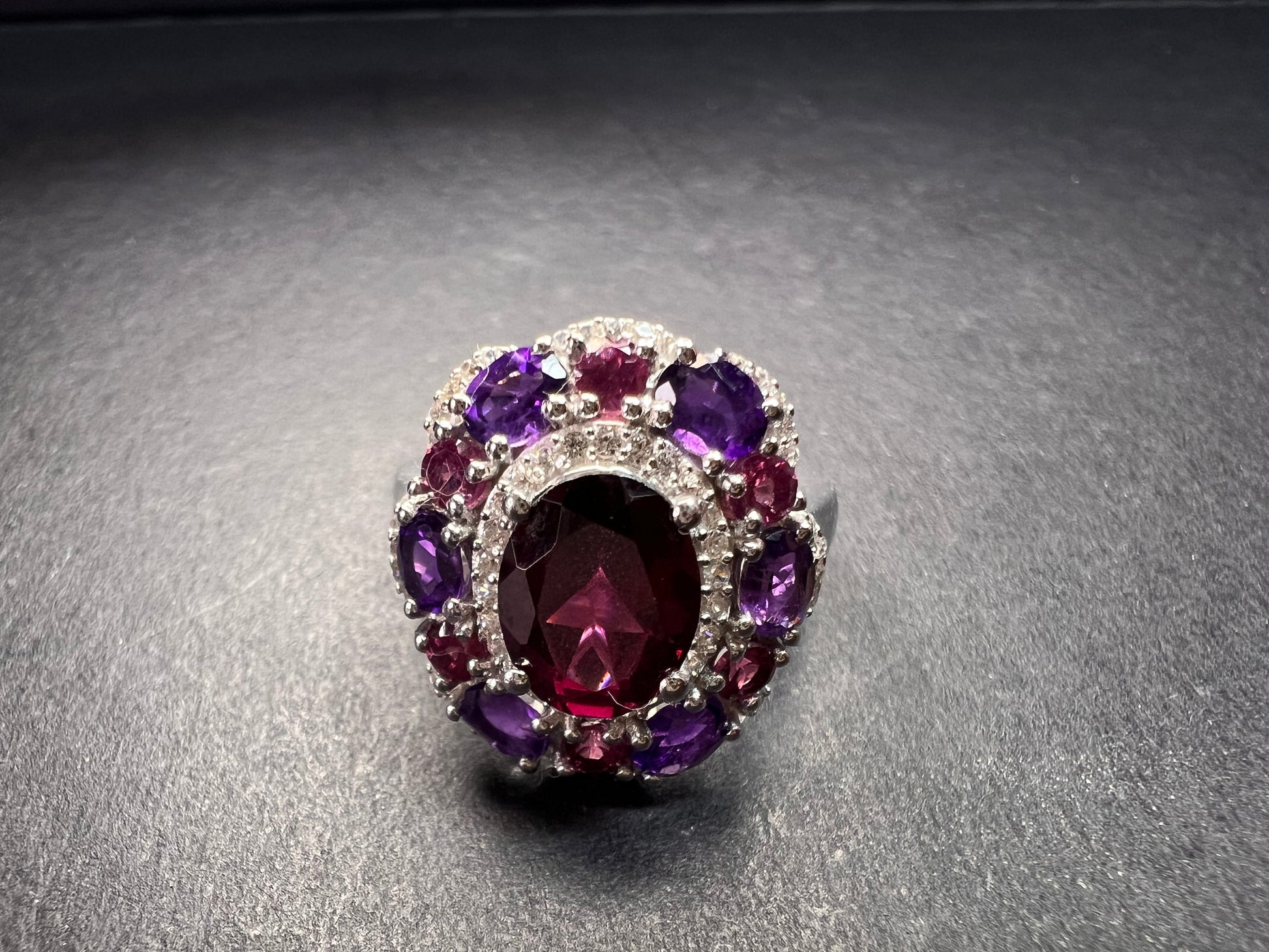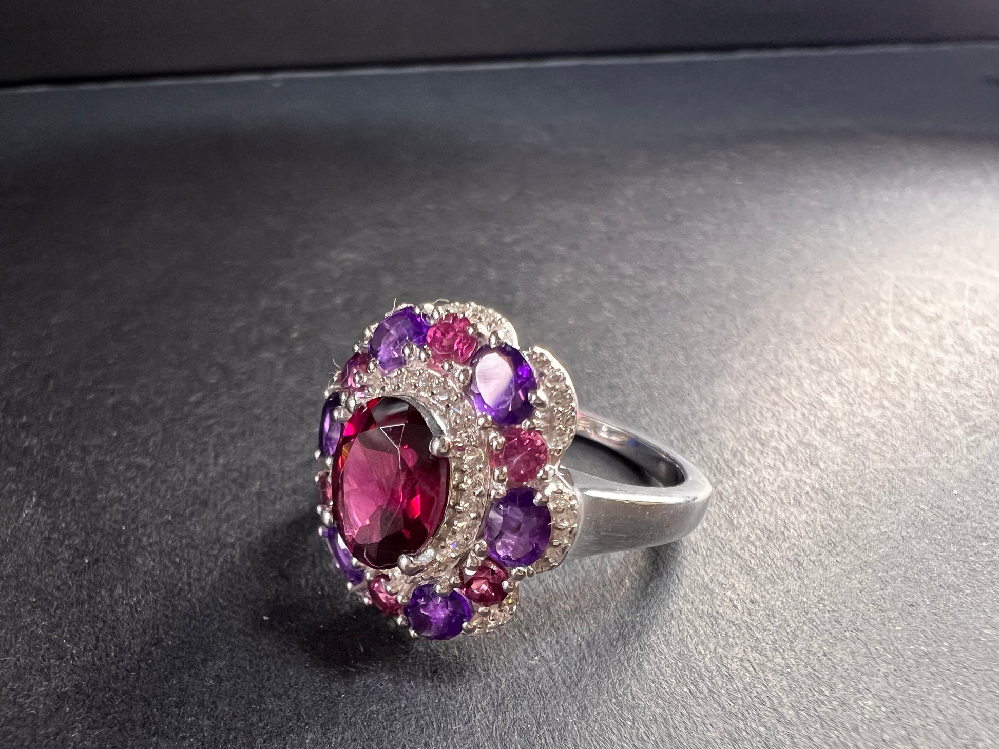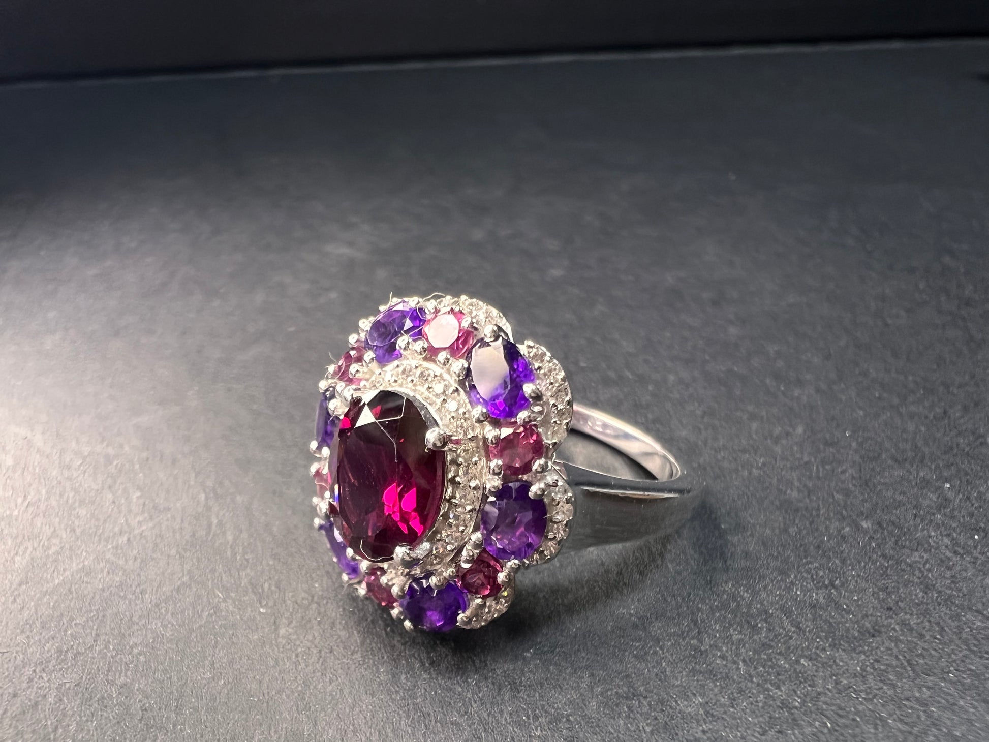 Genuine orissa rhodolite garnet with purple amethyst gemstones prong set in authentic 925 sterling silver plated with rhodium. White accent stones are zircon. Total ctw is 4.00. Measures a size 7. Garnets are natural and untreated. Amethysts are natural and heat treated for color enhancement. Djoy. Made in India. Estimated retail value is $750.
