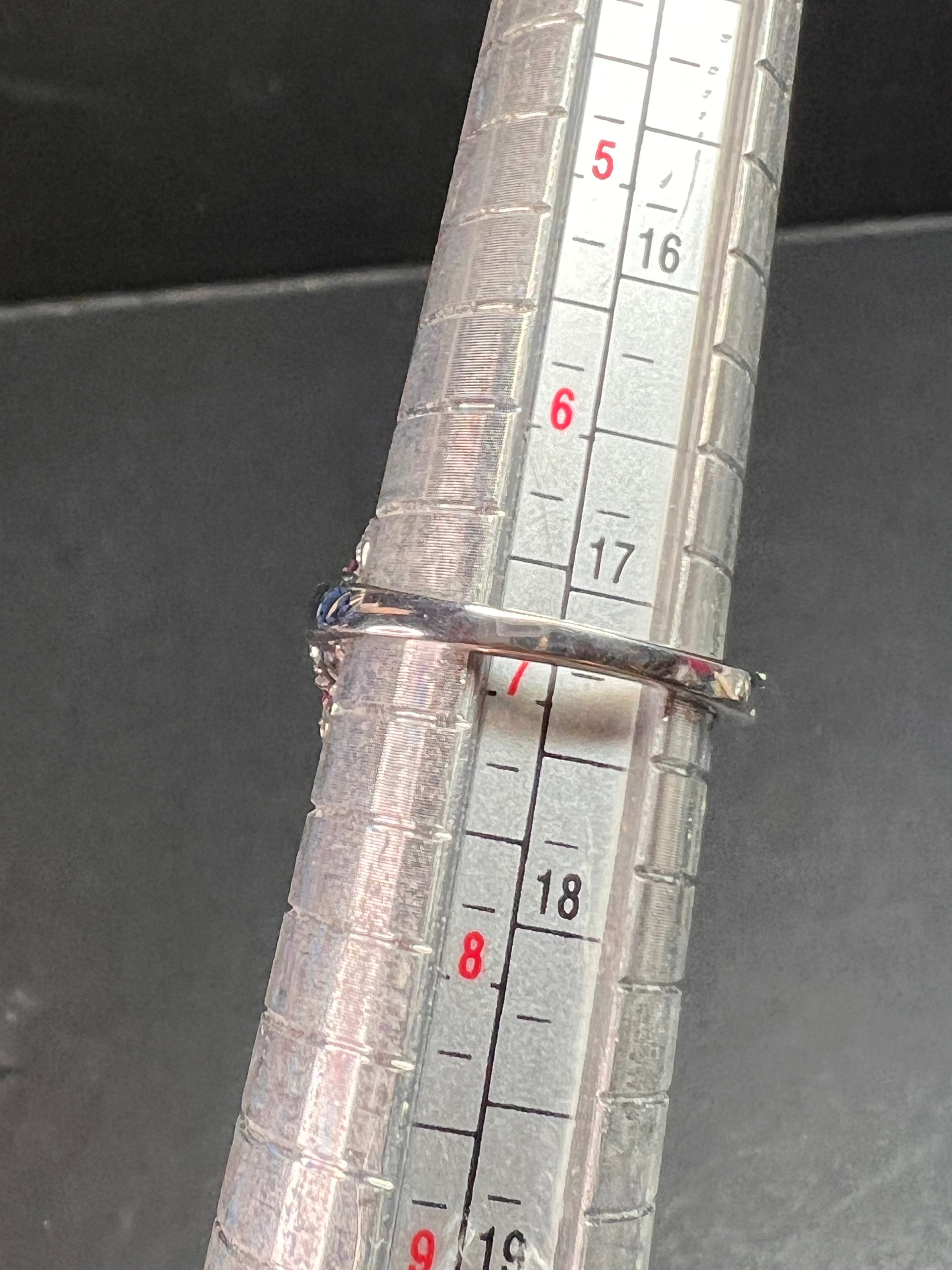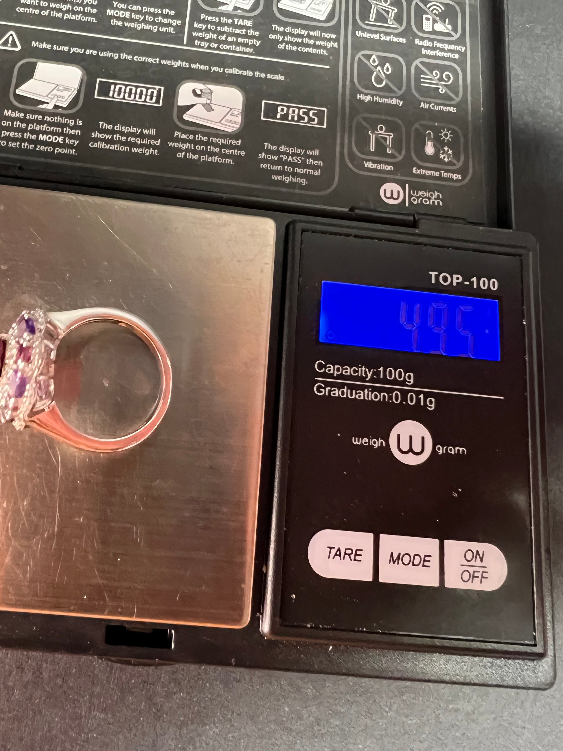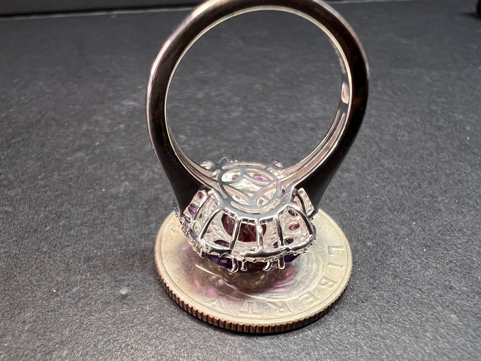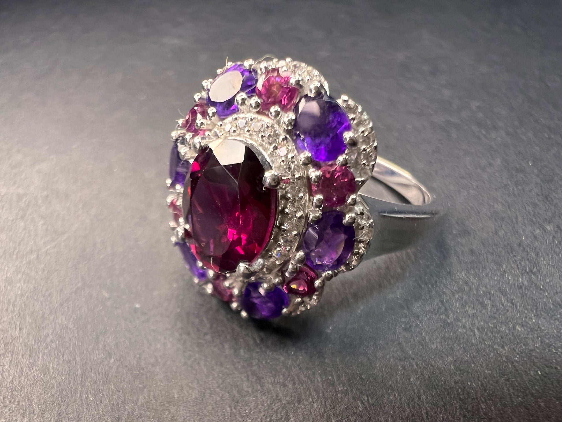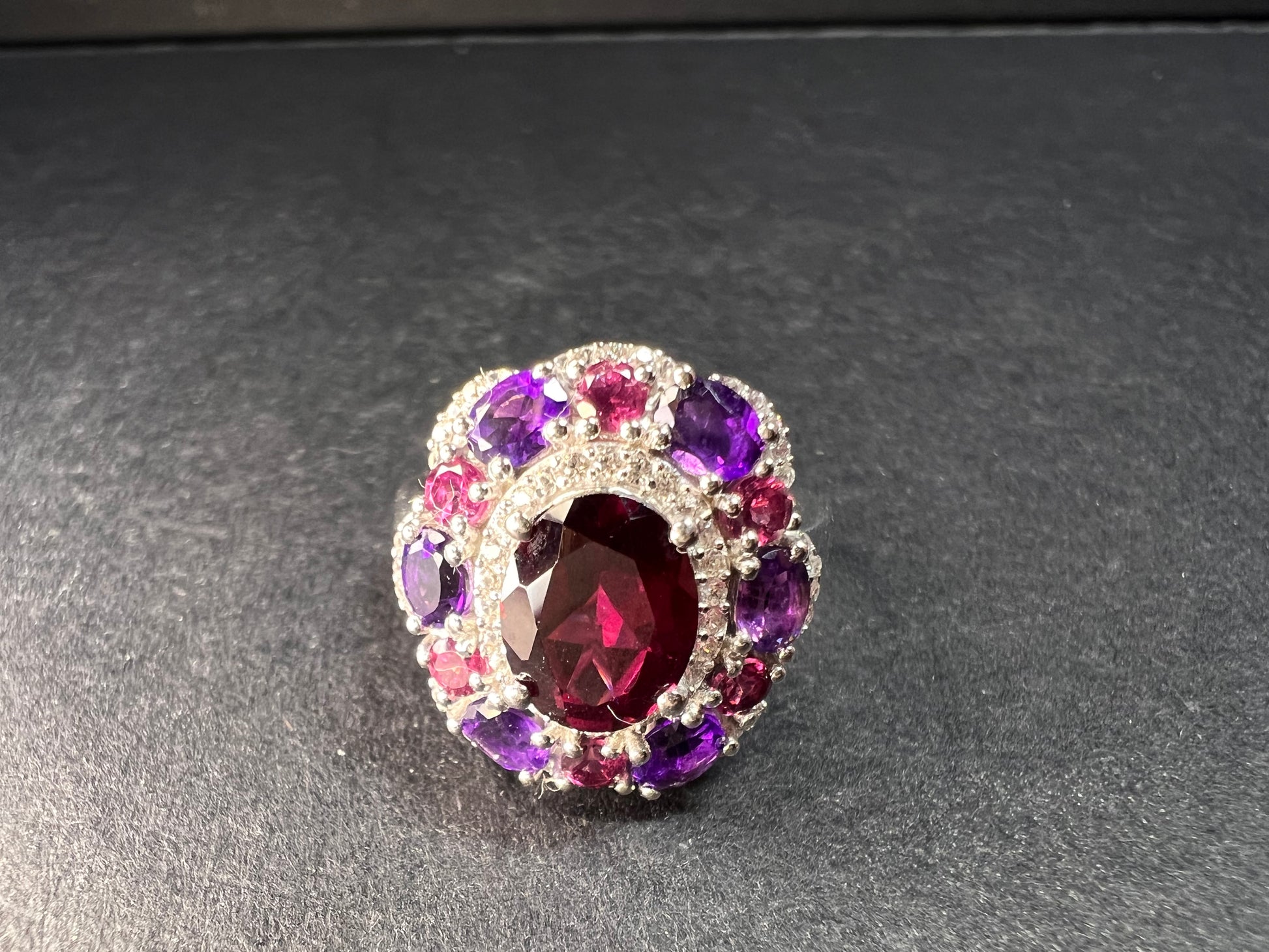 Genuine orissa rhodolite garnet with purple amethyst gemstones prong set in authentic 925 sterling silver plated with rhodium. White accent stones are zircon. Total ctw is 4.00. Measures a size 7. Garnets are natural and untreated. Amethysts are natural and heat treated for color enhancement. Djoy. Made in India. Estimated retail value is $750.