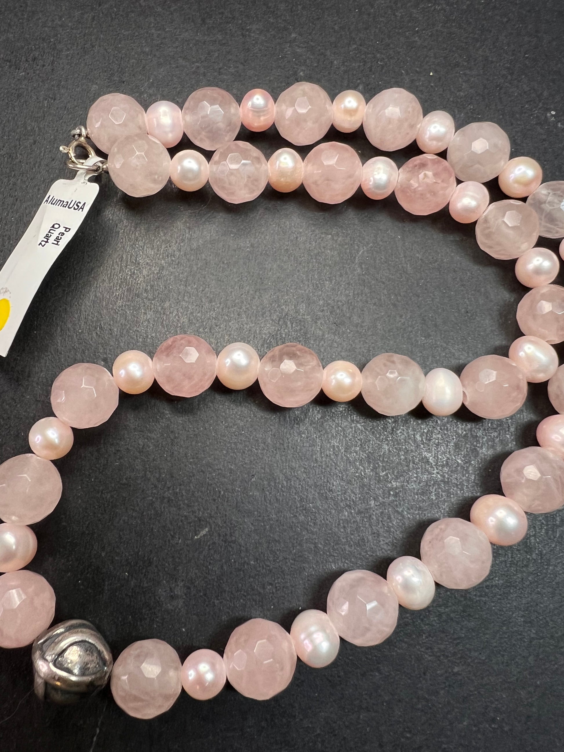 Genuine faceted rose quartz beads measuring about 10-11mm spaced with genuine cultured freshwater pearls on wire. Finished with a 925 sterling silver spring ring clasp with a sterling silver statement bead in the middle. AlumaUSA.