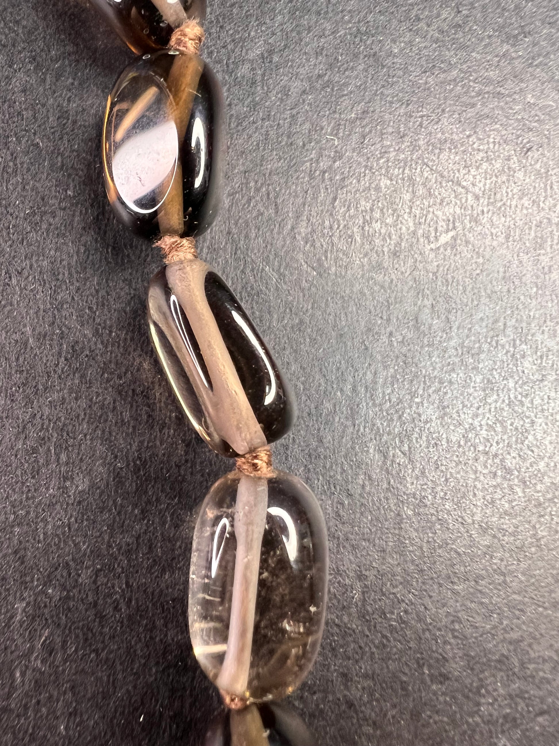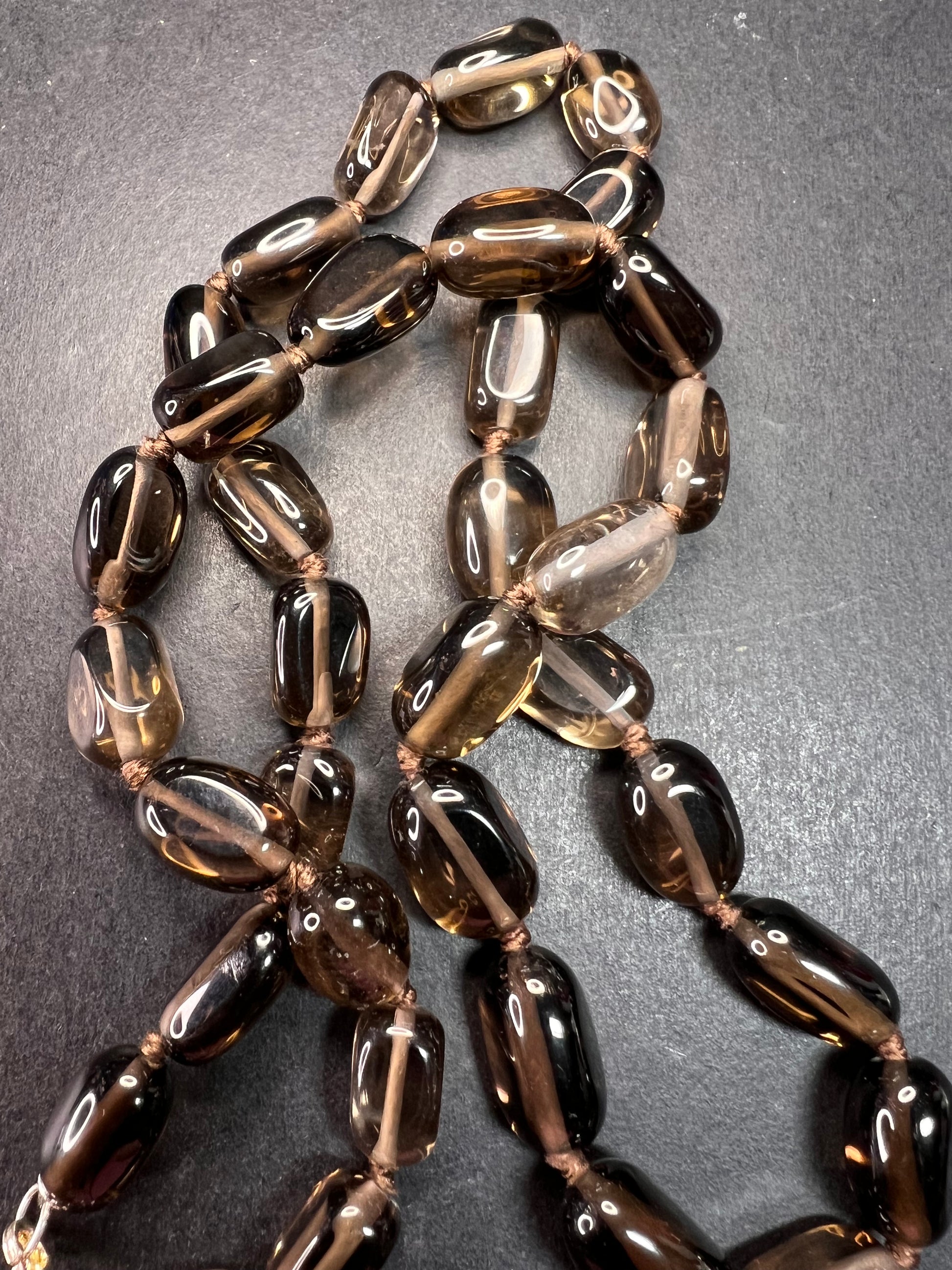 Genuine smoky quartz beads strung on a brown cord hand knotted between each bead measuring 24 inches in length with a 925 sterling silver lobster clasp. Made in China stamped on end caps.