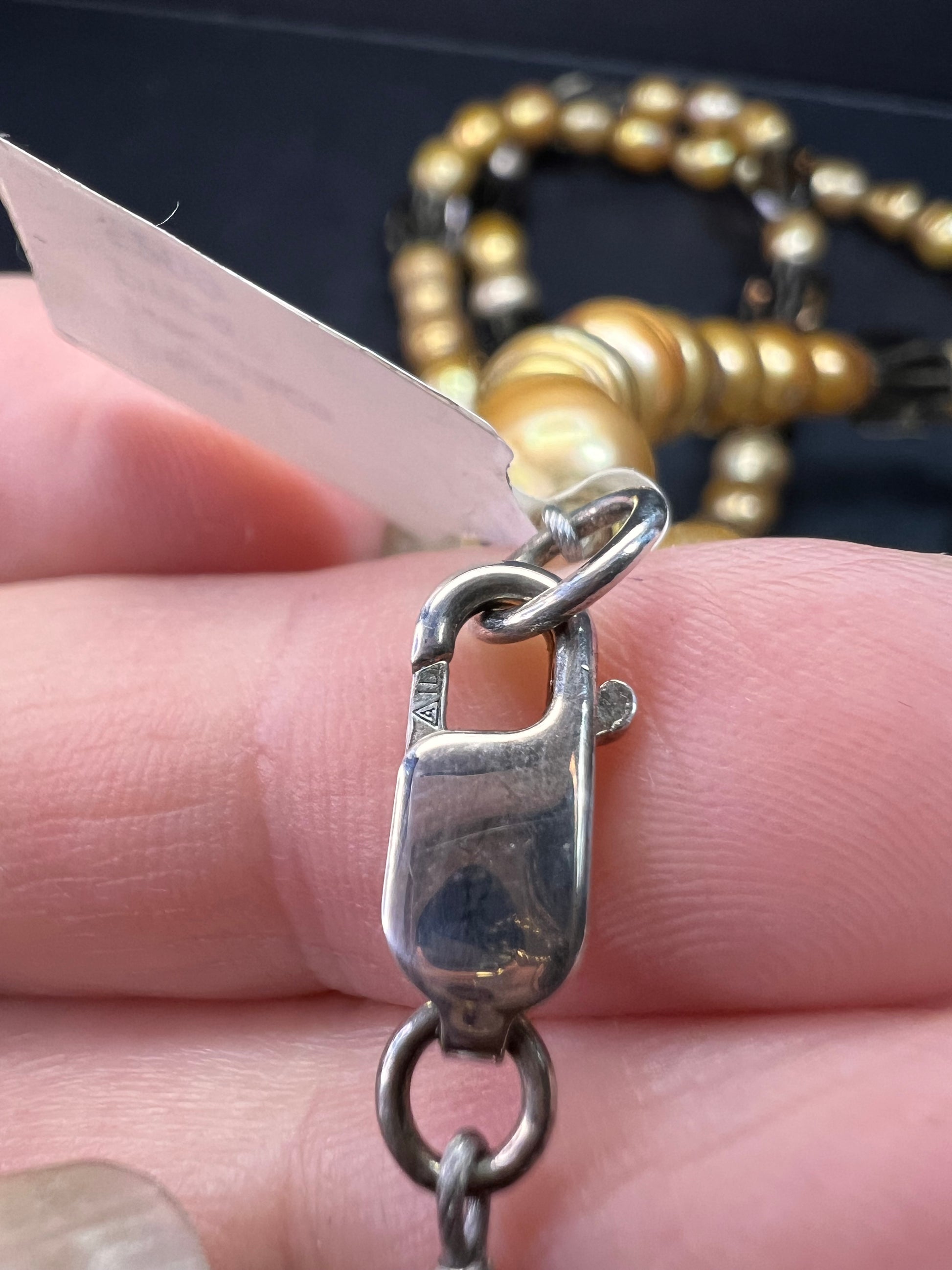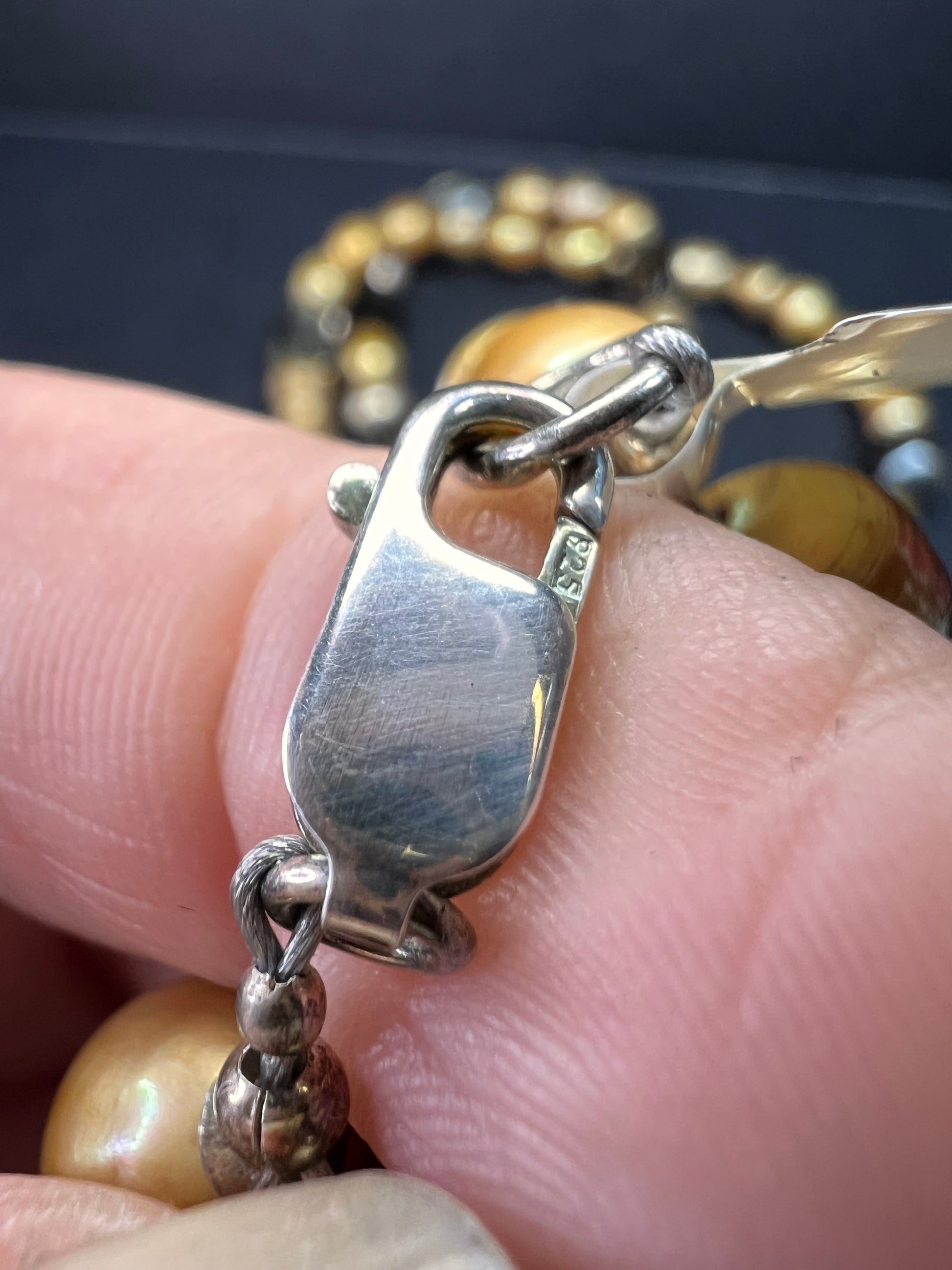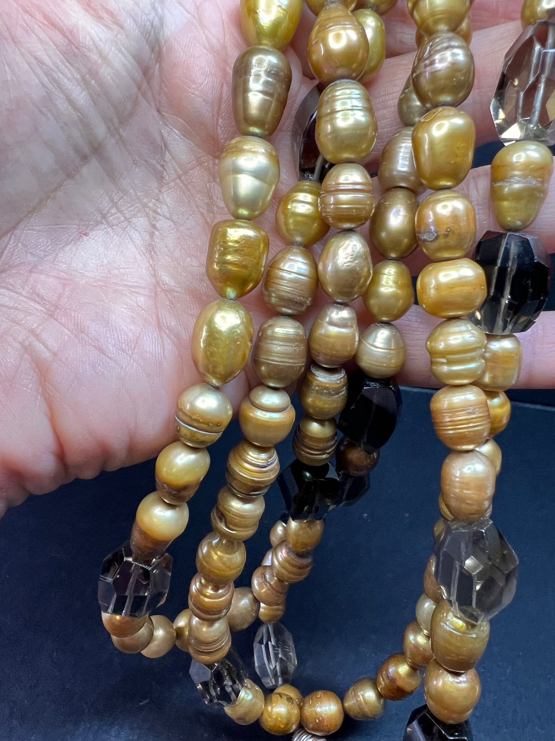 Genuine smoky quartz beads stationed with freshwater cultured pearls dyed a sort of golden yellow to brown color on jewelers wire. 3 stands measuring about 28 inches at the longest length with a 925 sterling silver lobster clasp. Original retail price on tag is $299.