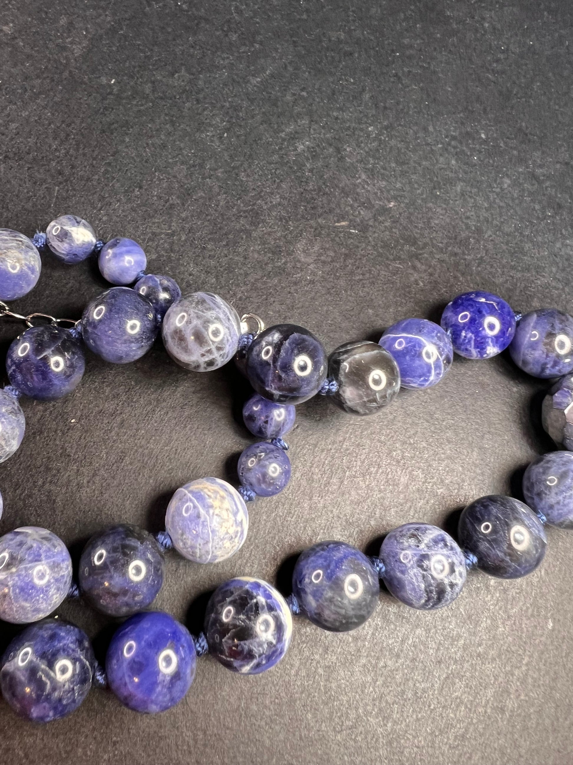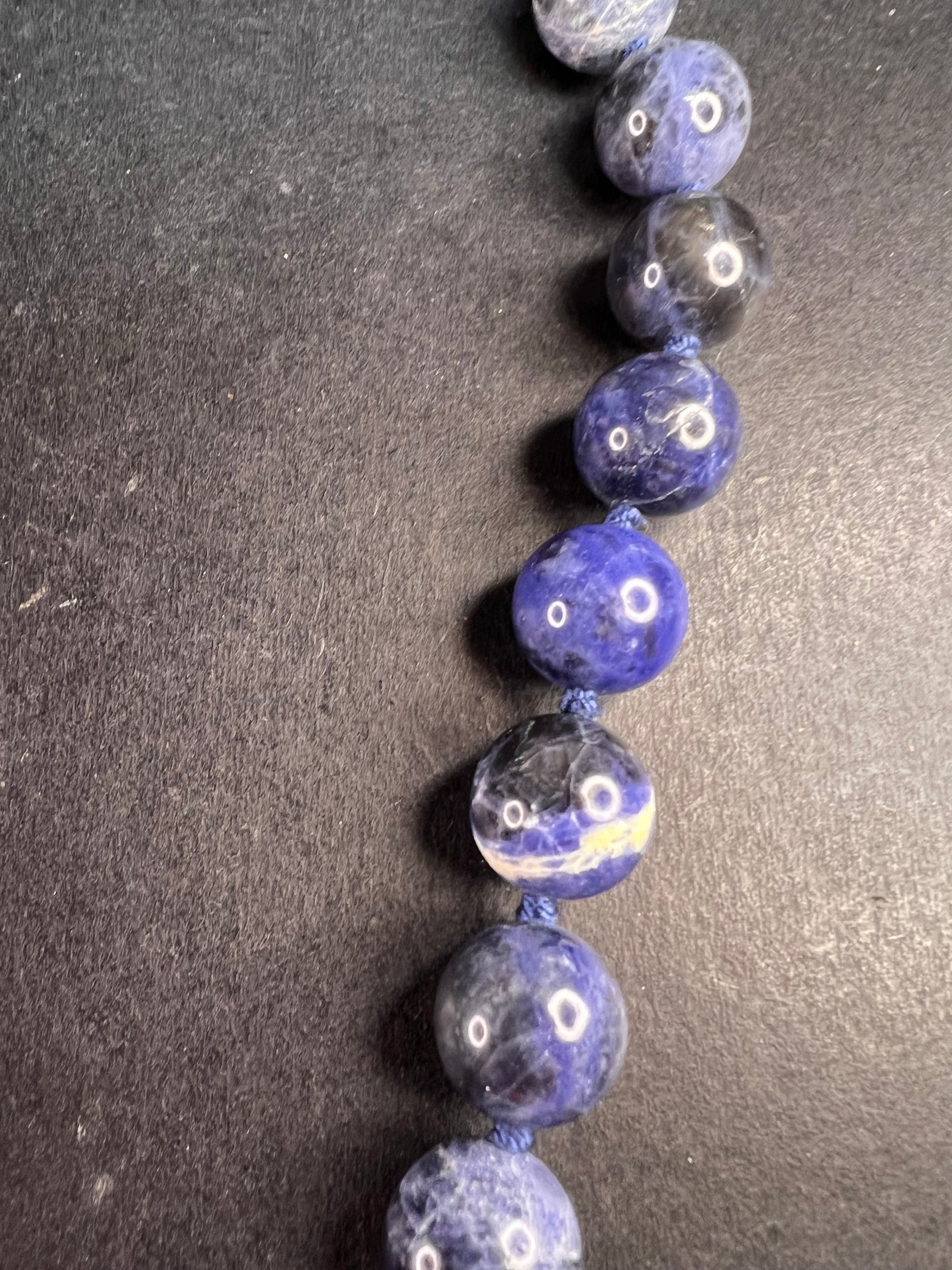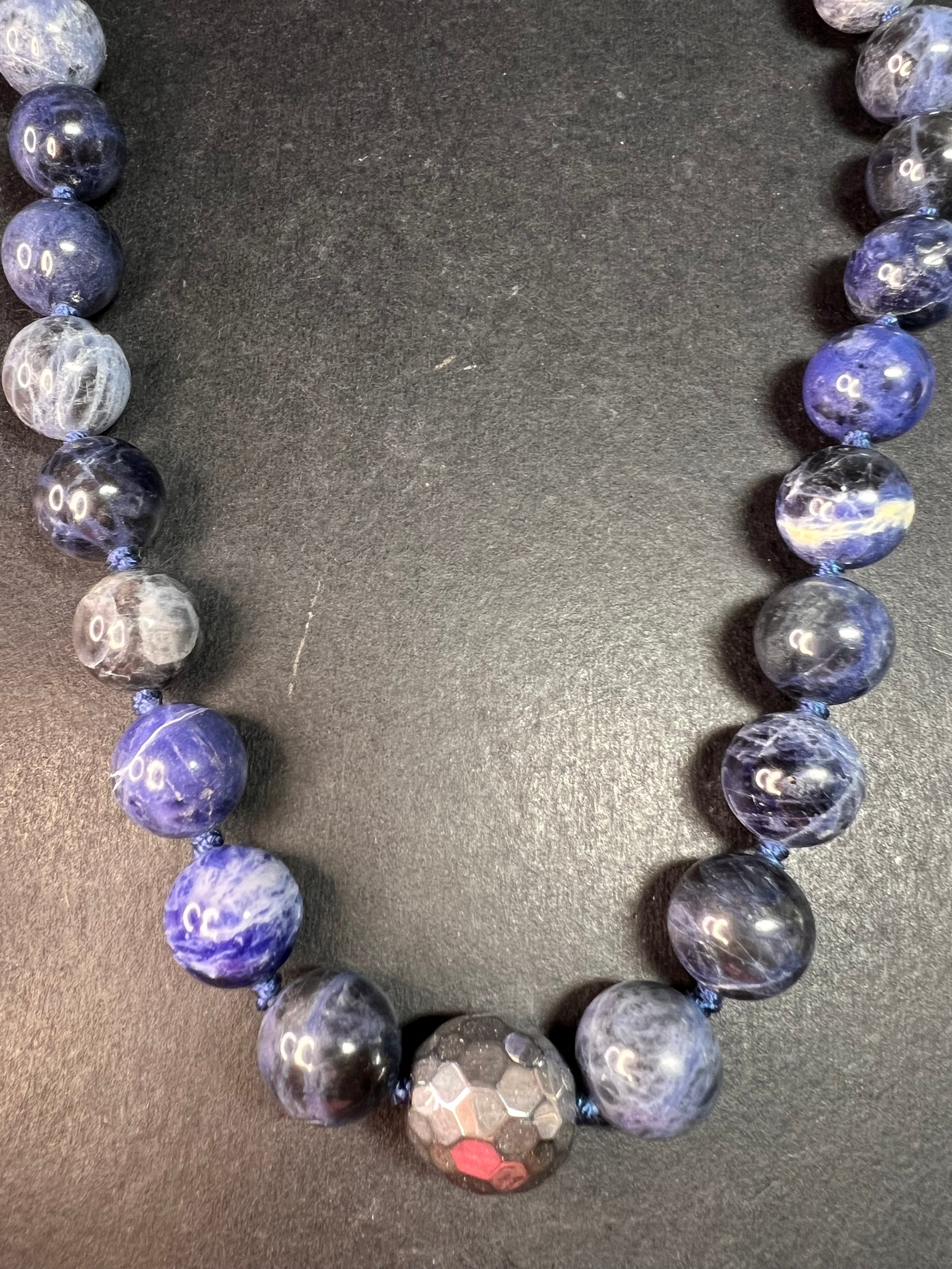 Genuine sodalite 12mm round beads with one faceted 14mm hematite bead in the center. Measures about 18 inches in length hand knitted blue cord with a 925 sterling silver lobster clasp and a 2+ inch extension chain to wear at a 20 inch length. Some of the sodalite beads have a gorgeous chatoyancy in them that almost has a cat’s eye effect which is rare in sodalite. AlumaUSA. Made in China.