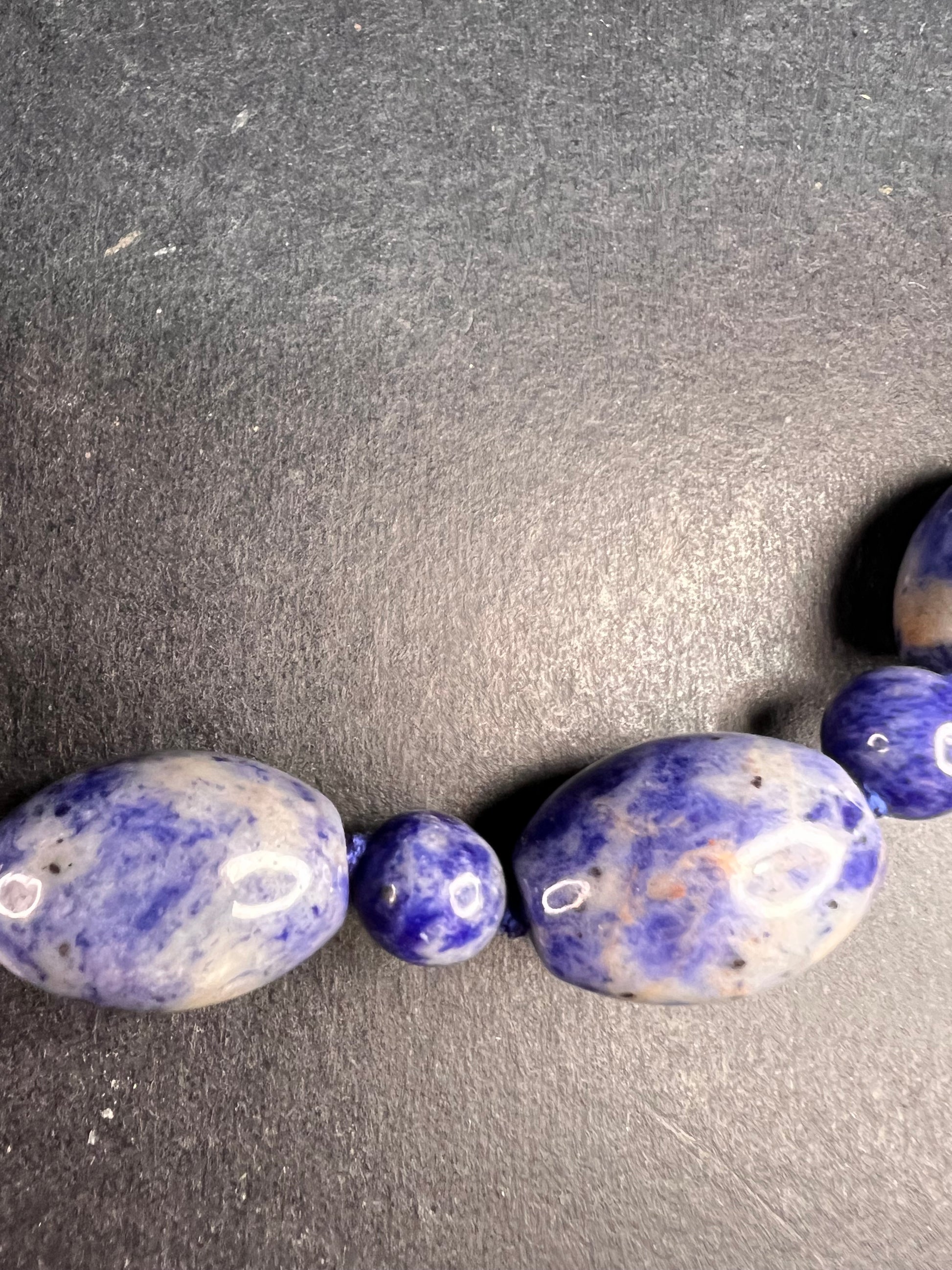Genuine sodalite stone beads in alternating shapes. Necklace is strung on blue cord and hand knotted in between each bead measuring 18-20 inches in length. 925 sterling silver lobster clasp with 2 inch extension chain. Bracelet measures about 7 inches in length and strung on stretch cord.
