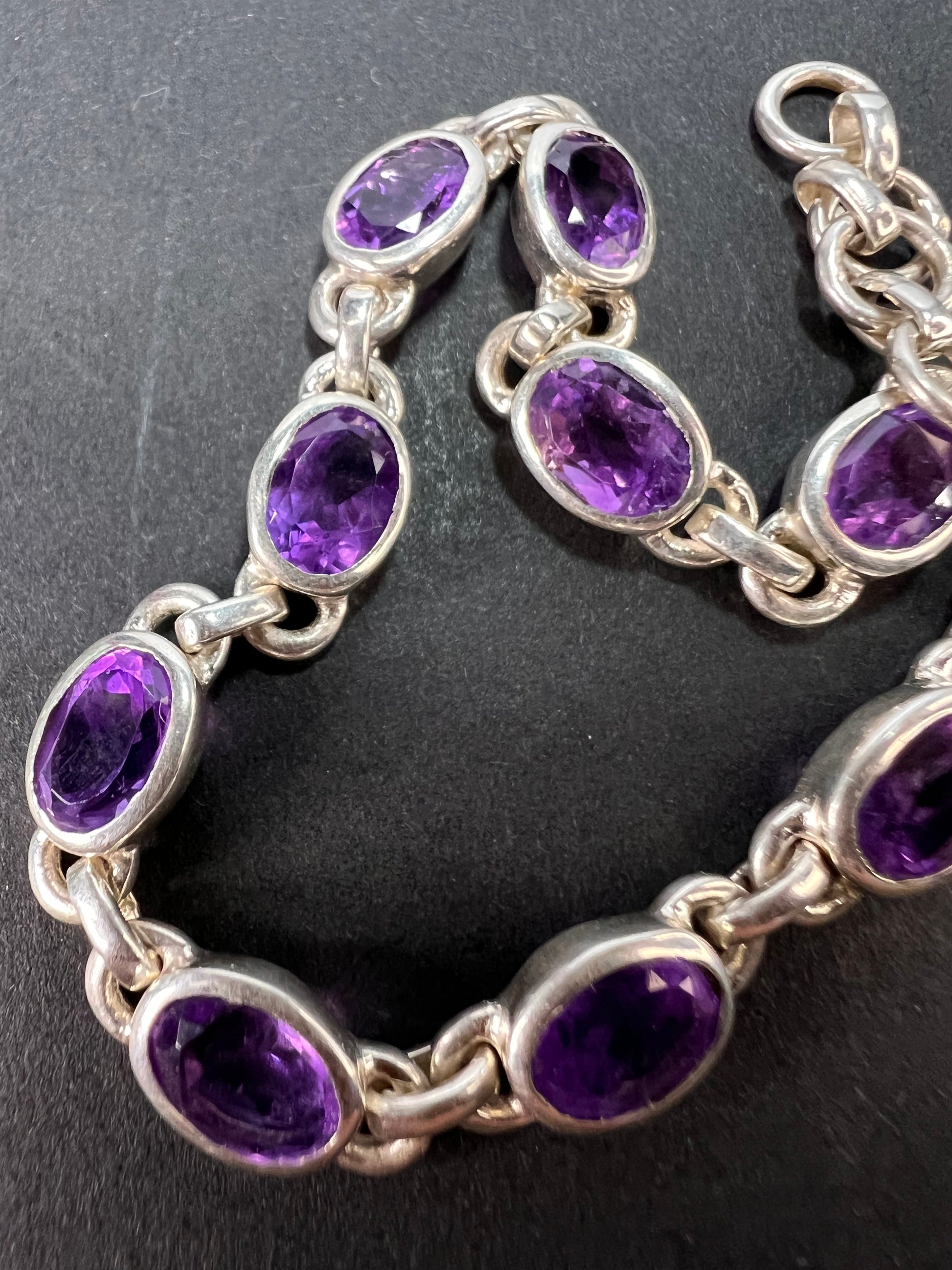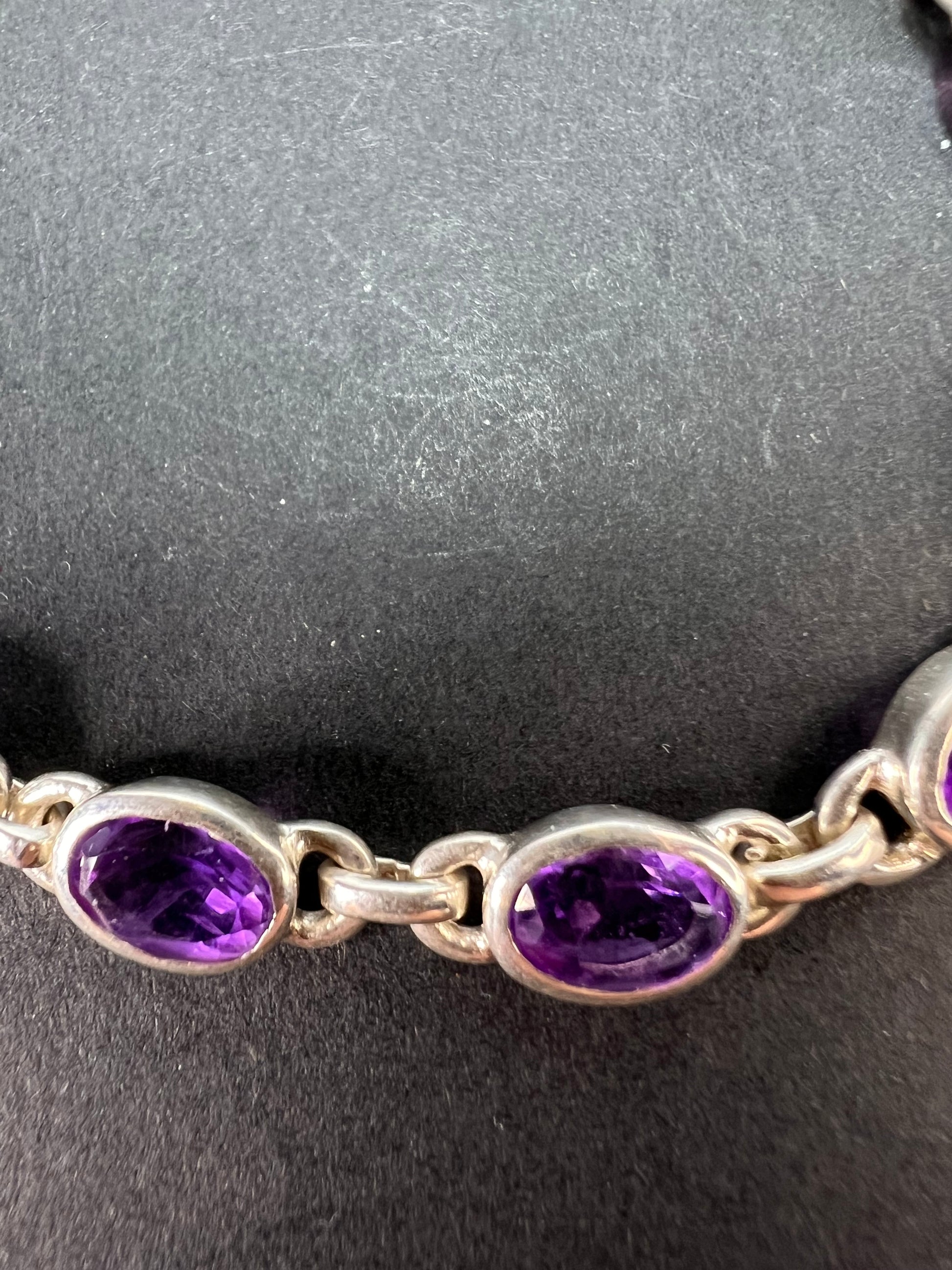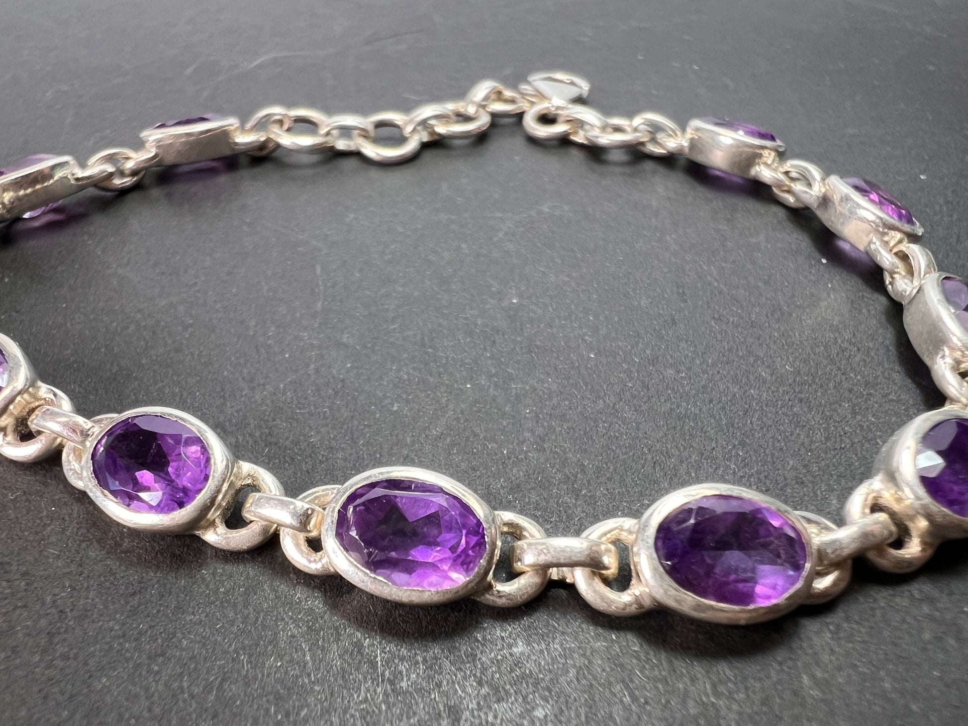 Genuine purple amethyst gemstones bezel set in authentic 925 sterling silver. Bracelet measures 8 inches at longest length with links but can be shortened up to an inch. Total weight is 10.89 grams. Lobster clasp.