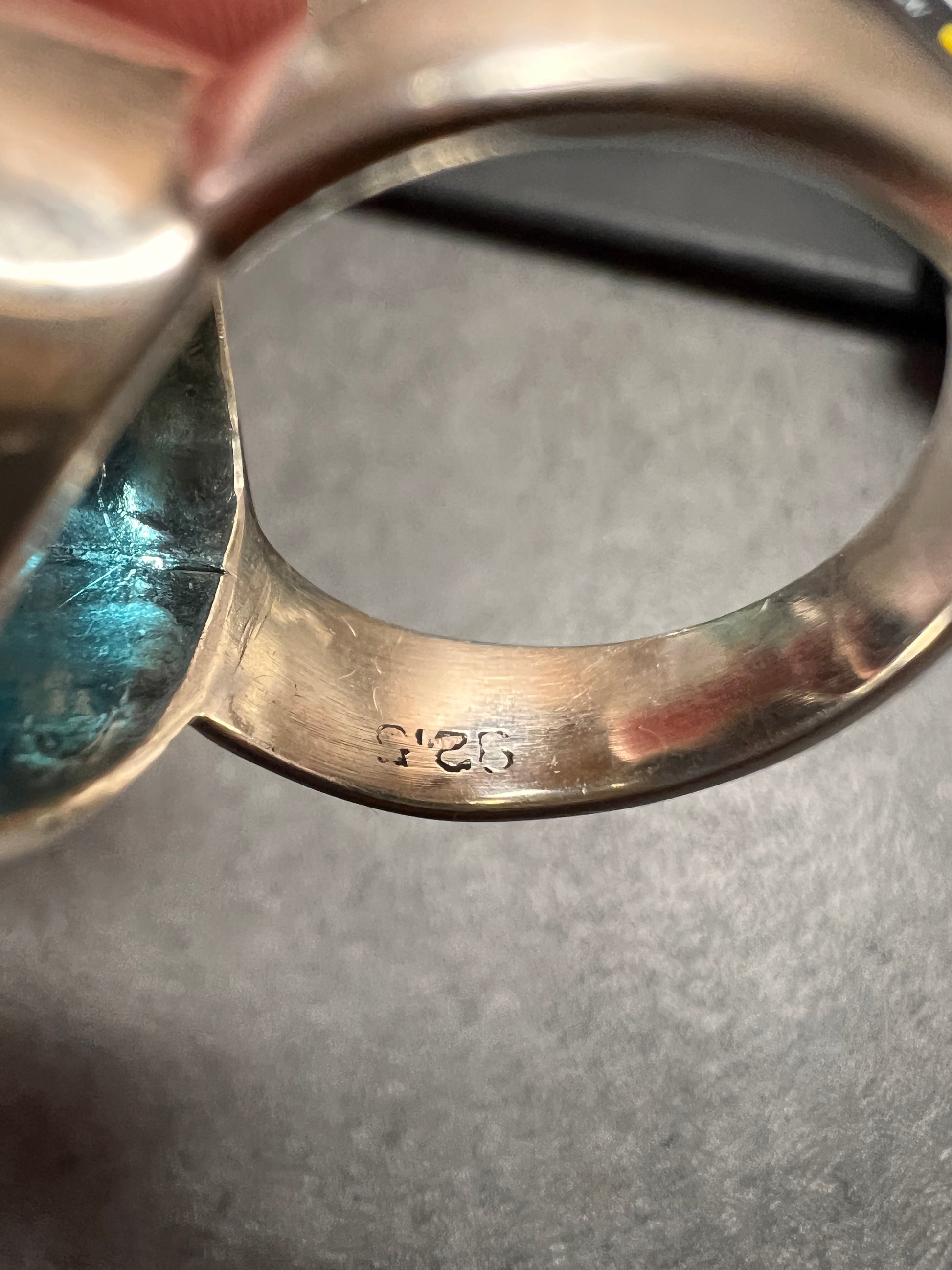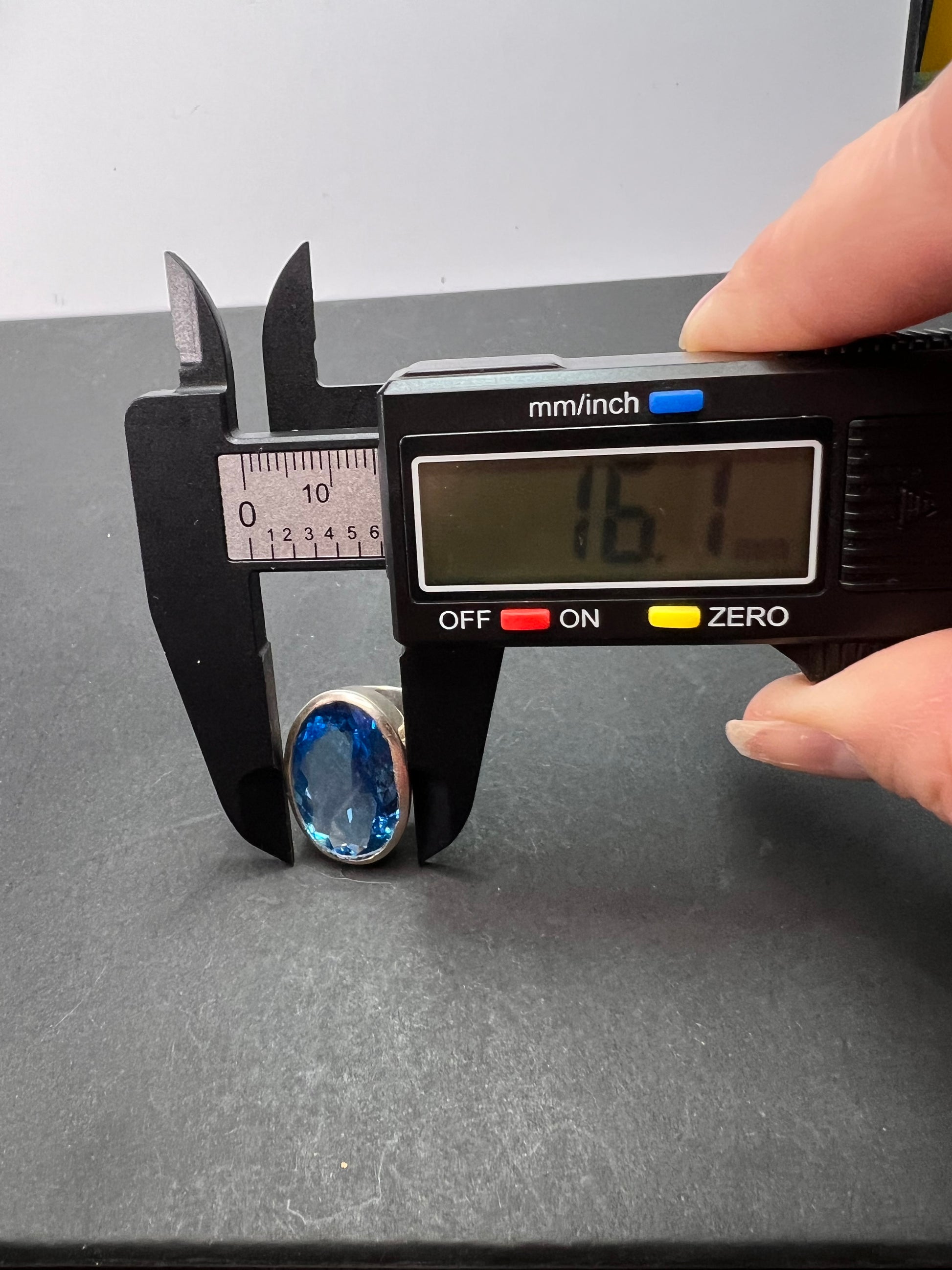 Genuine Swiss blue topaz cushion oval cut gemstone bezel set in authentic 925 sterling silver. Measures size 8. Total weight is 11.70 grams. Measurements on the outside of the stone setting are about 16.1x 23.5 grams.