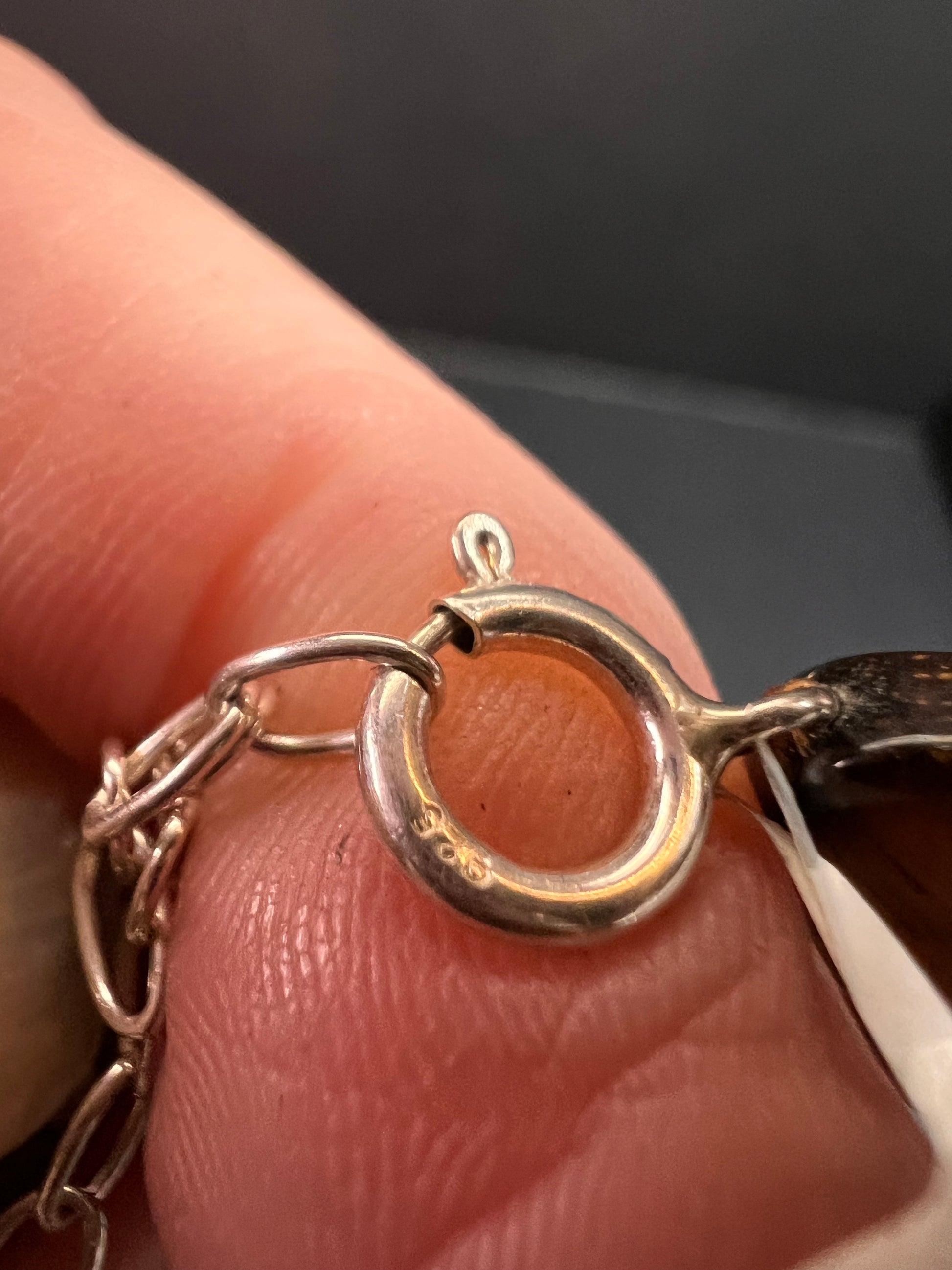 Genuine tigers eye stone beads knotted on brown cord measuring 18 inches with a 925 sterling silver lobster clasp with a 2 inch sterling silver extension chain. Made in China.