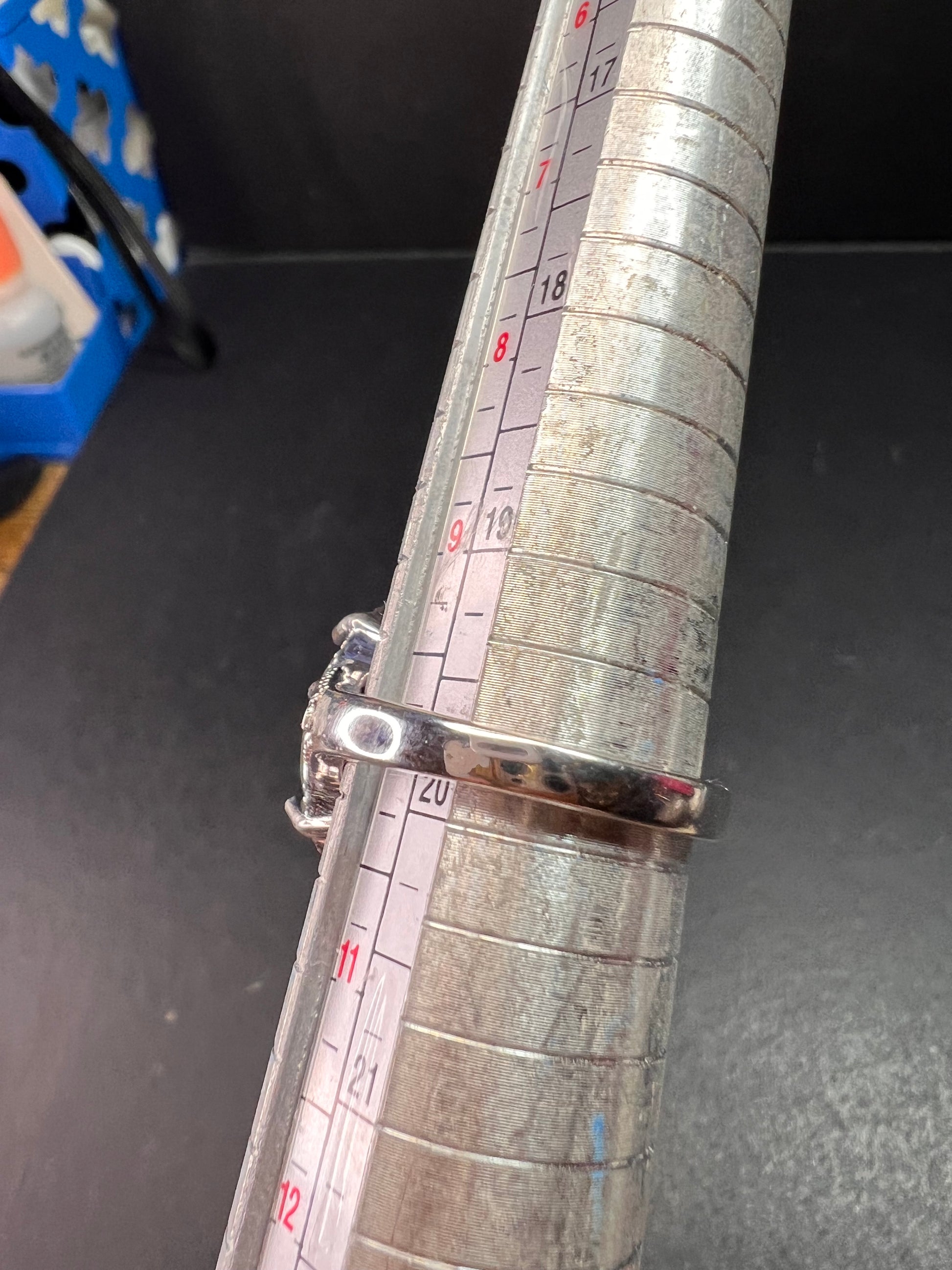 Genuine Venus jasper cabochon prong set in a brass setting plated with platinum. Measures a size 10. Made in India.