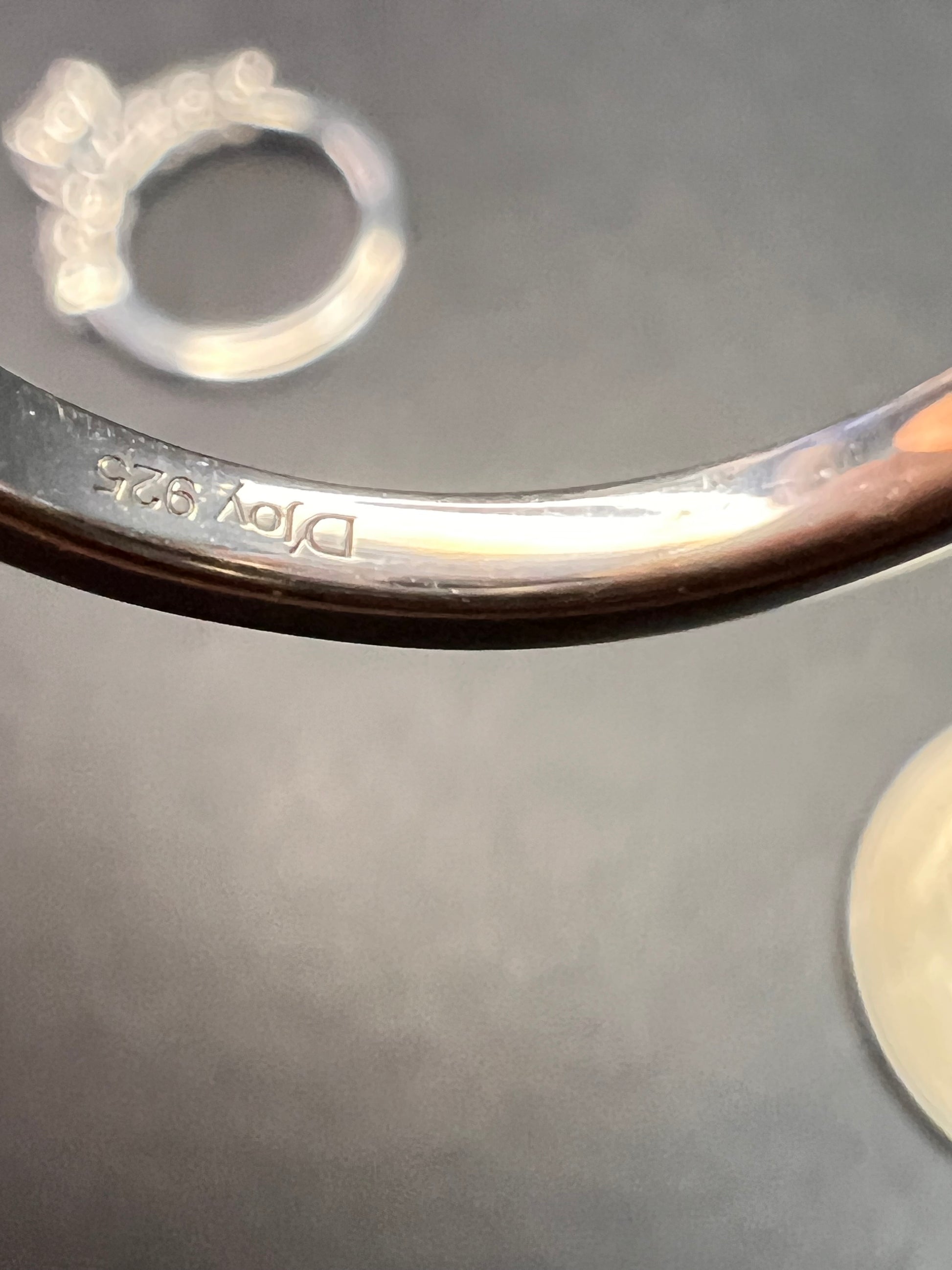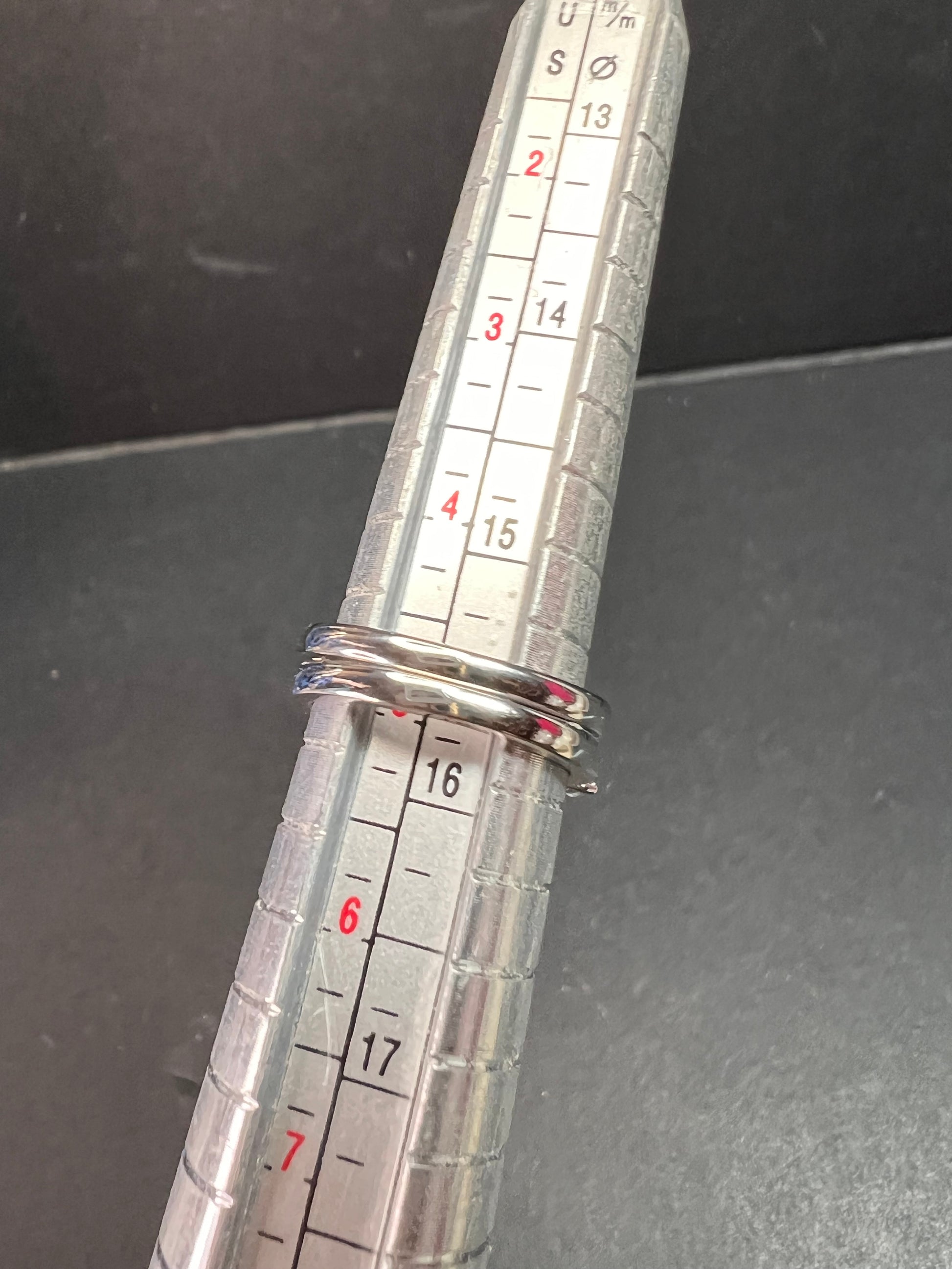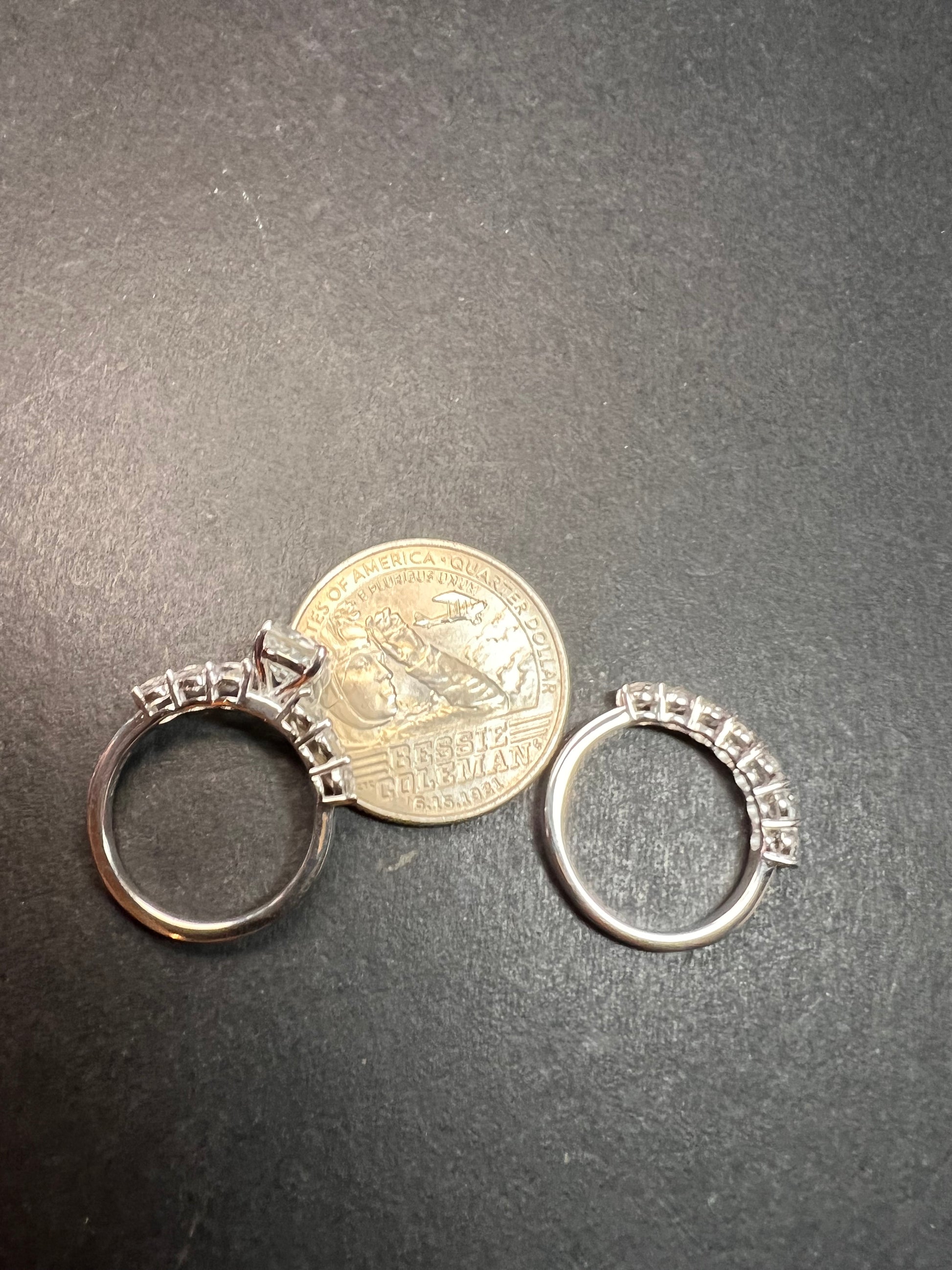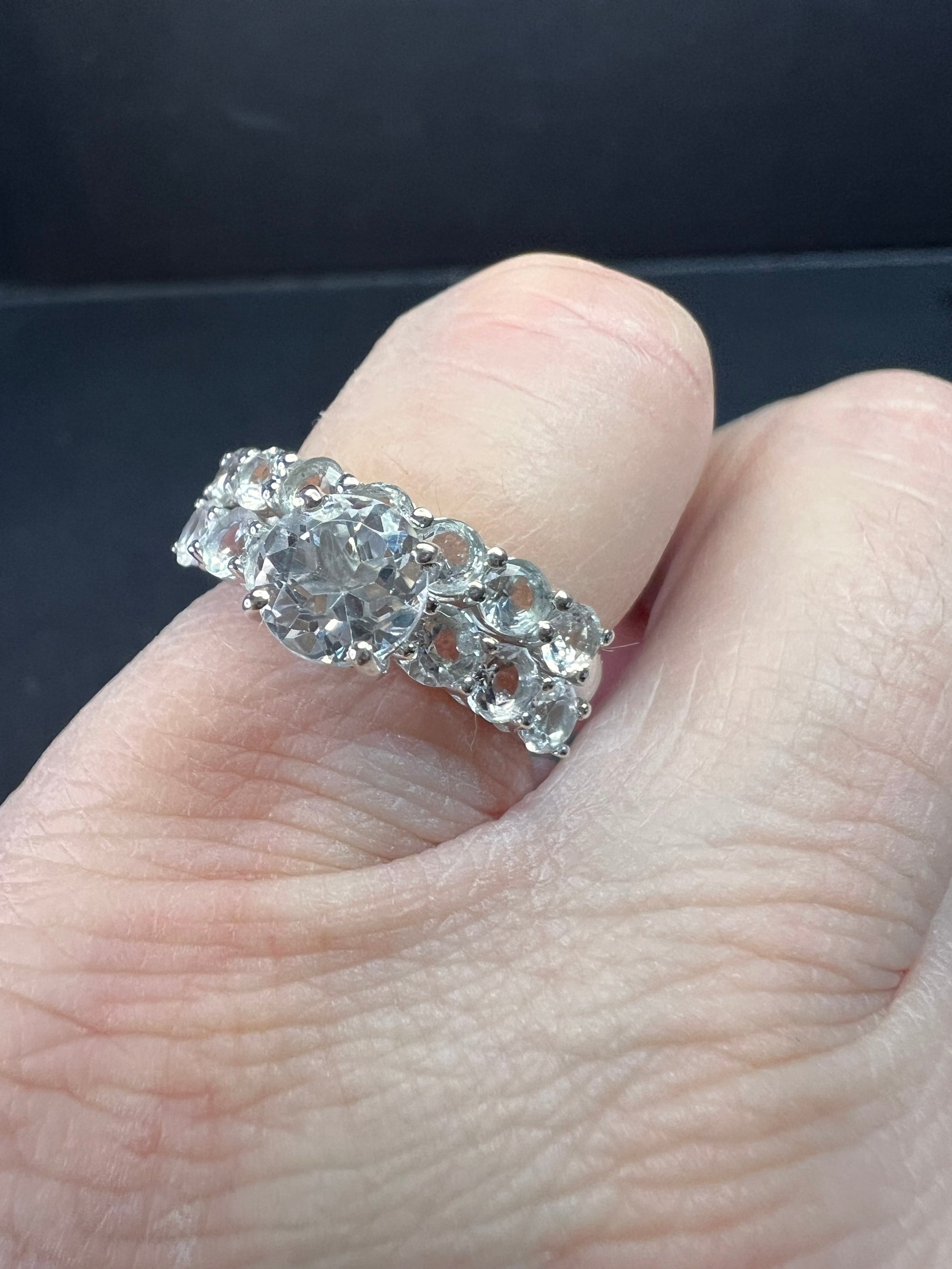 Genuine white topaz round cut gemstones from Golconda, India. Prong set in an authentic 925 sterling silver base that’s plated with platinum. Two rings that stack together measuring a size 5. Total weight is 4.27 grams and 2.75 ctw. Djoy. Made in India. Estimated retail value is $350.