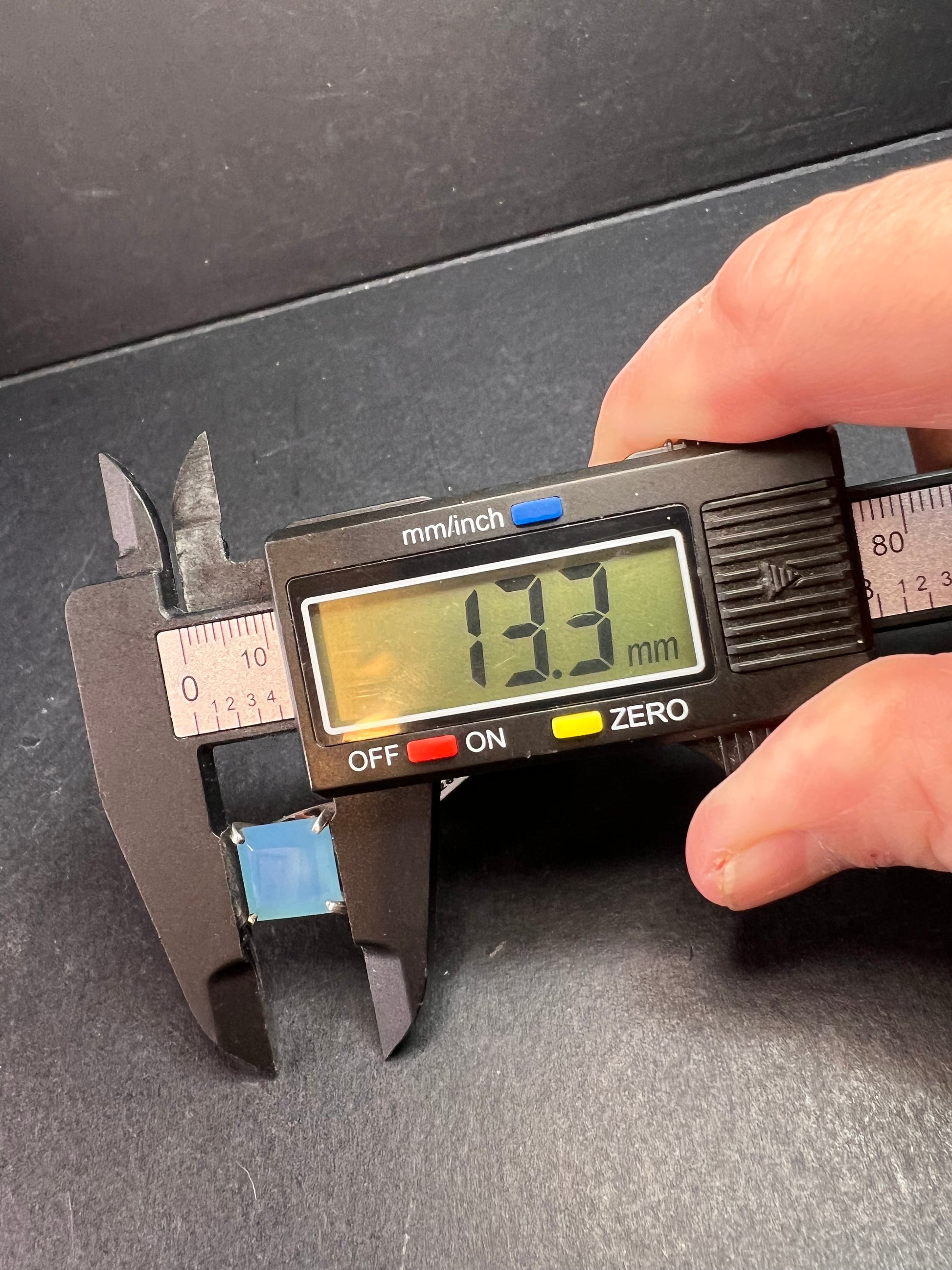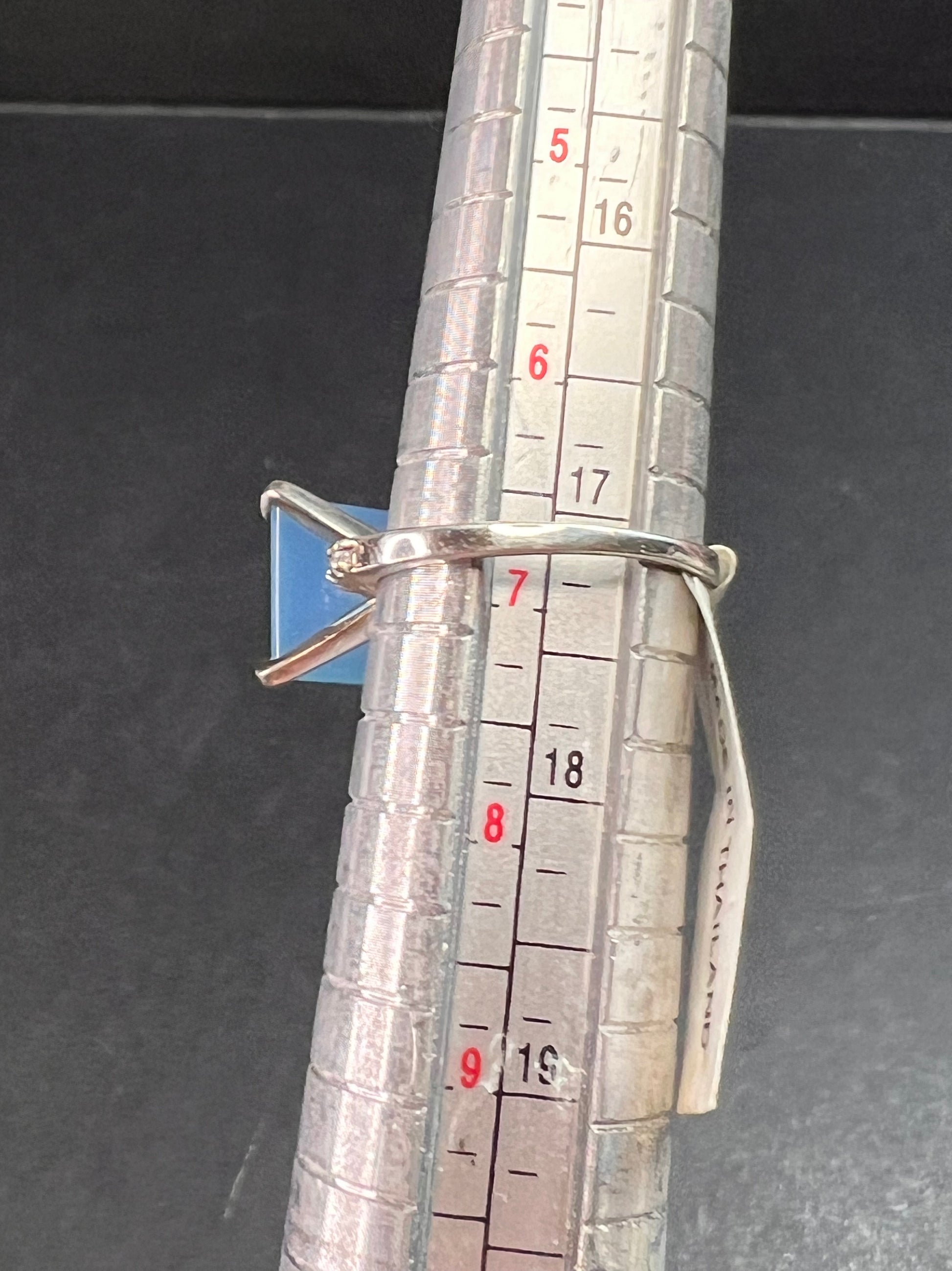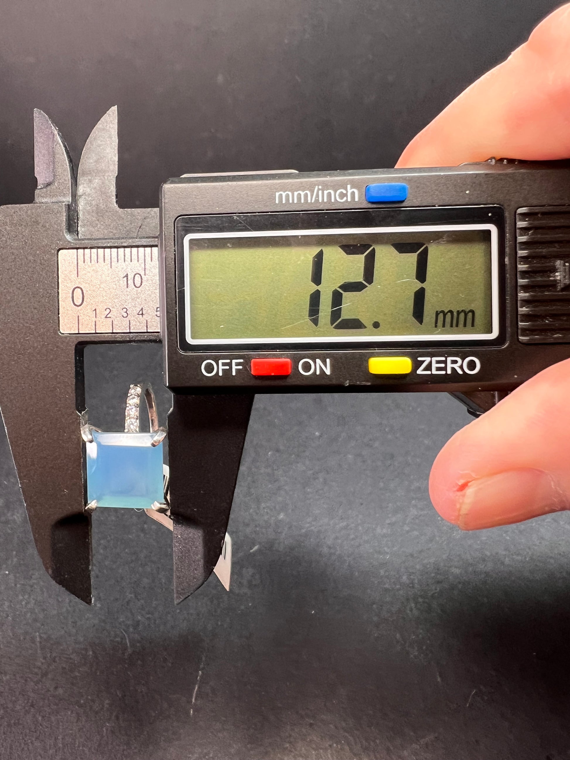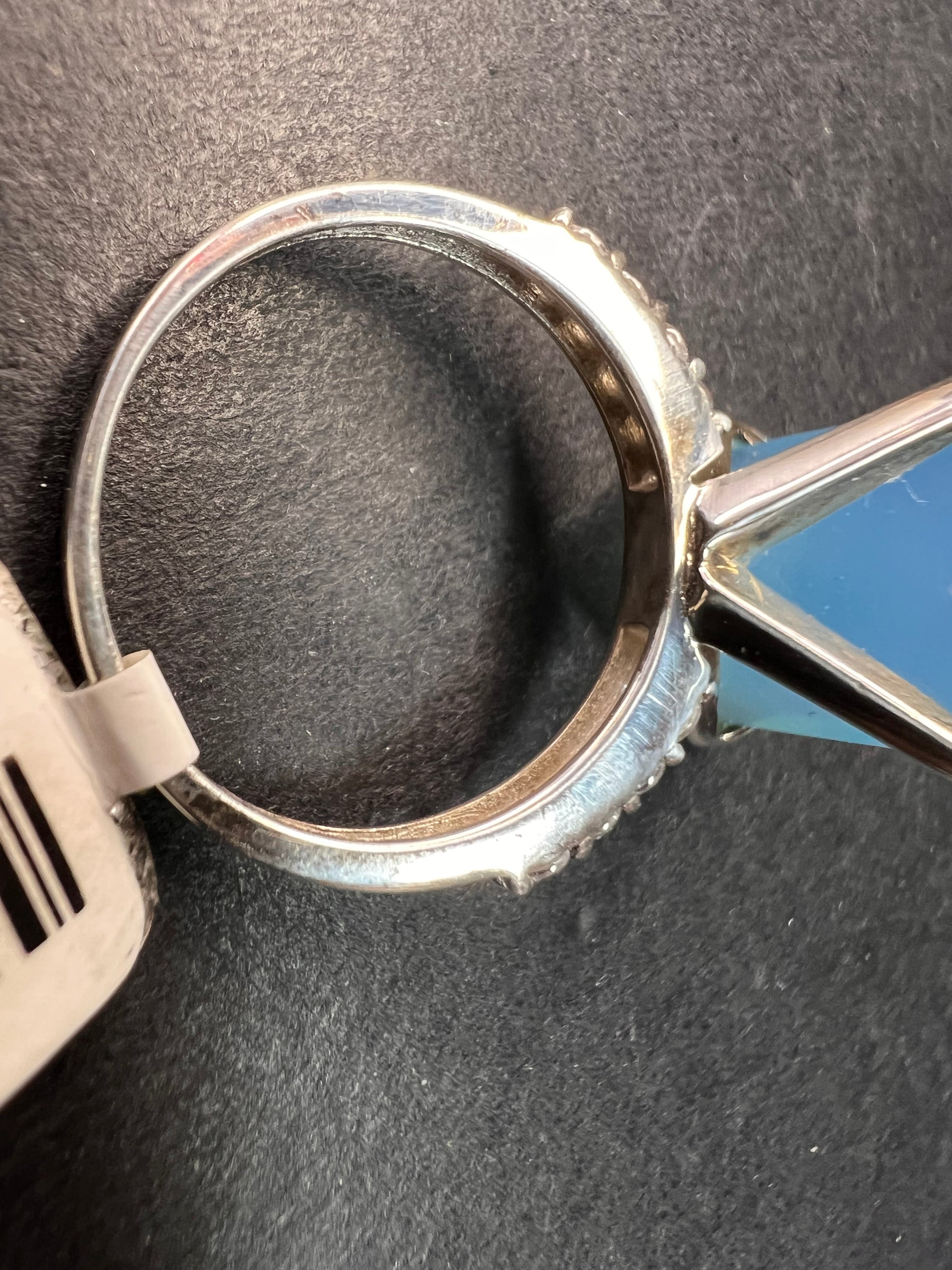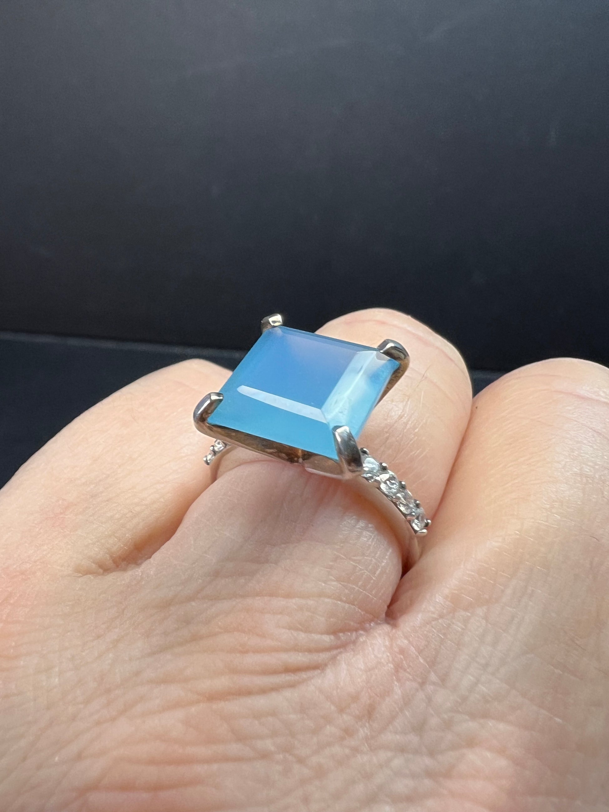 Giant square cut blue chalcedony prong set in authentic 925 sterling silver. White accent stones on shank are Cz. Measures a size 7. STS.