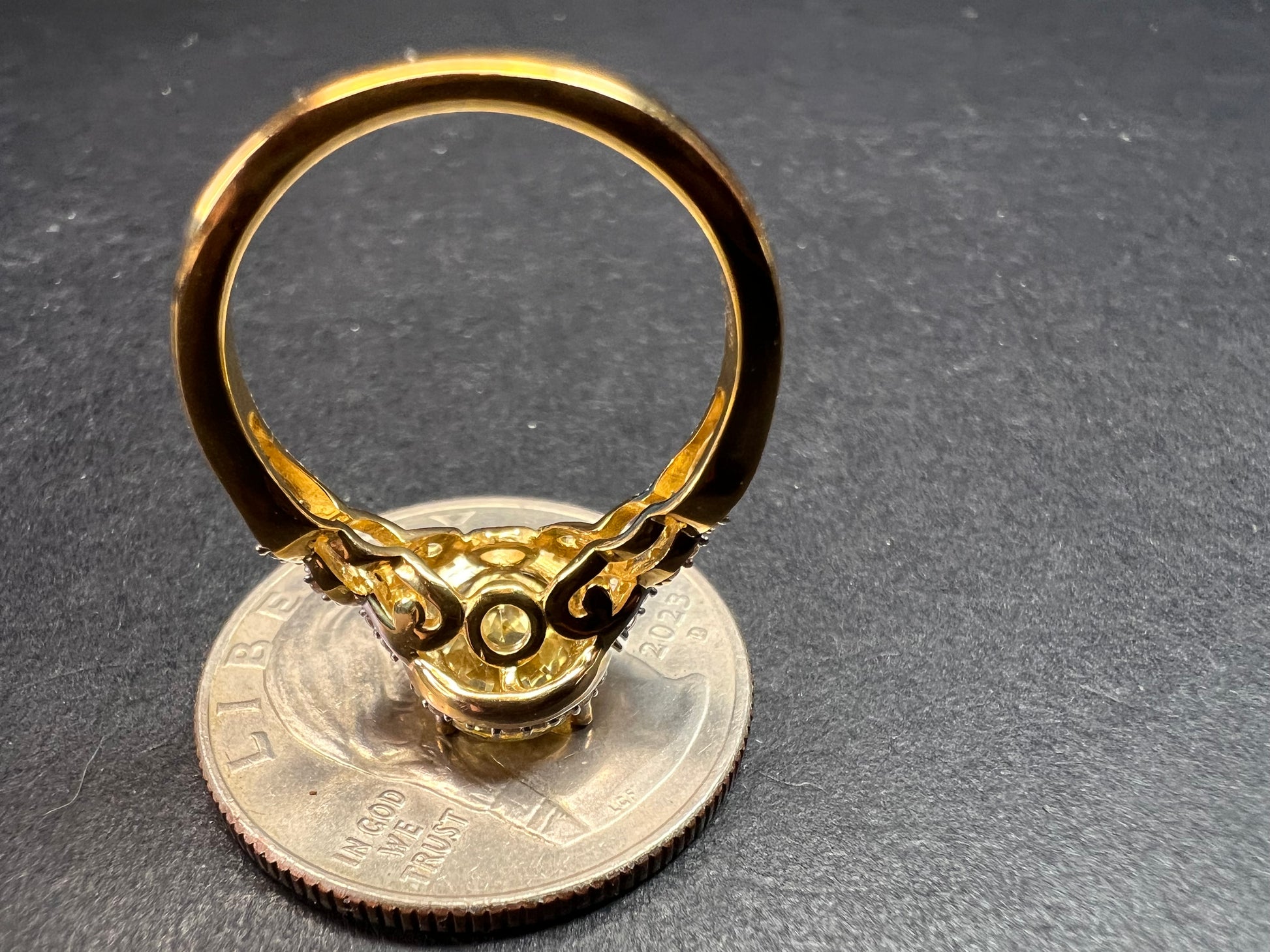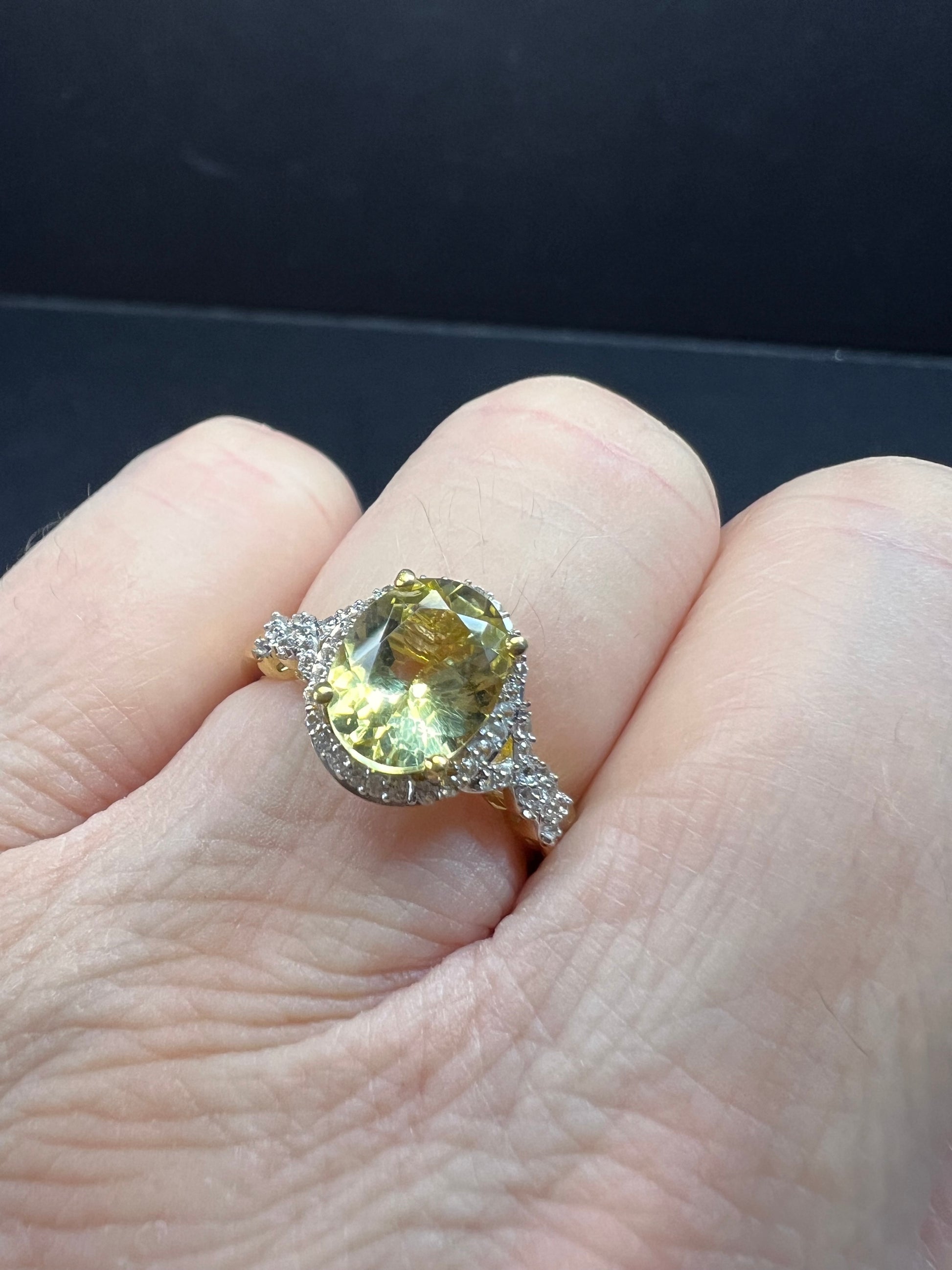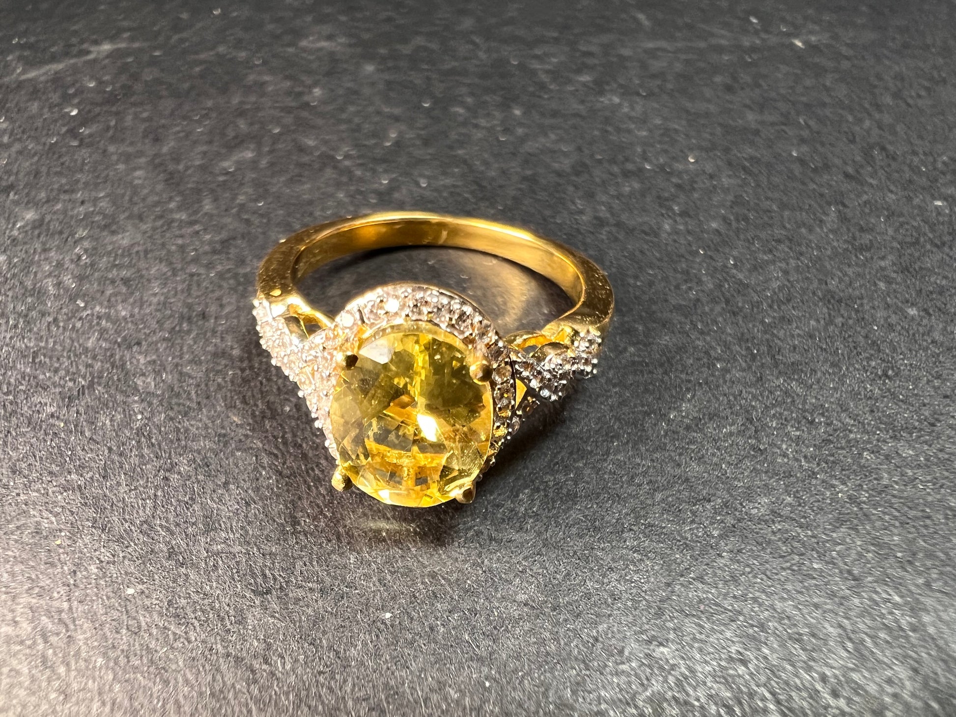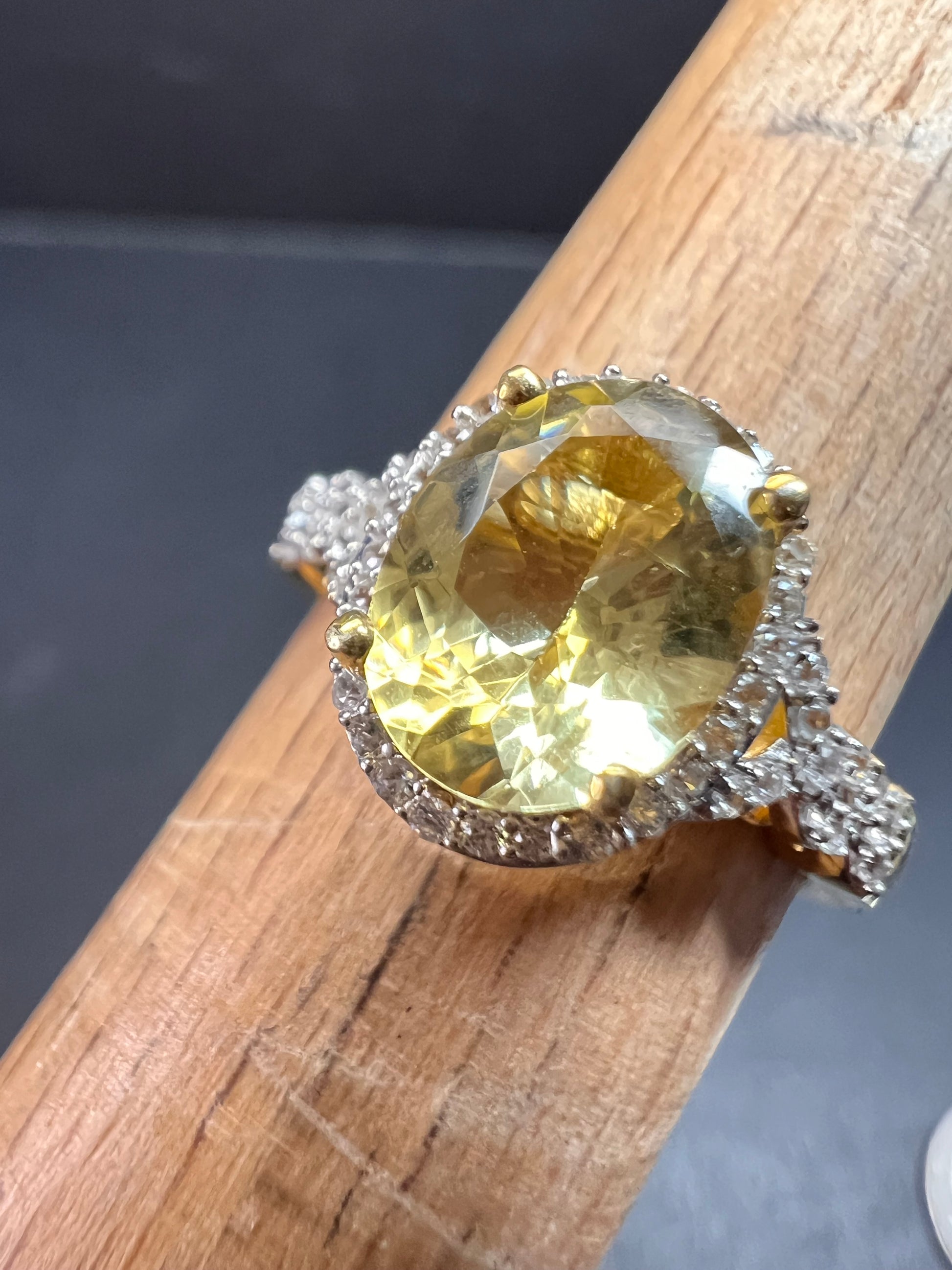 Genuine yellow apatite oval cut gemstone prong set in an authentic 925 sterling silver setting plated with 18k yellow gold vermeil. White accent stones around the halo and down the shank are zircon. Measures a size 6. Total weight is 2.97 grams. Total ctw is 2.30. Djoy. Made in India. Apatite gemstone is mined from Madagascar and heat treated for color enhancement. White zircon gemstones are mined without treatment and 100% natural. Estimated retail value is $750.