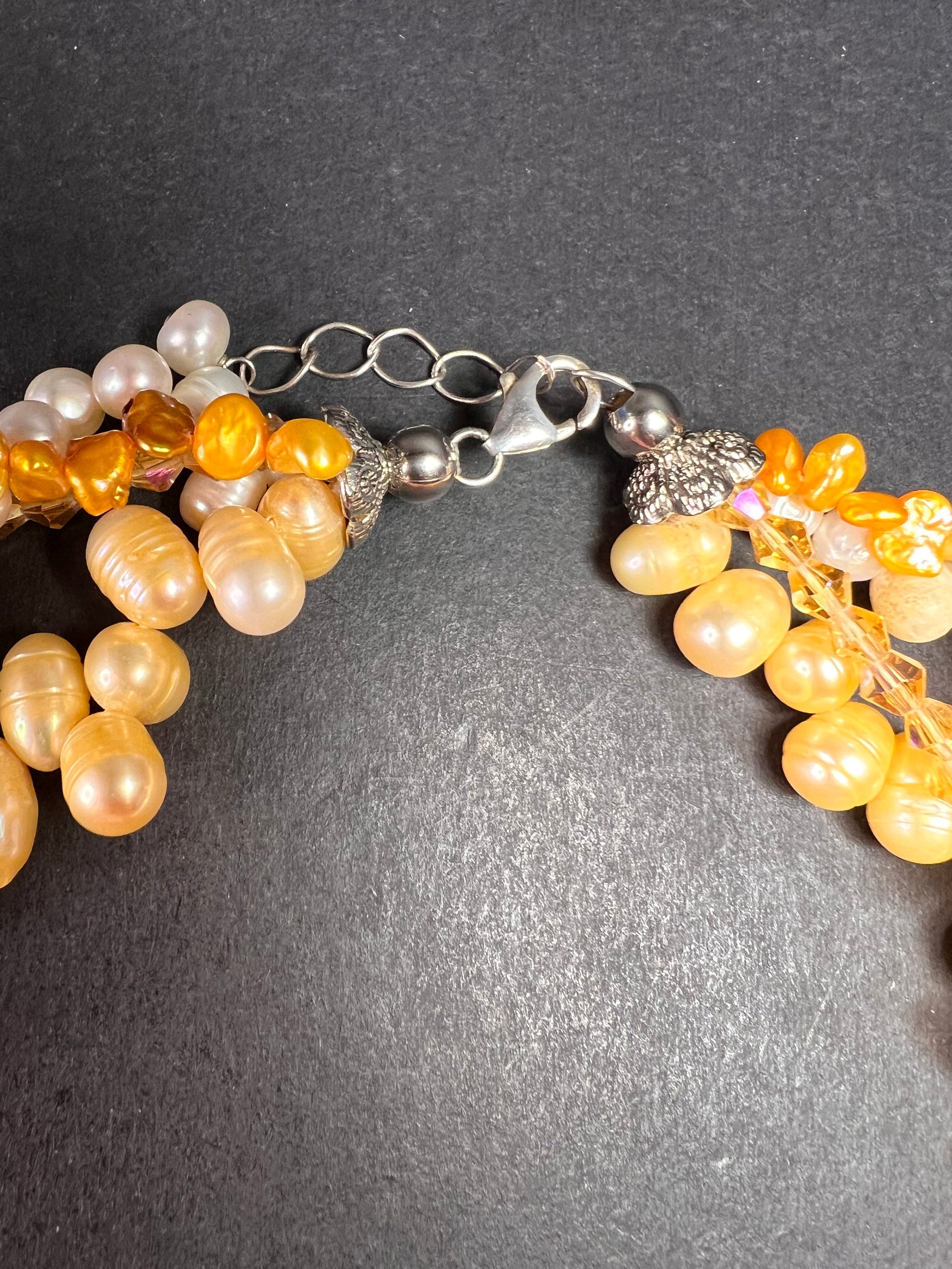 Genuine cultured freshwater pearls in shades of white to pale and orange yellow with a strand of lead crystal bicone beads strung on 4 strands with cord. Measures about 20 inches with an extension chain that adds maybe another inch or so if desired. 925 sterling silver lobster clasp with end caps and beads. Yellow pearls are dyed.