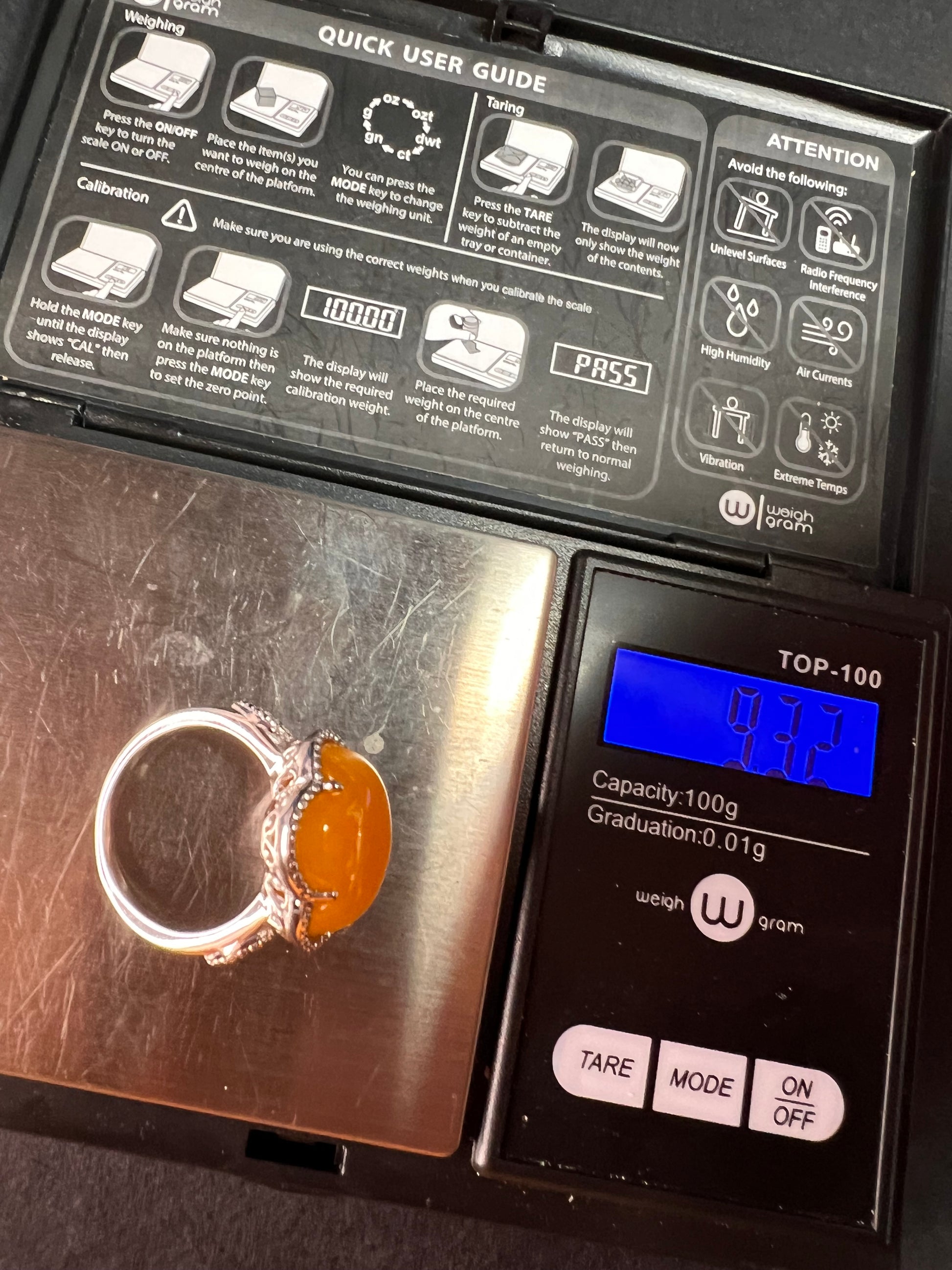 Genuine yellow jade that’s been dyed in a fun cherry blossom pattern. Prong set in authentic 925 sterling silver plated with platinum. Two marquise cut Brazilian accent gemstones on the shank. Total weight is 9.32 grams and has 15.90 ctw. Measures a size 9. Djoy. Made in China. Estimated retail value is $850.