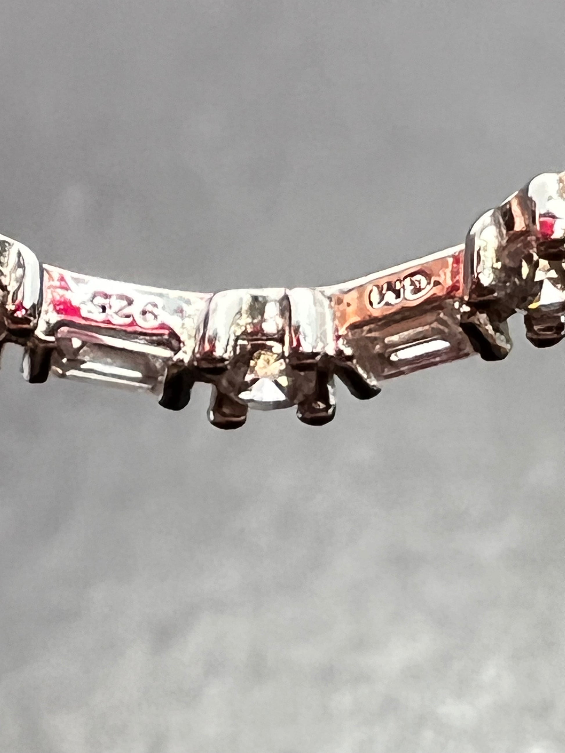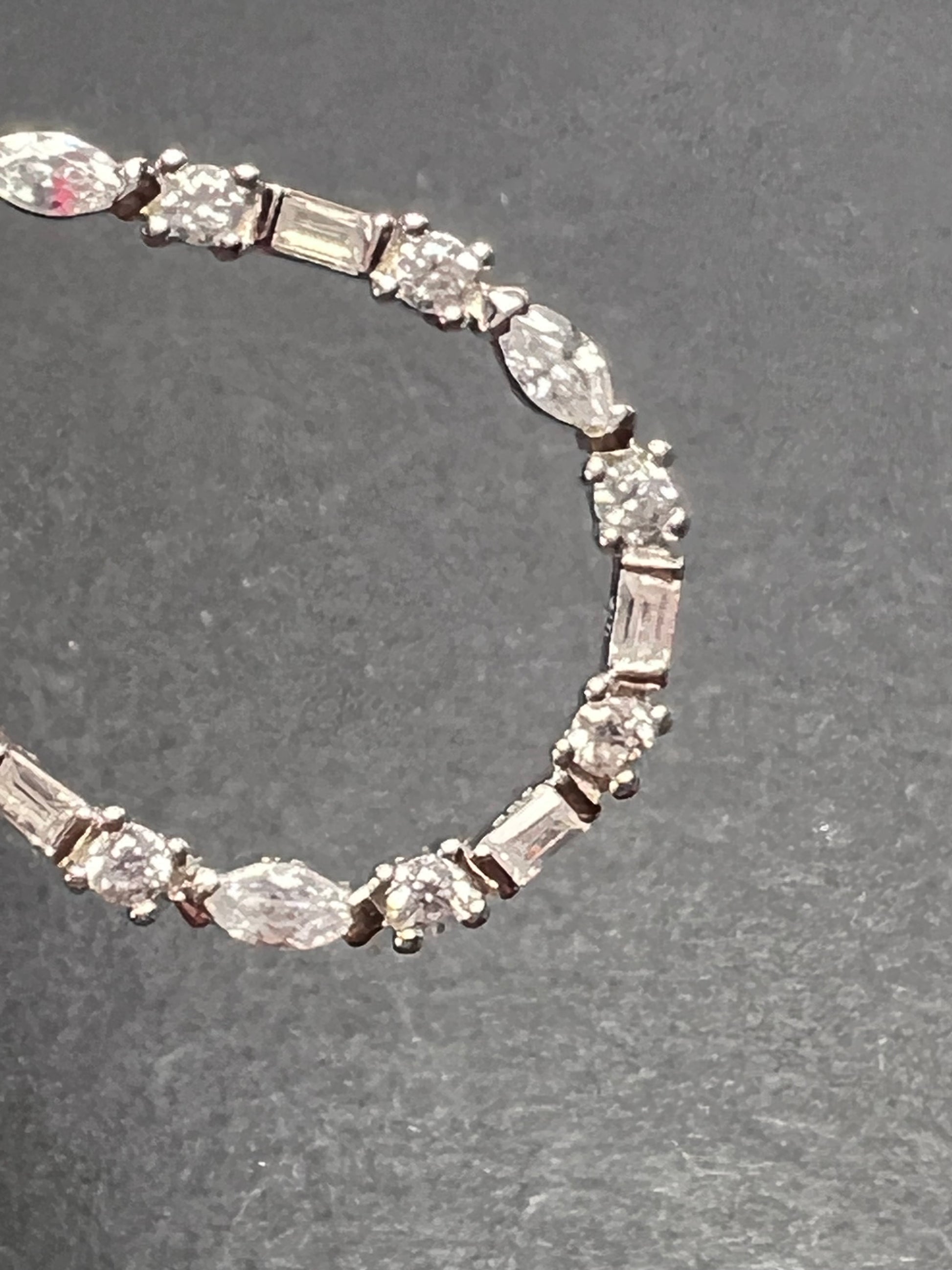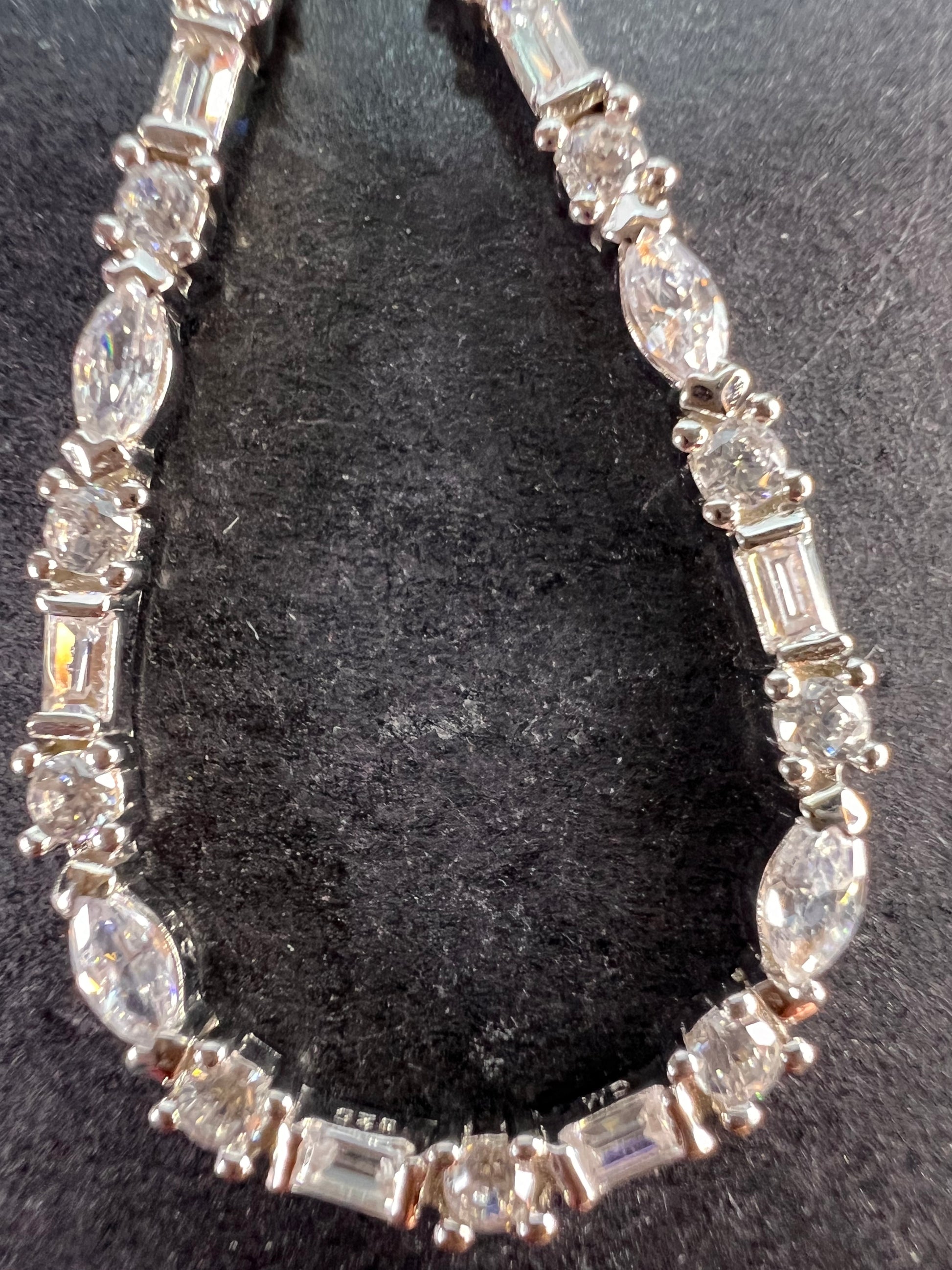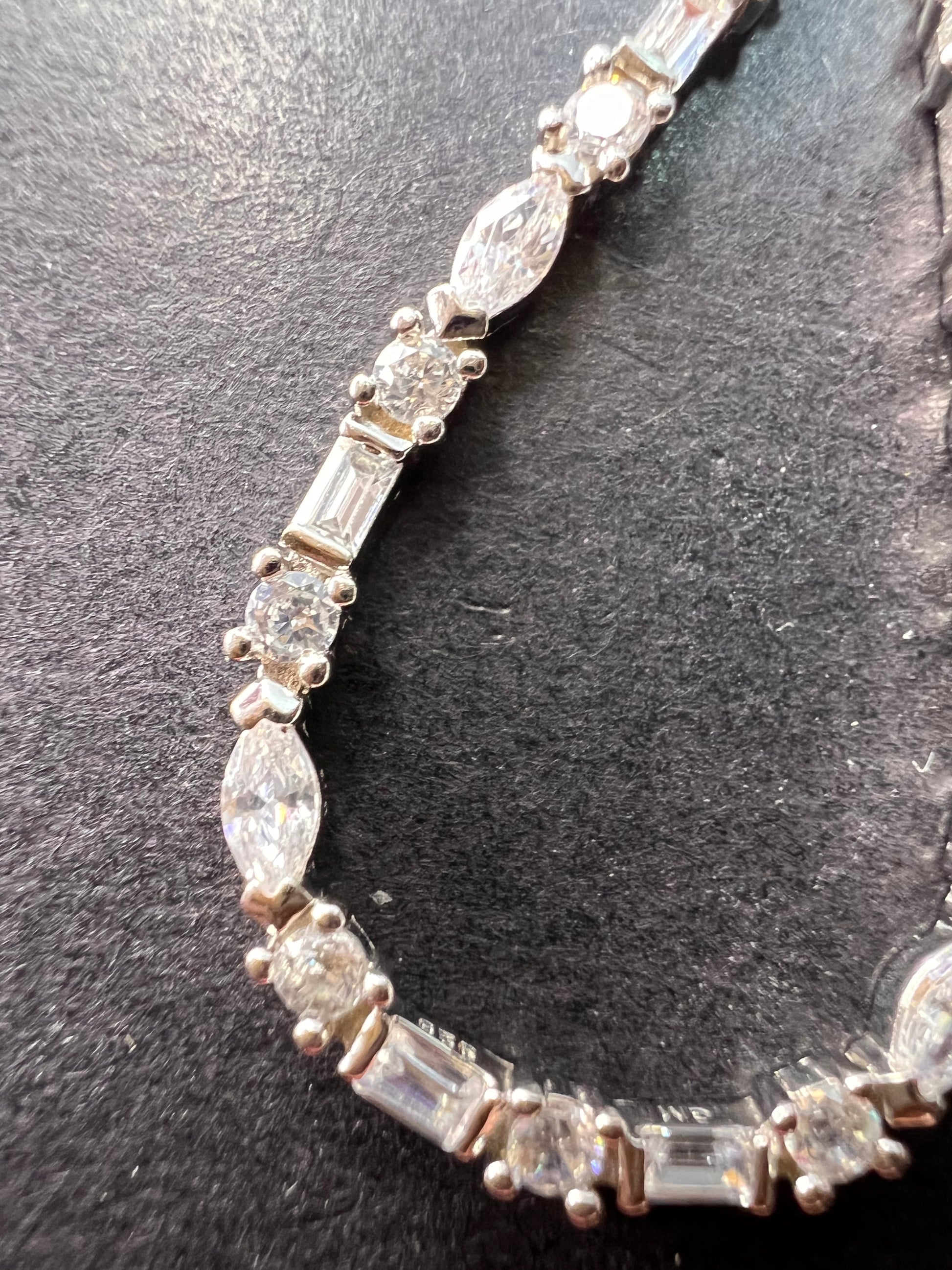Platinum or rhodium plated over sterling silver . Prong setting. White cubic zirconia stones in round , baguette, and marquis cuts.