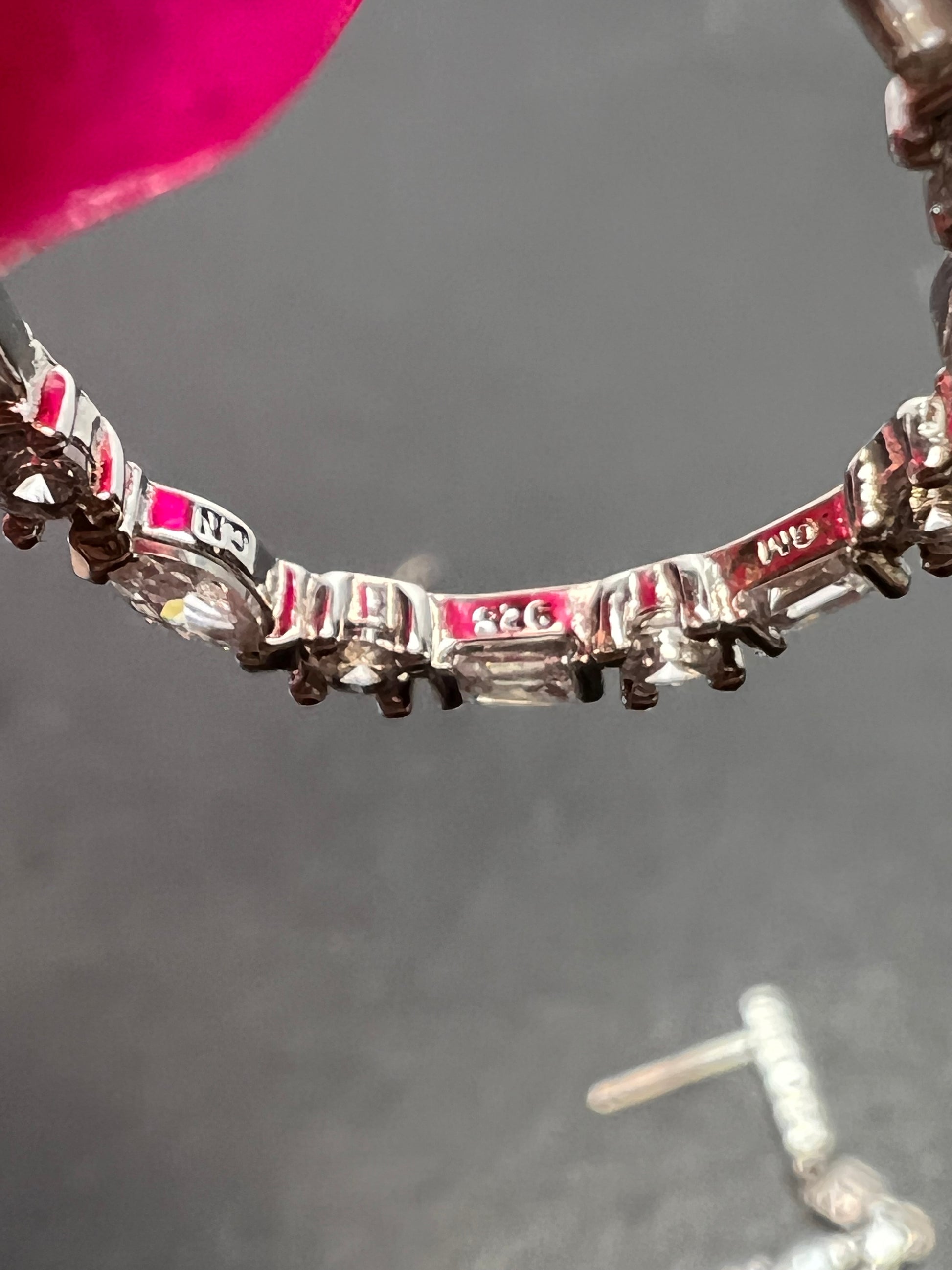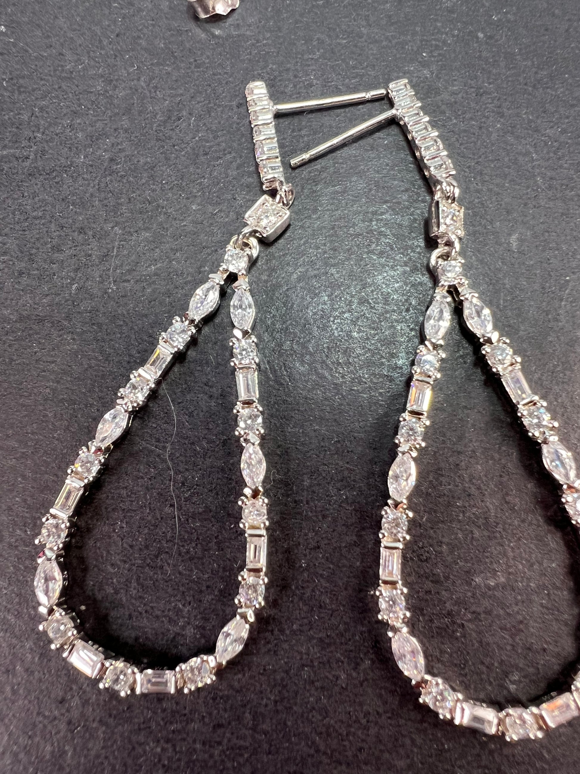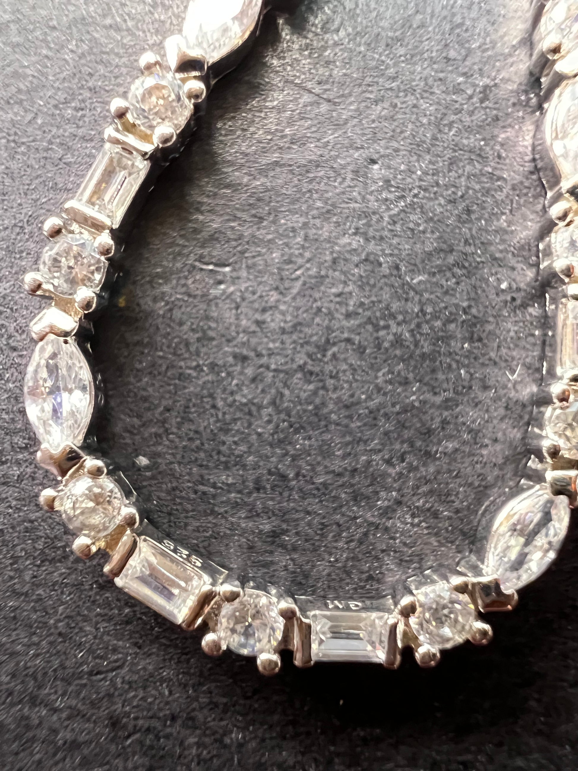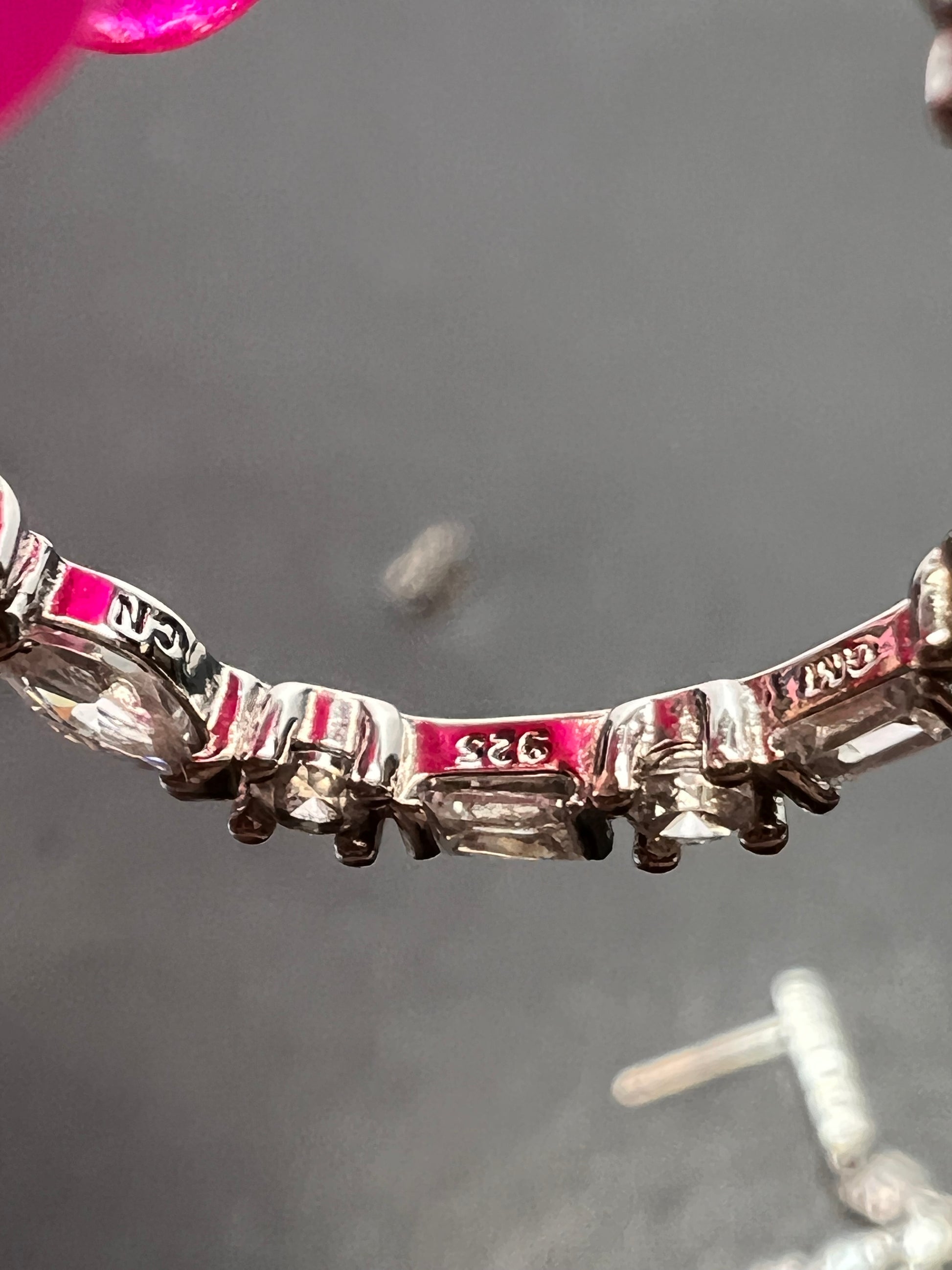 Platinum or rhodium plated over sterling silver . Prong setting. White cubic zirconia stones in round , baguette, and marquis cuts.