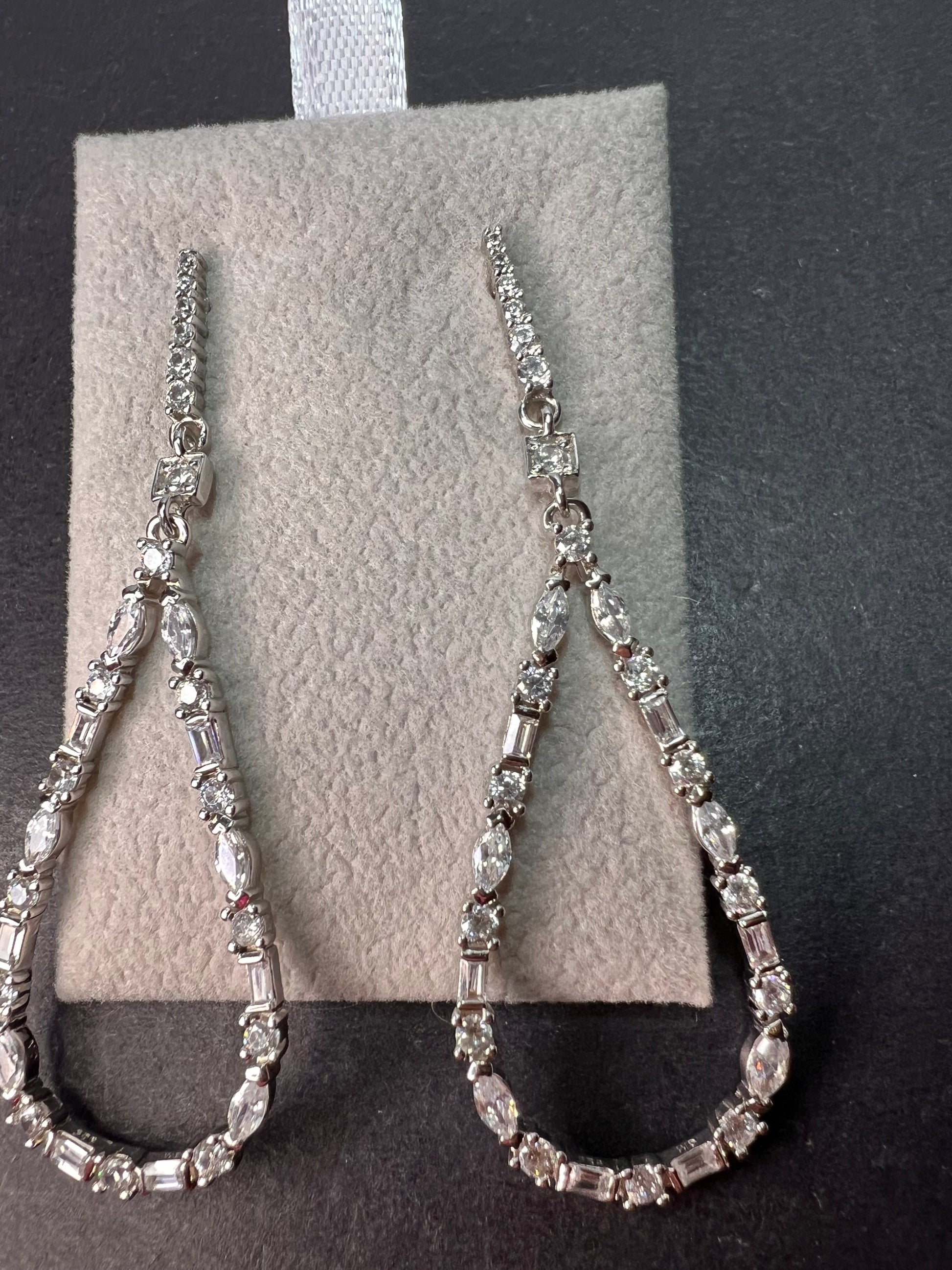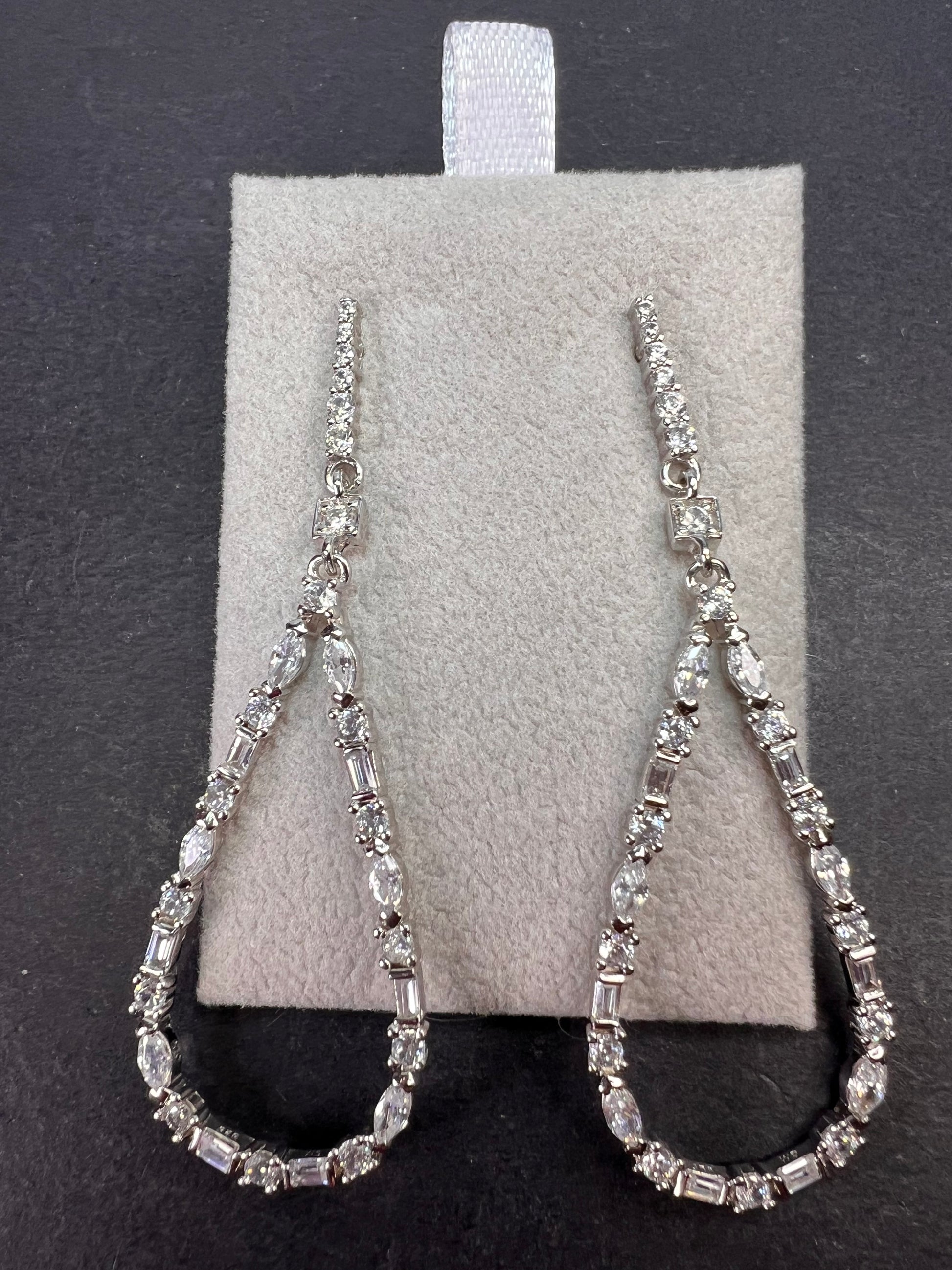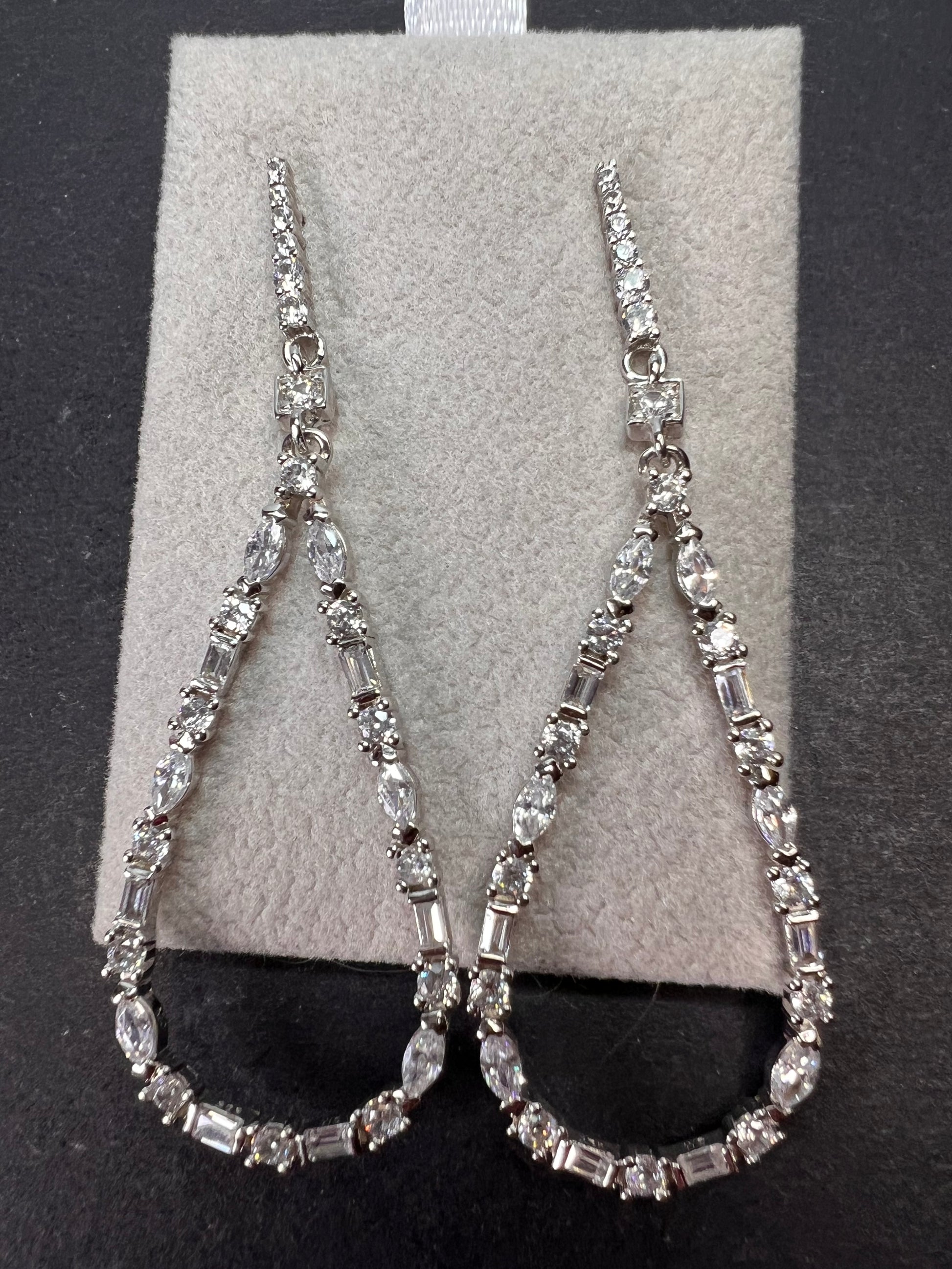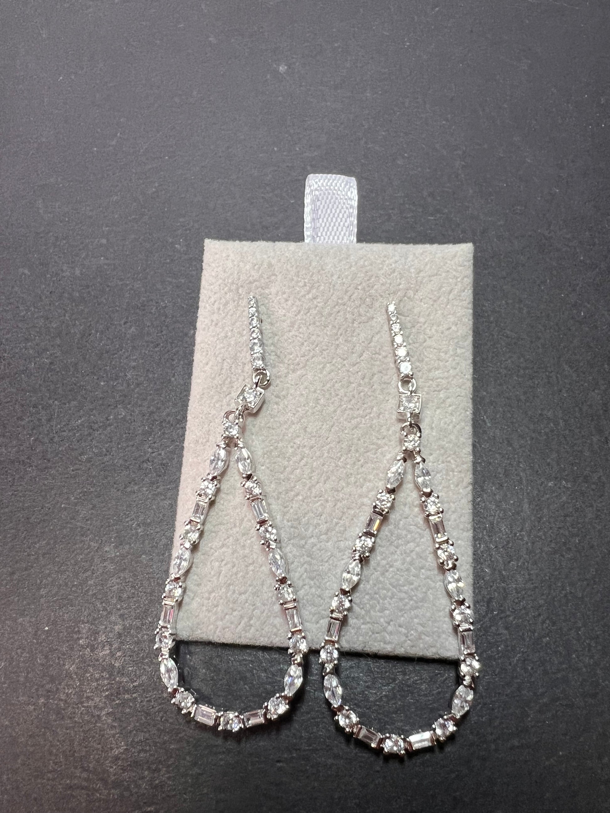Platinum or rhodium plated over sterling silver . Prong setting. White cubic zirconia stones in round , baguette, and marquis cuts.