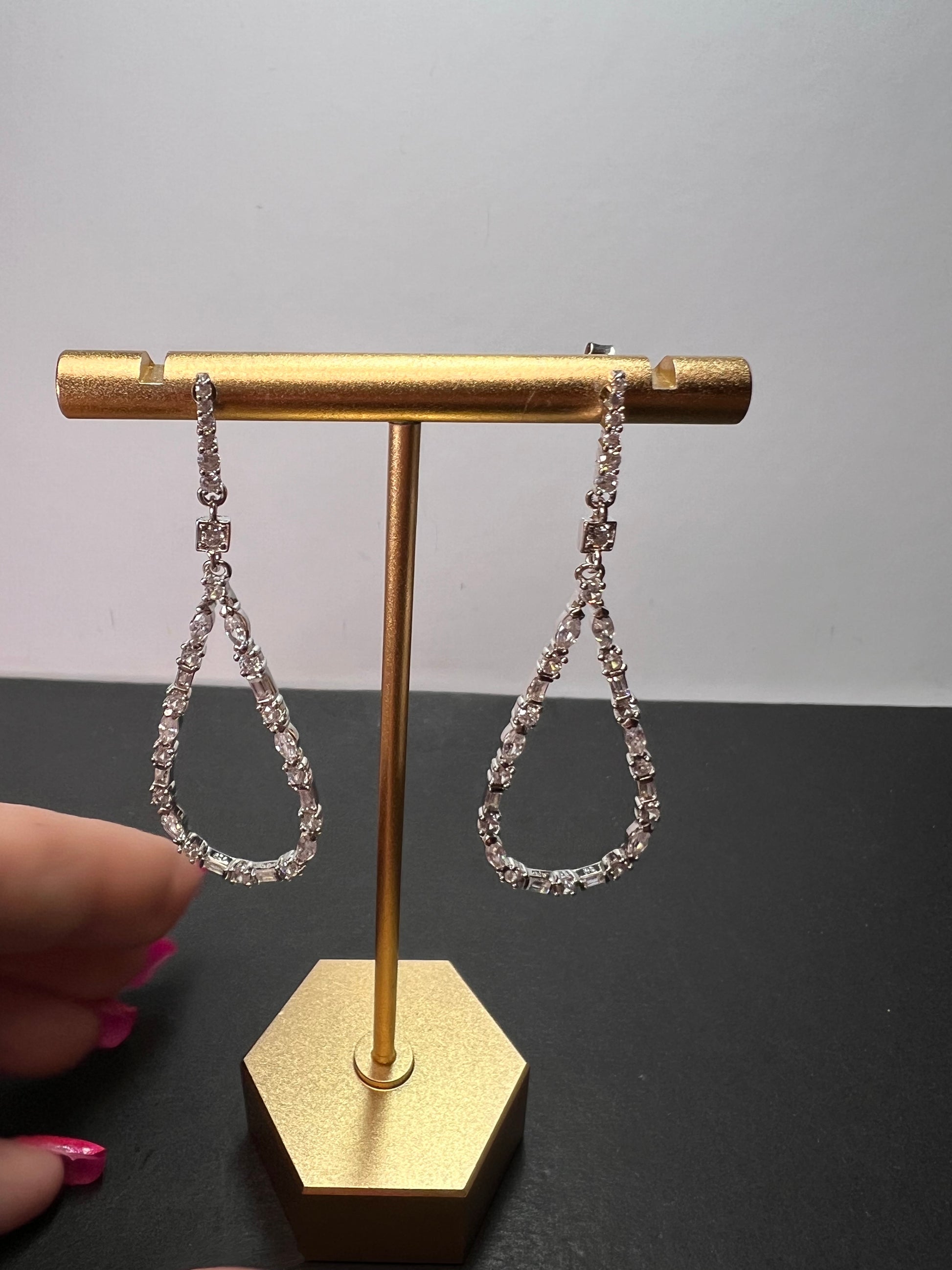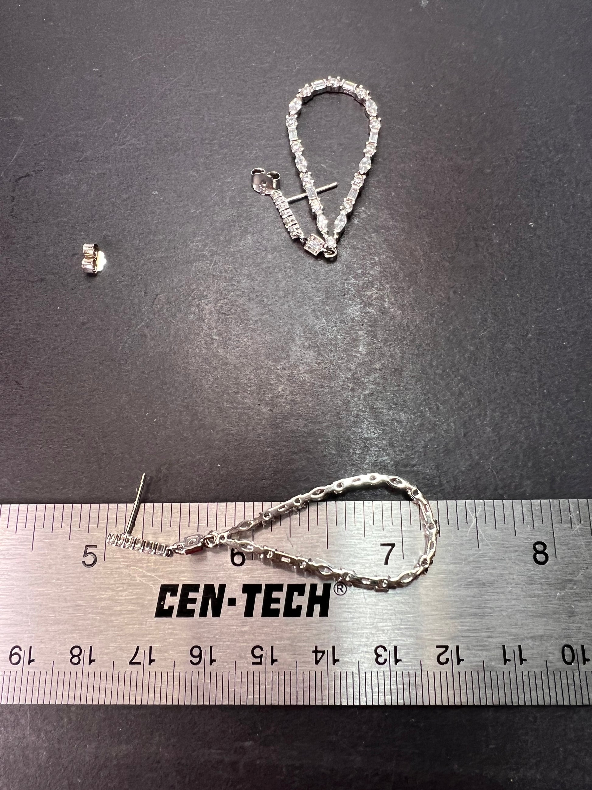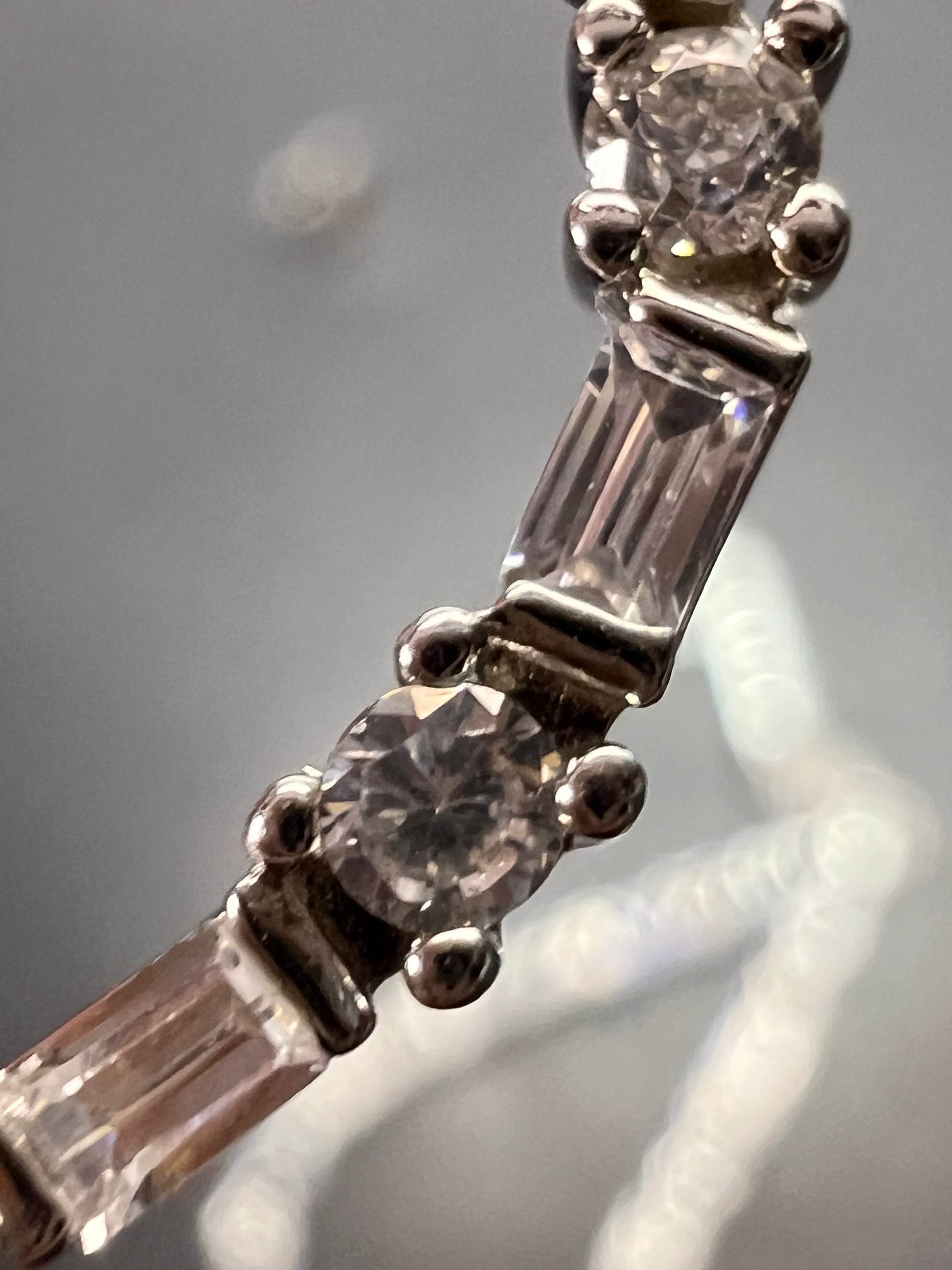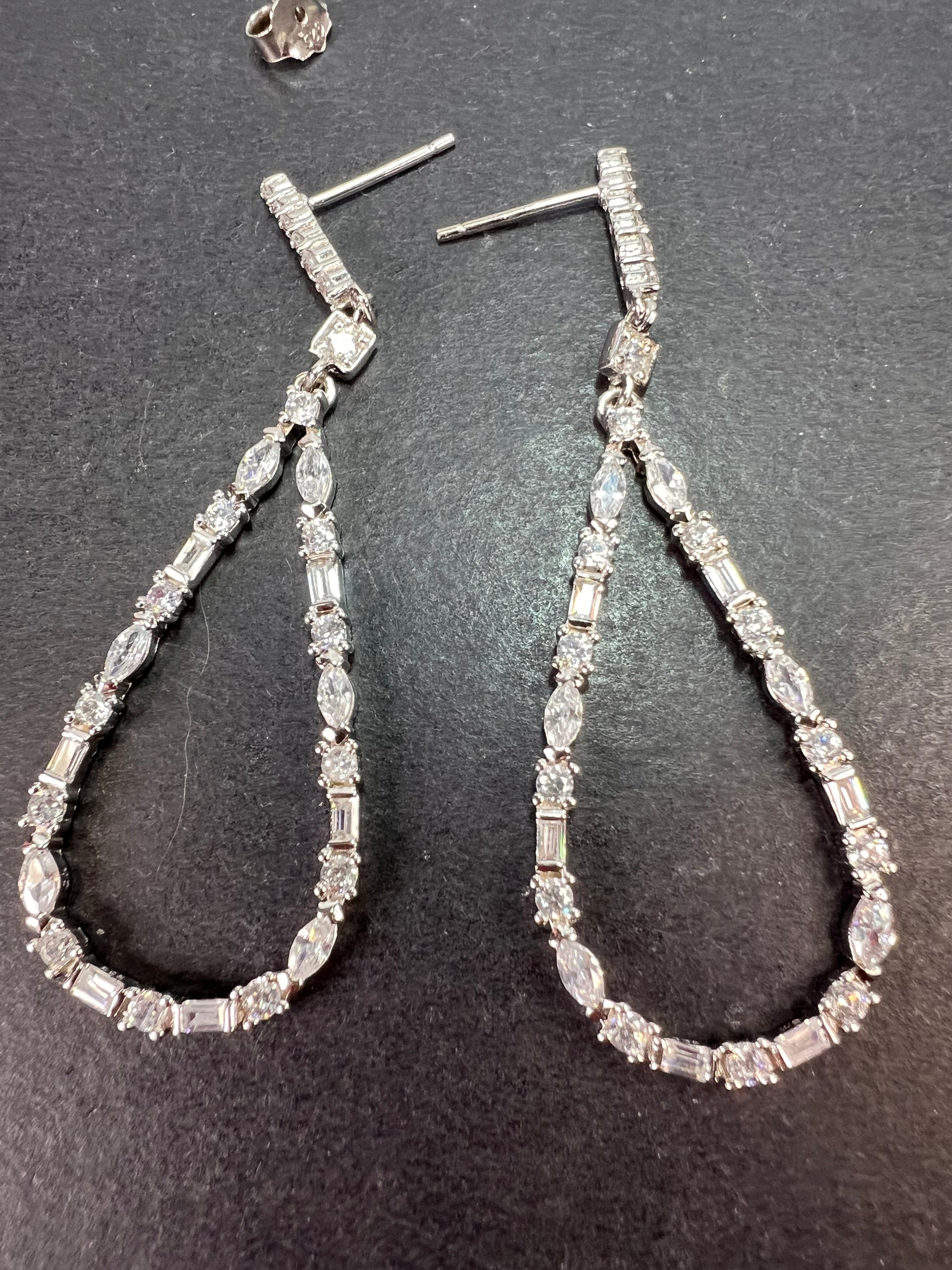 Platinum or rhodium plated over sterling silver . Prong setting. White cubic zirconia stones in round , baguette, and marquis cuts.