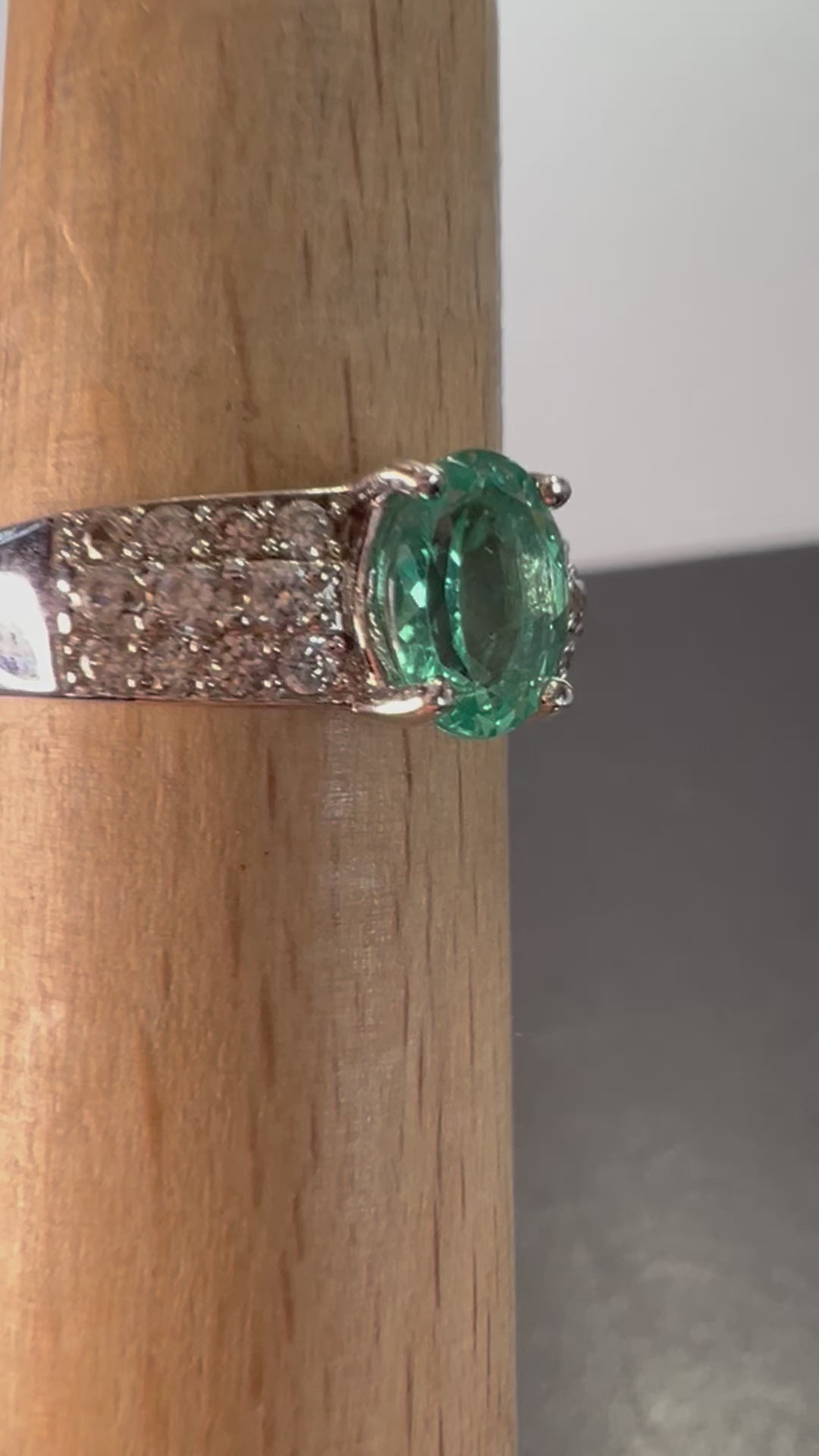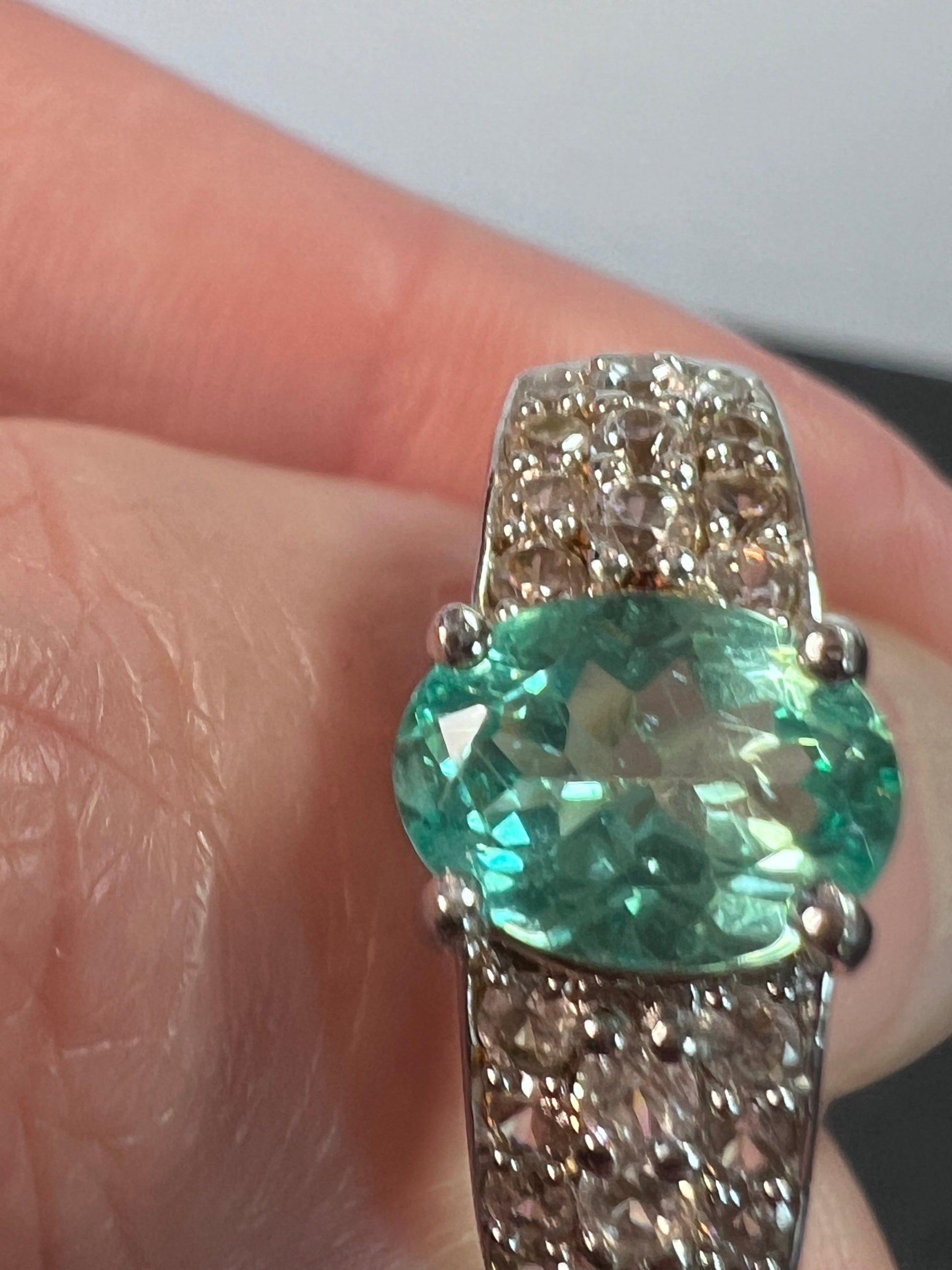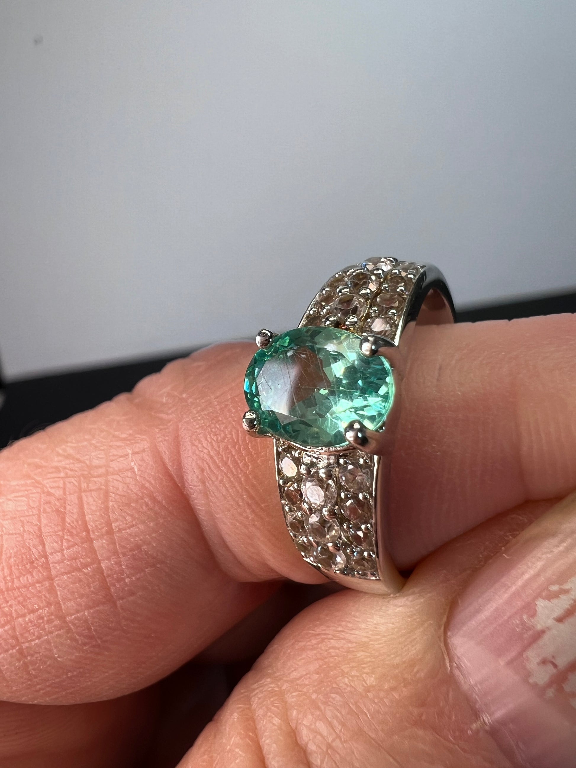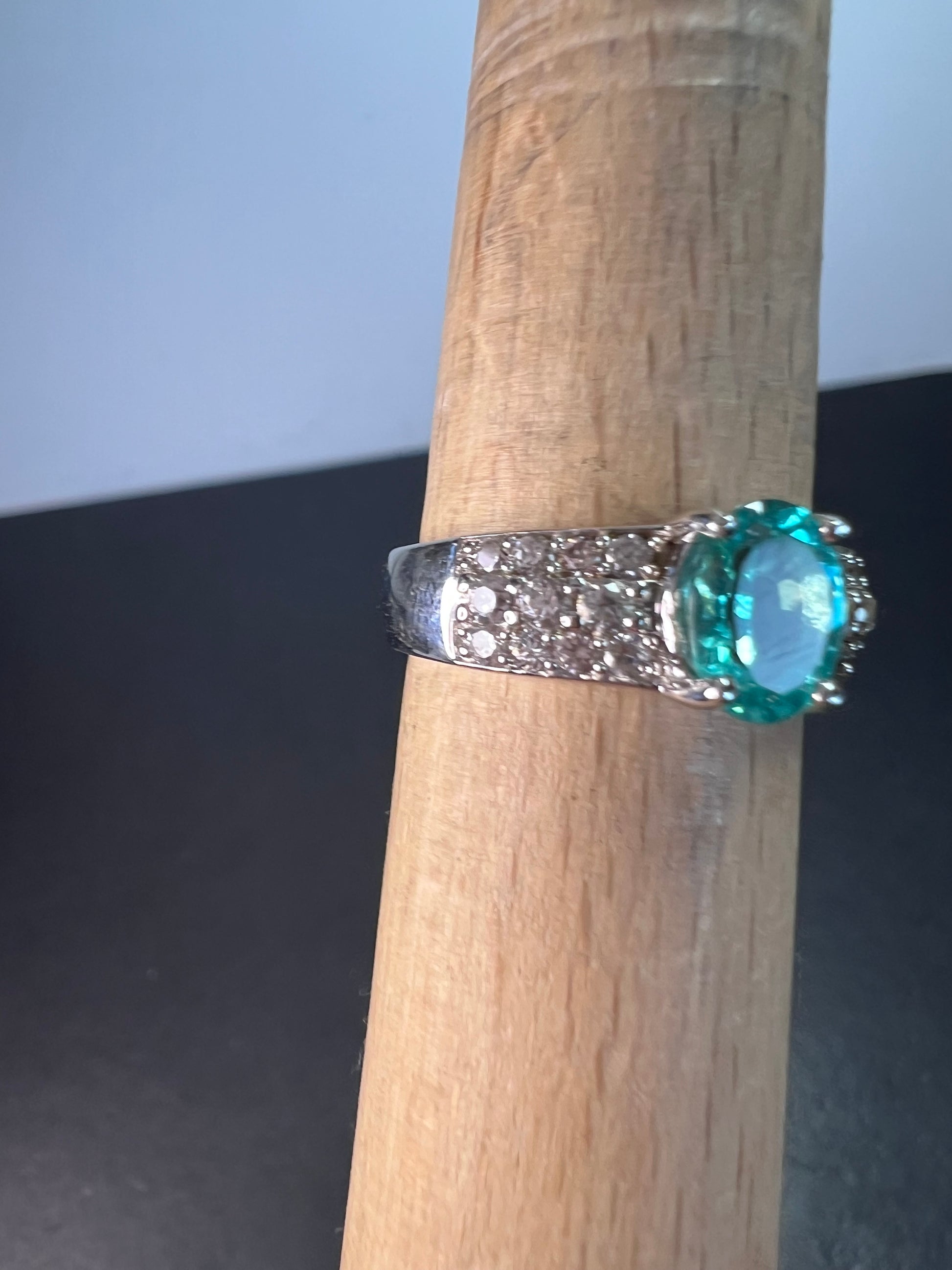Genuine Paraiba blue apatite gemstone with rutile inclusions. Prong set in an authentic 925 sterling silver setting that’s plated with platinum or rhodium. White accent are zircon. Size 9. J&T
