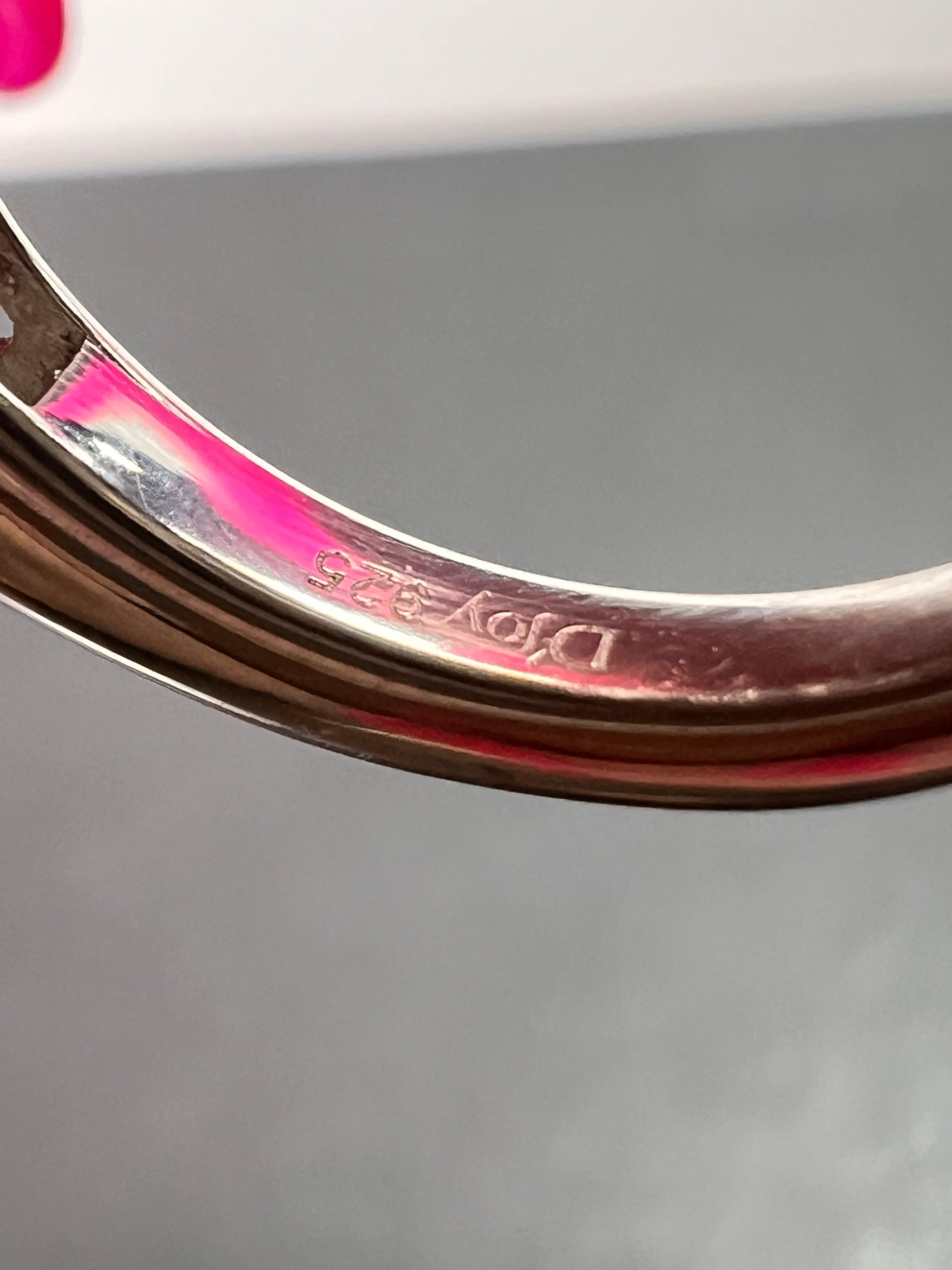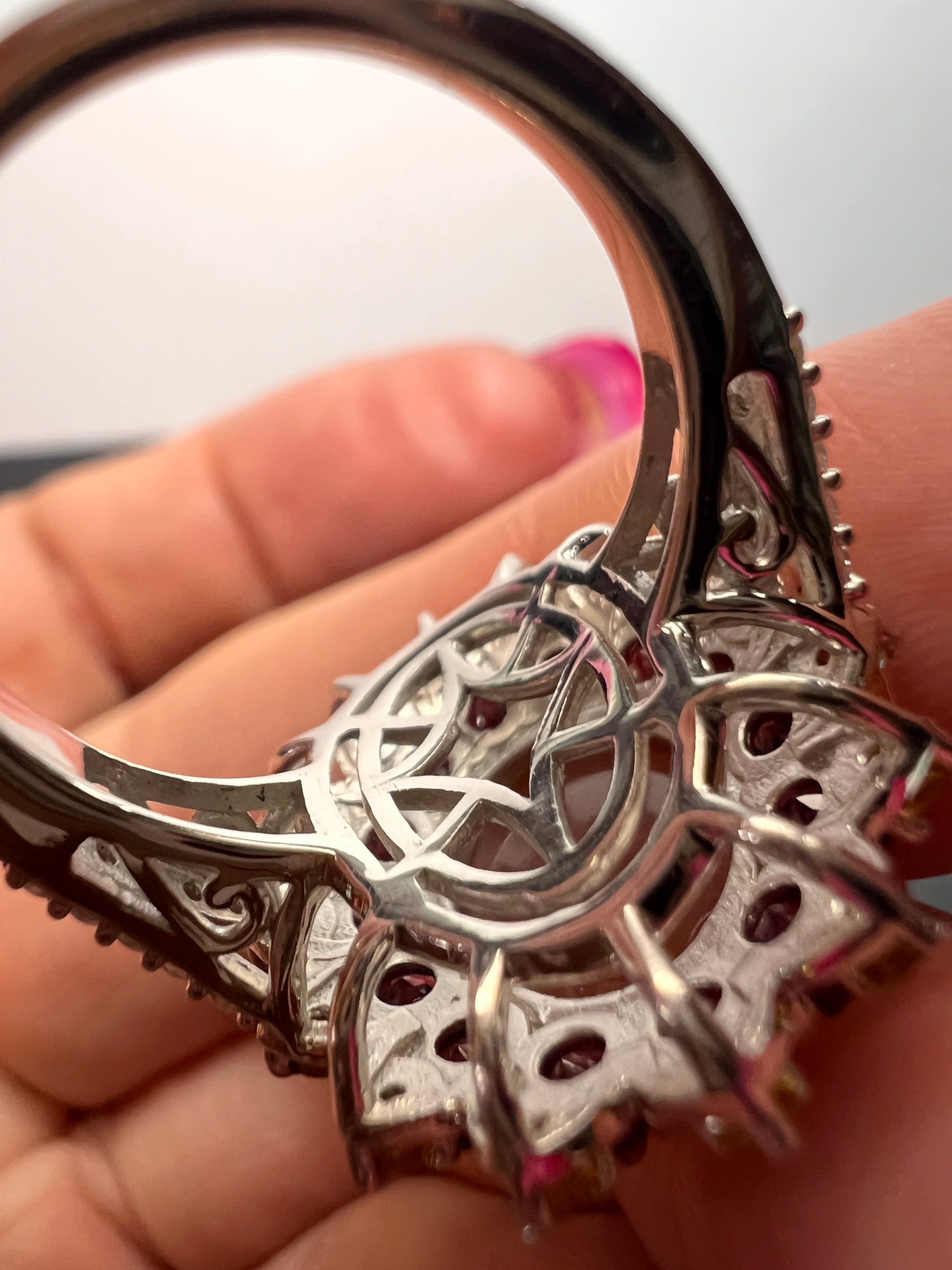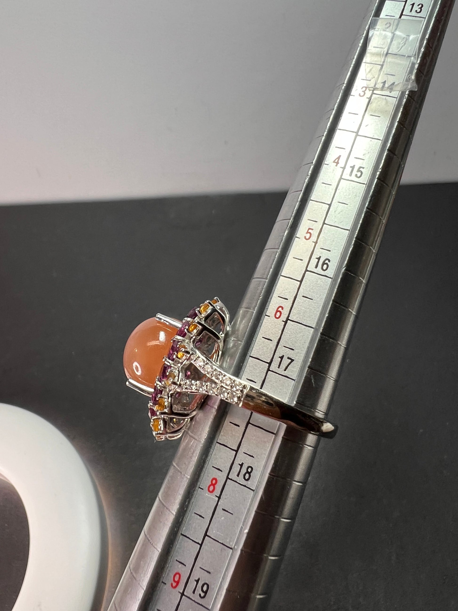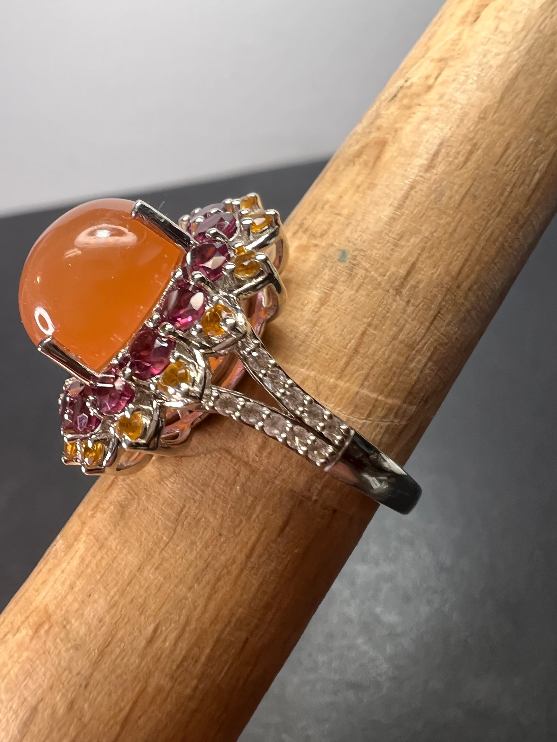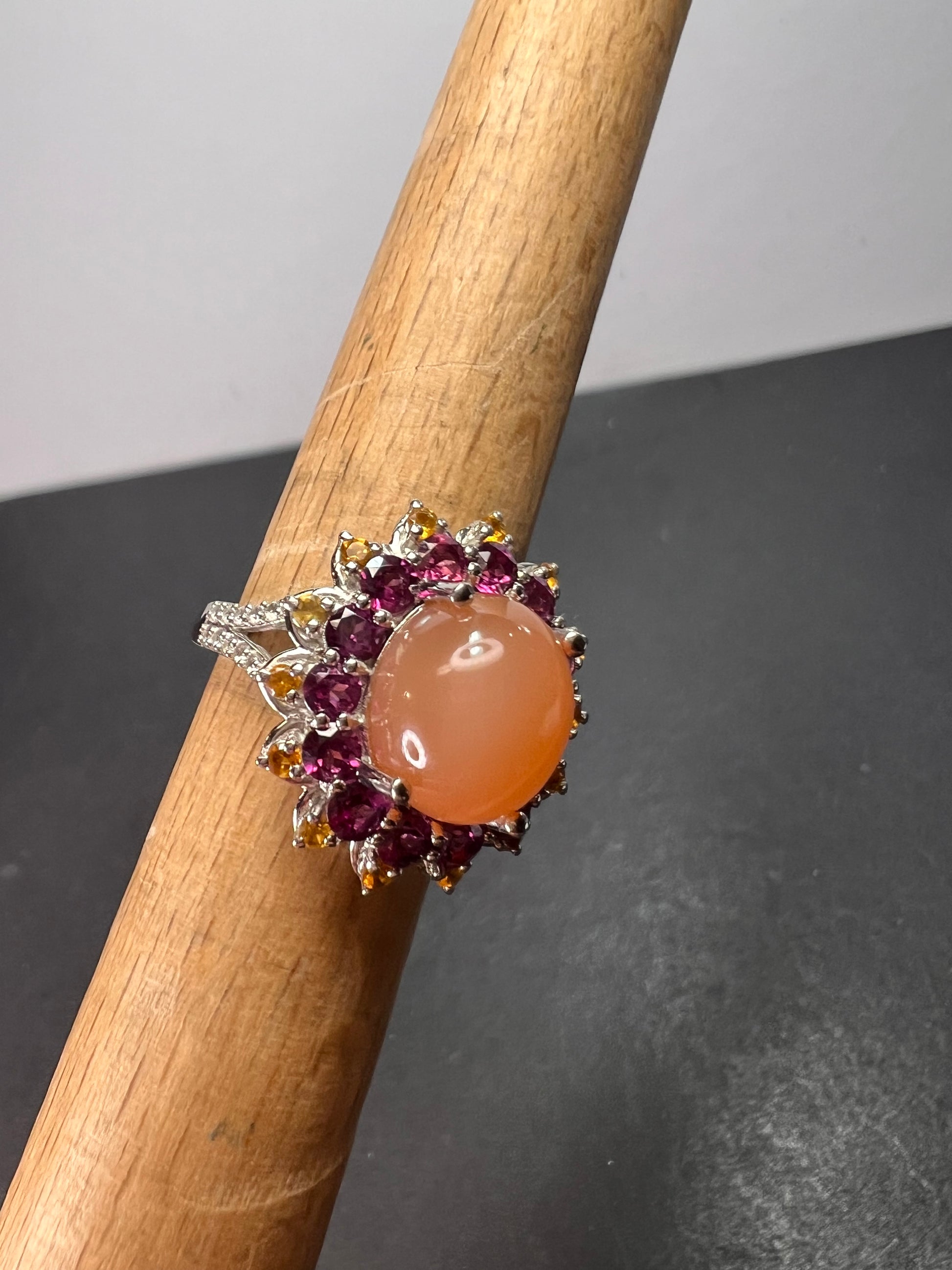 Juicy peach moonstone with raspberry rhodolite garnets , citrine gemstones and white zircon accent stones. Print set in platinum over sterling silver. Citrine has been heat treated. Size 7. 925 Djoy . 8.10 total ctw