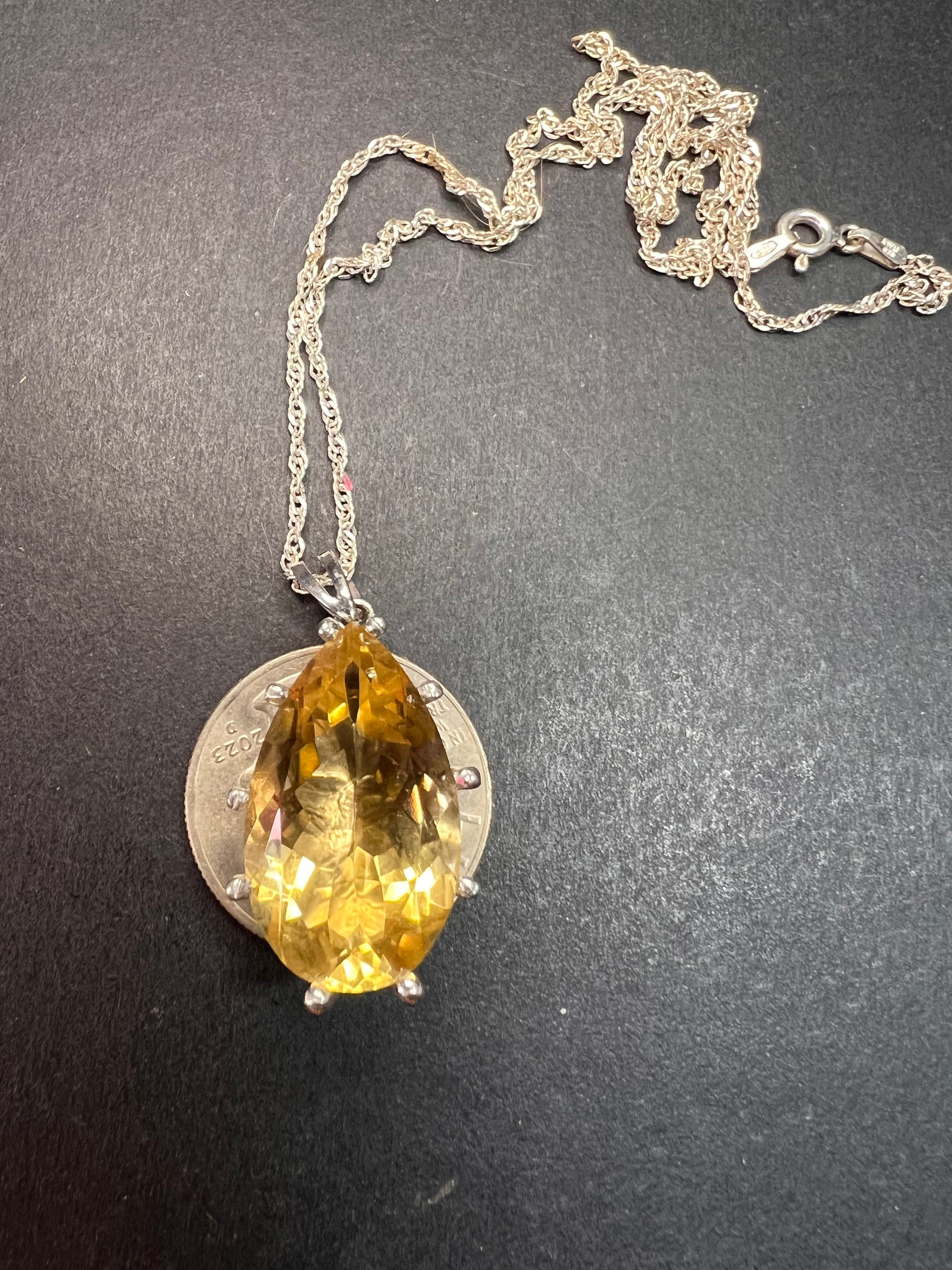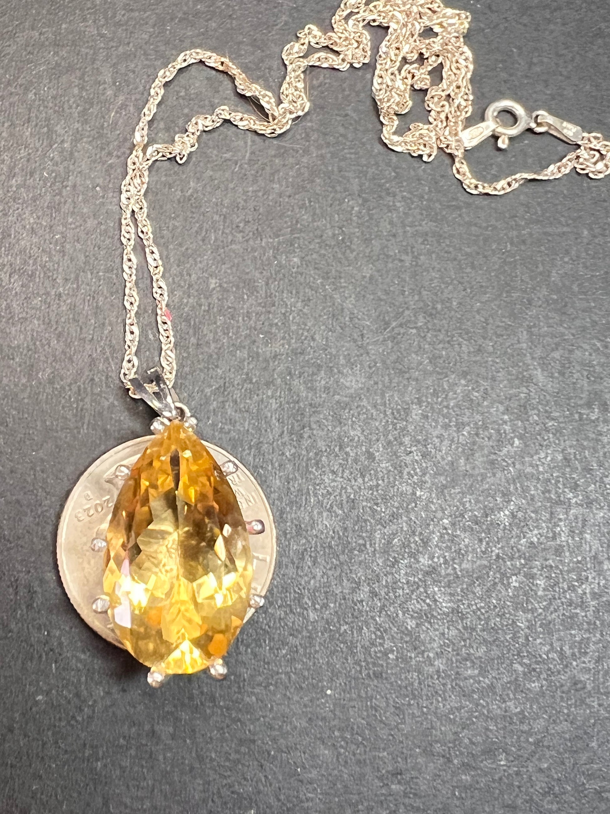 Genuine giant yellow pear cut citrine 20 ctw gemstone gemstone prong set in an authentic 925 sterling silver pendant plated with rhodium. Comes with an 18 inch sterling silver Singapore chain. Citrine stone is from Brazil and heat treated for color enhancement. Made in Thailand. Estimated retail value is $308.