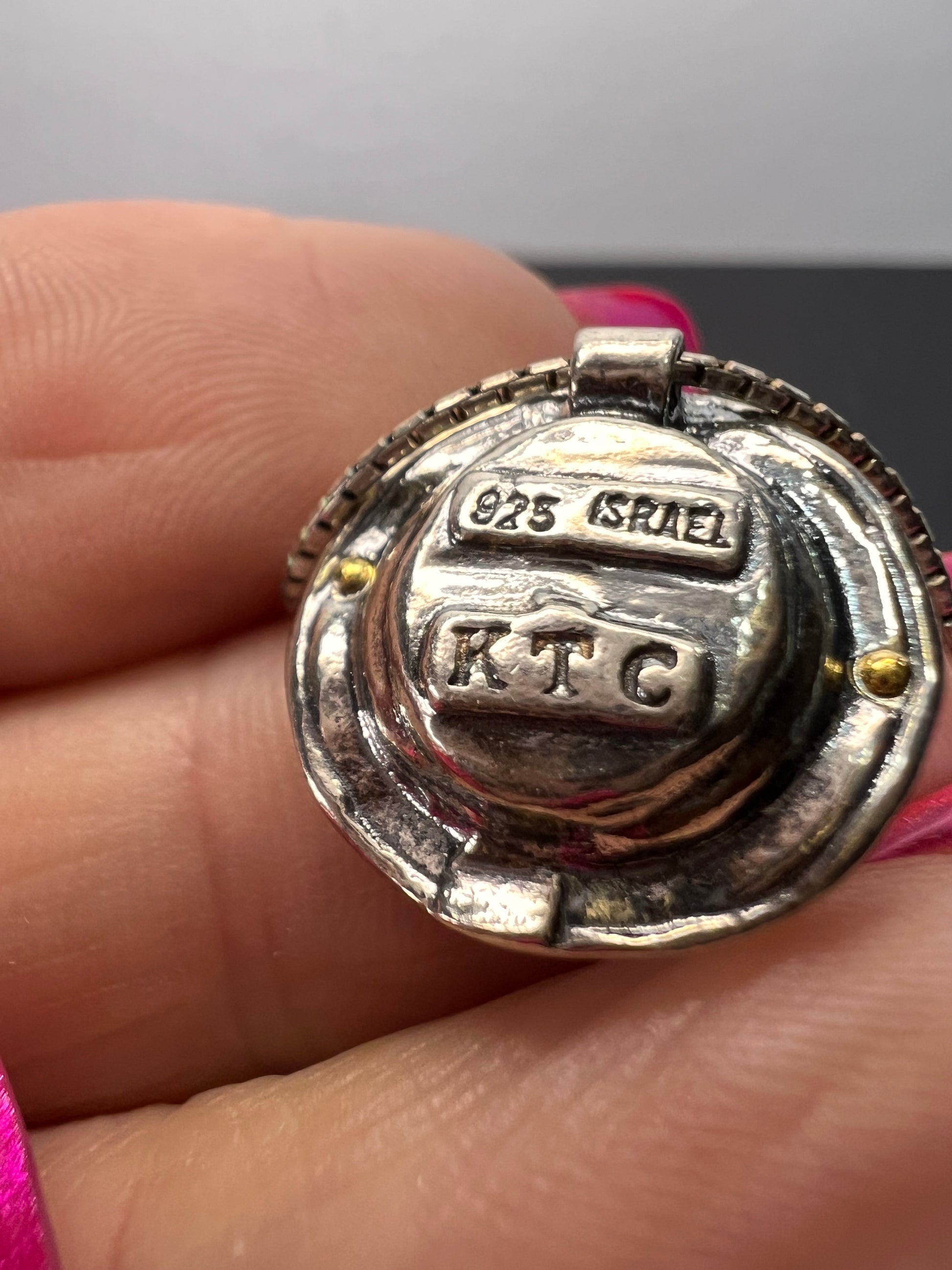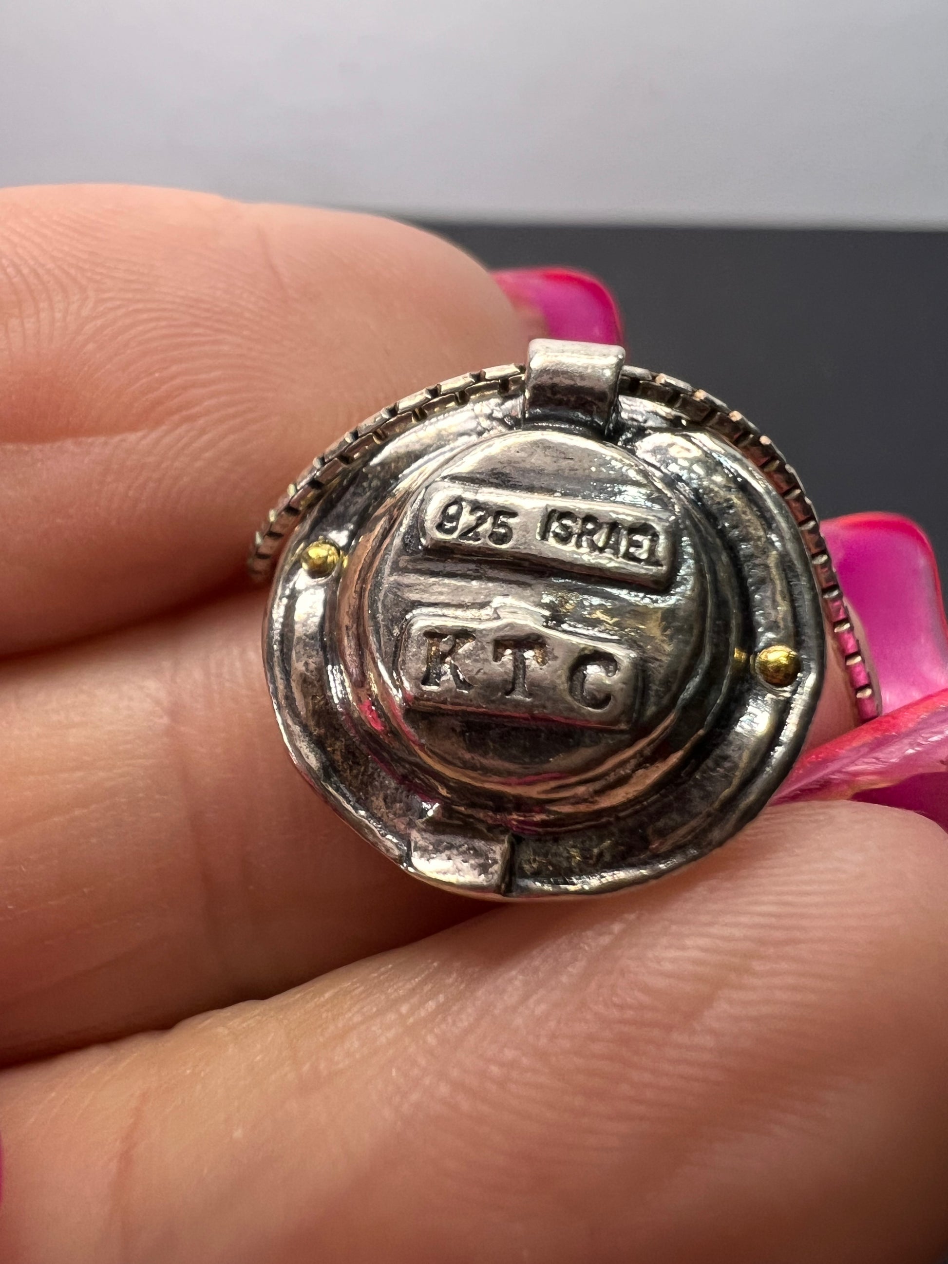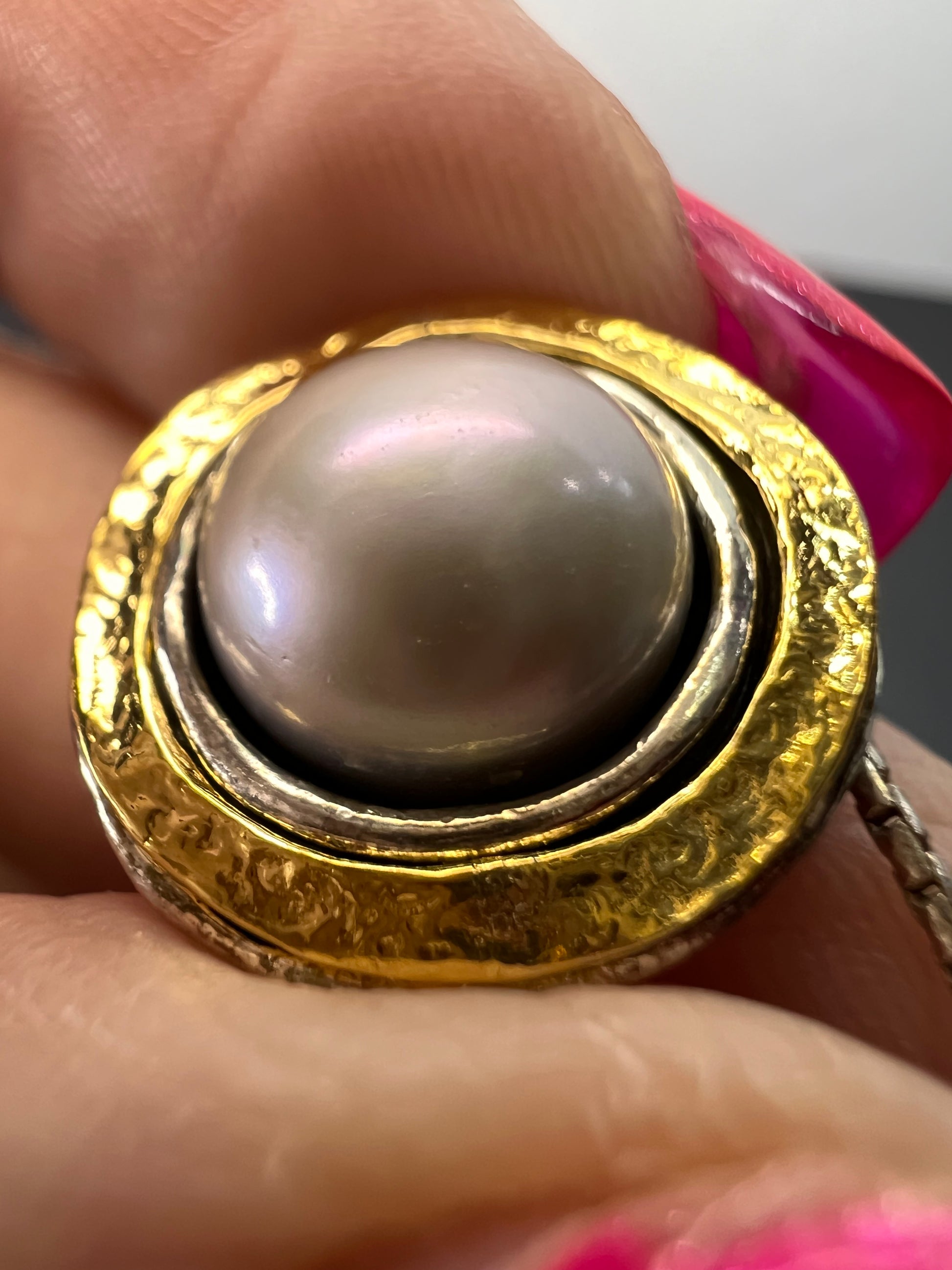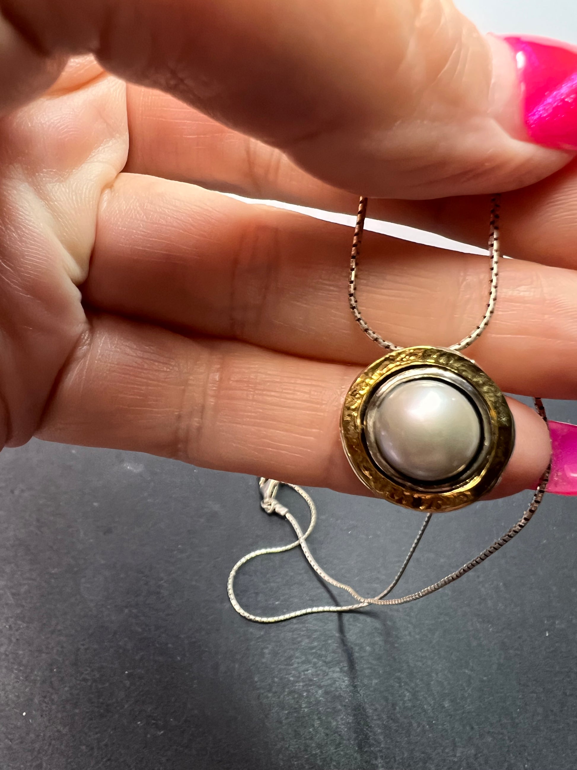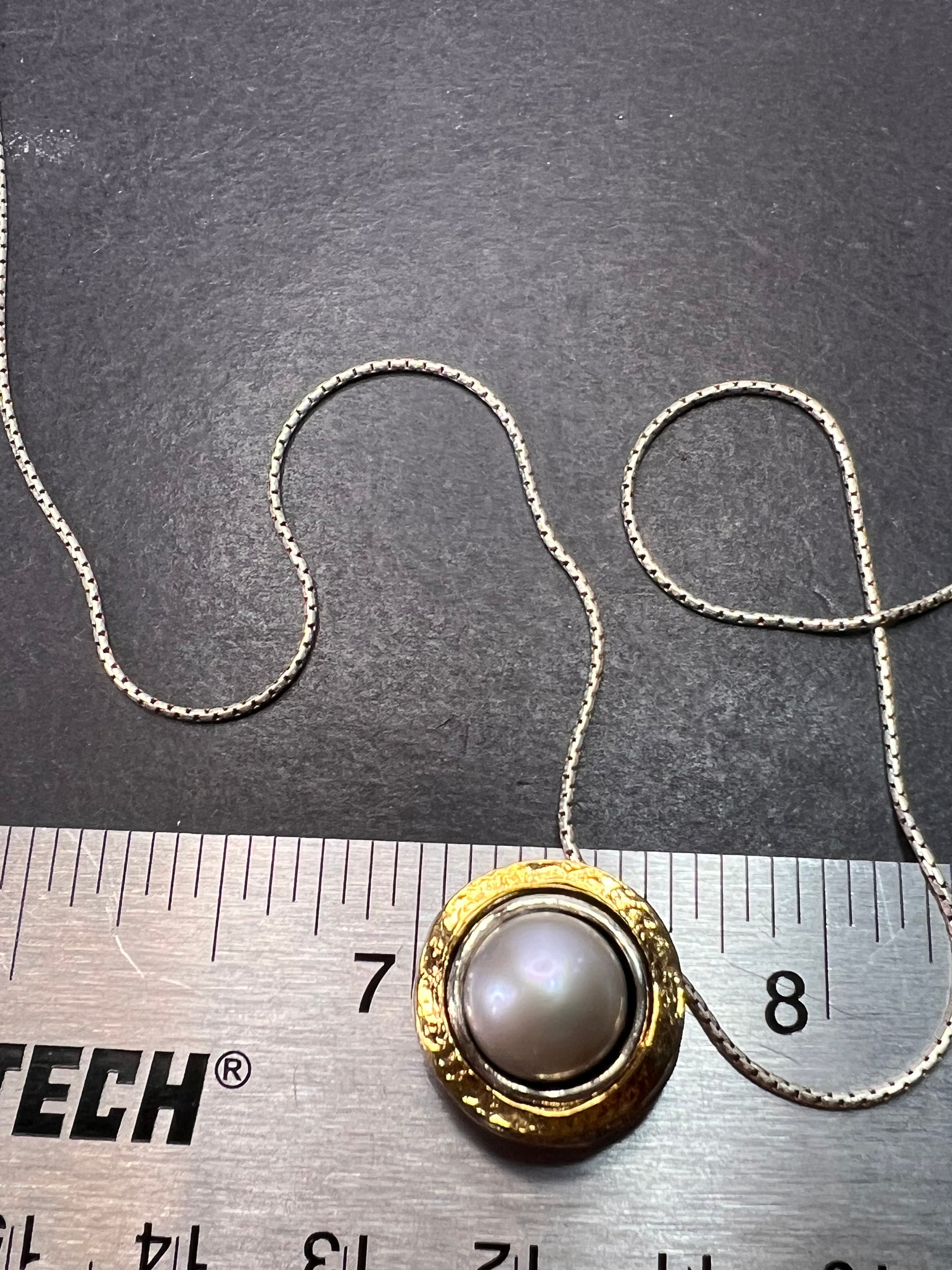 9-10mm grey / silver cultured freshwater pearl sterling silver with 14k yellow gold over sterling silver accent 18 inch necklace. Measures approximately 5/8 of an inch in width and has a lobster claw clasp. KTC 925 Israel