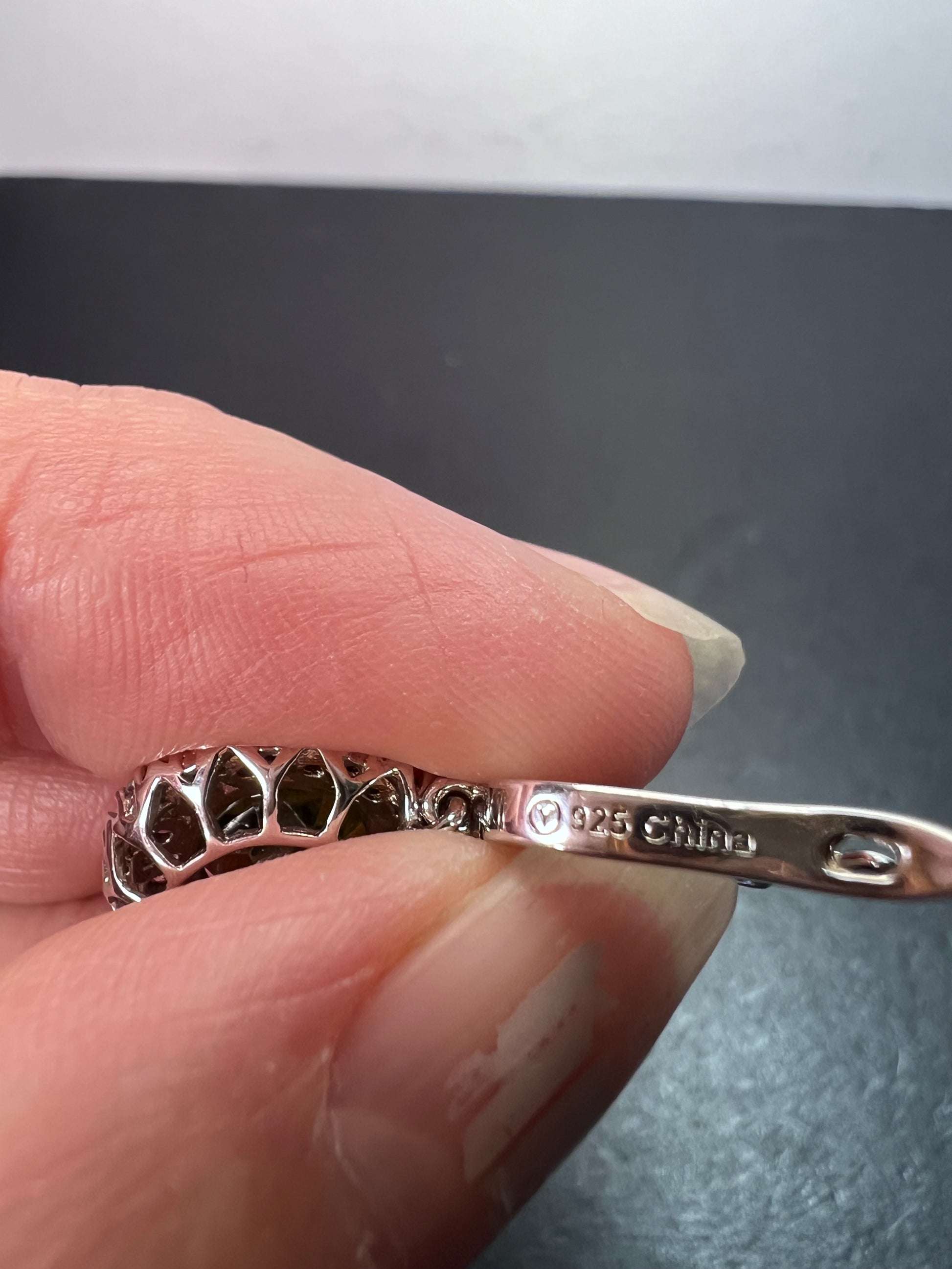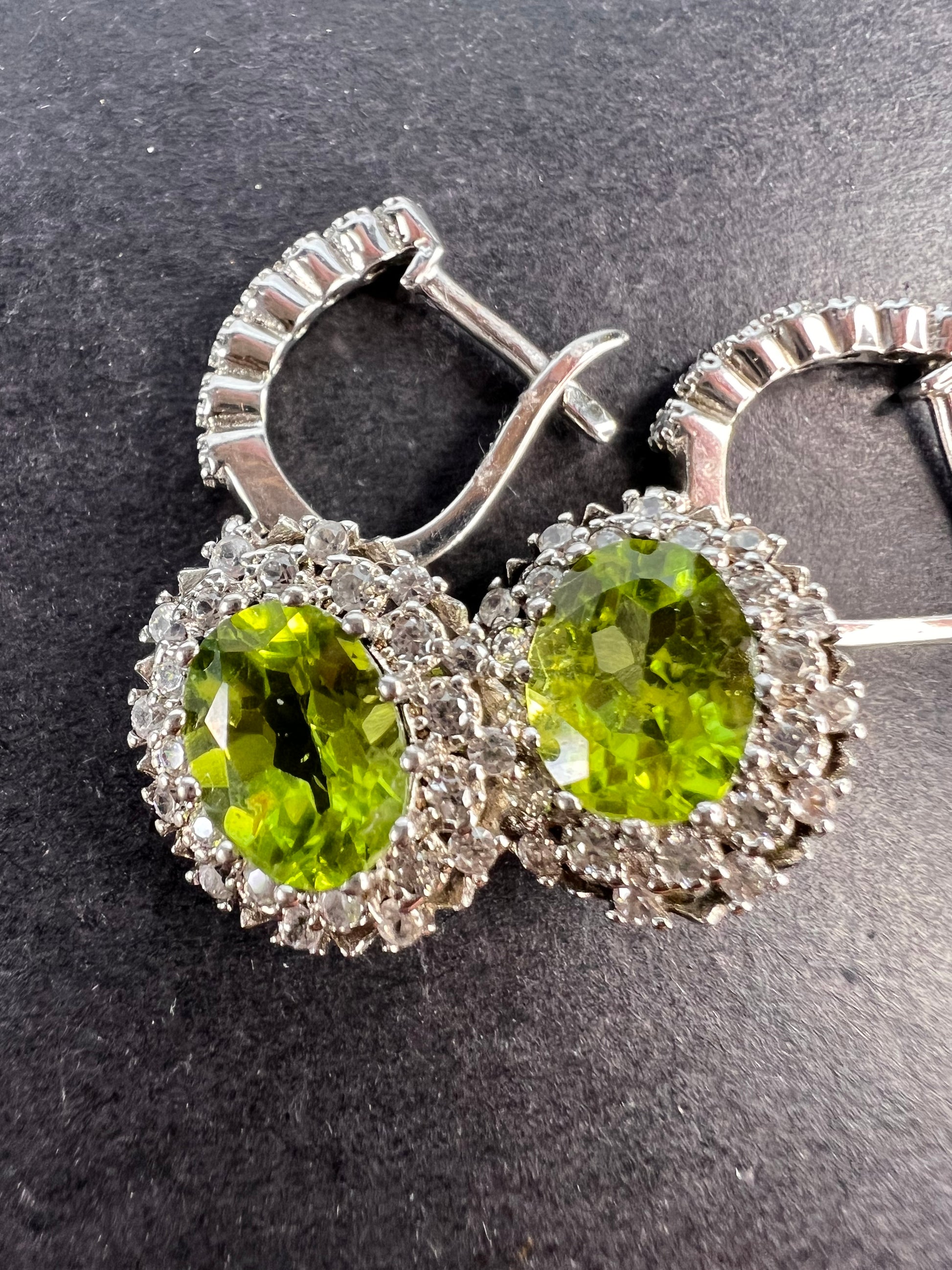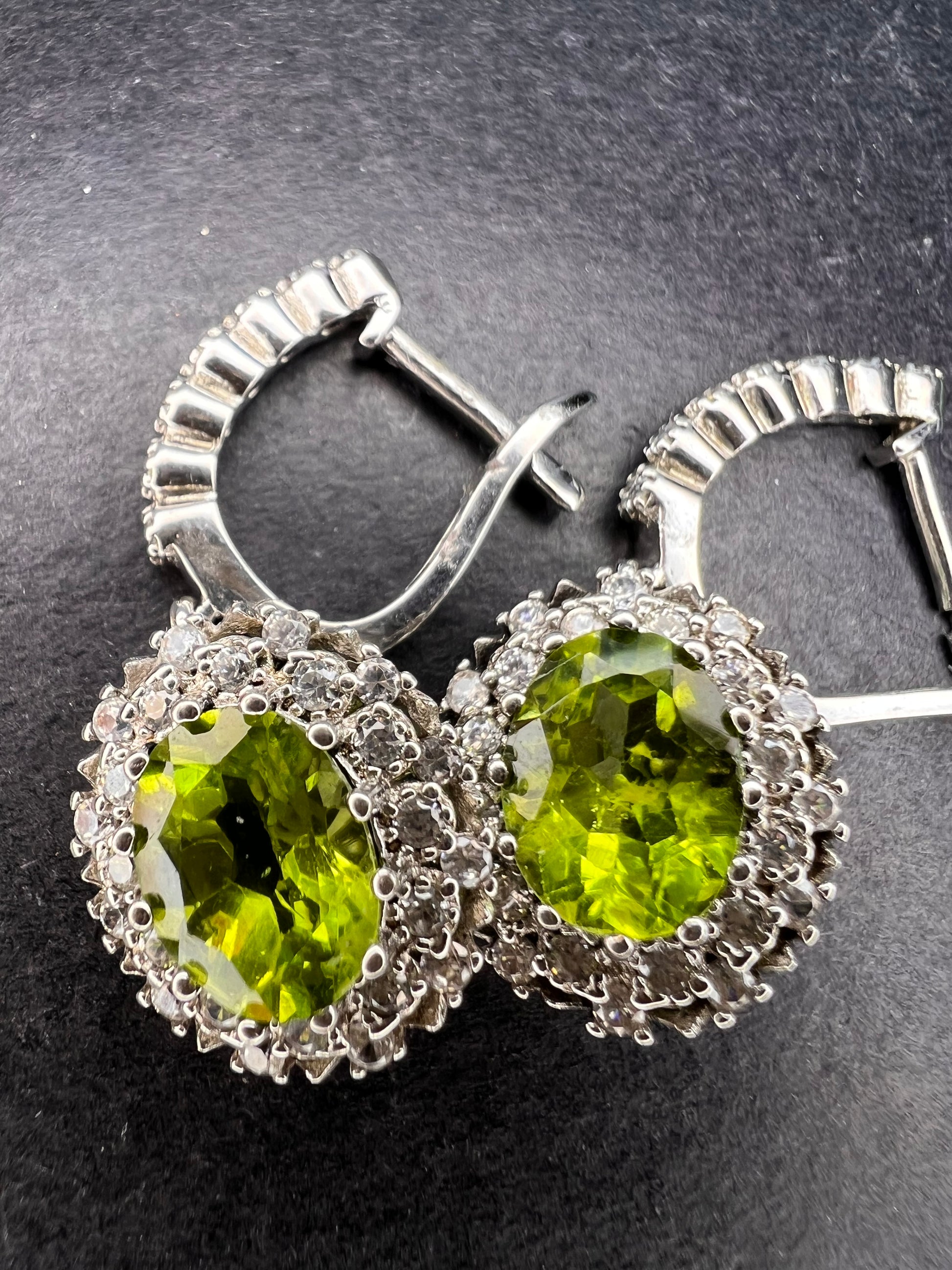 Genuine green peridot gemstones with visible inclusions encircled by tiny white zircon accent stones in a prong setting . Rhodium plated over sterling silver. Latch backs closure. 925