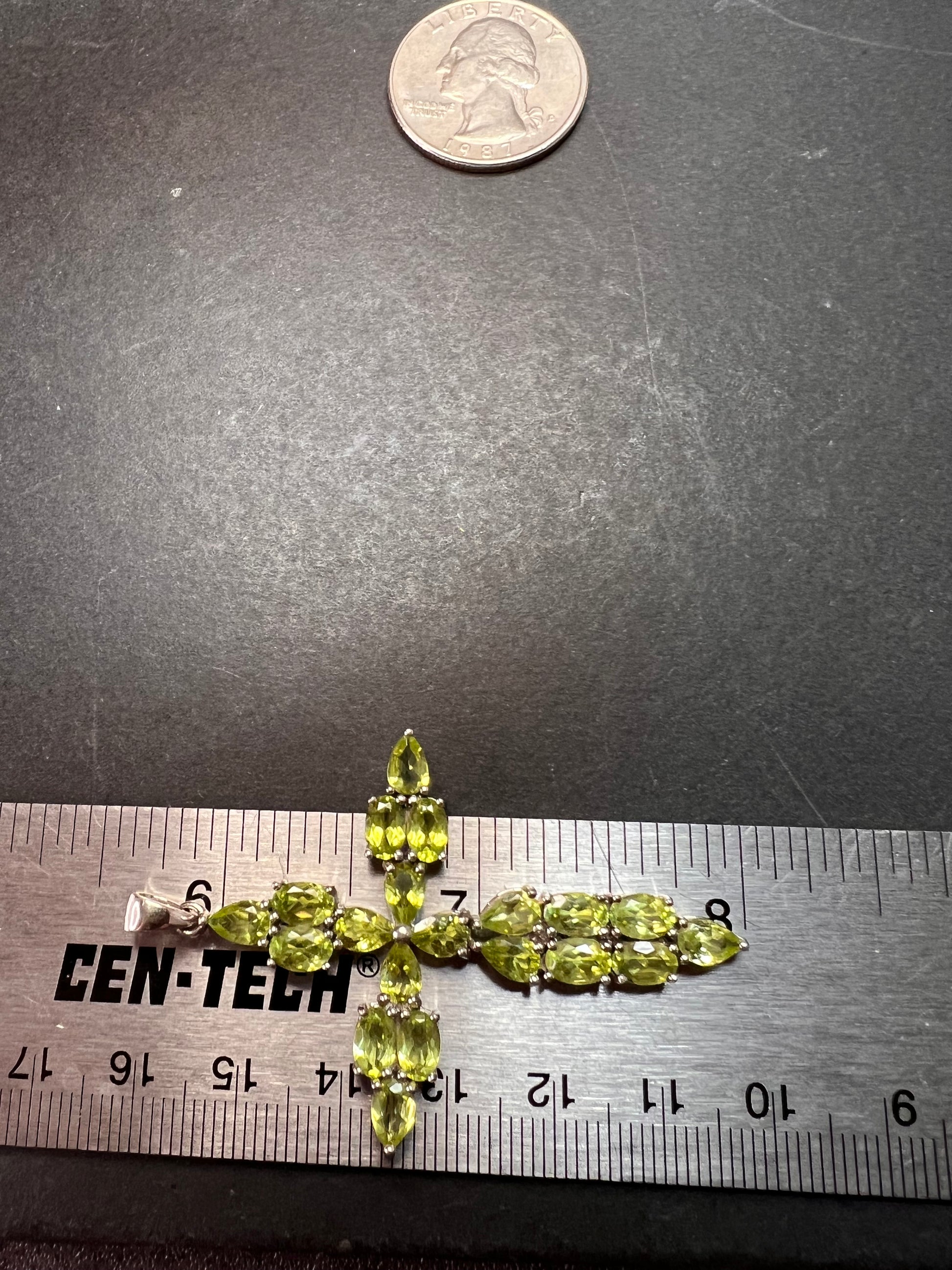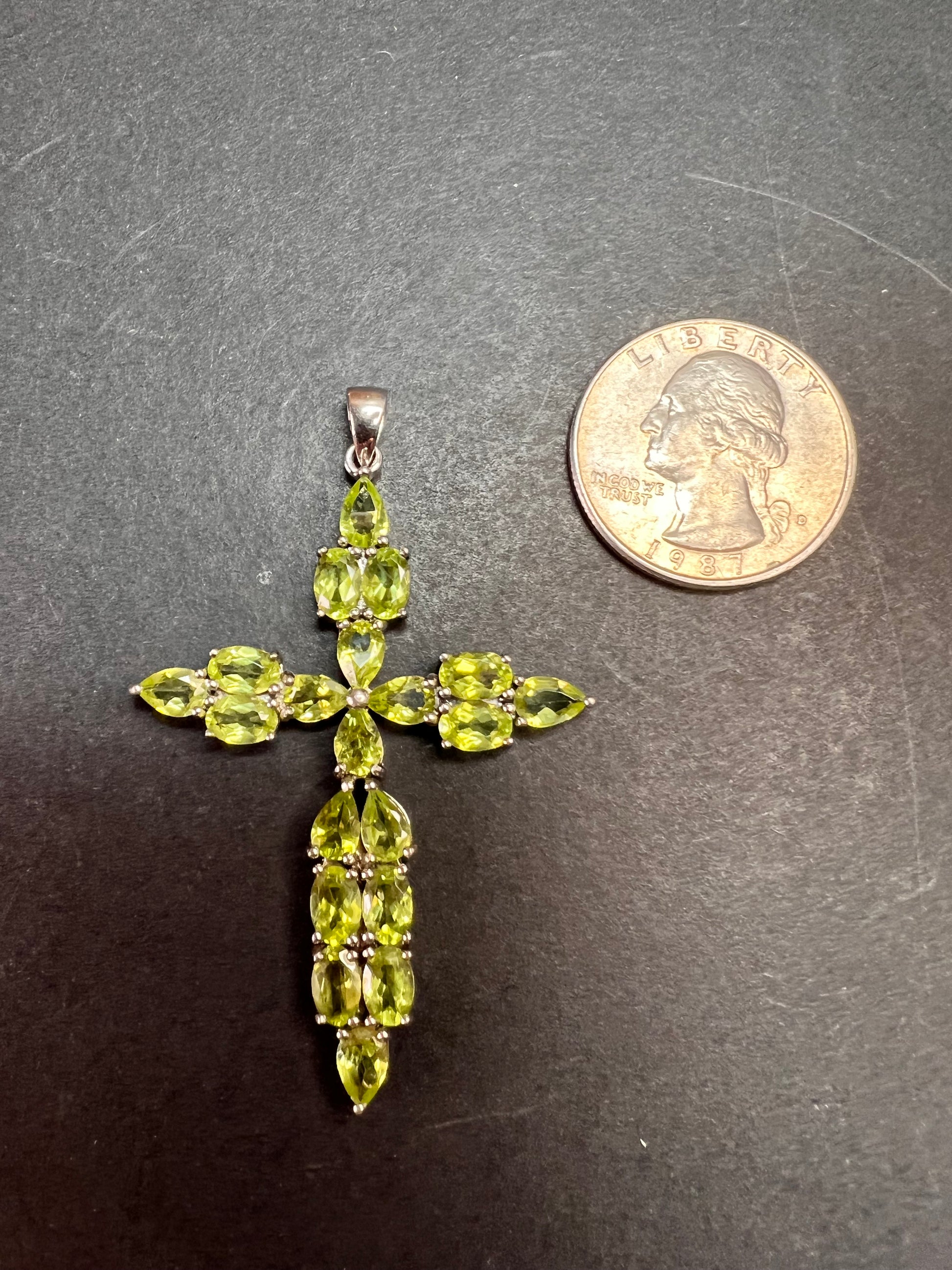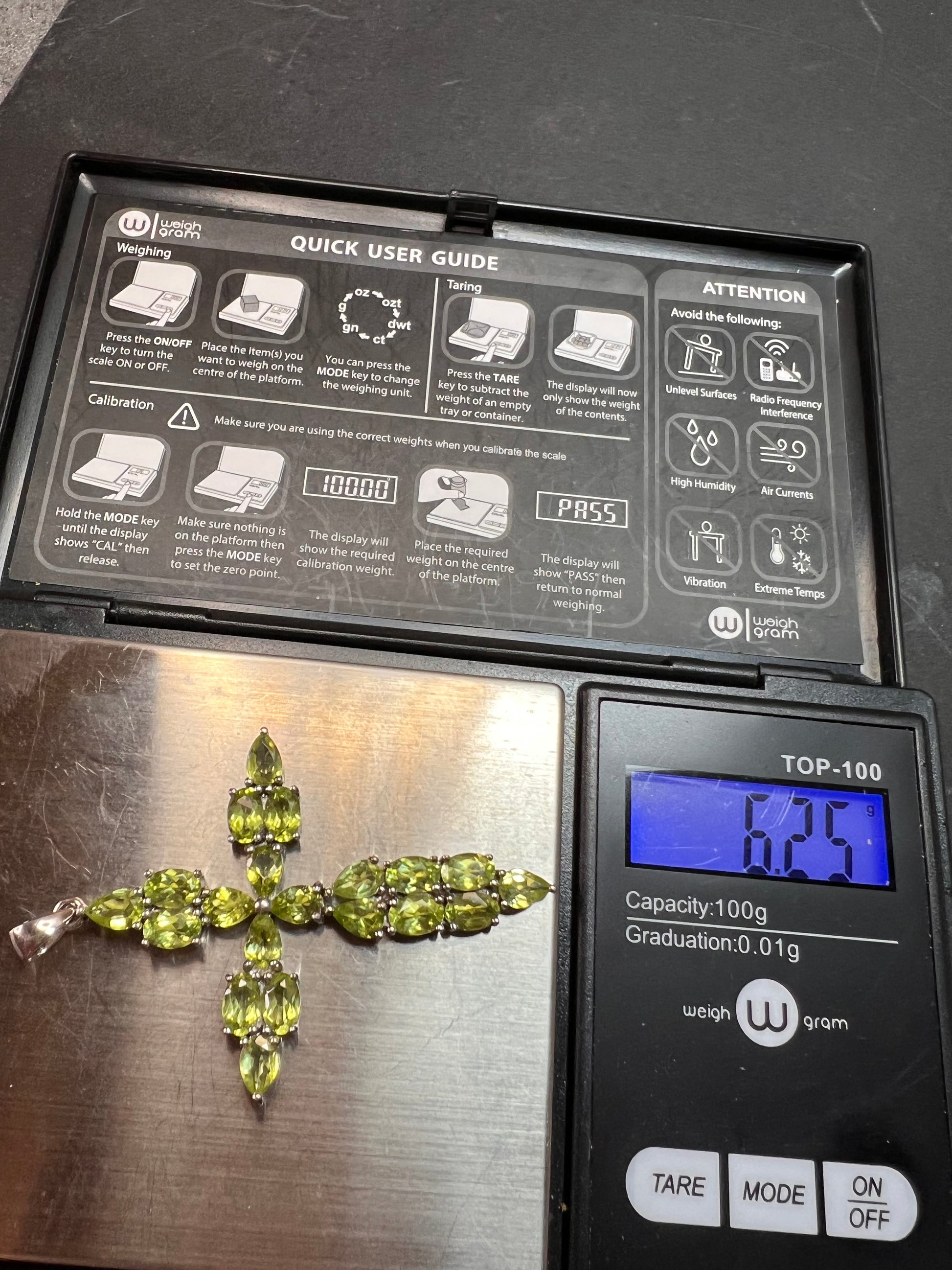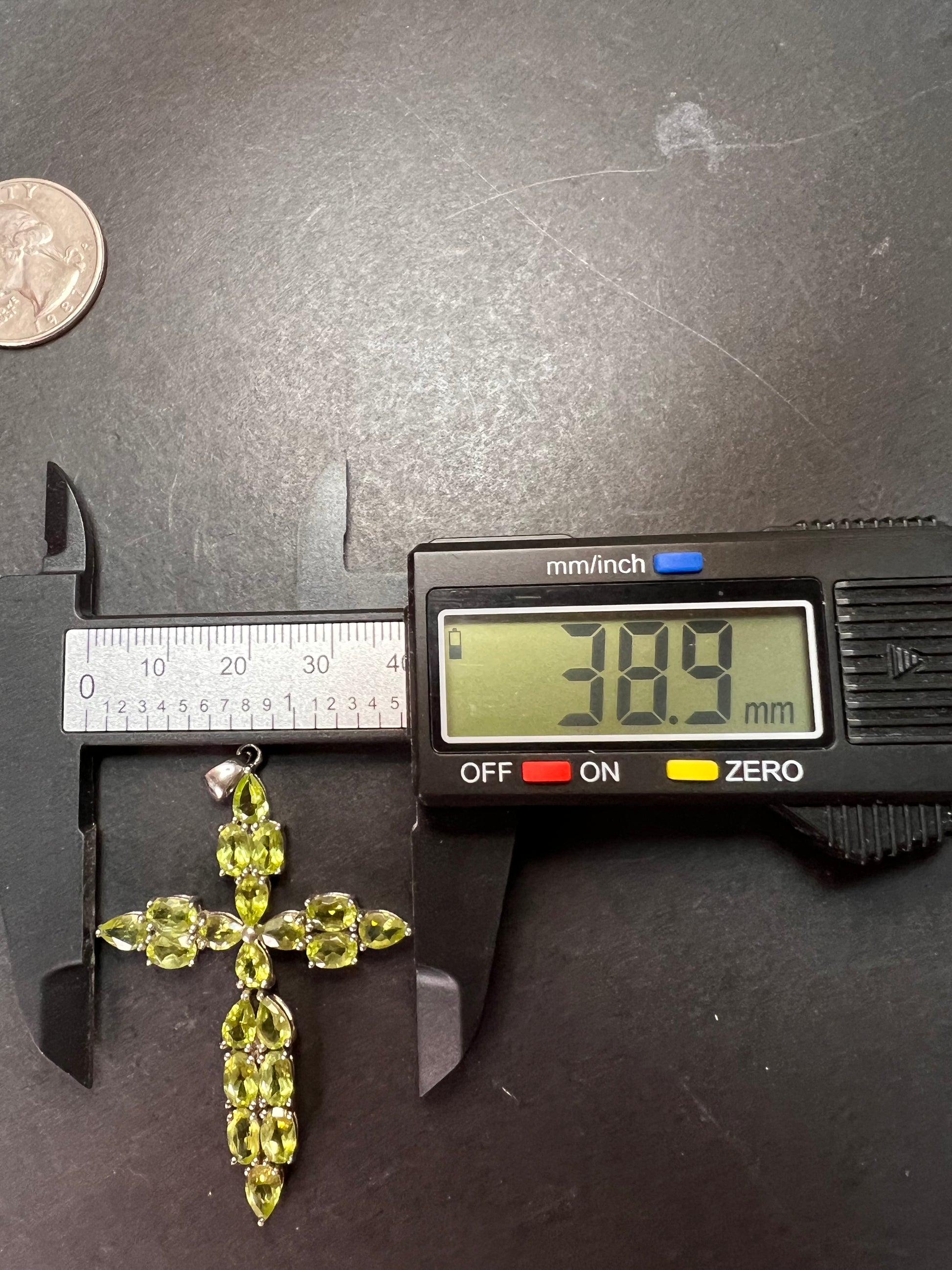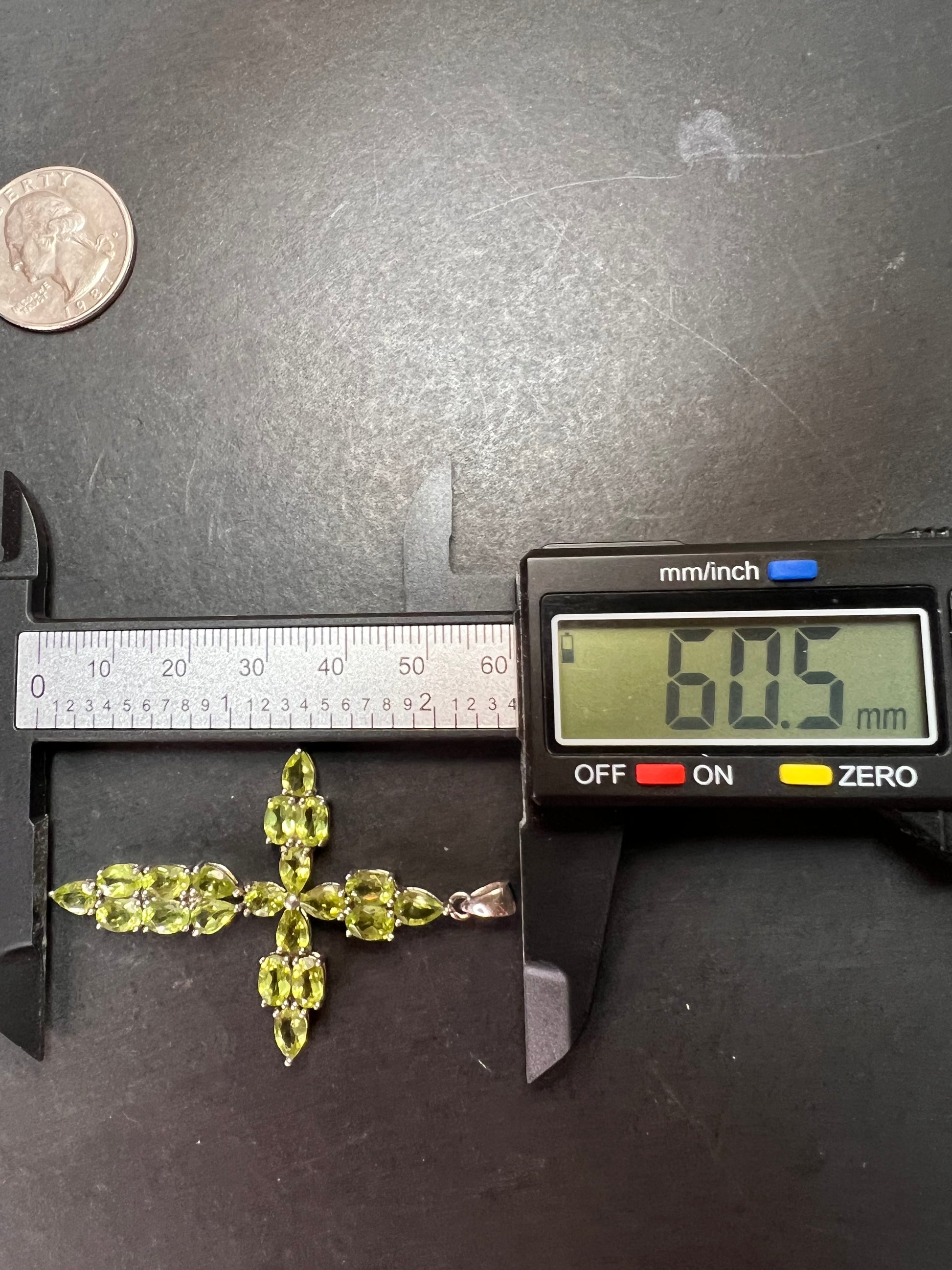 Genuibe green peridot gemstones prong set in authentic 925 sterling silver. Likely plated with rhodium or platinum to slow down tarnishing. Total weight is 6.25 grams. Measurements in photos. This is for the pendant only. Chain not included.