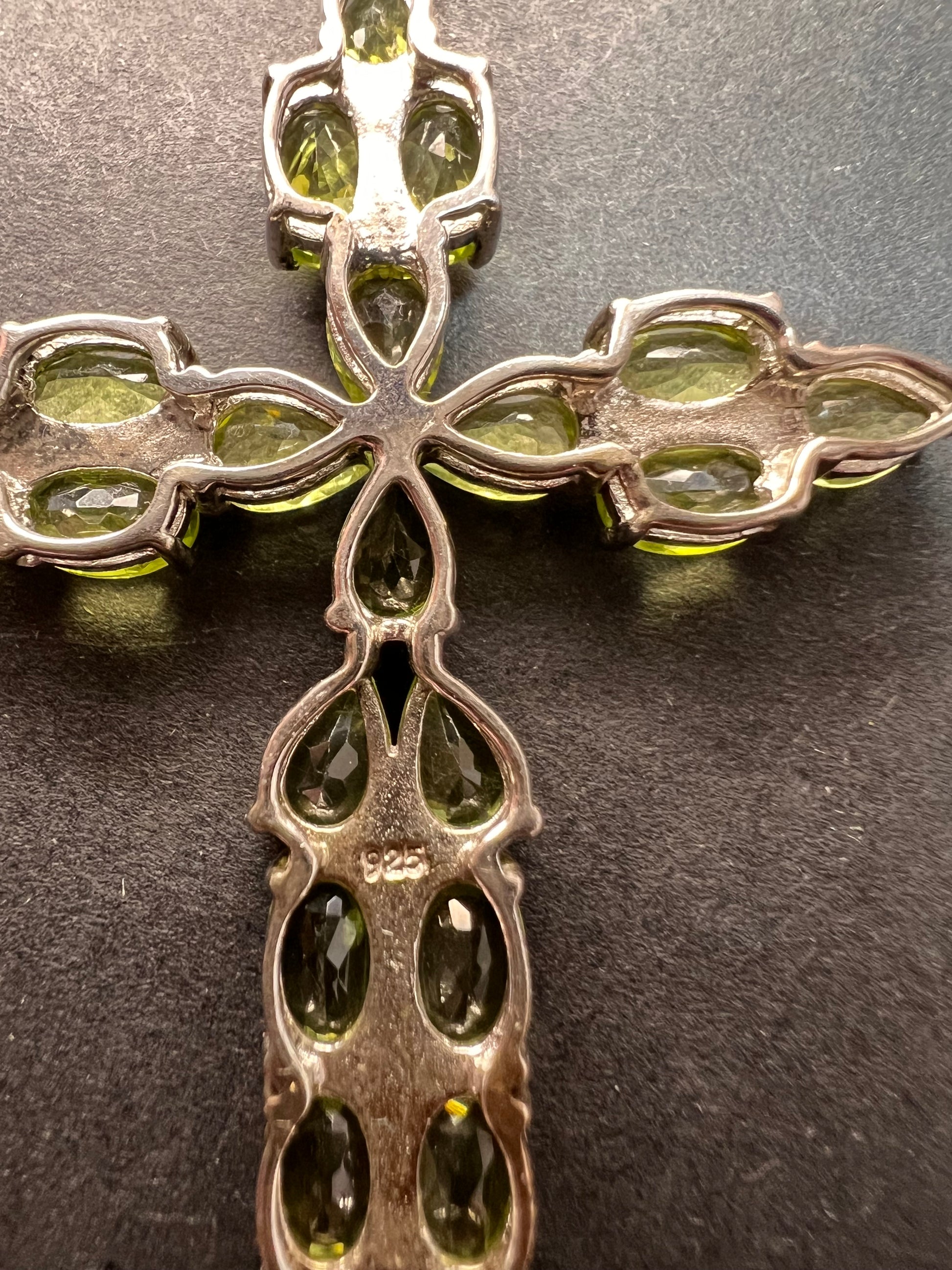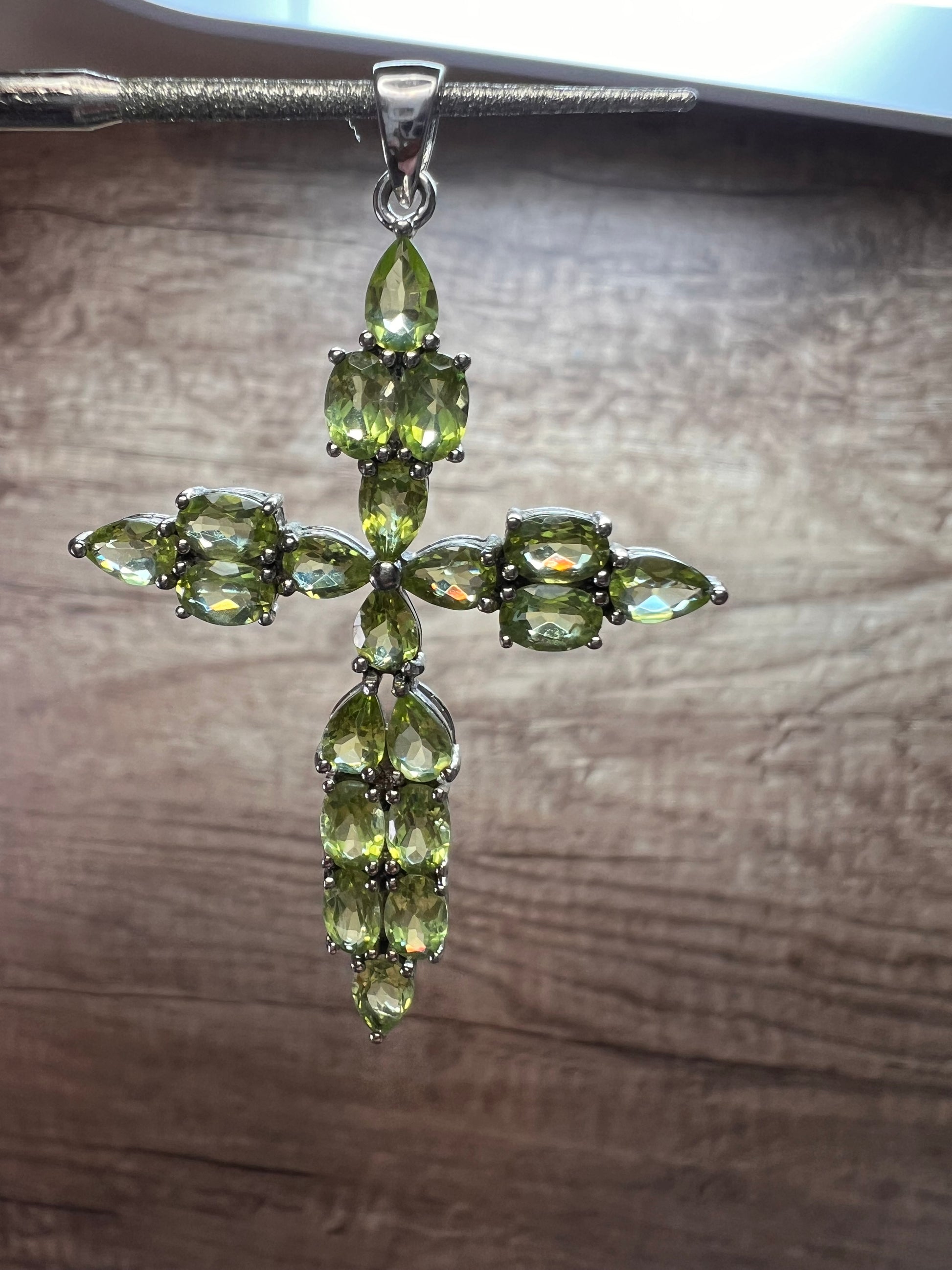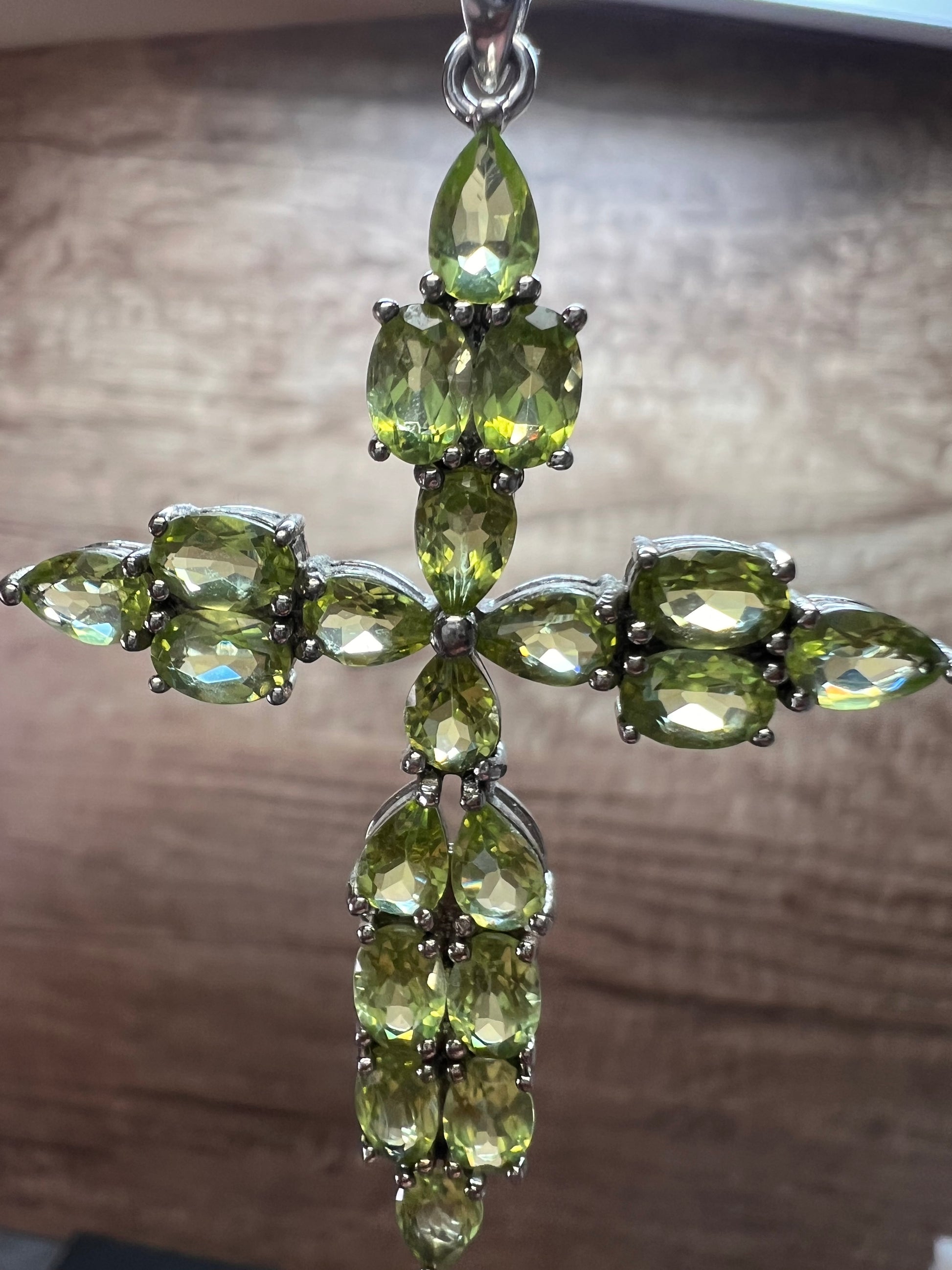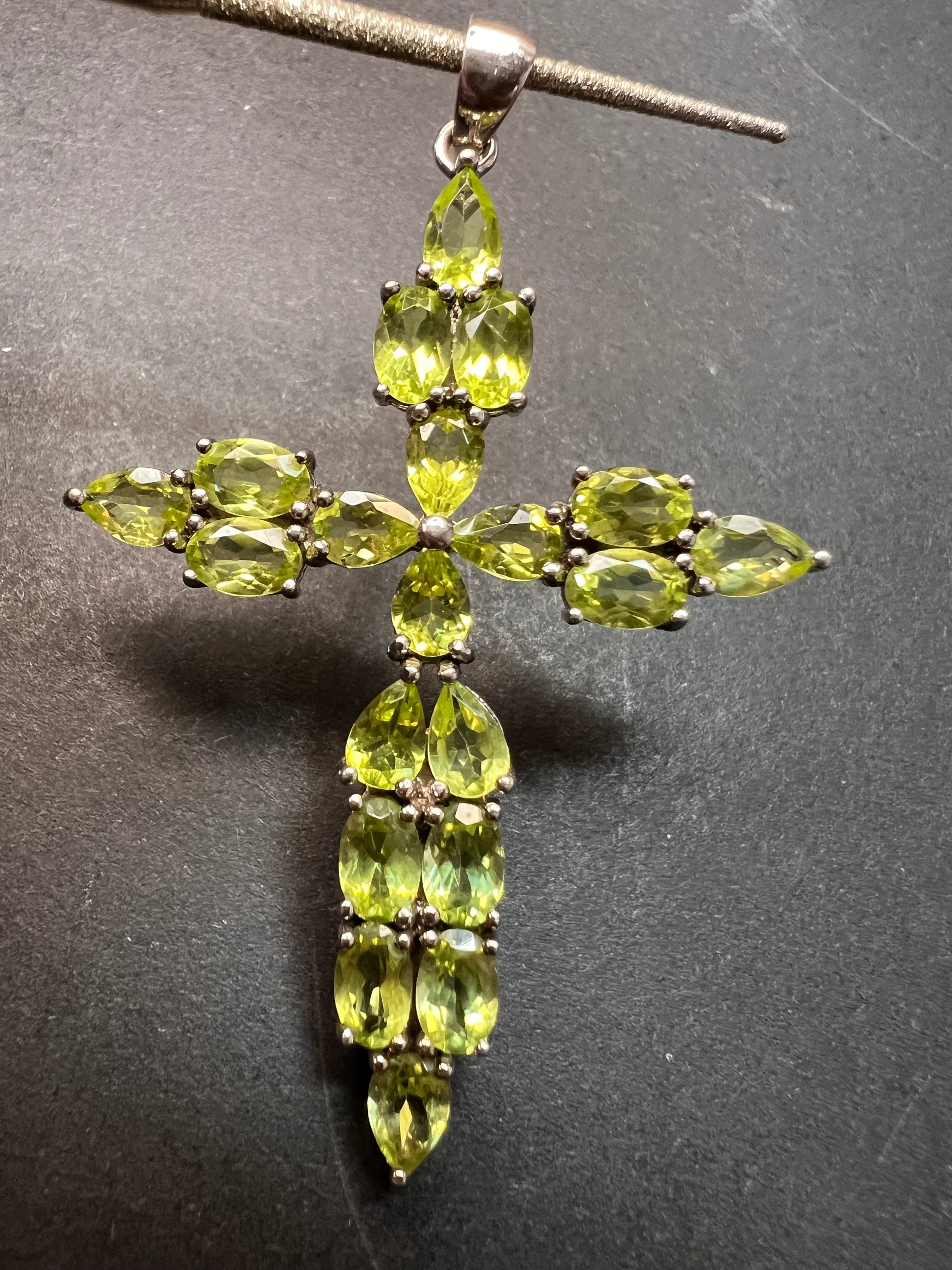 Genuibe green peridot gemstones prong set in authentic 925 sterling silver. Likely plated with rhodium or platinum to slow down tarnishing. Total weight is 6.25 grams. Measurements in photos. This is for the pendant only. Chain not included.