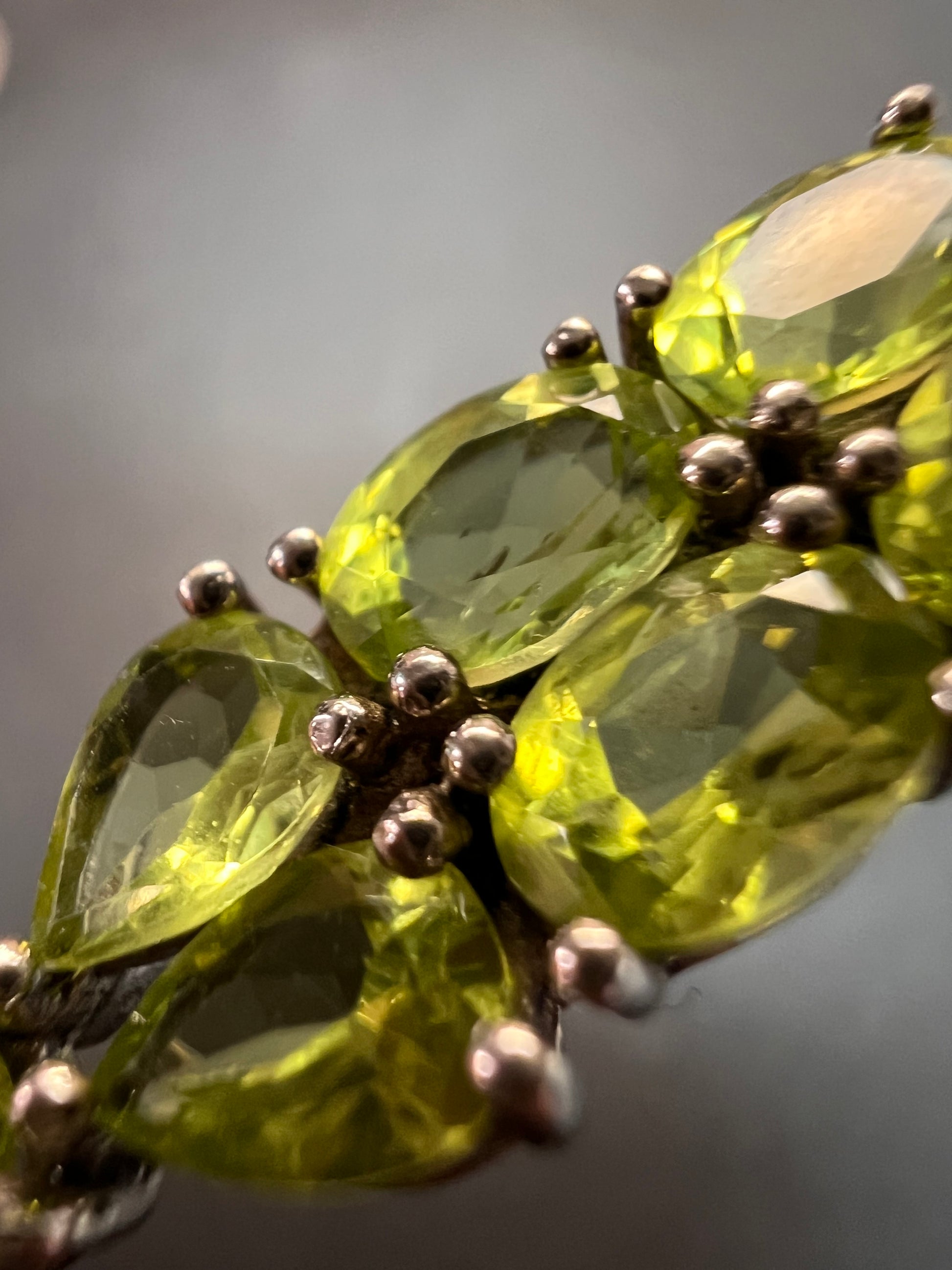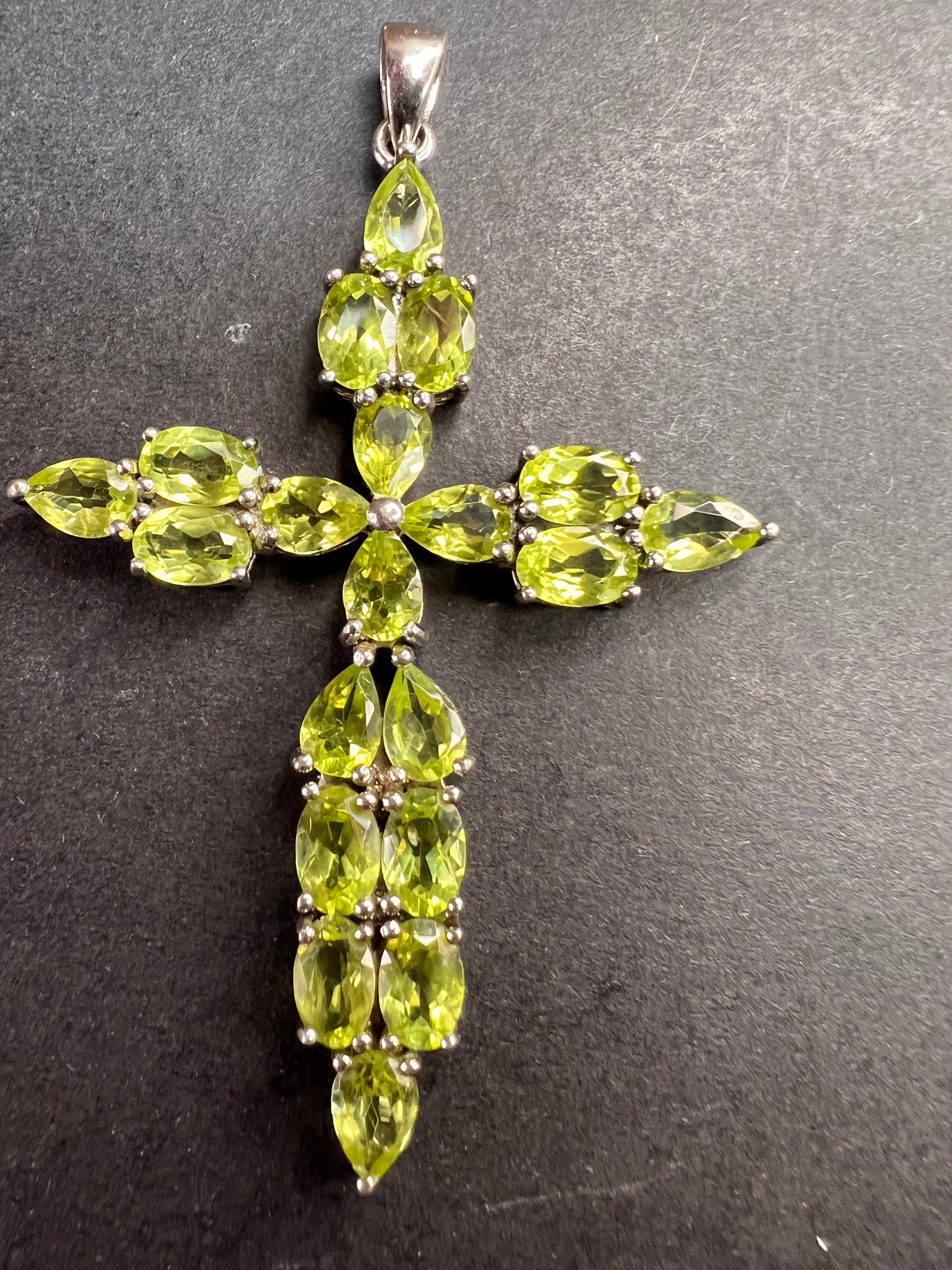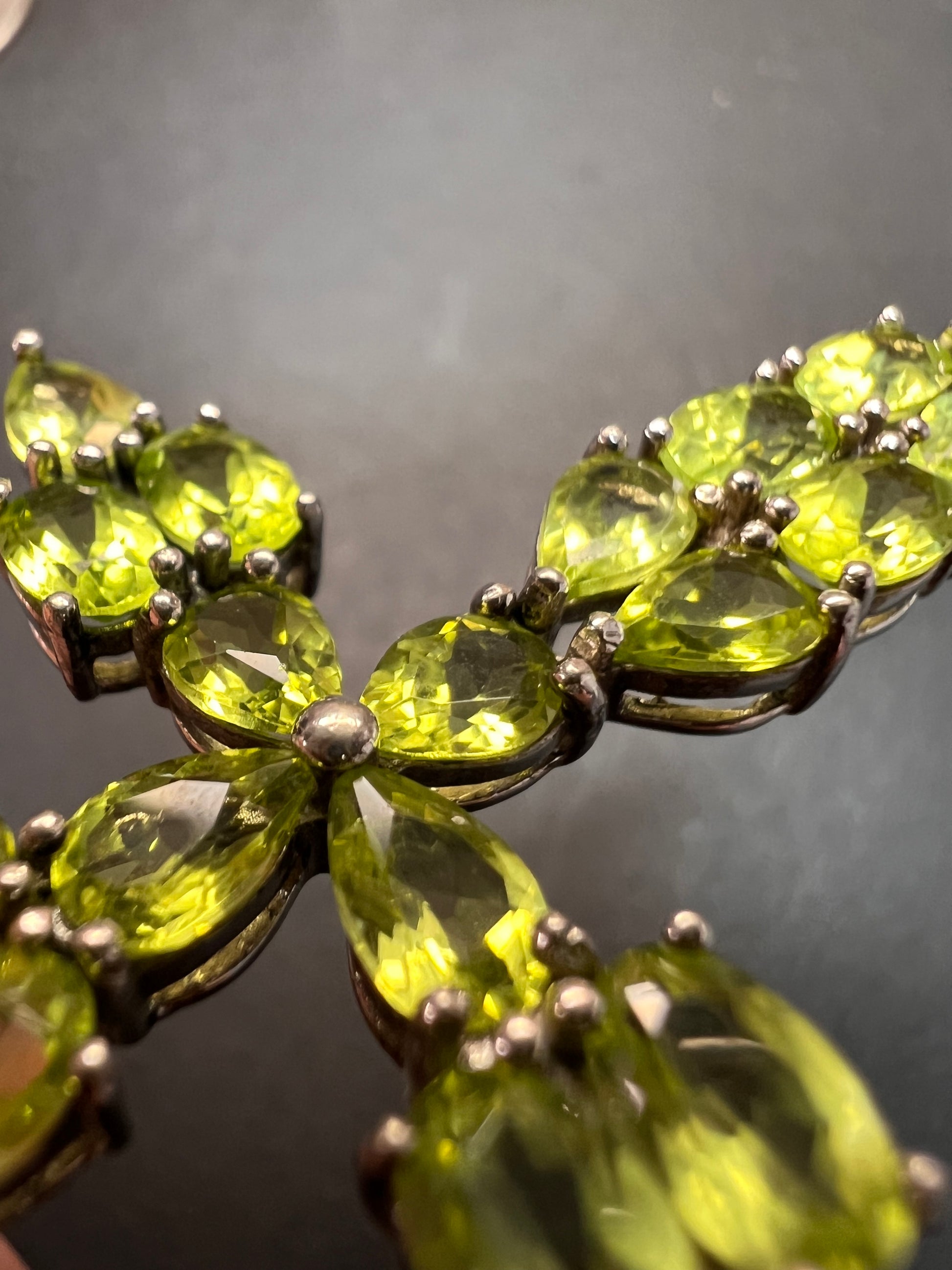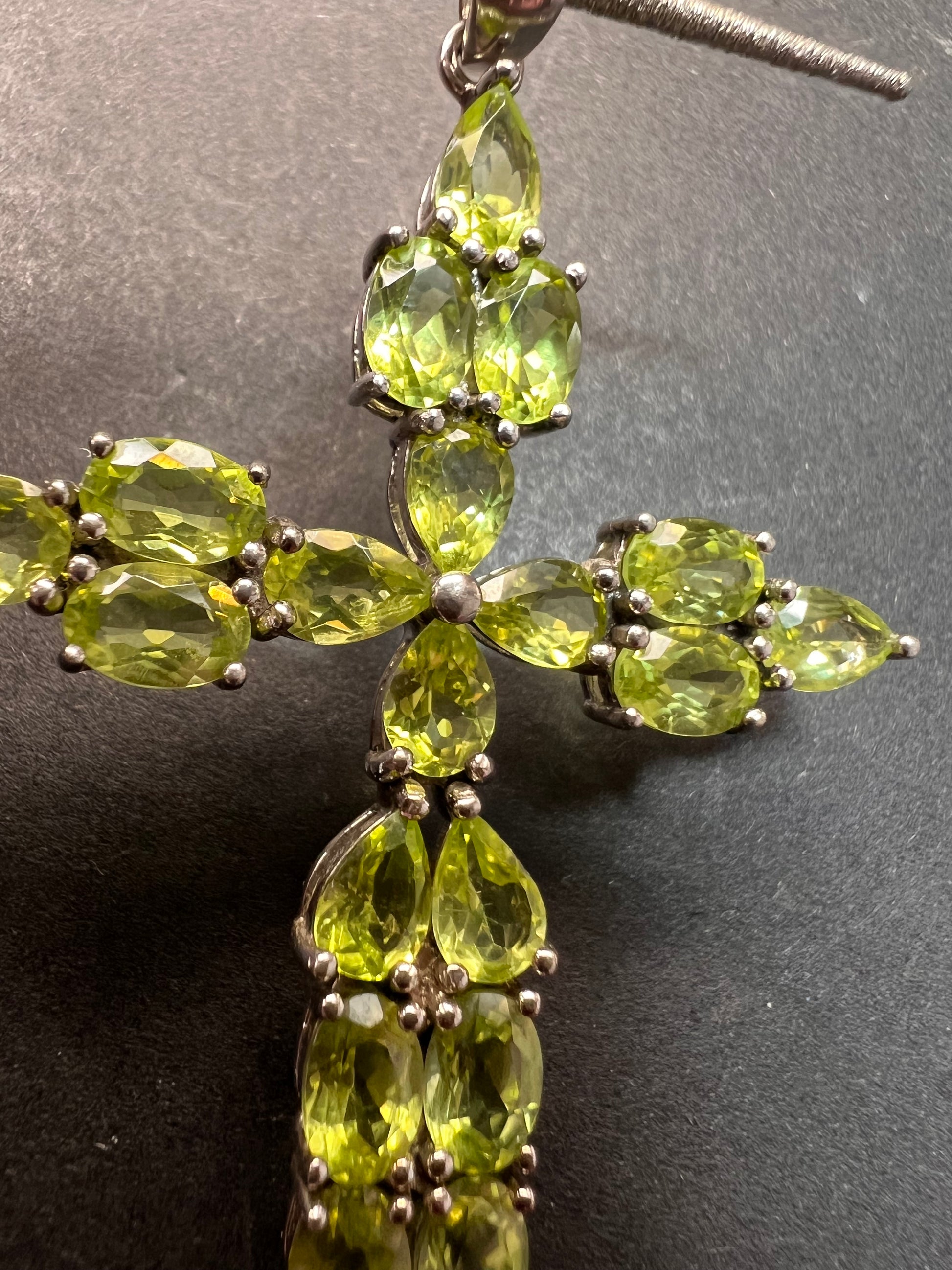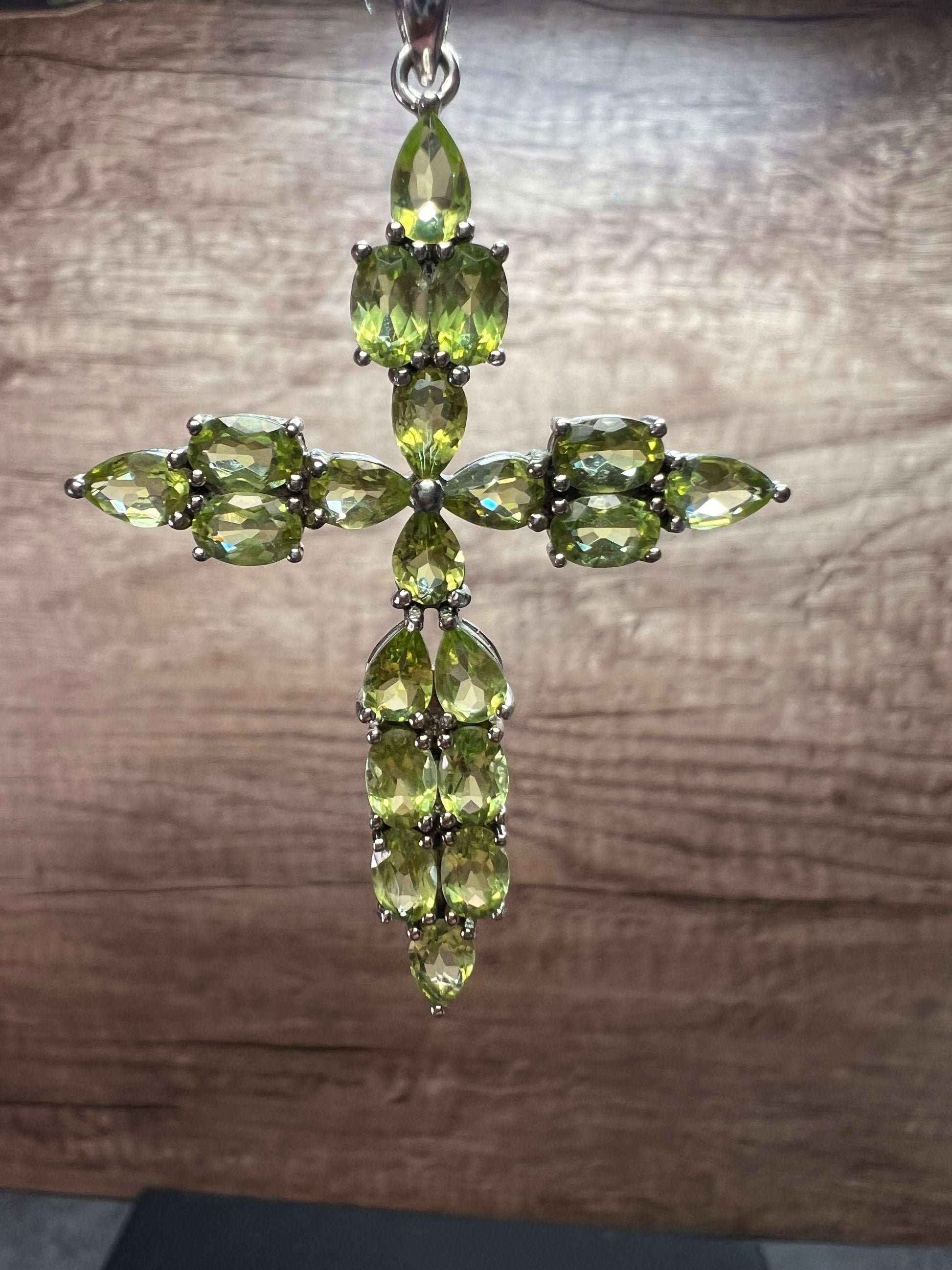 Genuibe green peridot gemstones prong set in authentic 925 sterling silver. Likely plated with rhodium or platinum to slow down tarnishing. Total weight is 6.25 grams. Measurements in photos. This is for the pendant only. Chain not included.