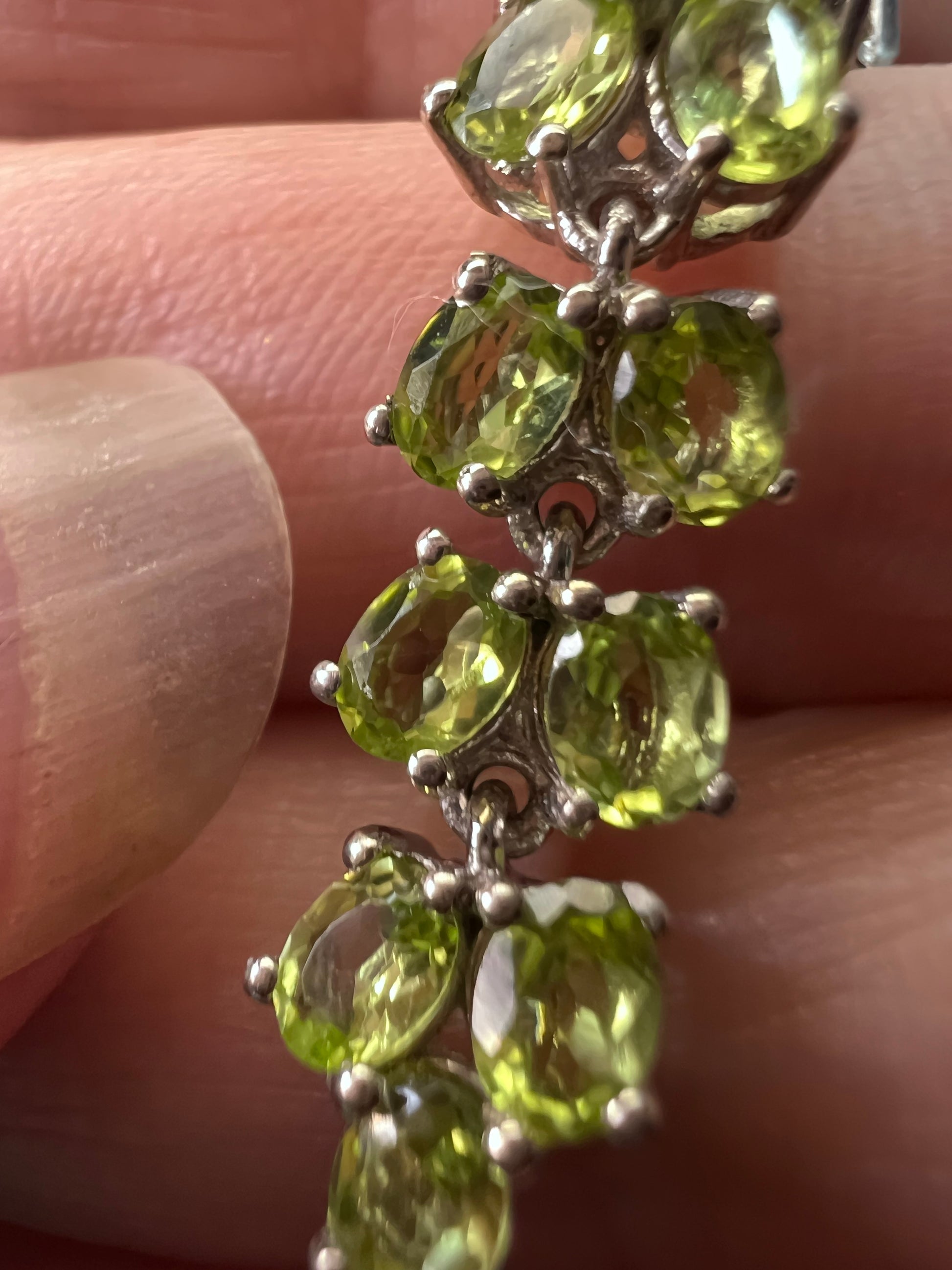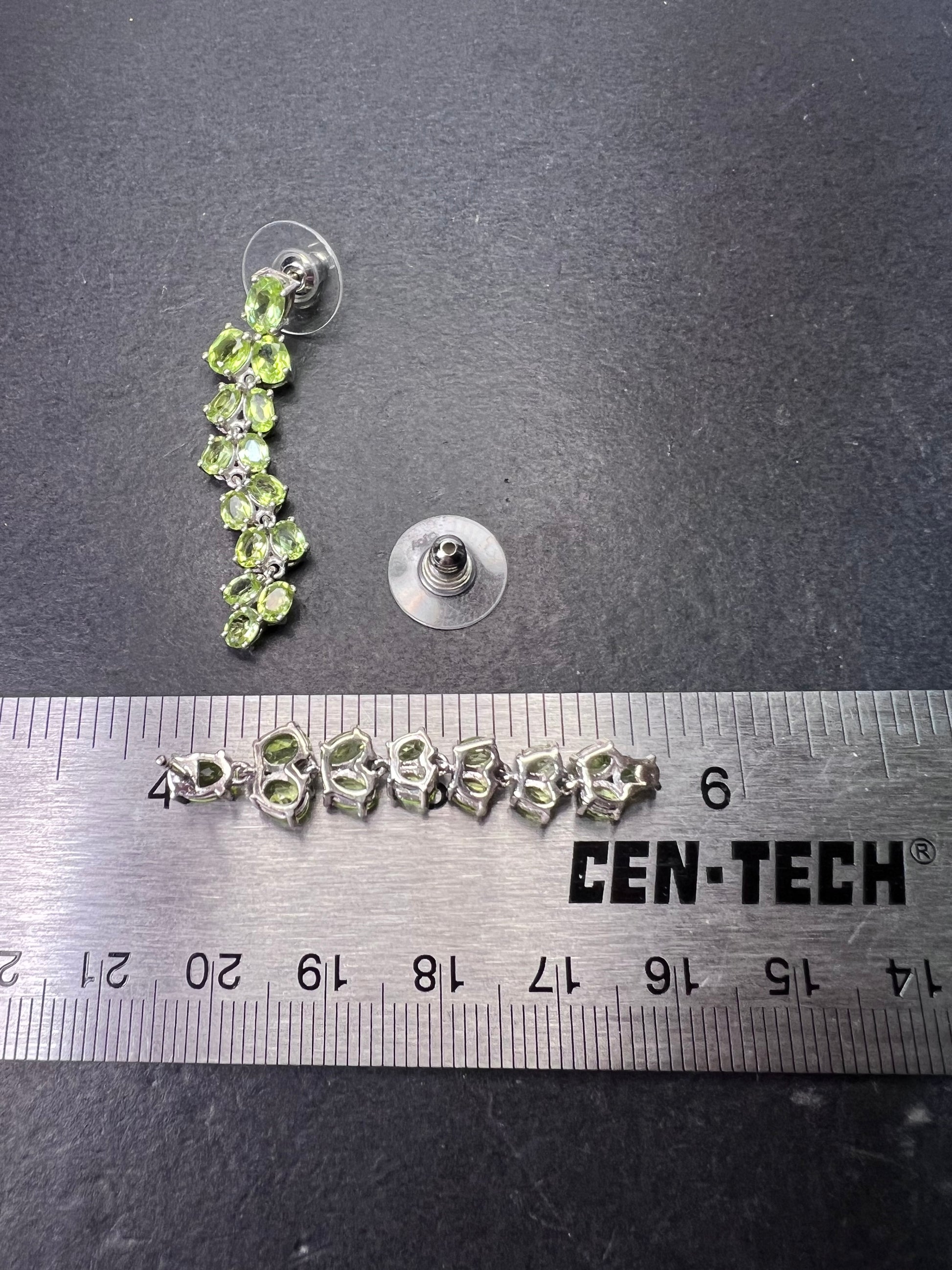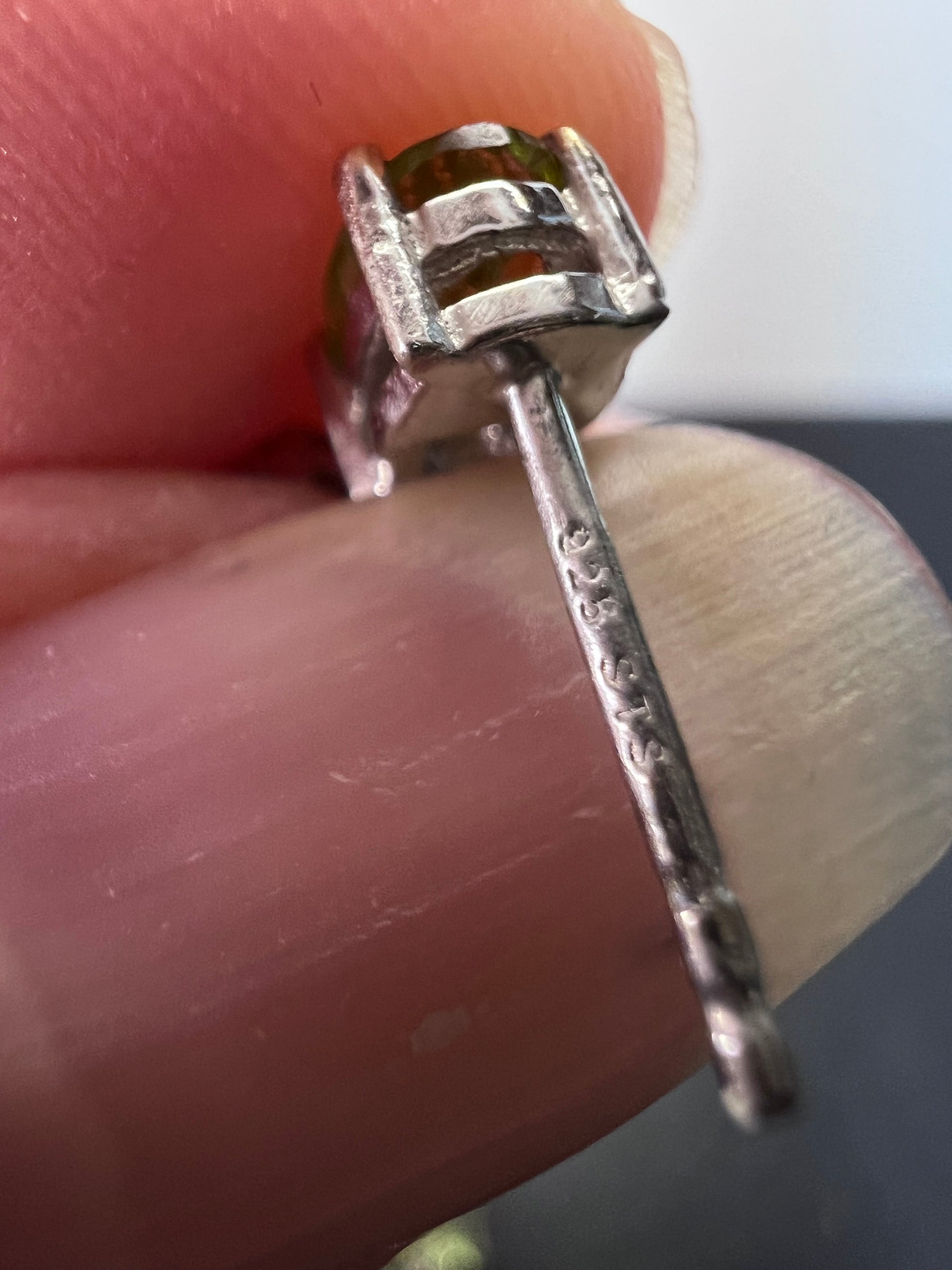 Genuine green peridot gemstones in a sterling silver prong setting. These most likely have a rhodium plating too. 925 STS