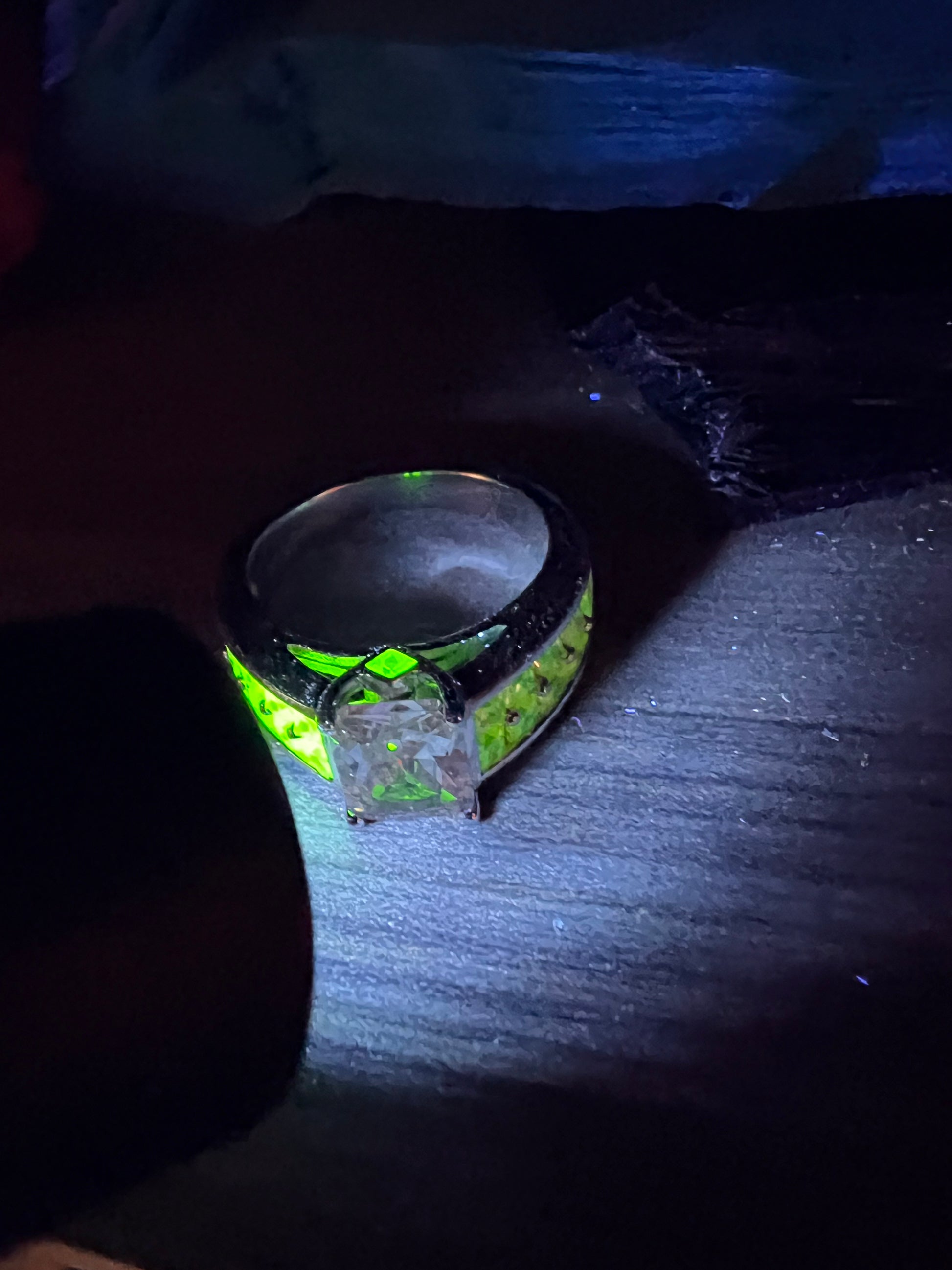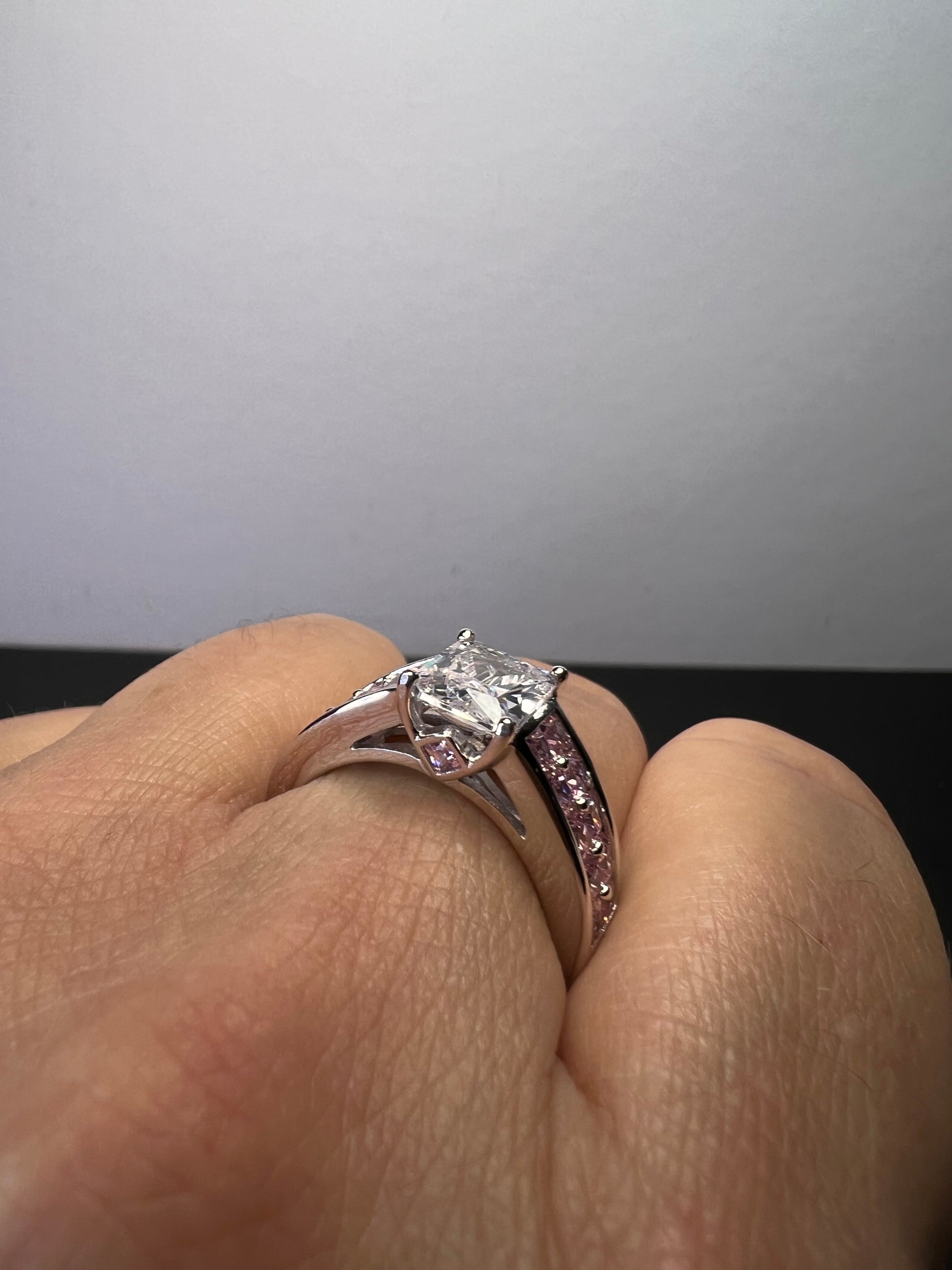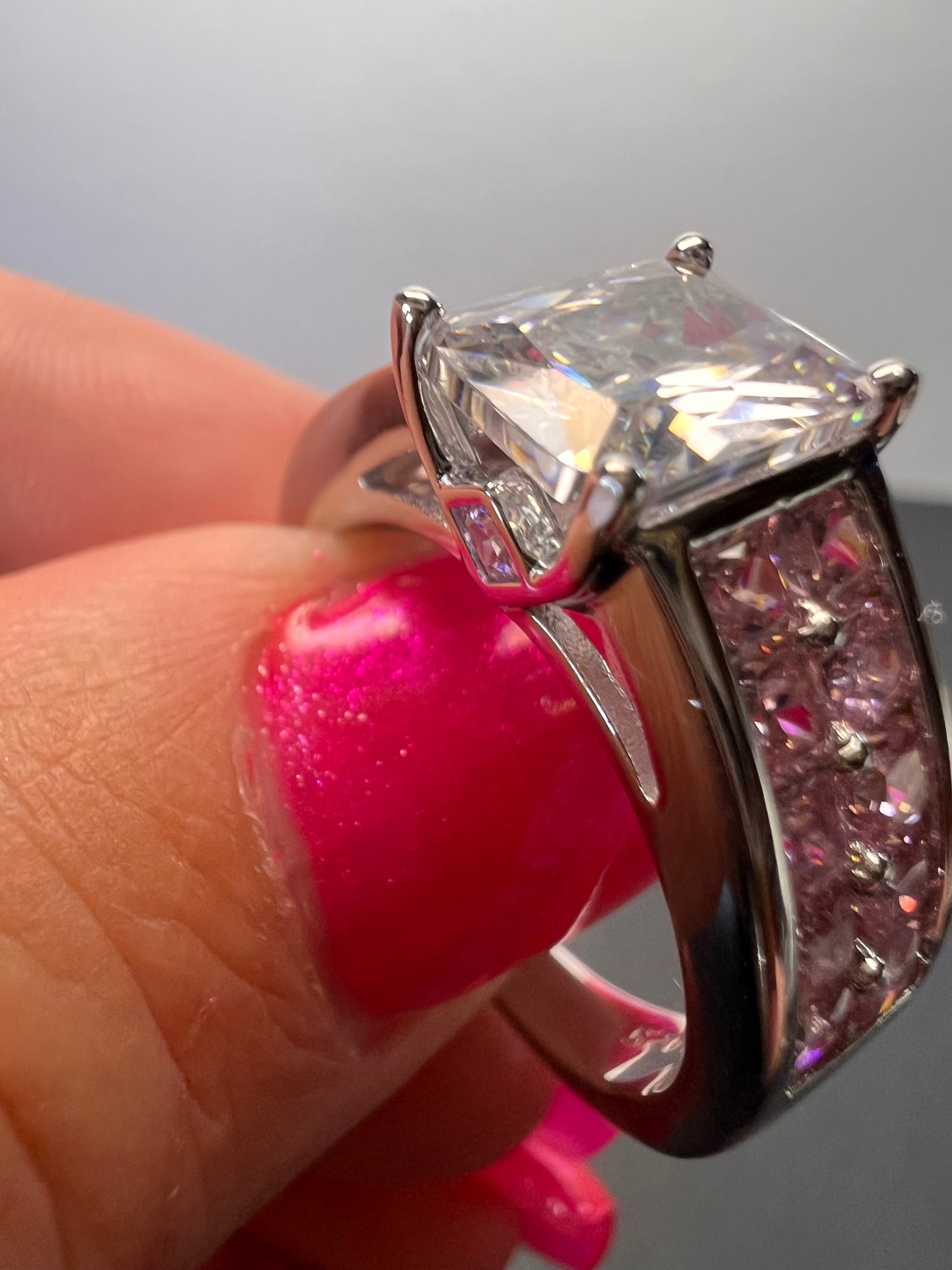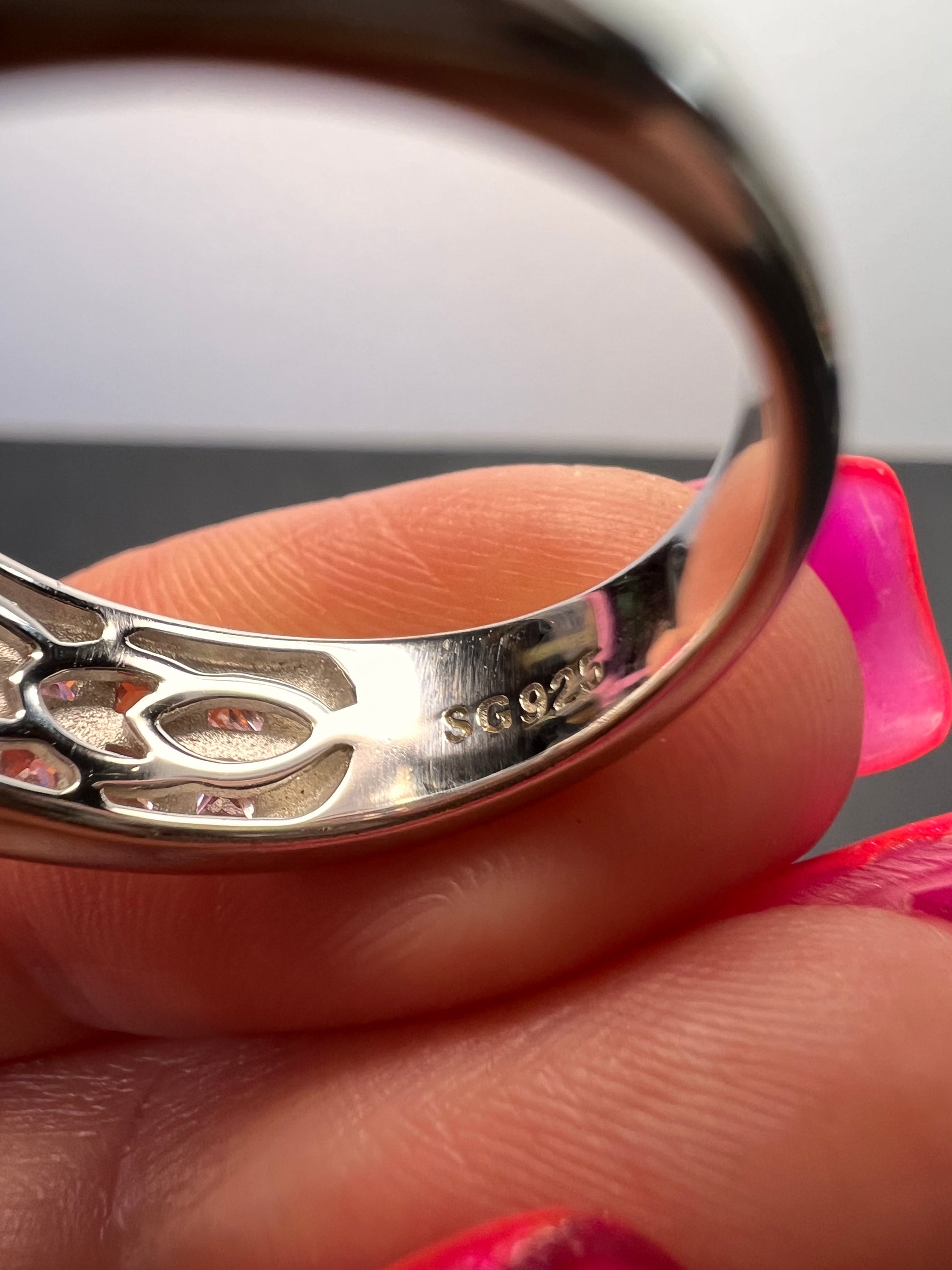 White and pink ice cubic zirconia stones set in rhodium or platinum plated over sterling silver. Has a decent weight to it. Solid craftsmanship . Size 9
